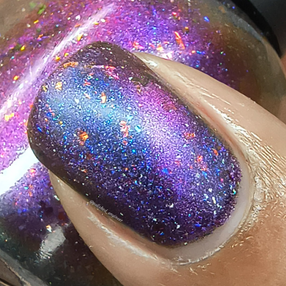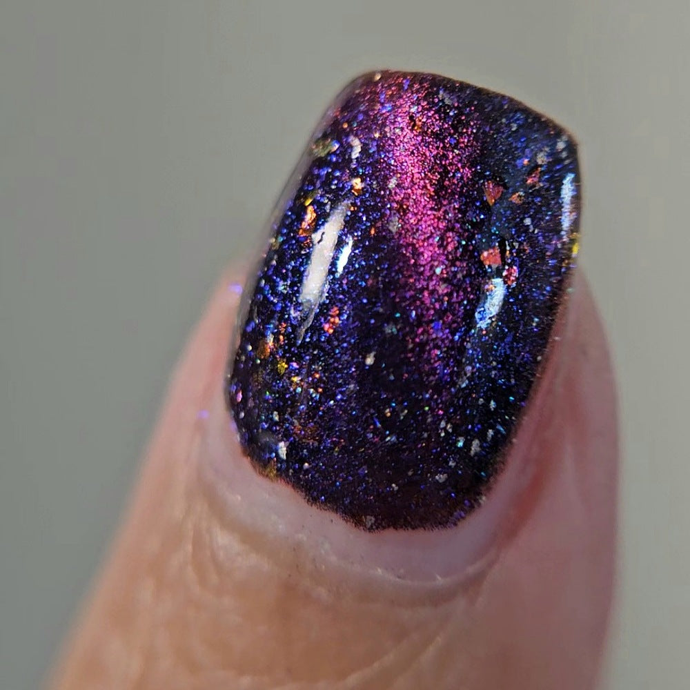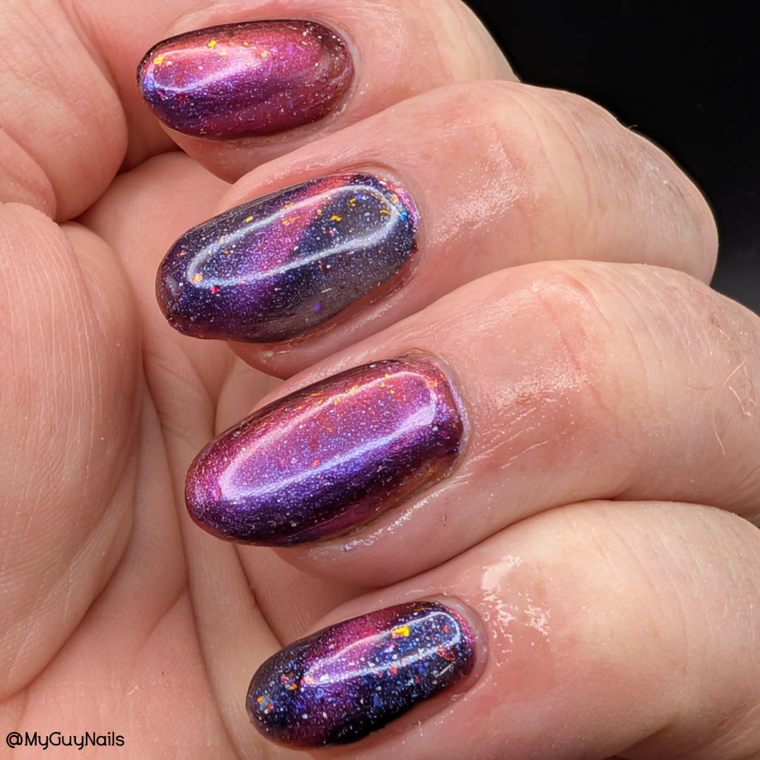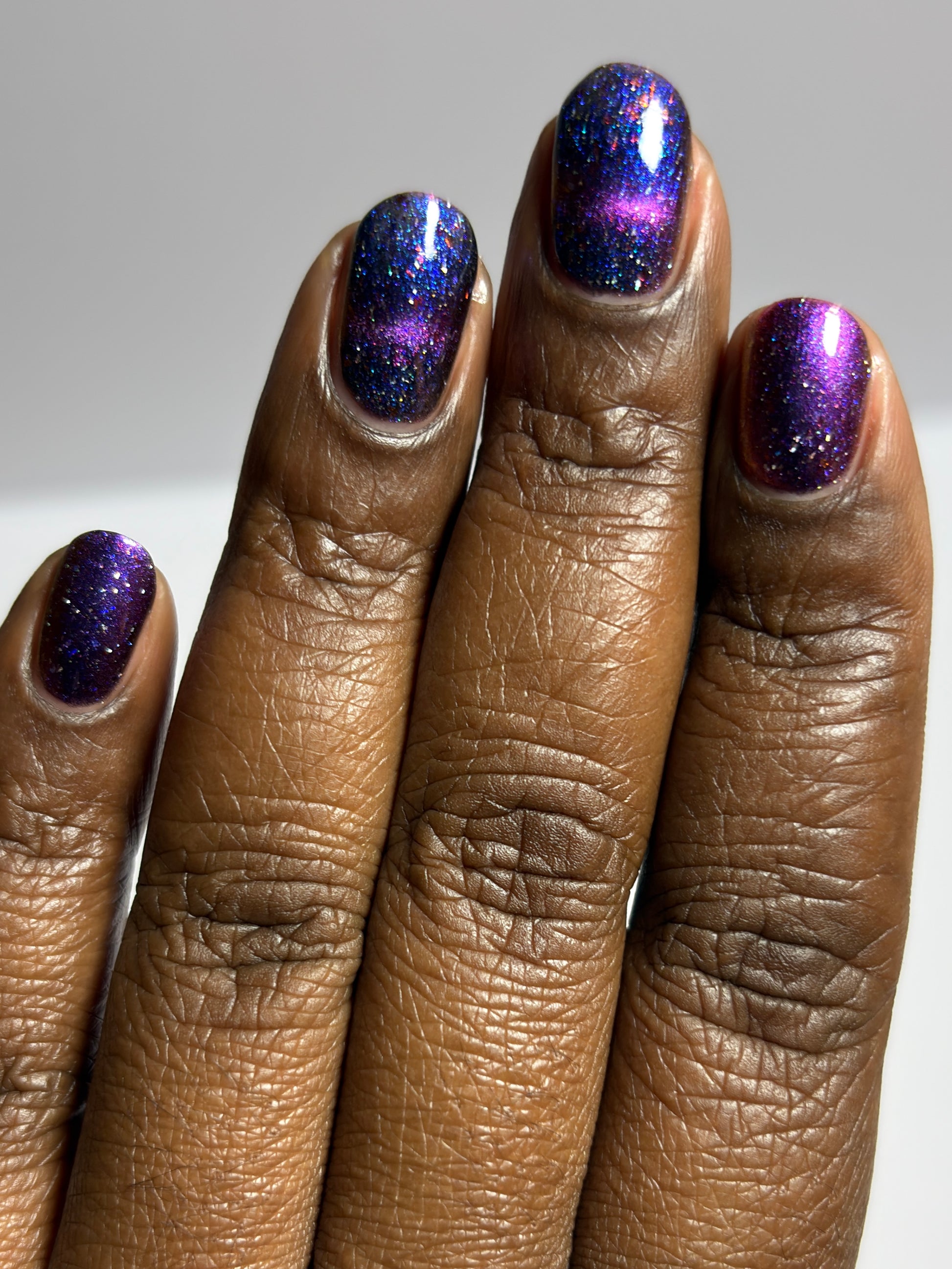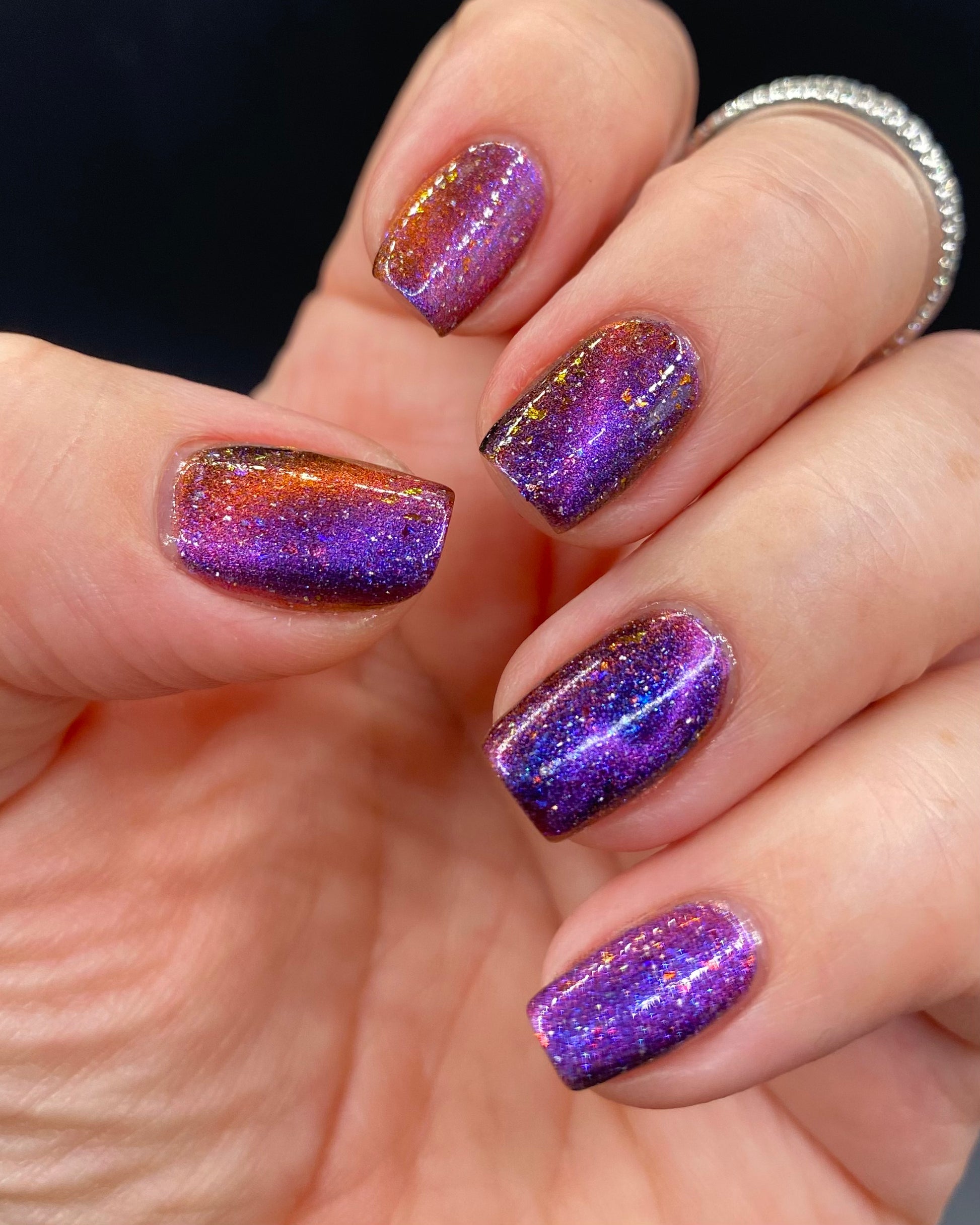 A pink/purple/peach/bronze magnetic that once magnetized reveals a deep blue large particle shimmer with UCC and ghost flakies and scattered holo flakes.