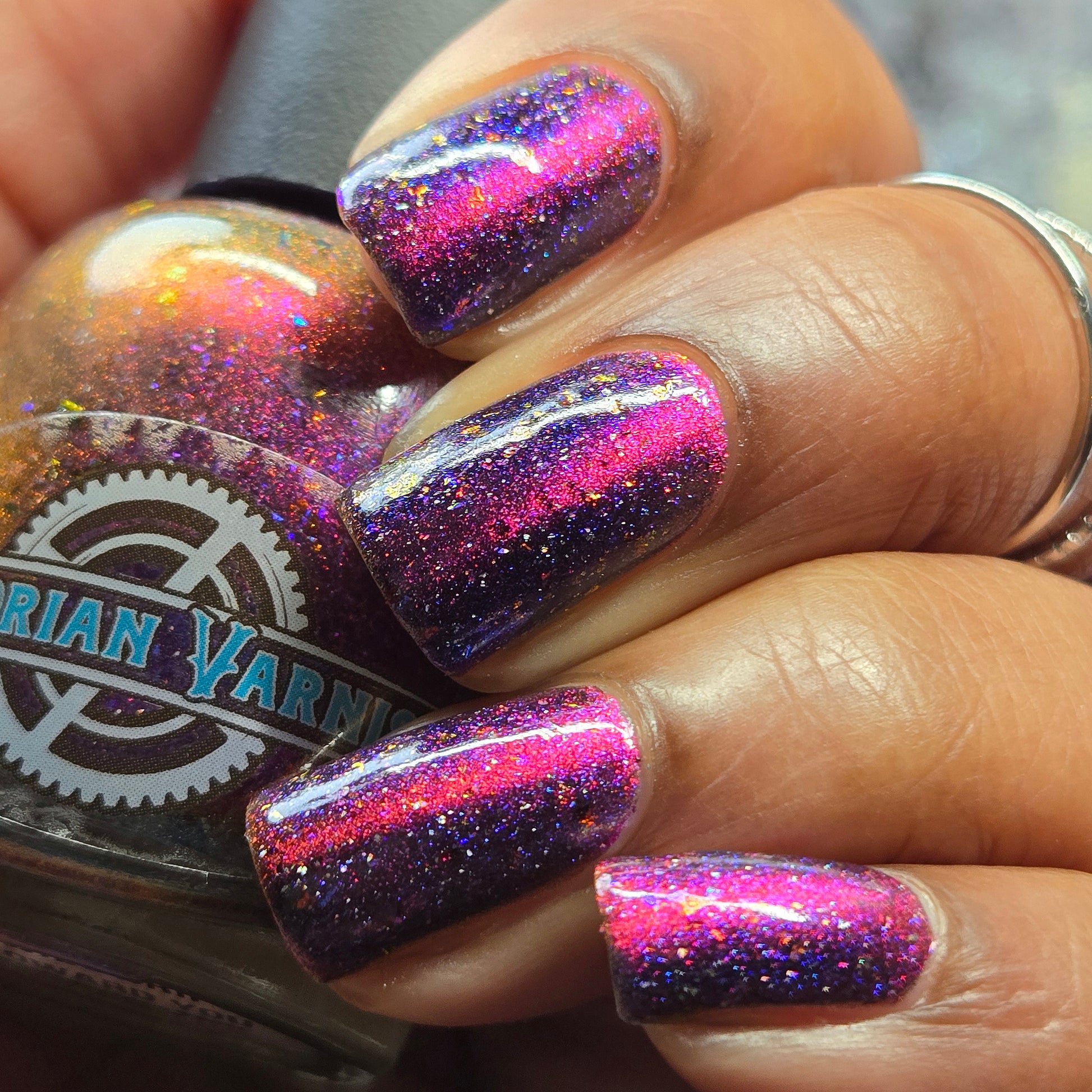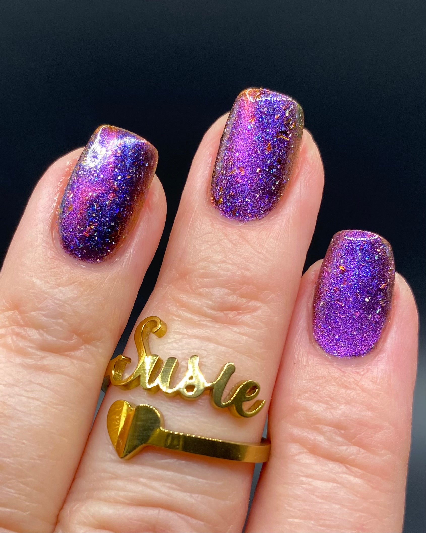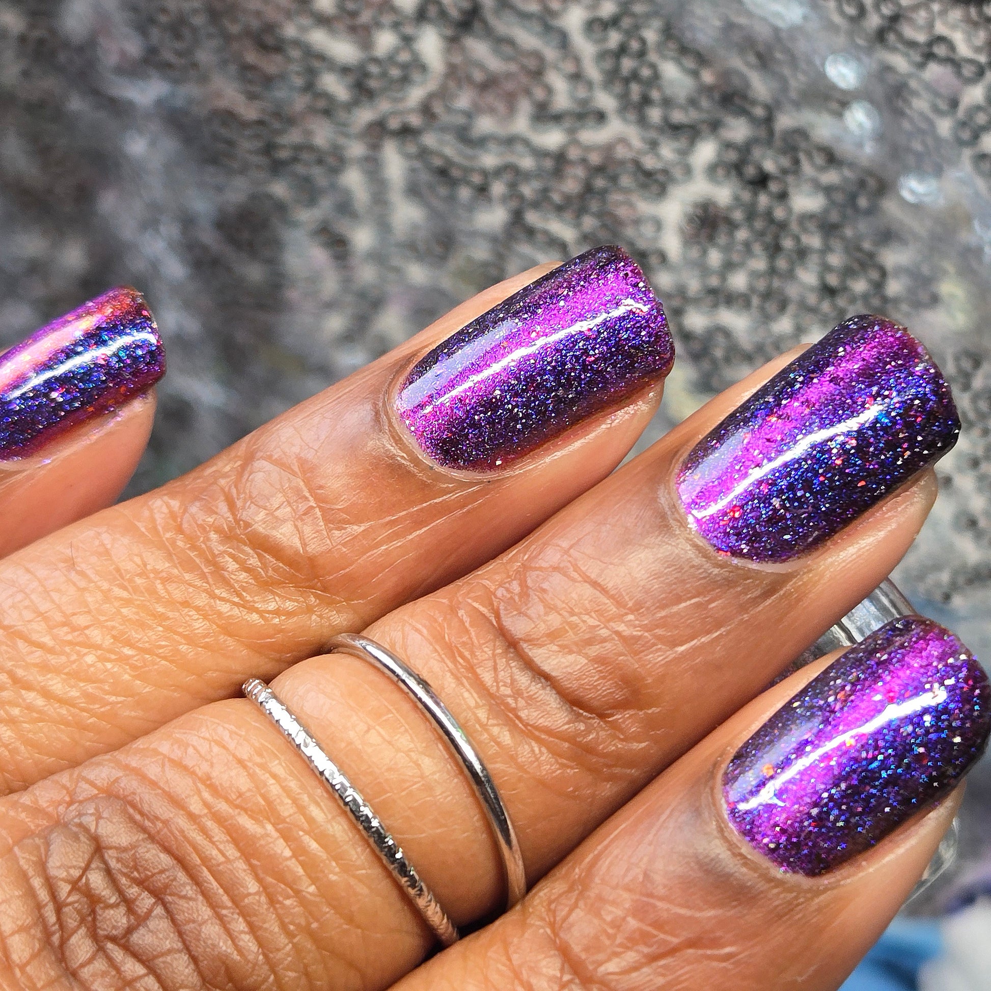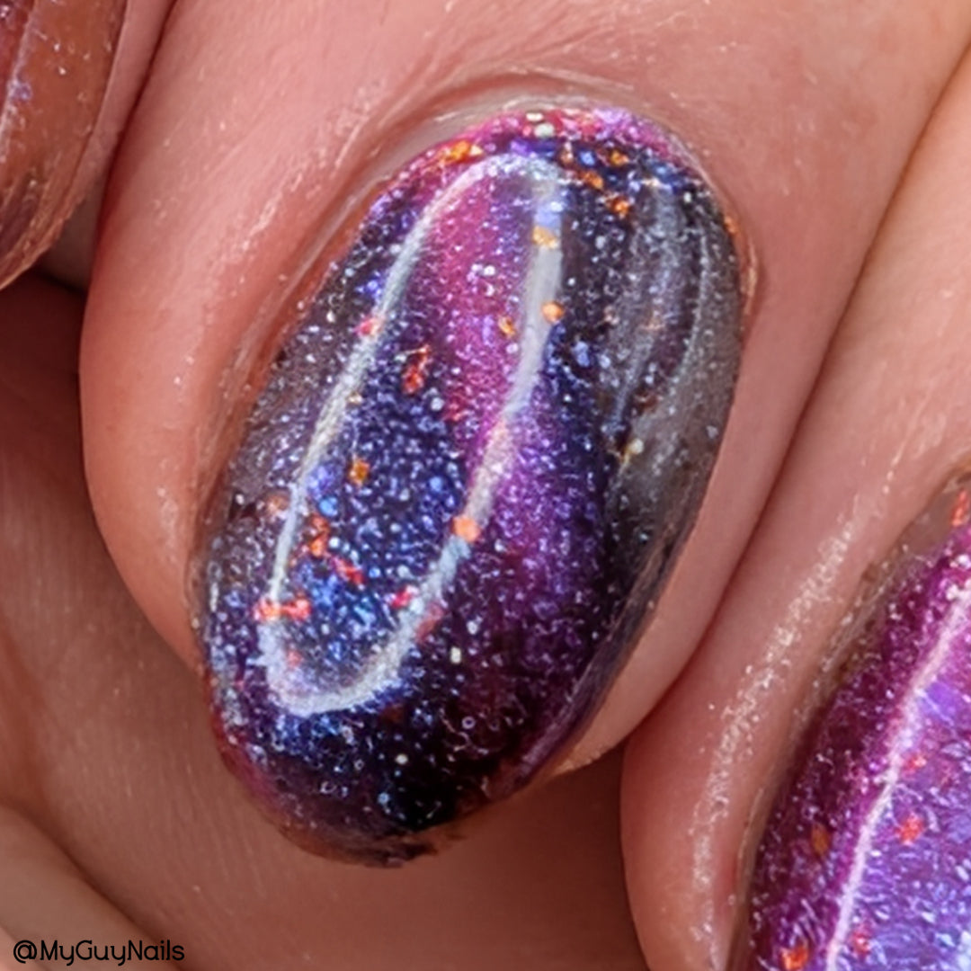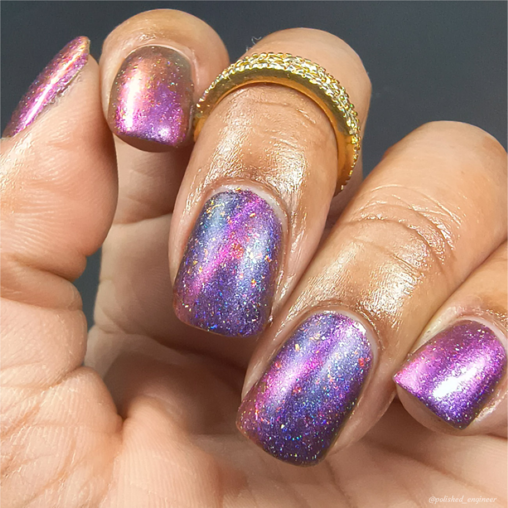 A pink/purple/peach/bronze magnetic that once magnetized reveals a deep blue large particle shimmer with UCC and ghost flakies and scattered holo flakes.