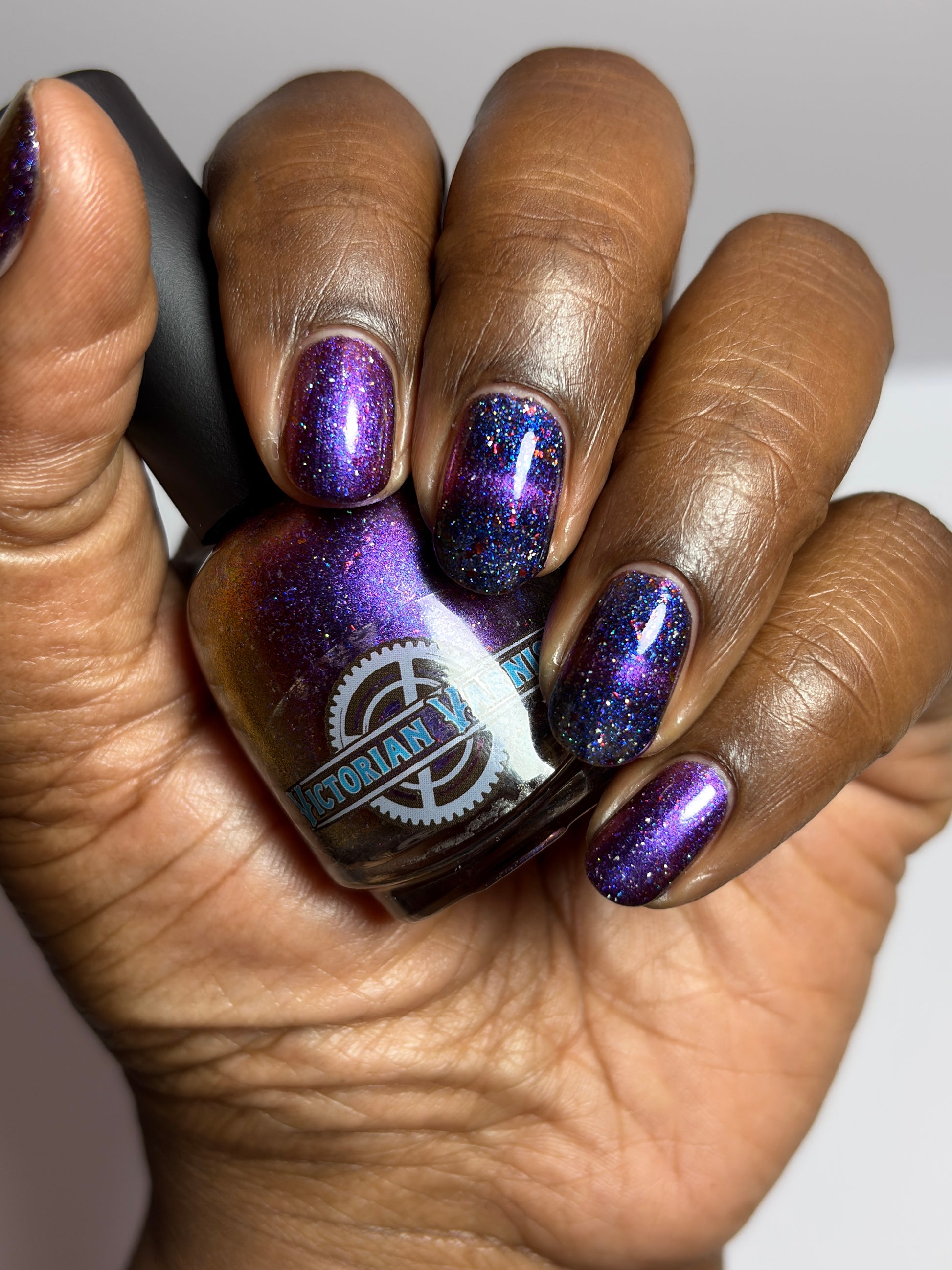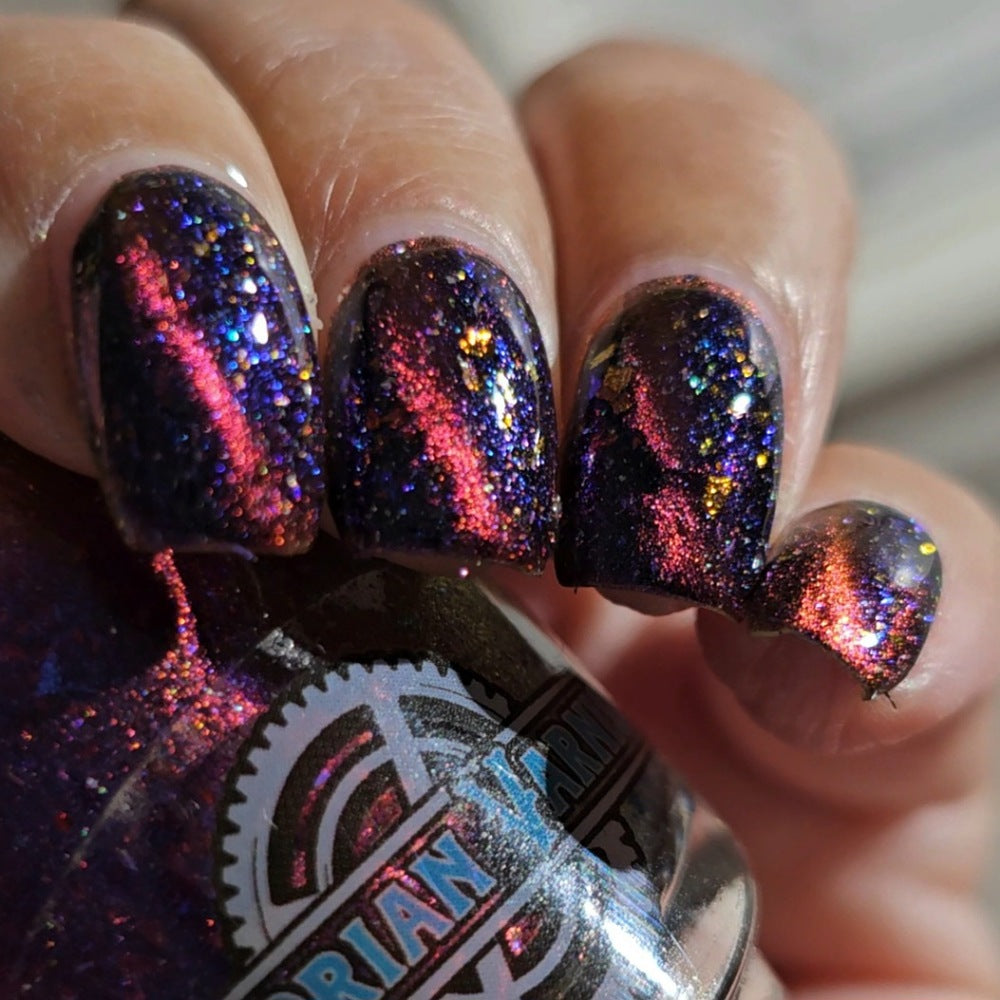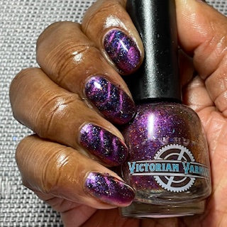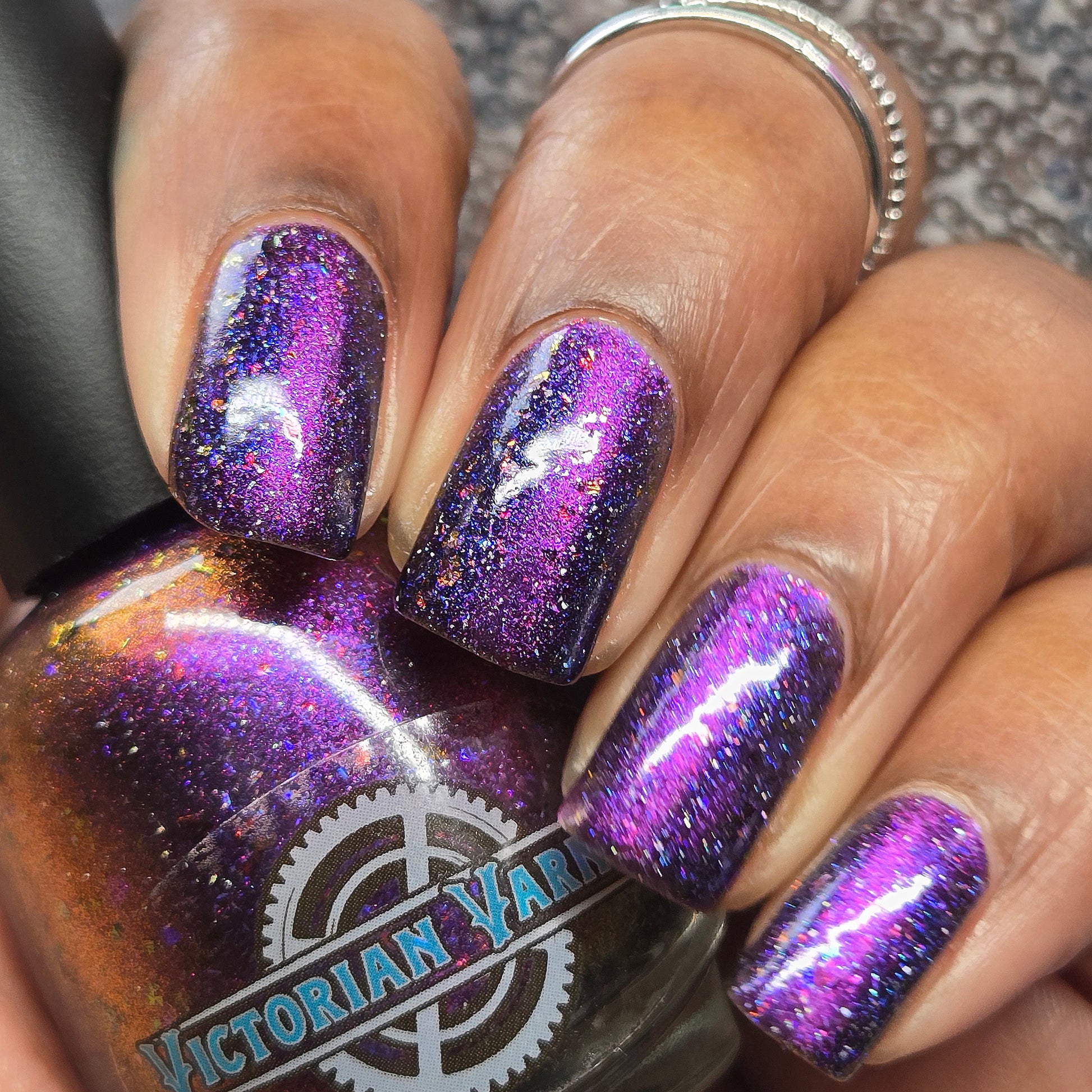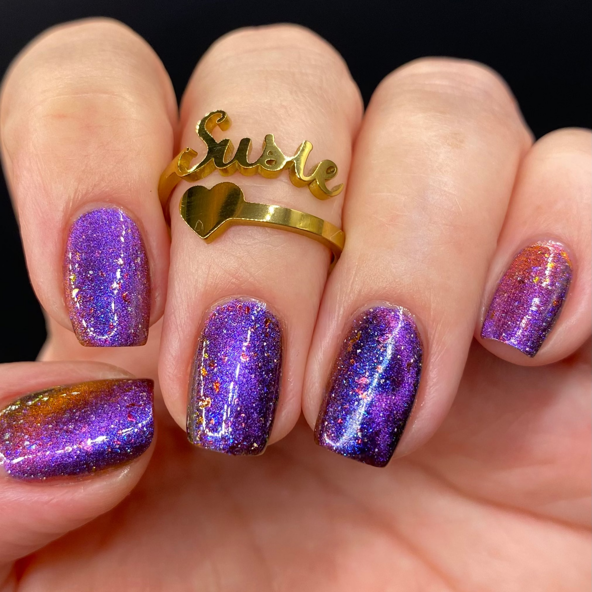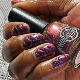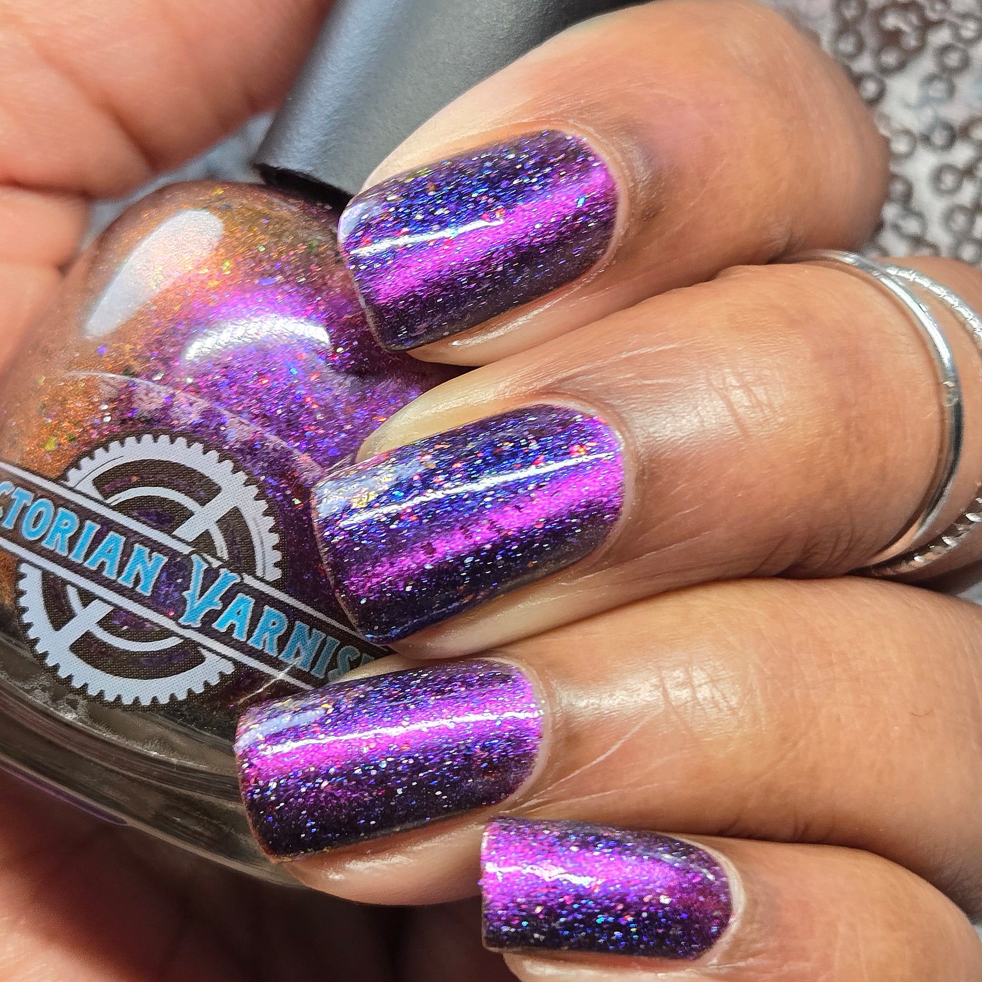 A pink/purple/peach/bronze magnetic that once magnetized reveals a deep blue large particle shimmer with UCC and ghost flakies and scattered holo flakes.