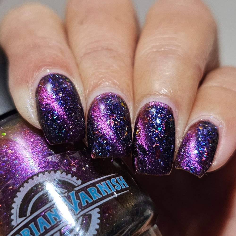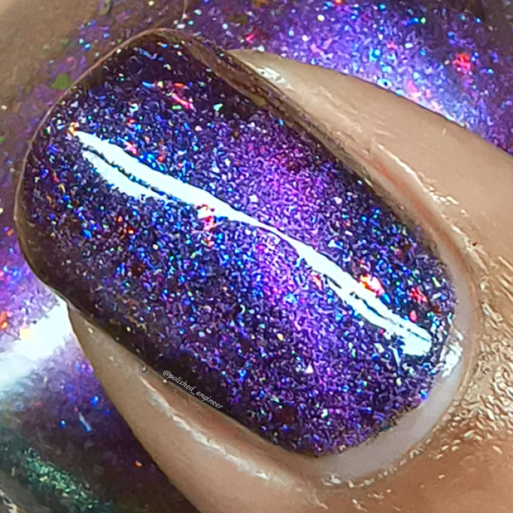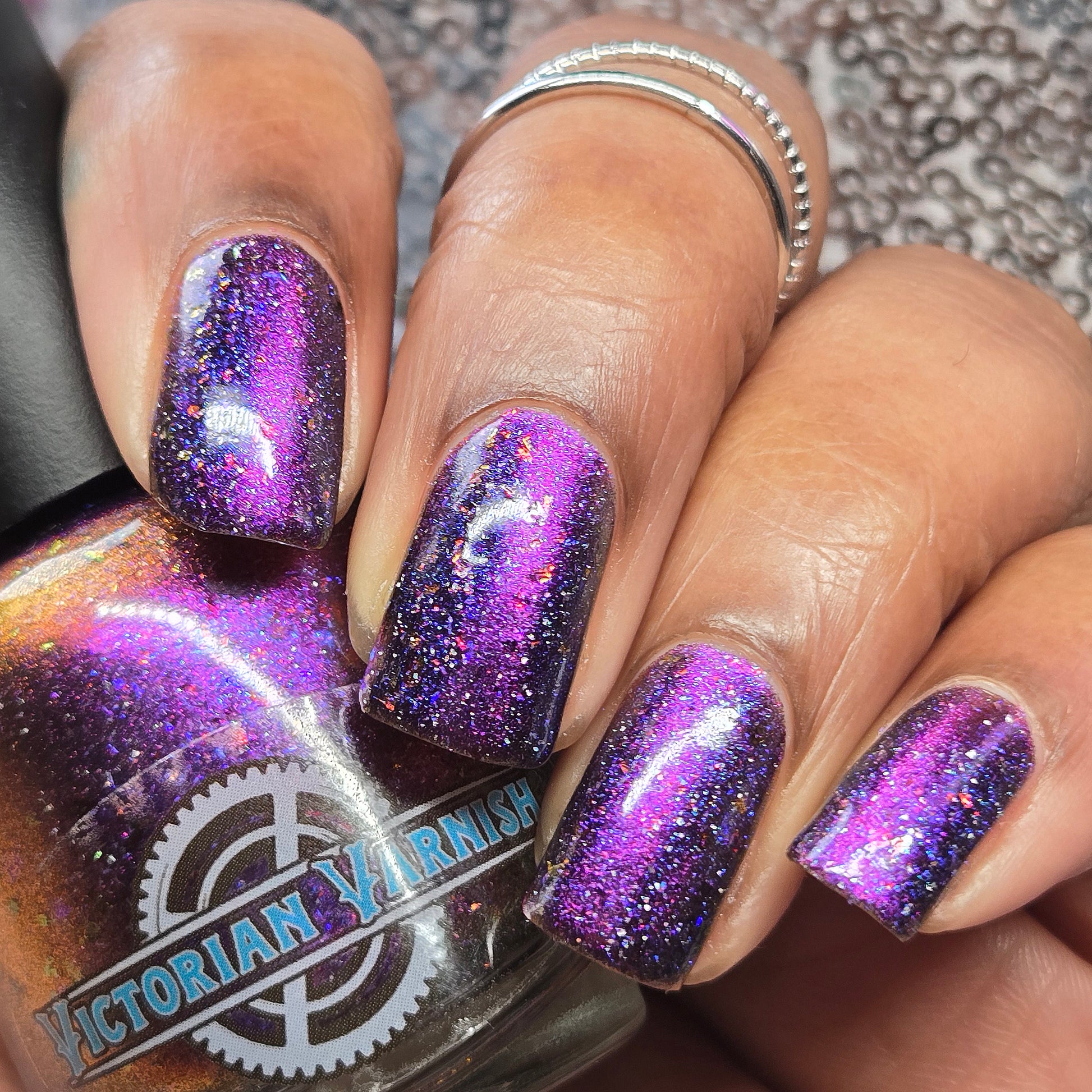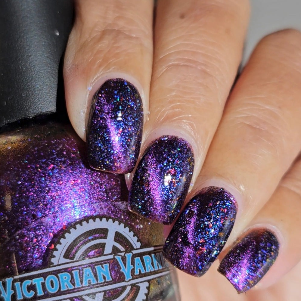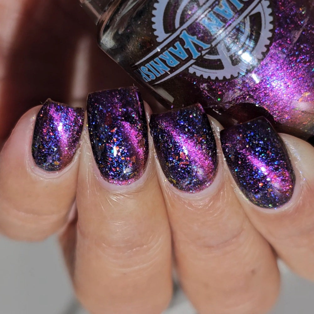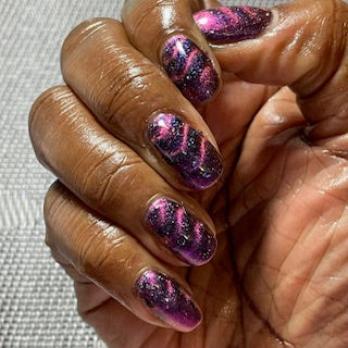 A pink/purple/peach/bronze magnetic that once magnetized reveals a deep blue large particle shimmer with UCC and ghost flakies and scattered holo flakes.