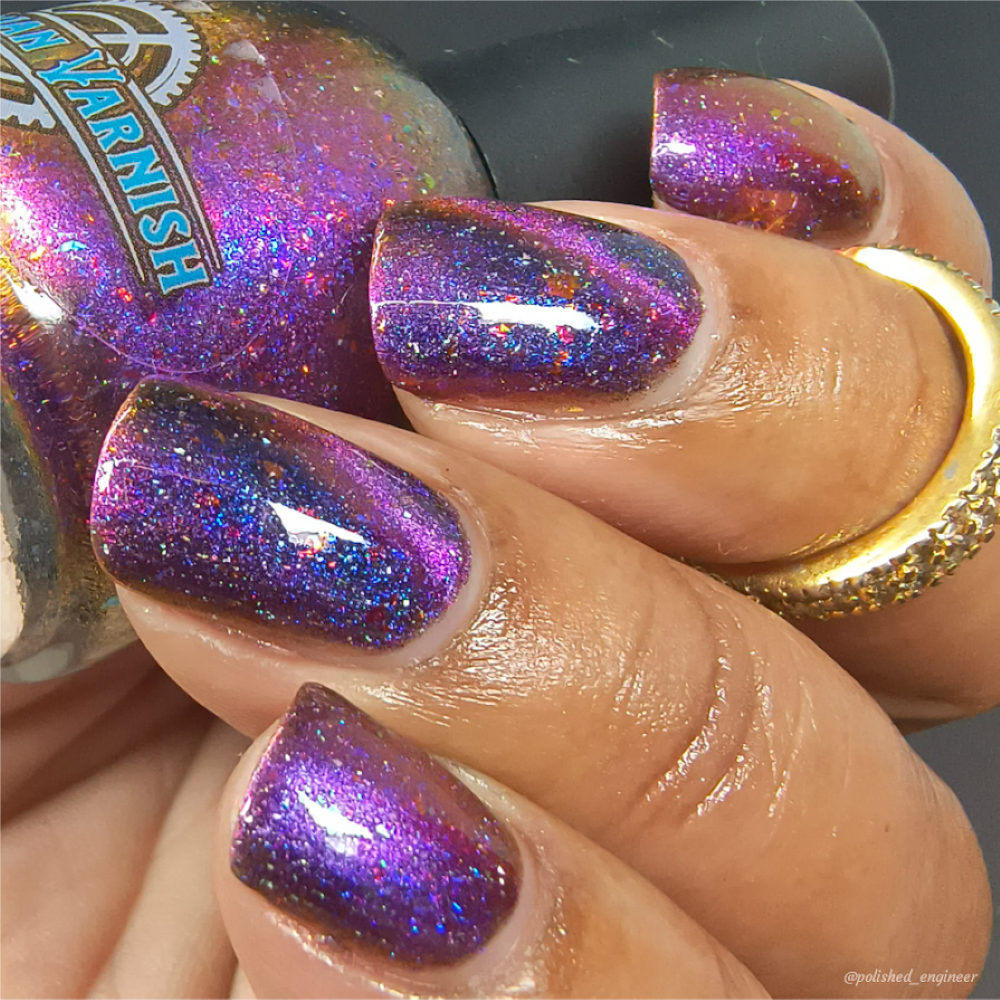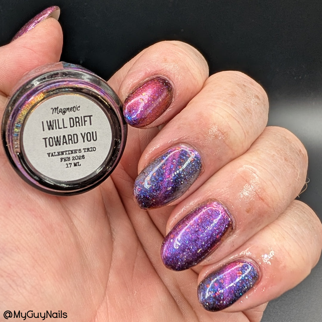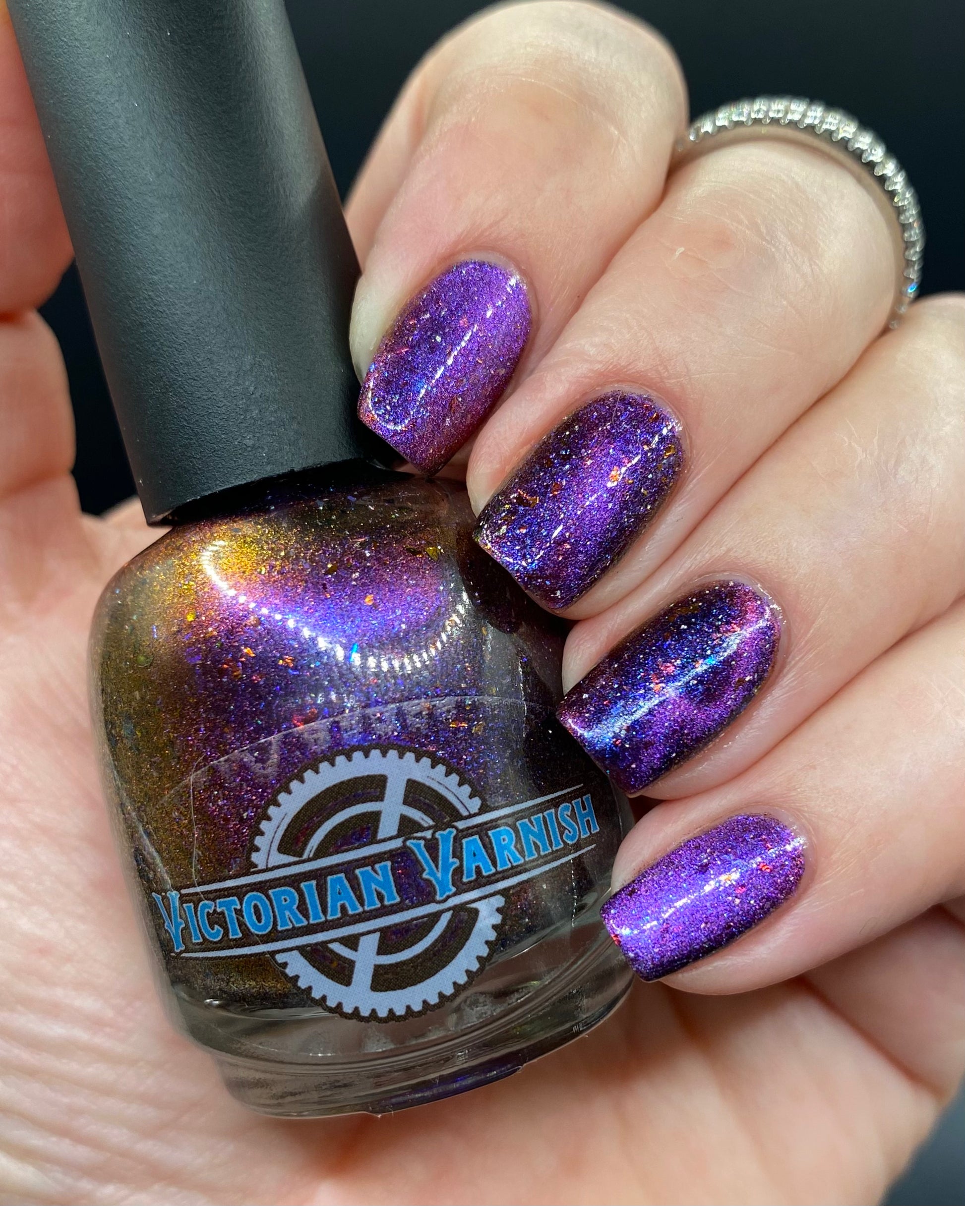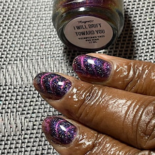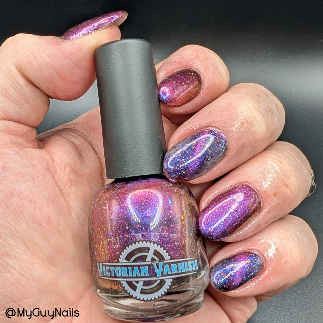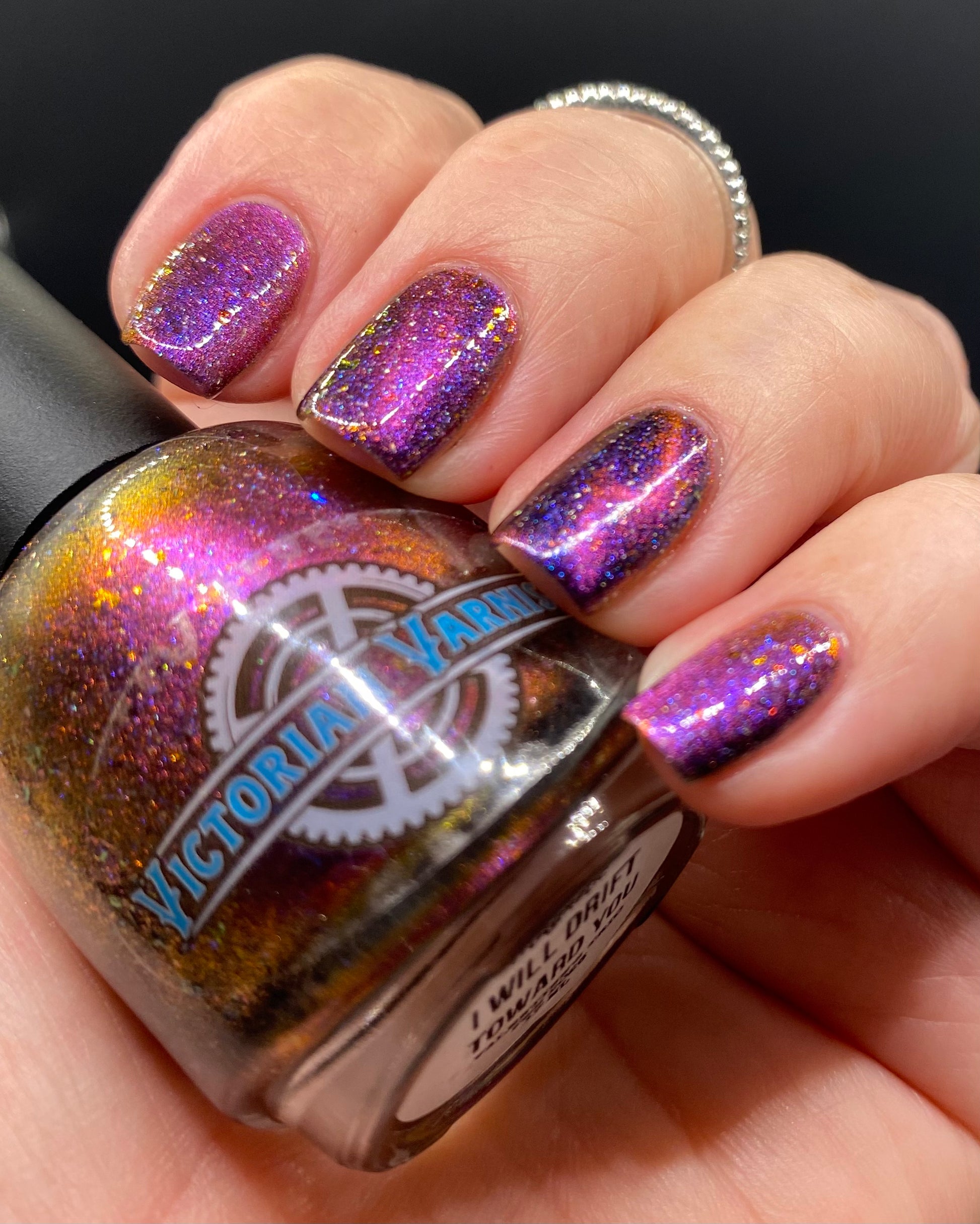 A pink/purple/peach/bronze magnetic that once magnetized reveals a deep blue large particle shimmer with UCC and ghost flakies and scattered holo flakes.