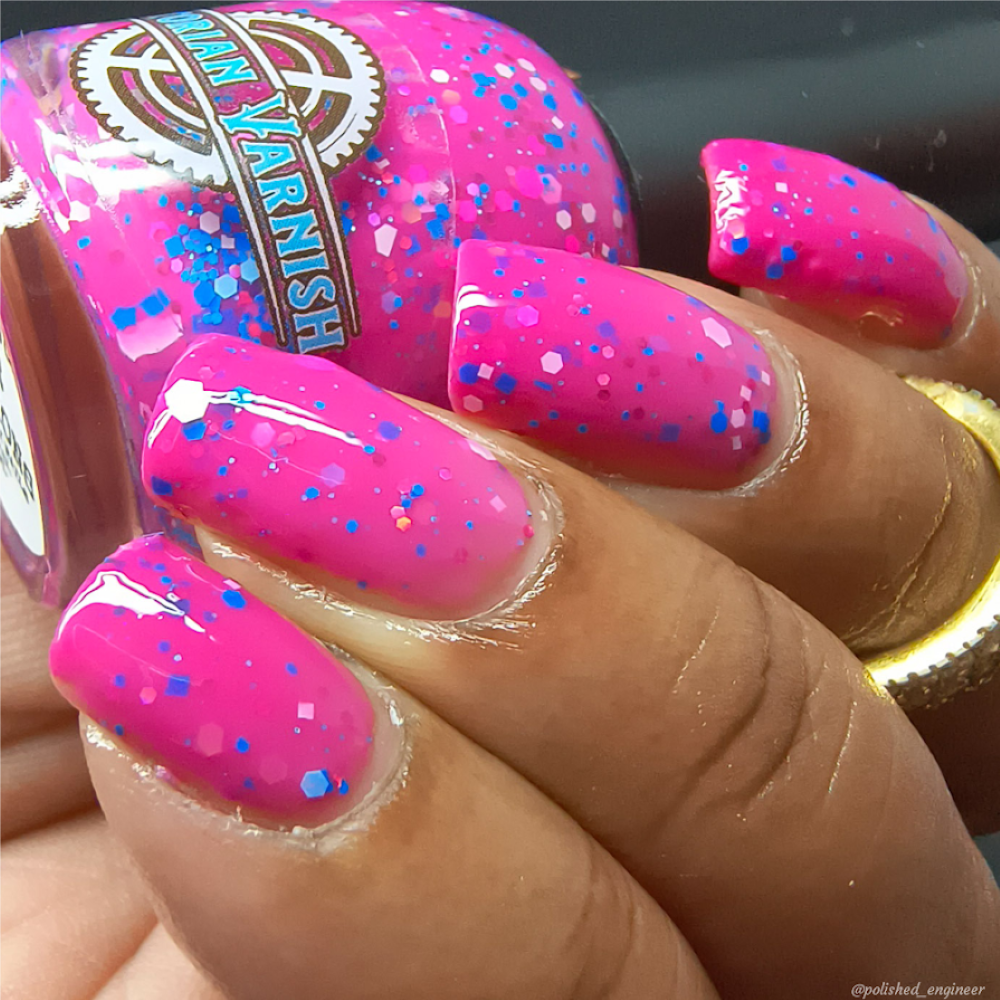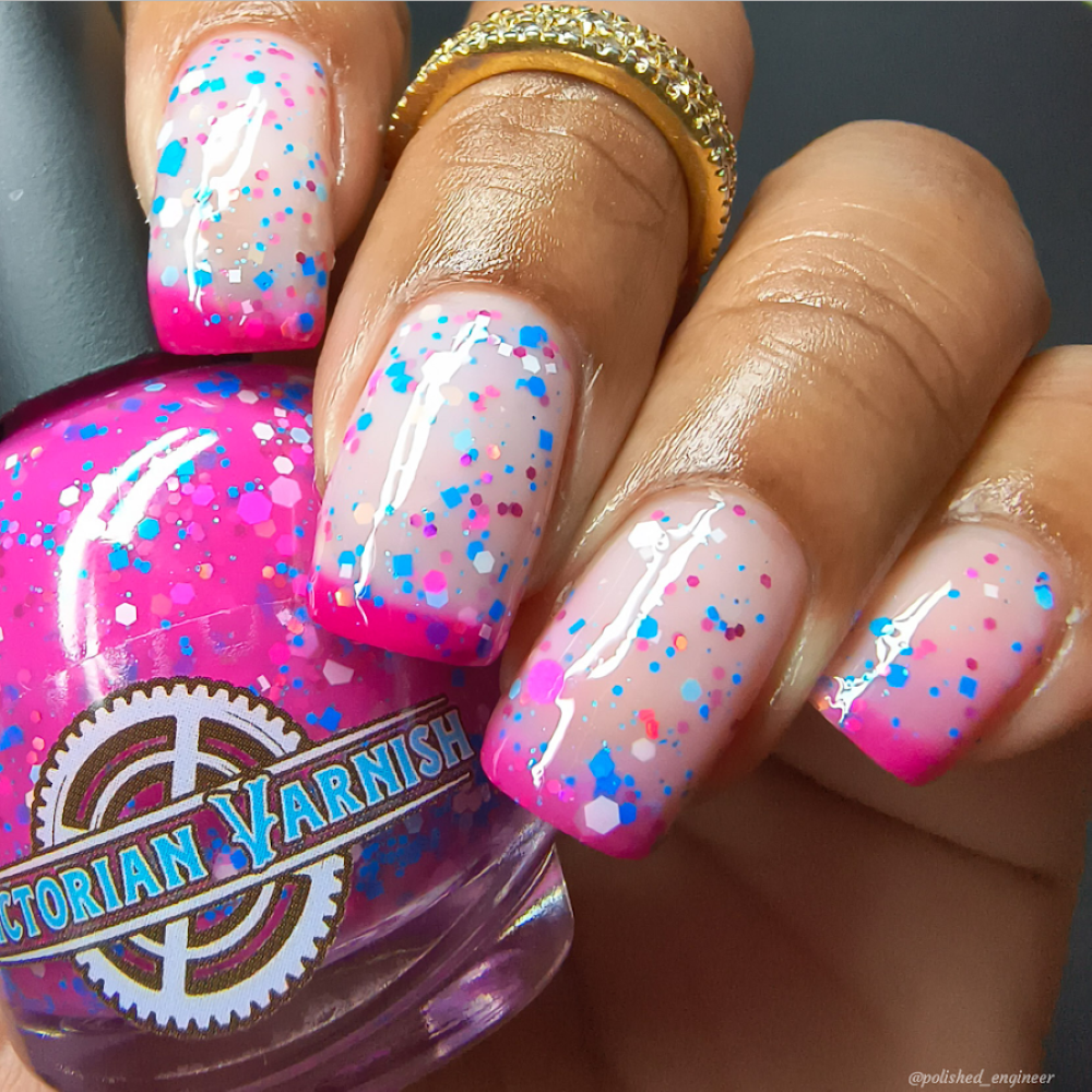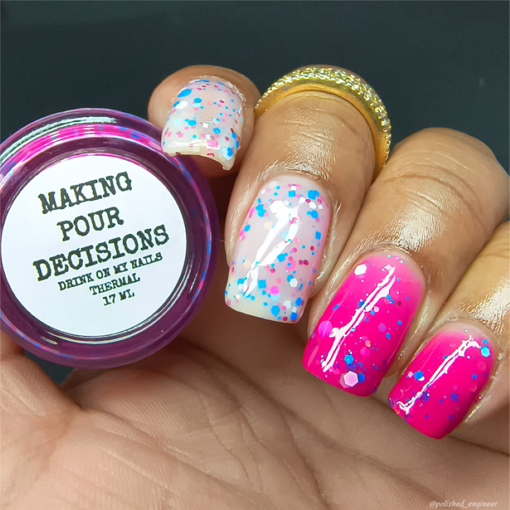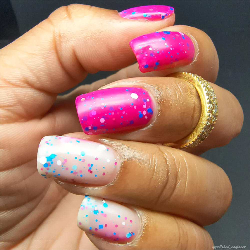 A popping pink (cold state) to clear (warm state) with neon blue/neon pink/silver/holo glitters