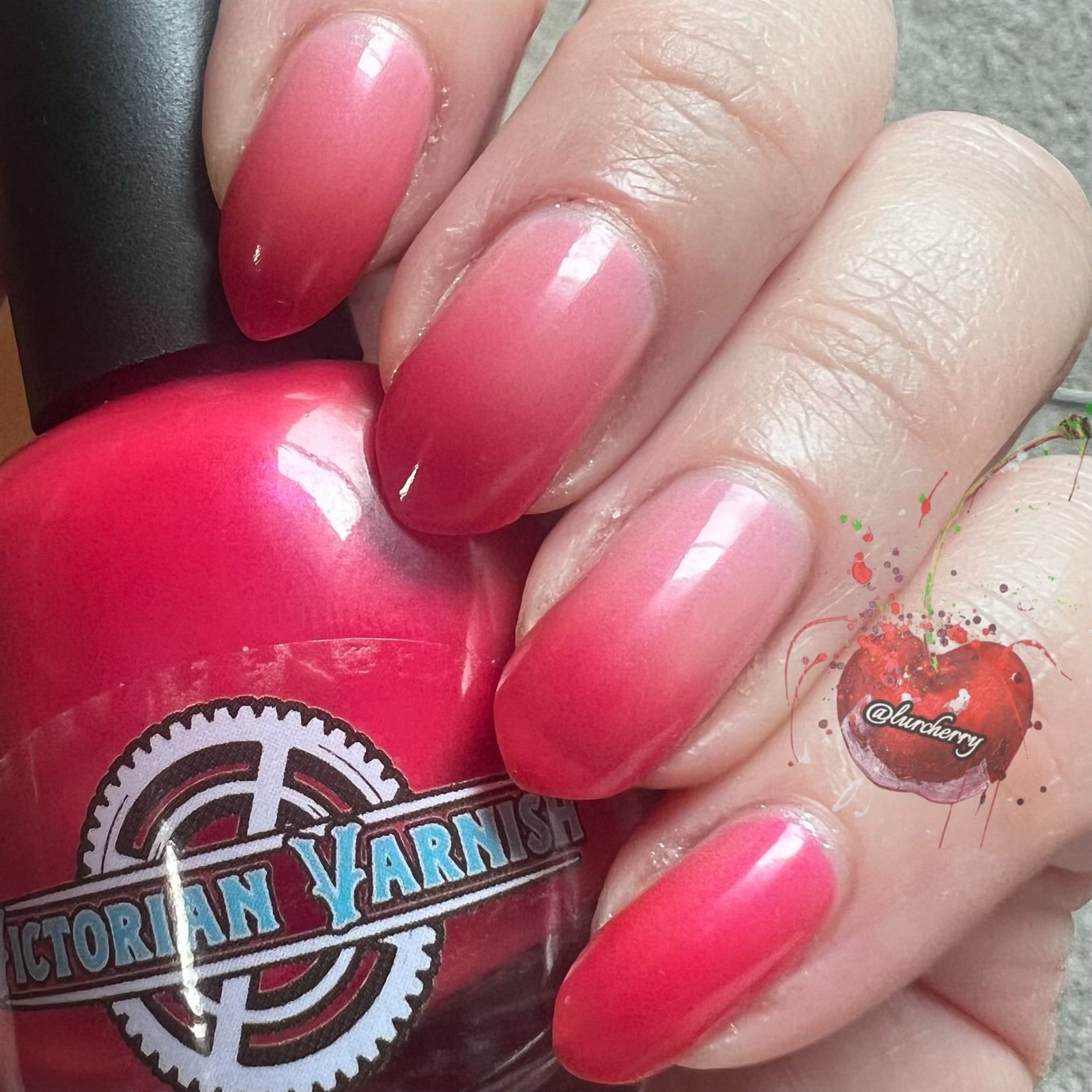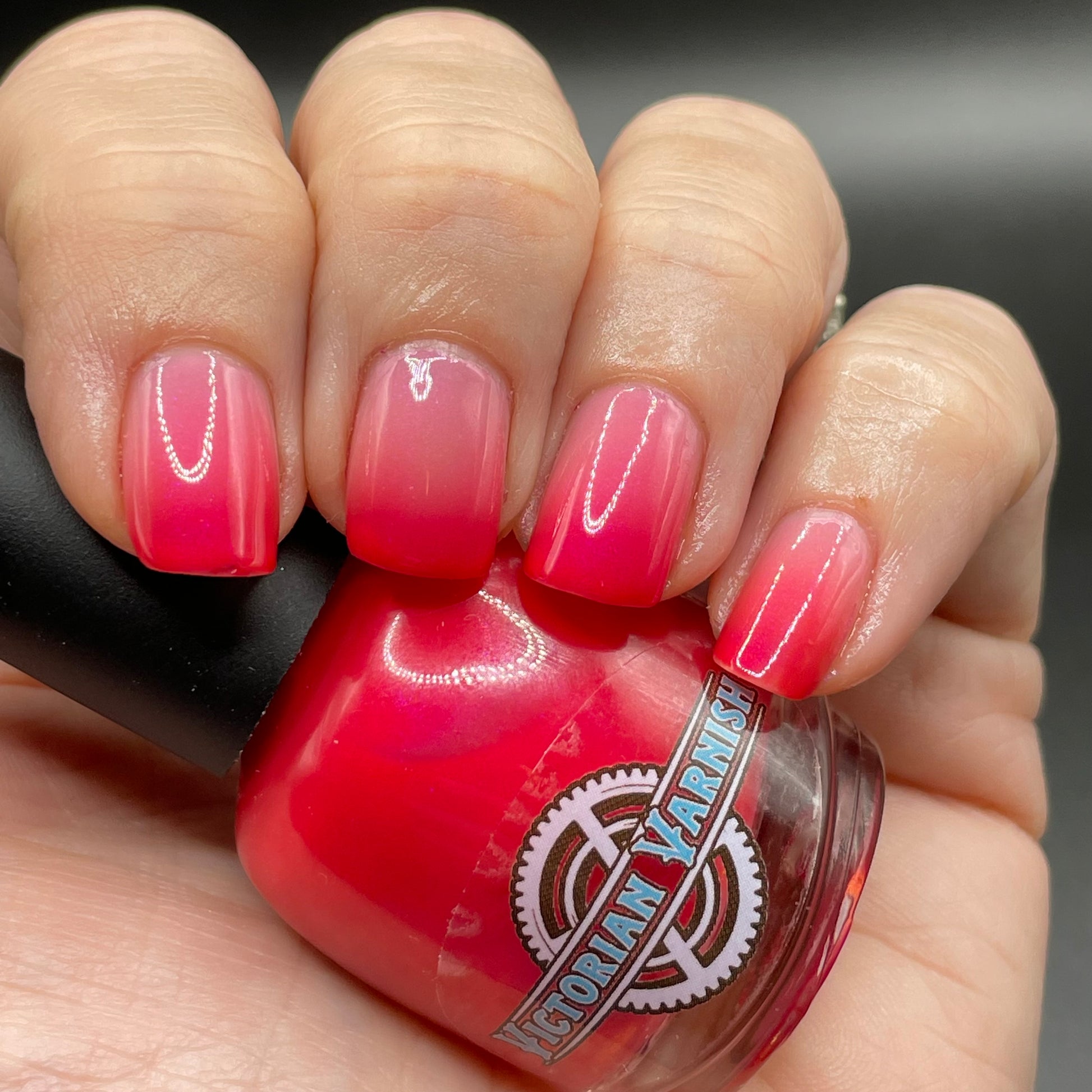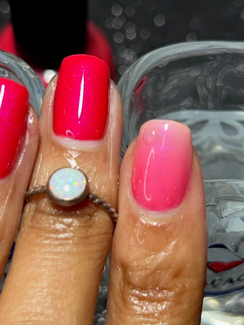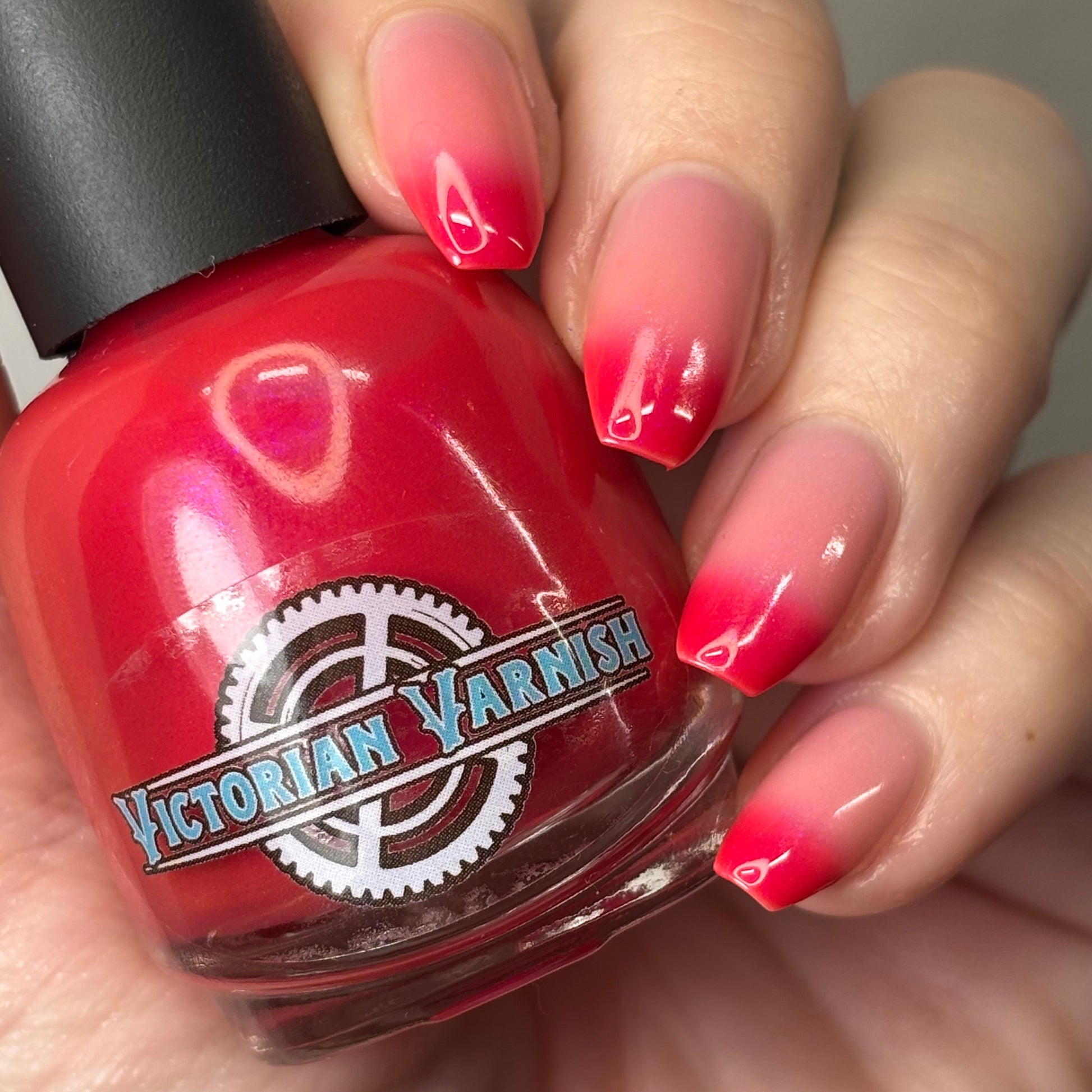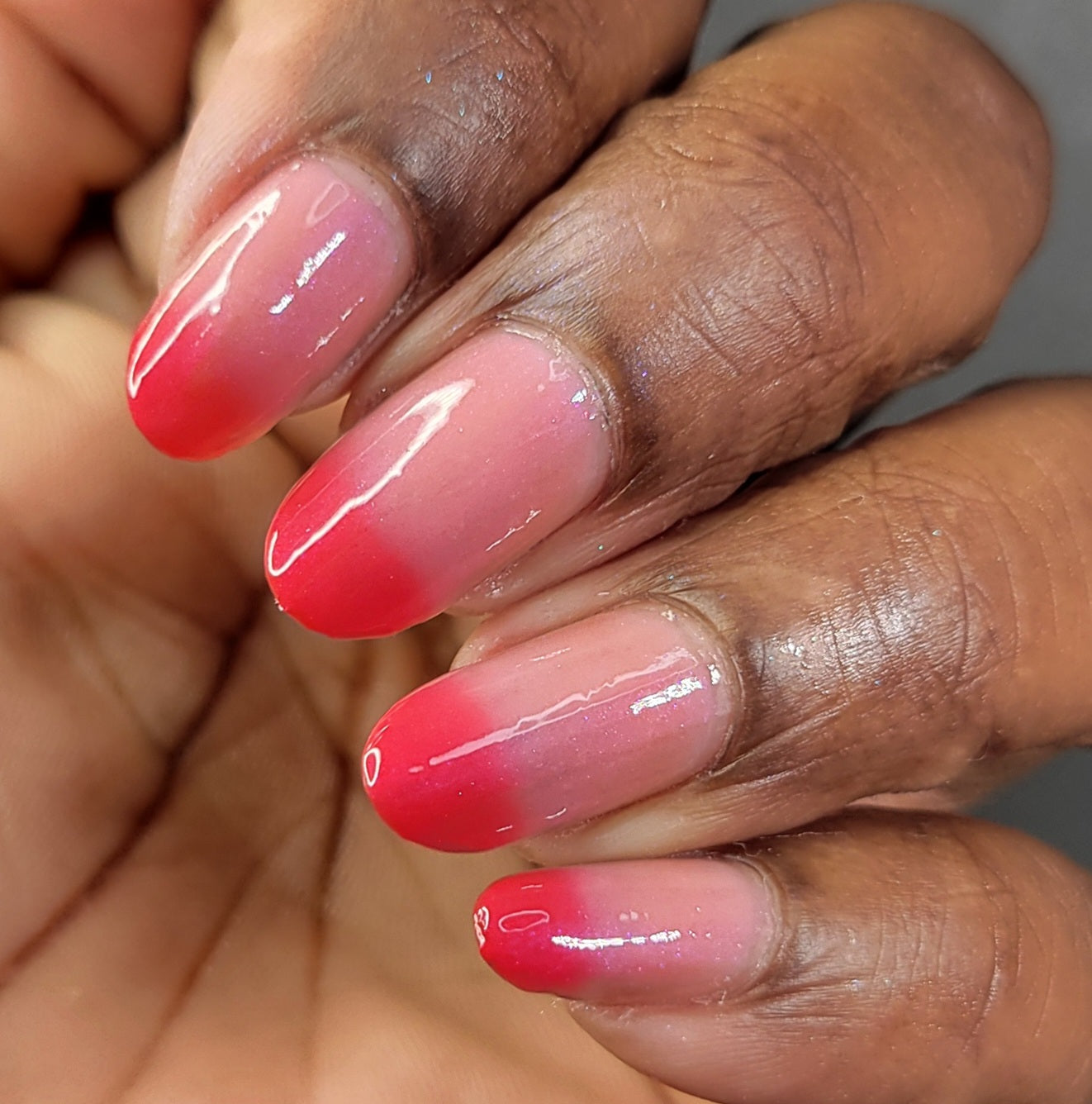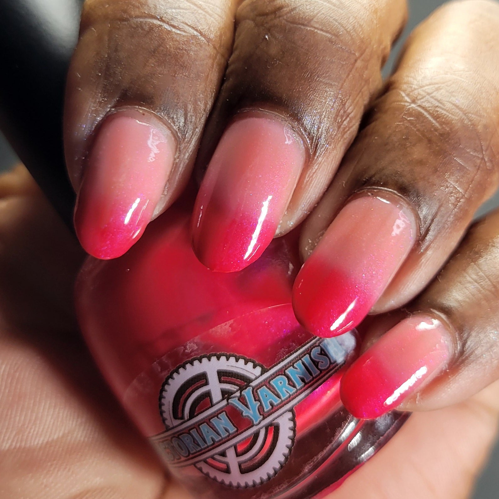 Hot pinky almost red (cold state) to clear (warm state) with a glowy red/violet aurora shimmer. (inspo - Janis Joplin’s Piece of My Heart & @polished_outta_hand)
