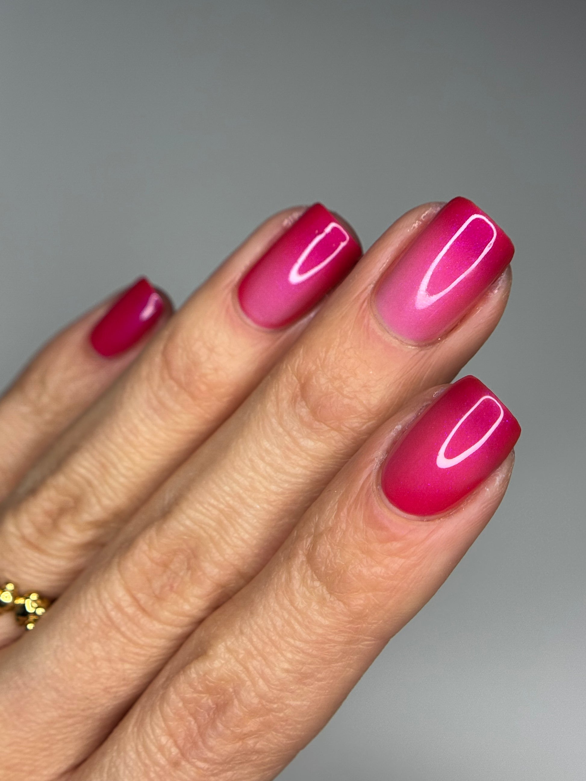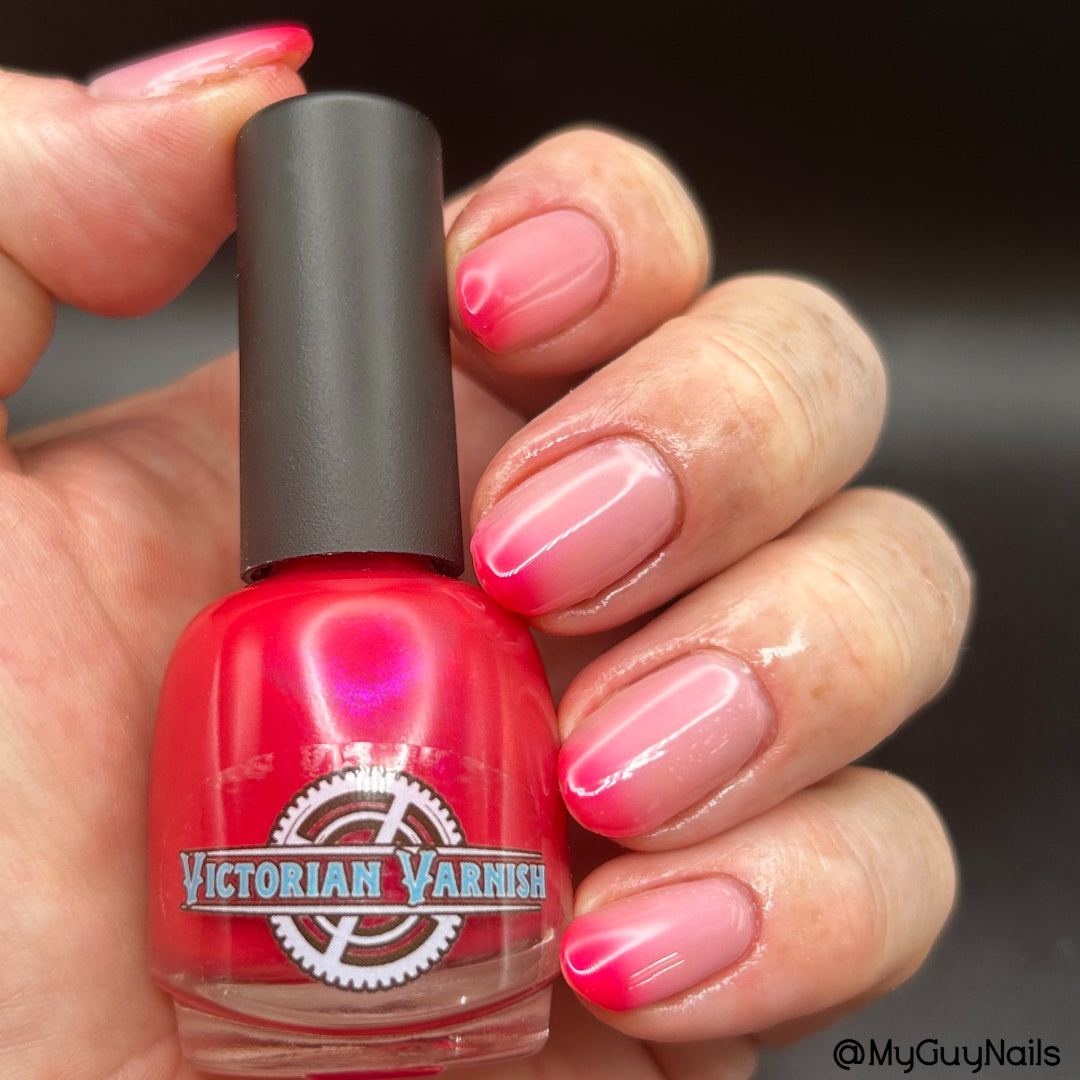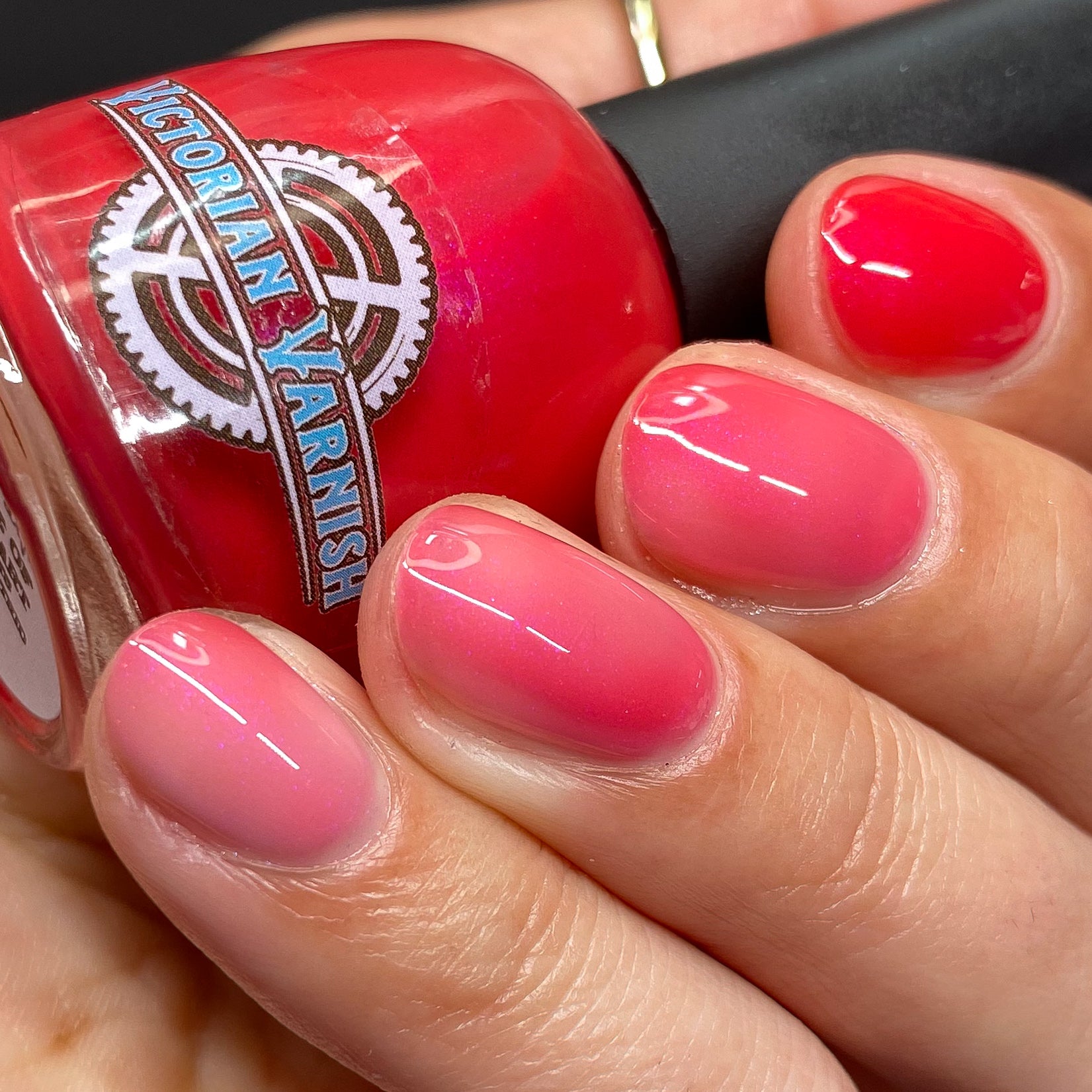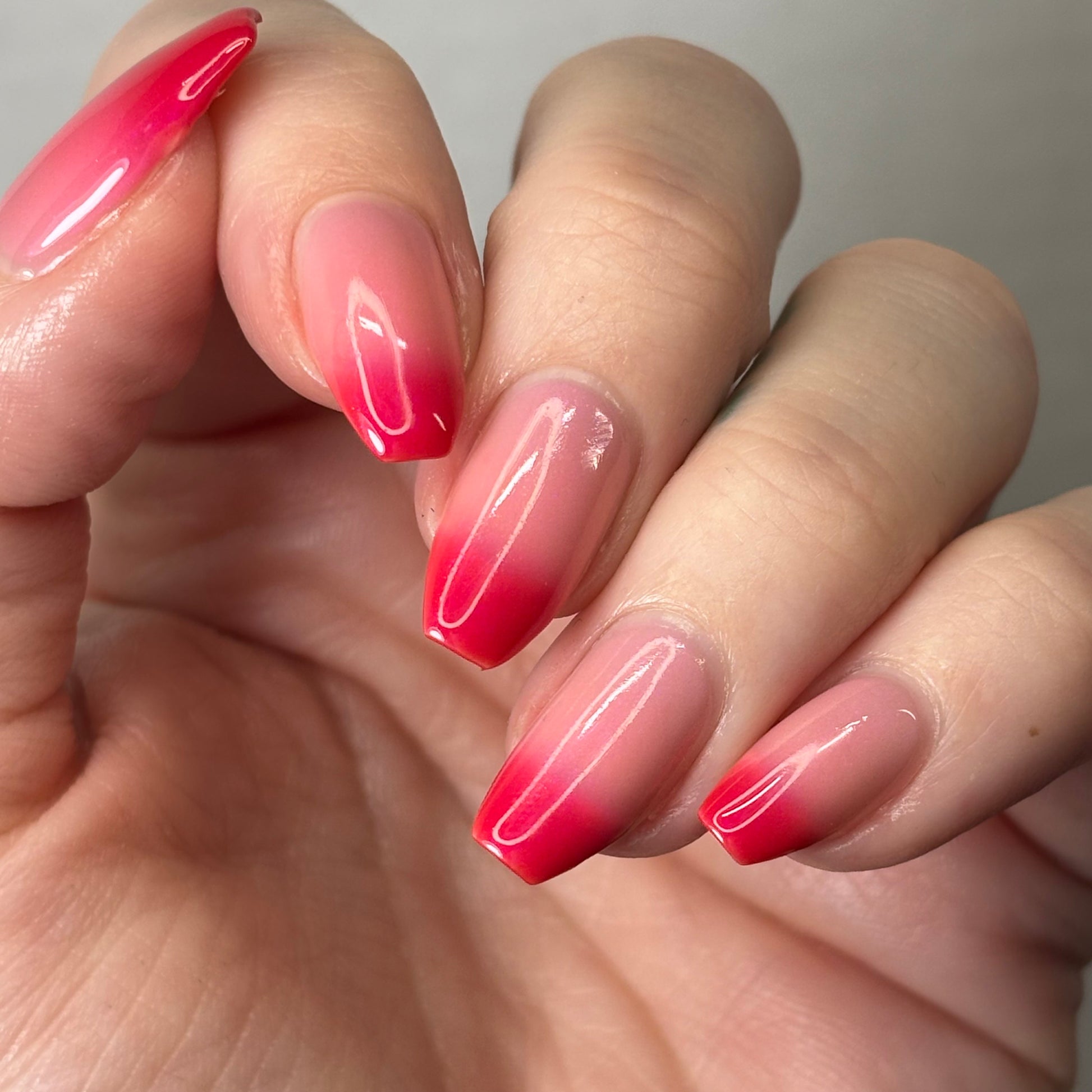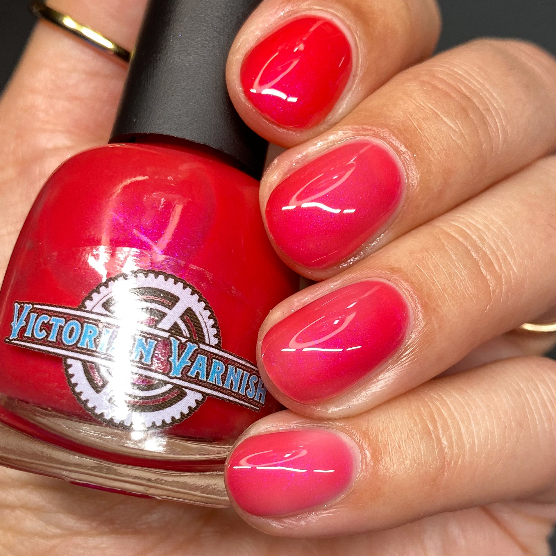Hot pinky almost red (cold state) to clear (warm state) with a glowy red/violet aurora shimmer. (inspo - Janis Joplin’s Piece of My Heart & @polished_outta_hand)