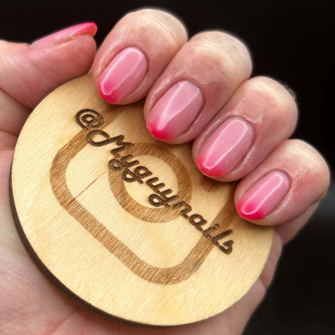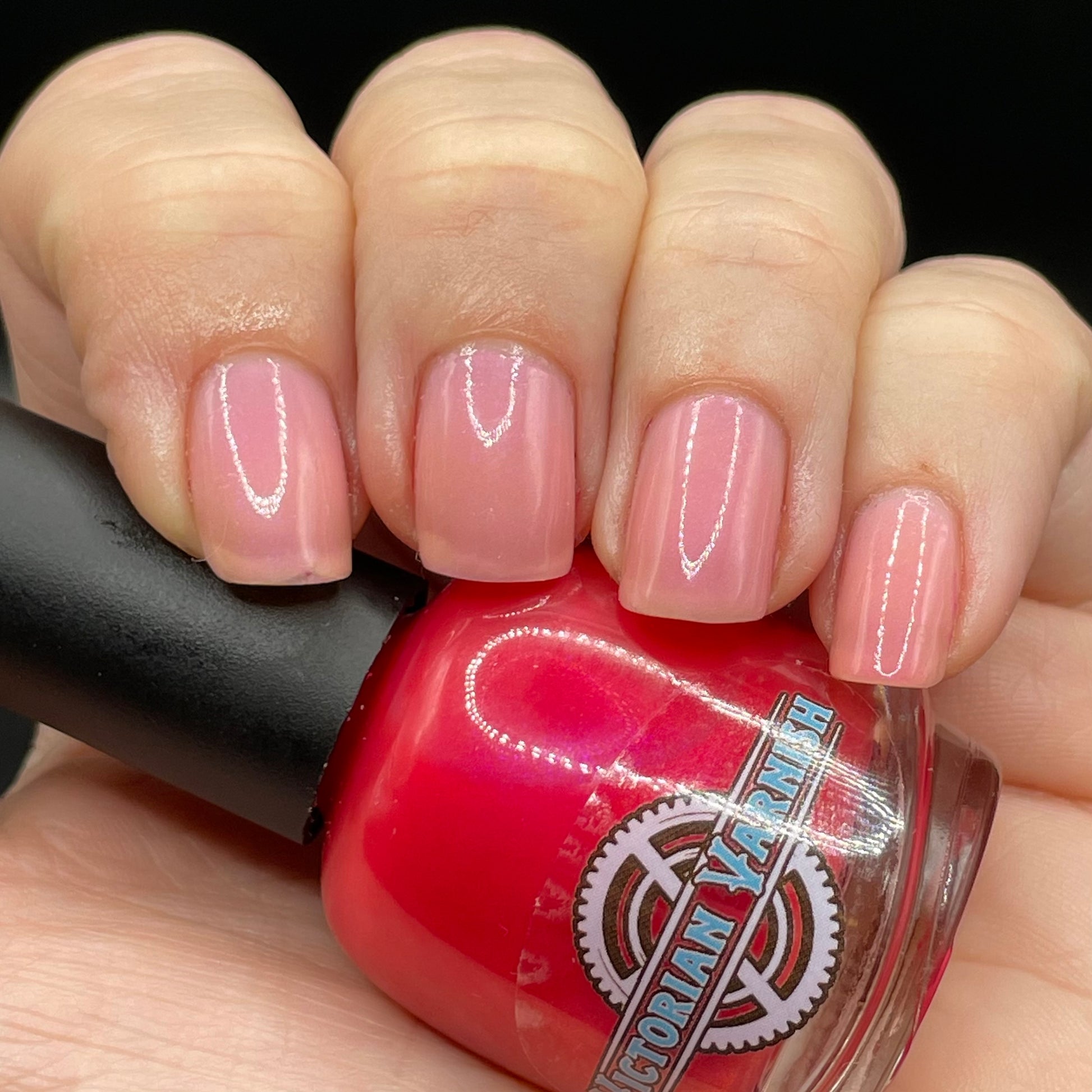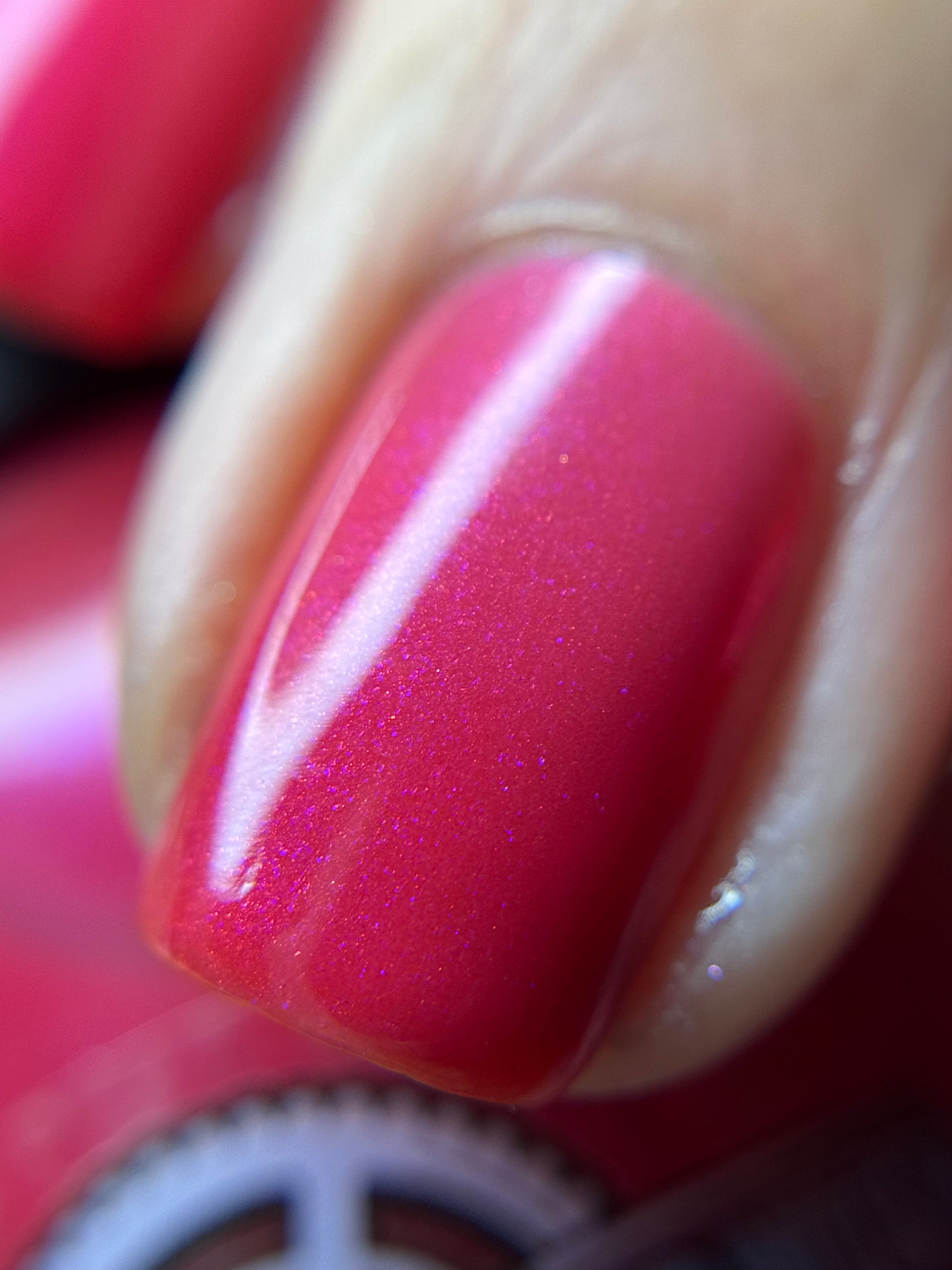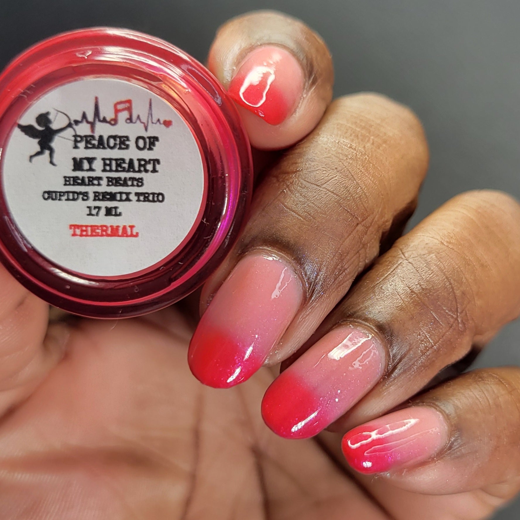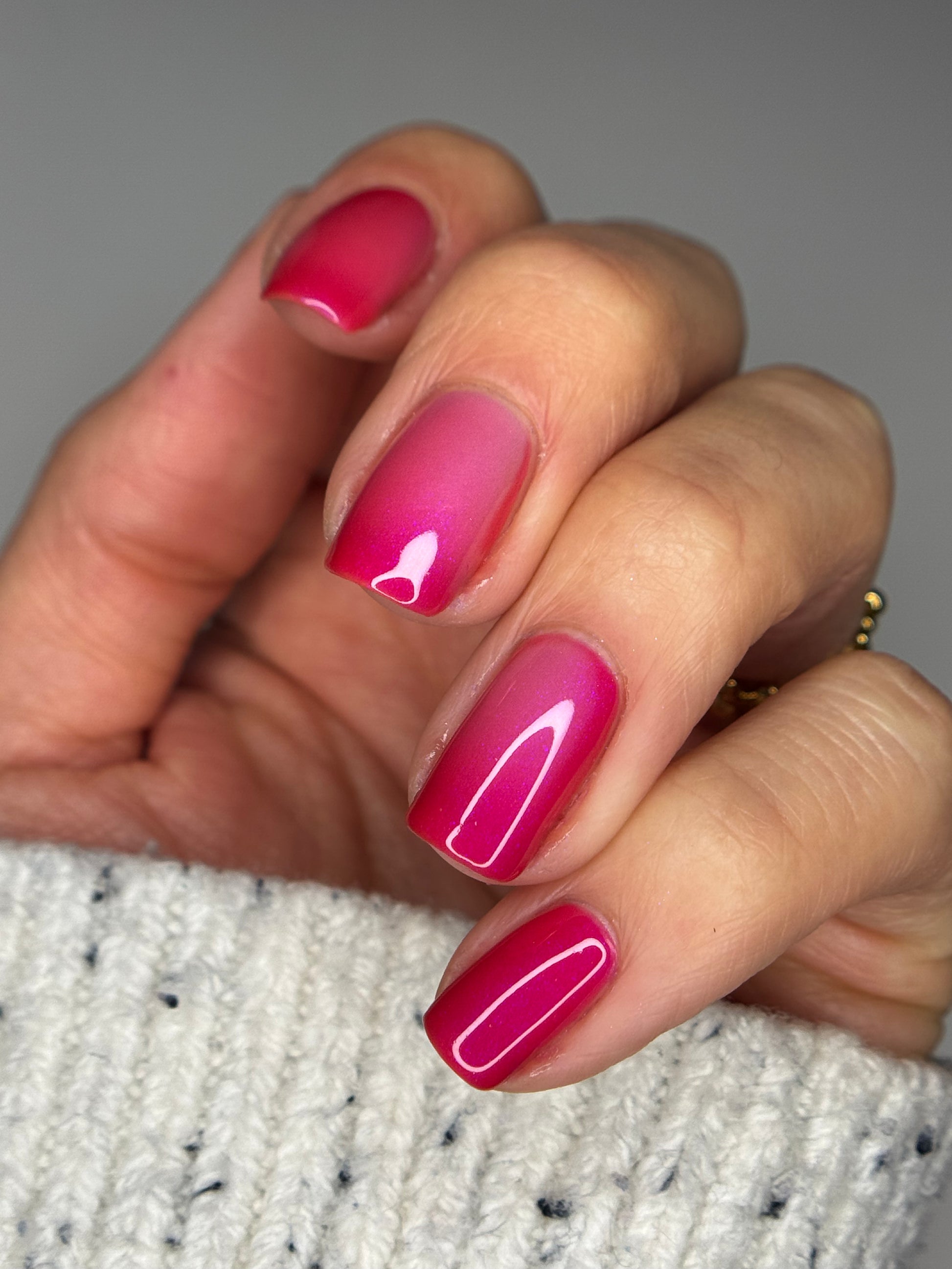 Hot pinky almost red (cold state) to clear (warm state) with a glowy red/violet aurora shimmer. (inspo - Janis Joplin’s Piece of My Heart & @polished_outta_hand)