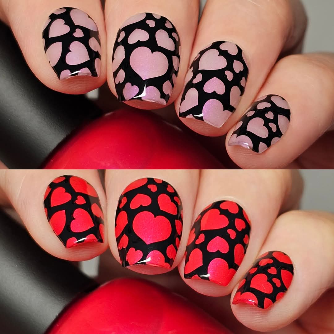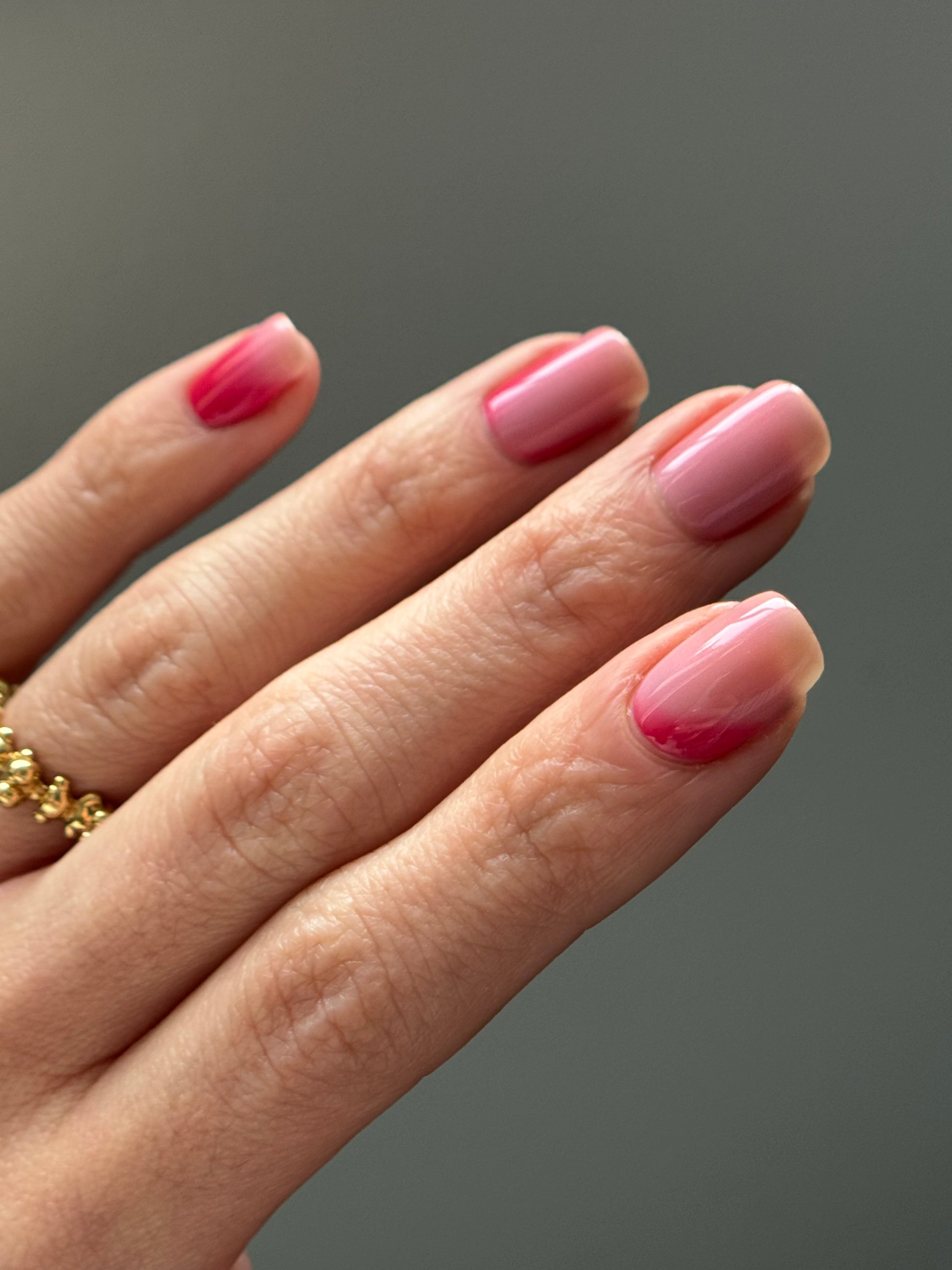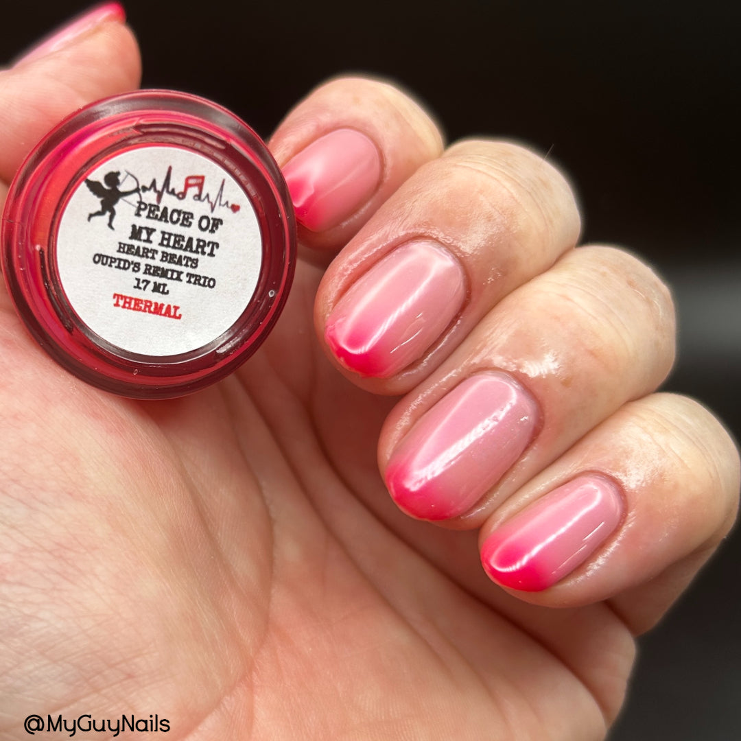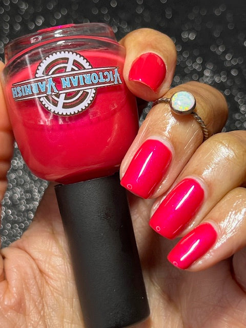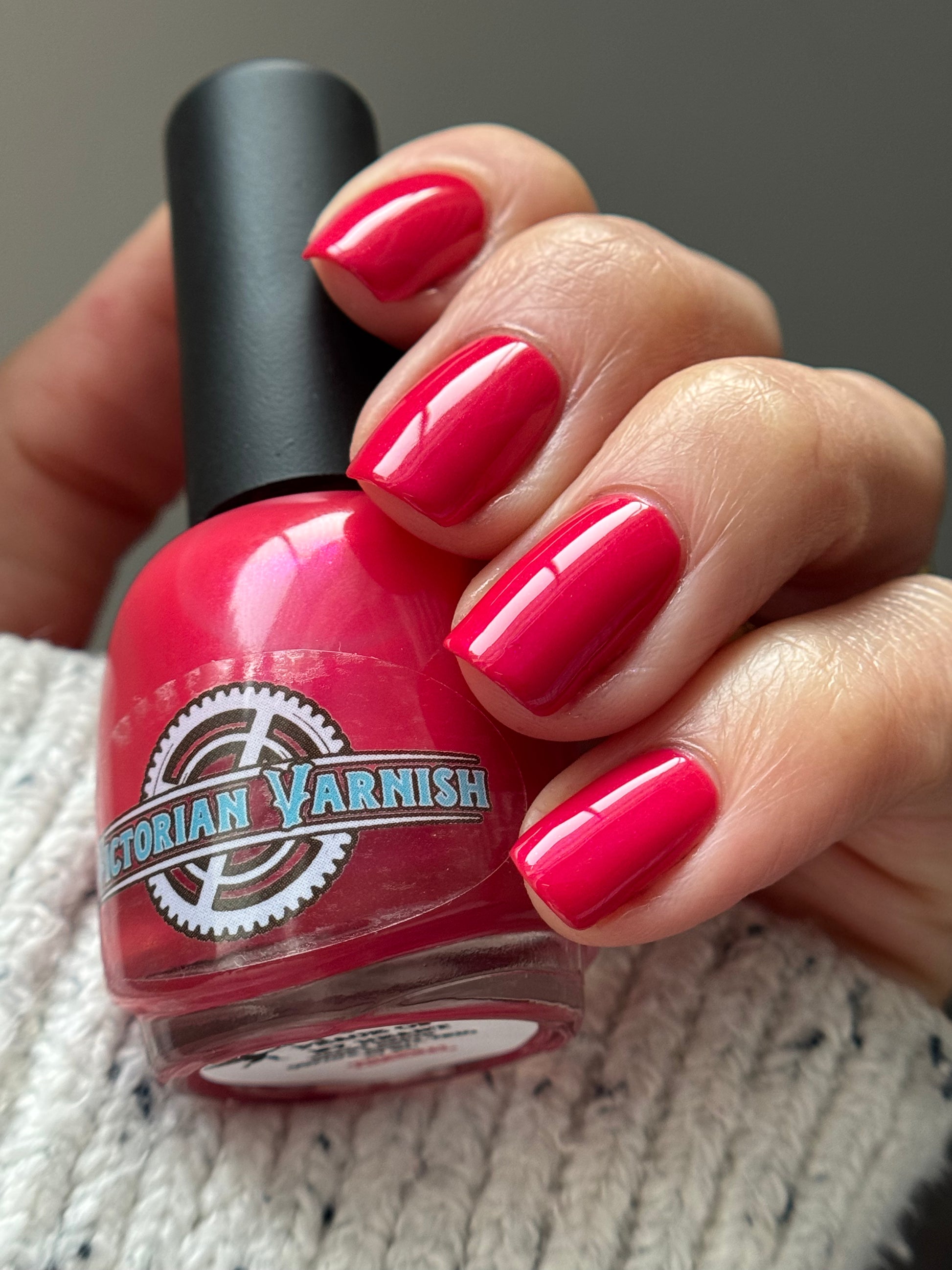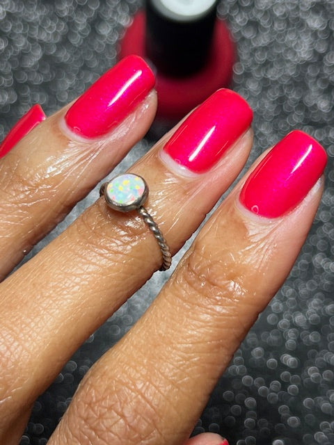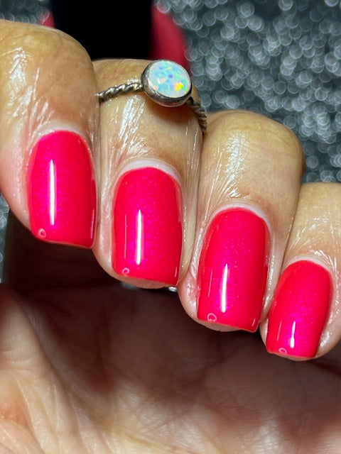 Hot pinky almost red (cold state) to clear (warm state) with a glowy red/violet aurora shimmer. (inspo - Janis Joplin’s Piece of My Heart & @polished_outta_hand)