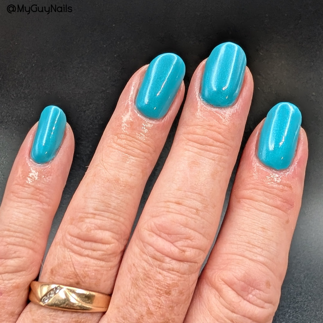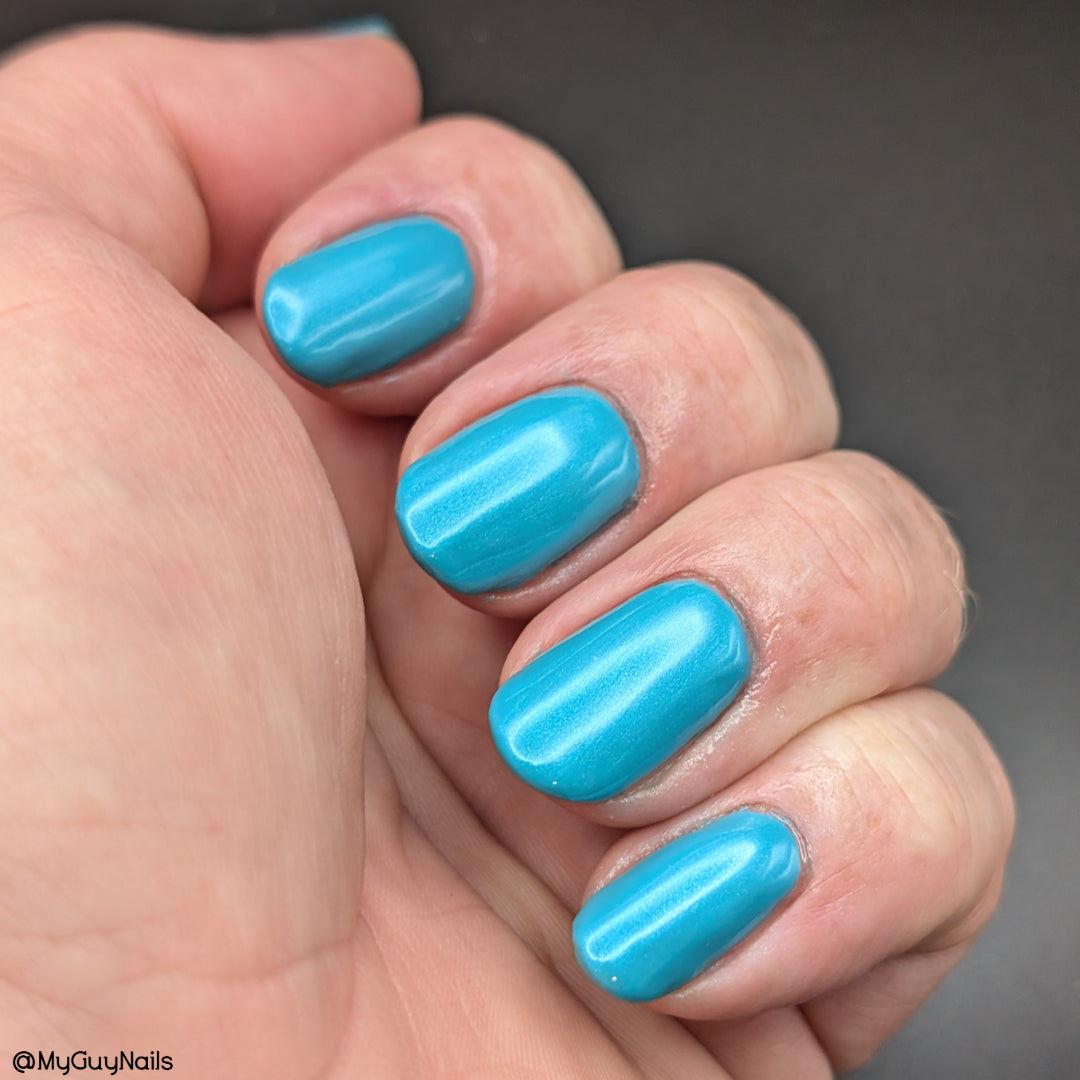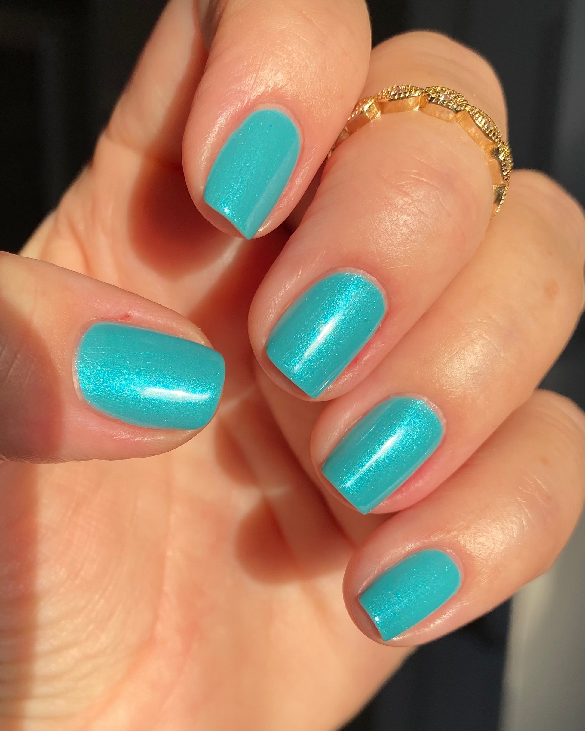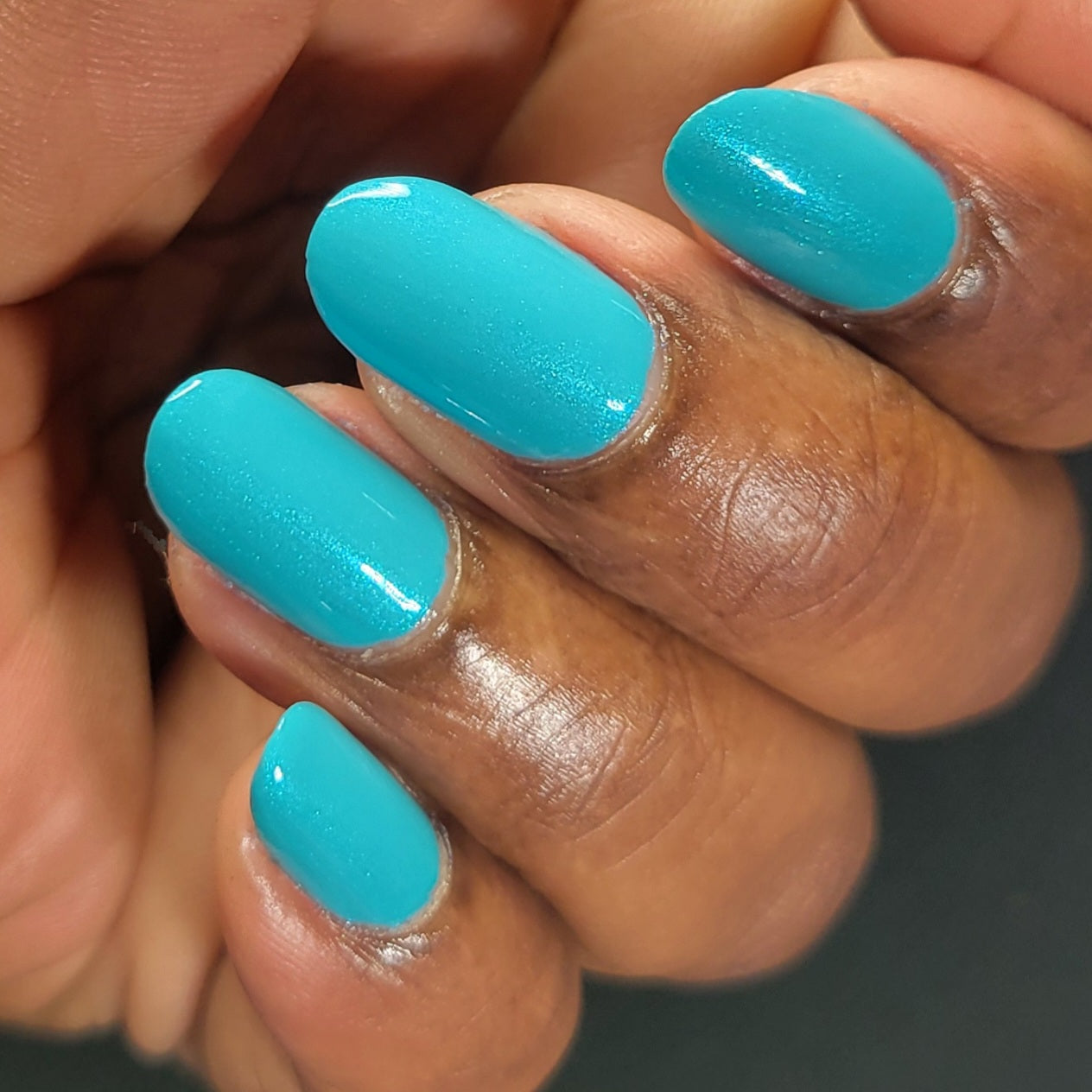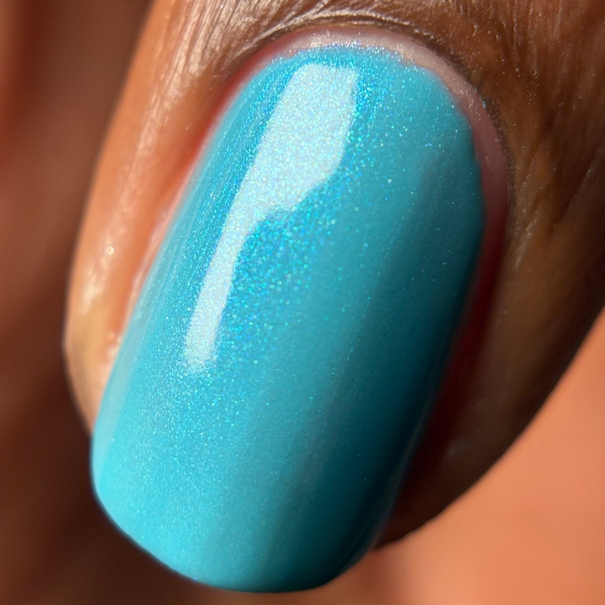 A lovely warm toned aqua shade with cooler blue/green undertones with a corresponding aqua/blue shimmer (based on Pantone Rinsing Rivulet)