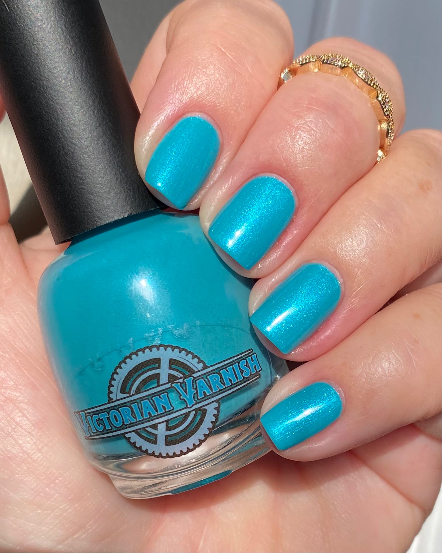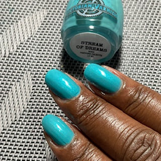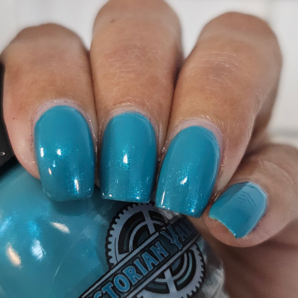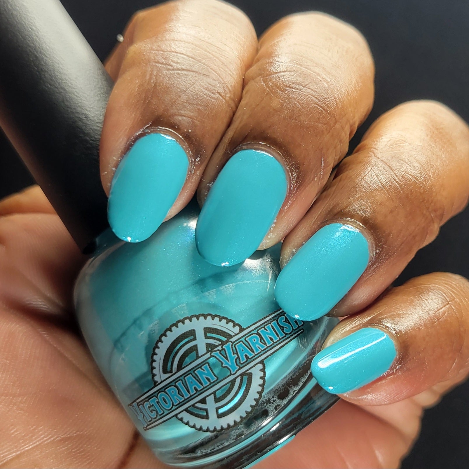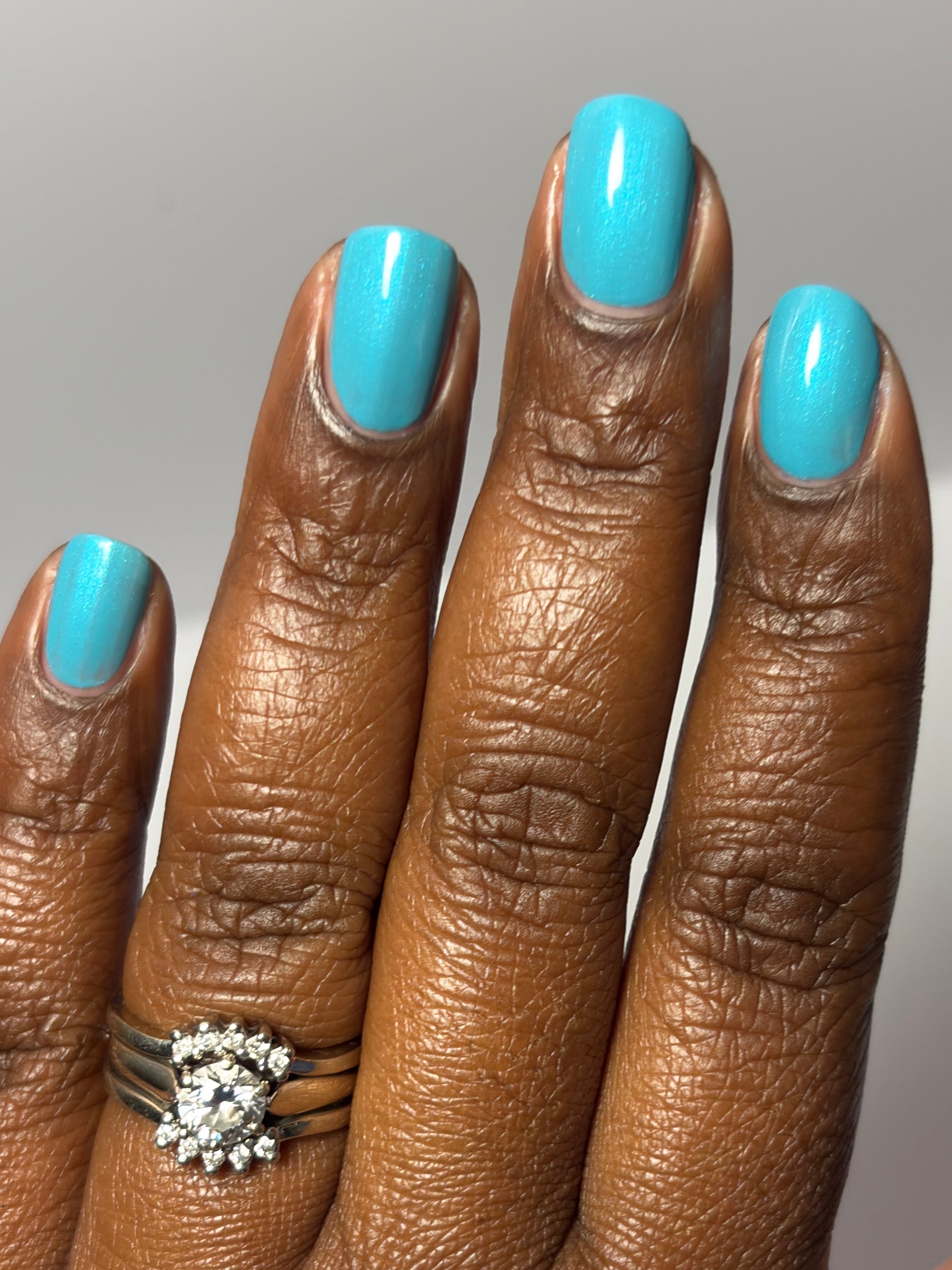 A lovely warm toned aqua shade with cooler blue/green undertones with a corresponding aqua/blue shimmer (based on Pantone Rinsing Rivulet)
