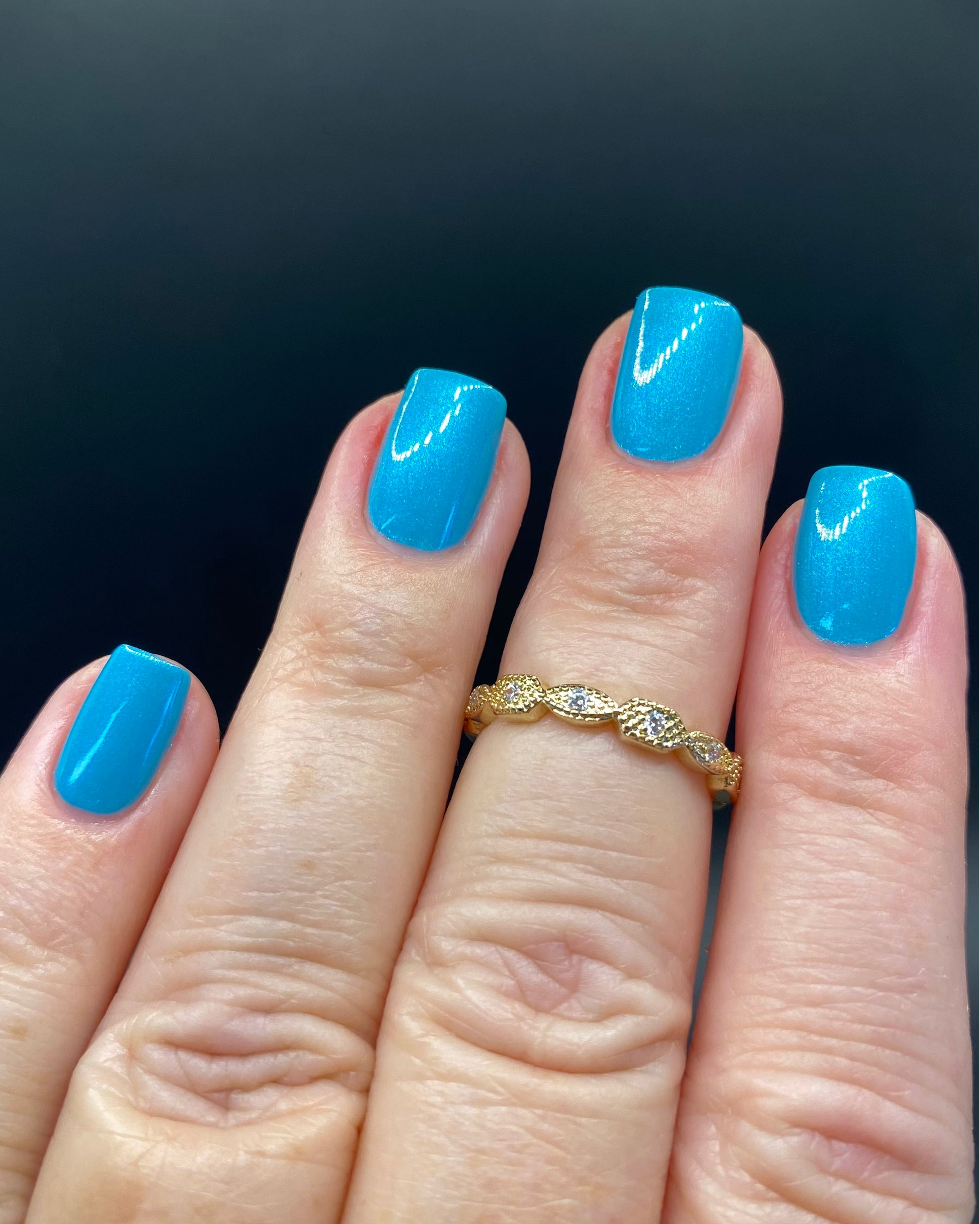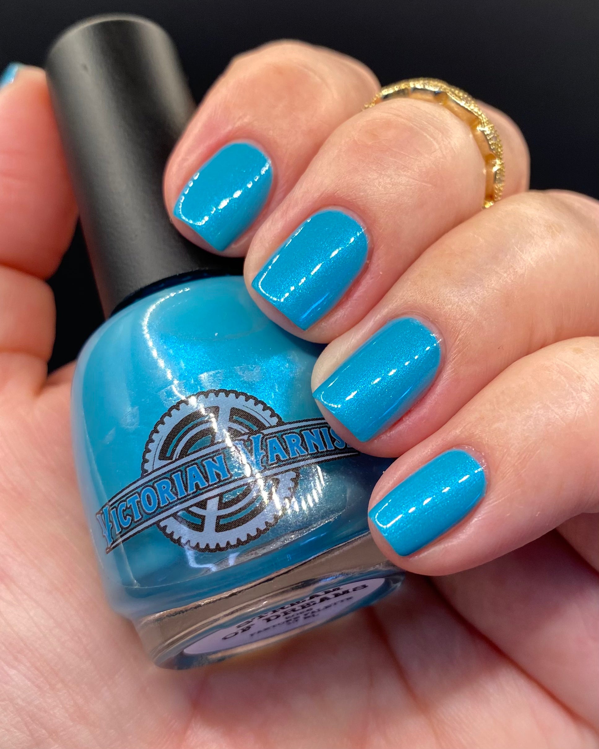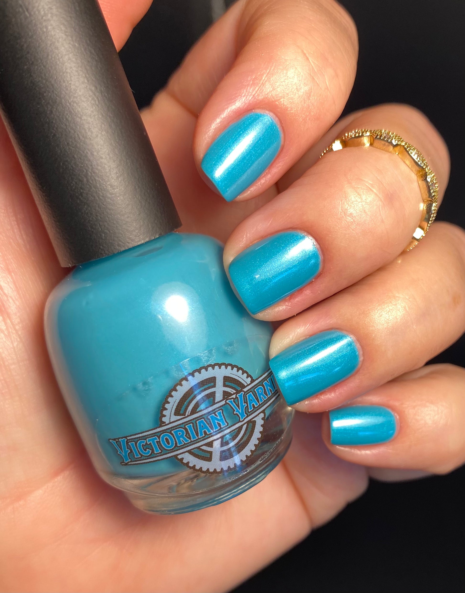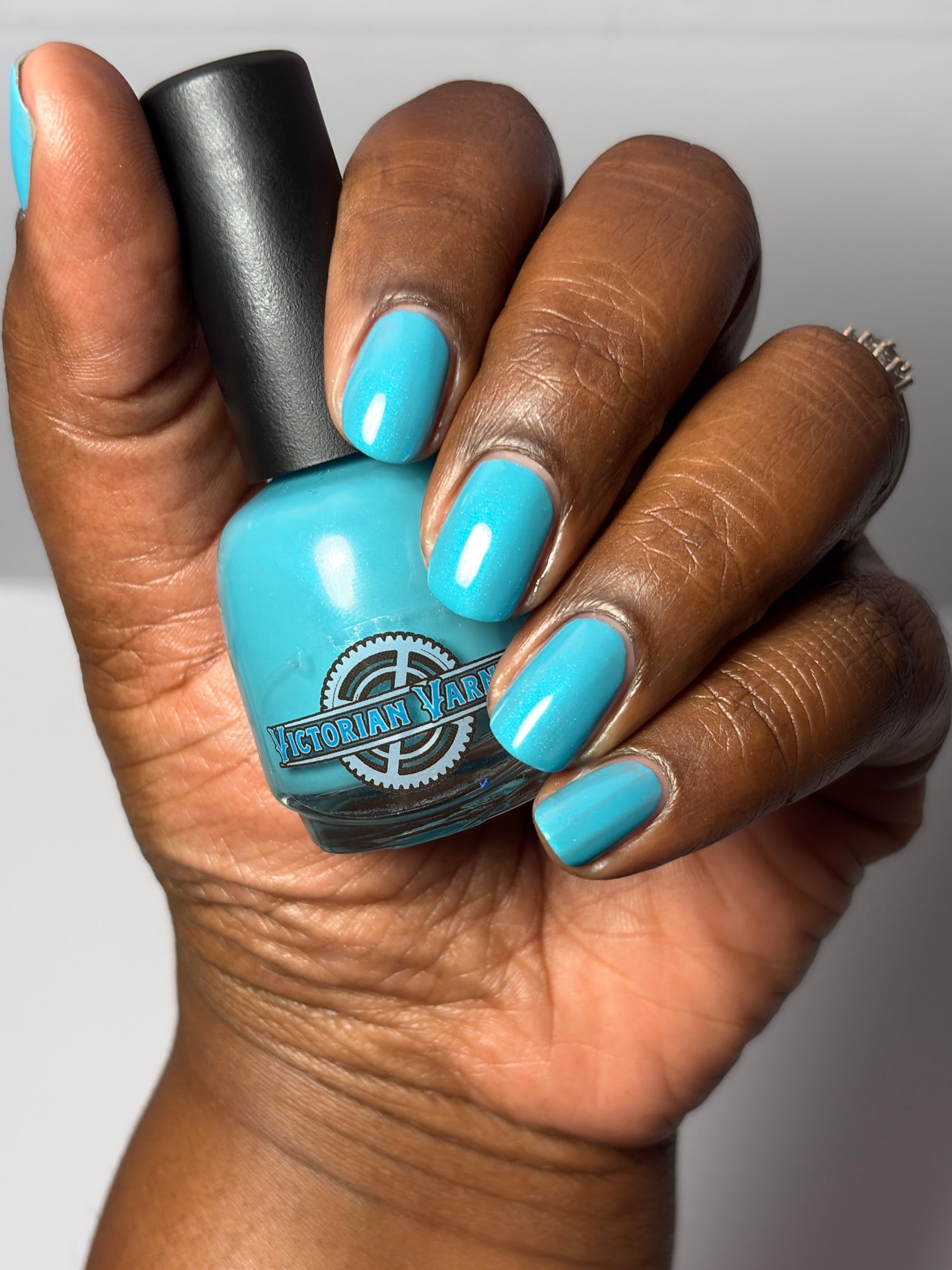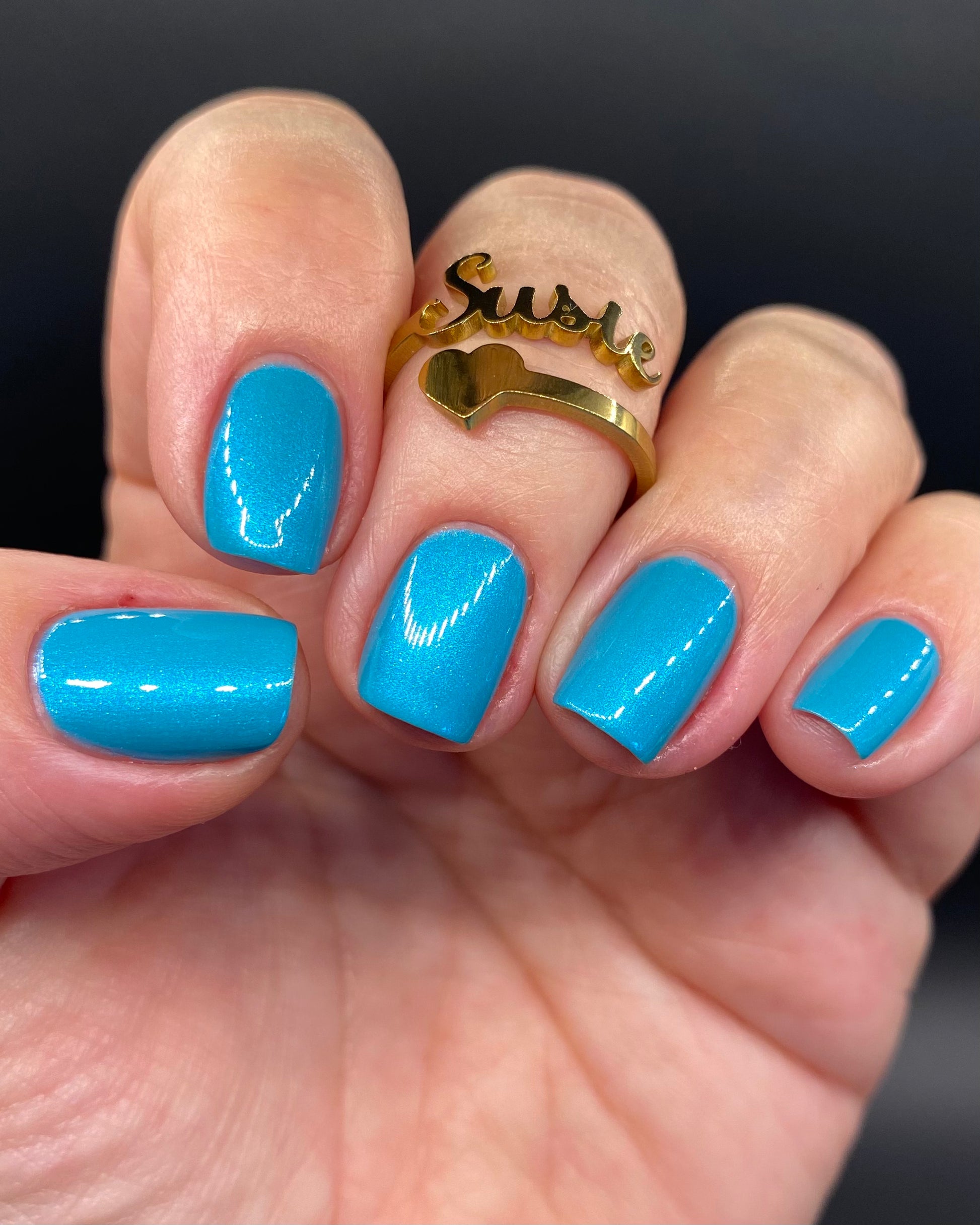 A lovely warm toned aqua shade with cooler blue/green undertones with a corresponding aqua/blue shimmer (based on Pantone Rinsing Rivulet)