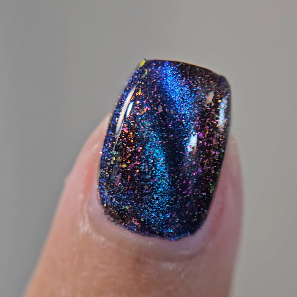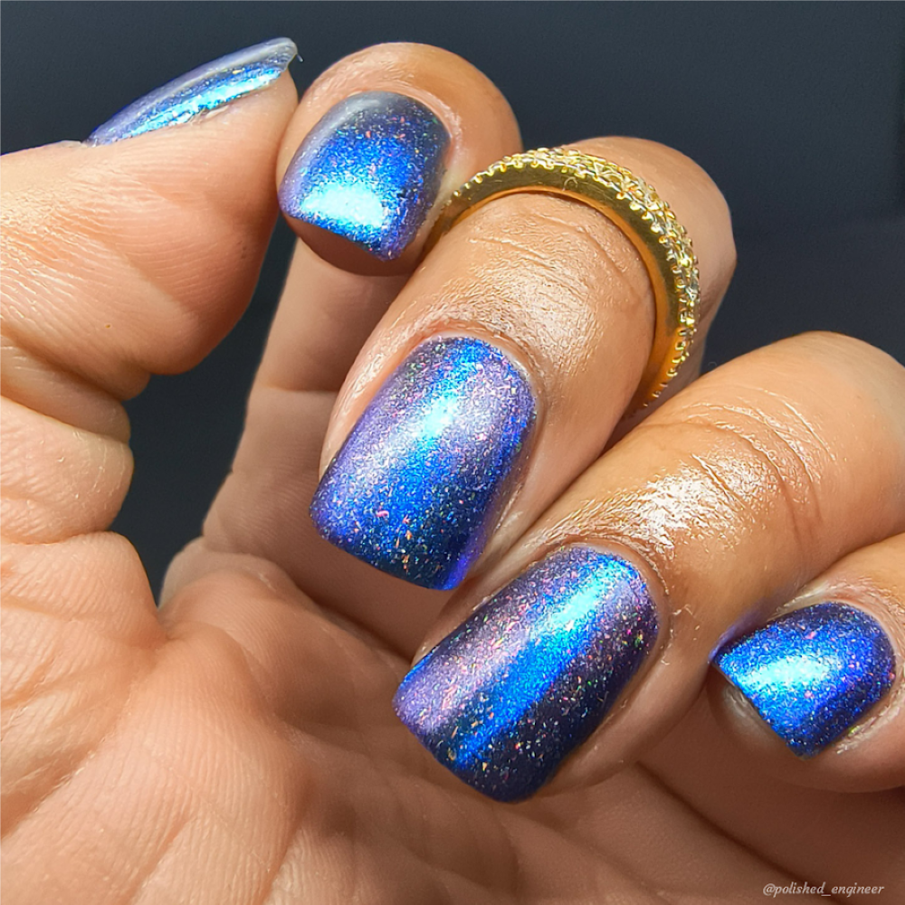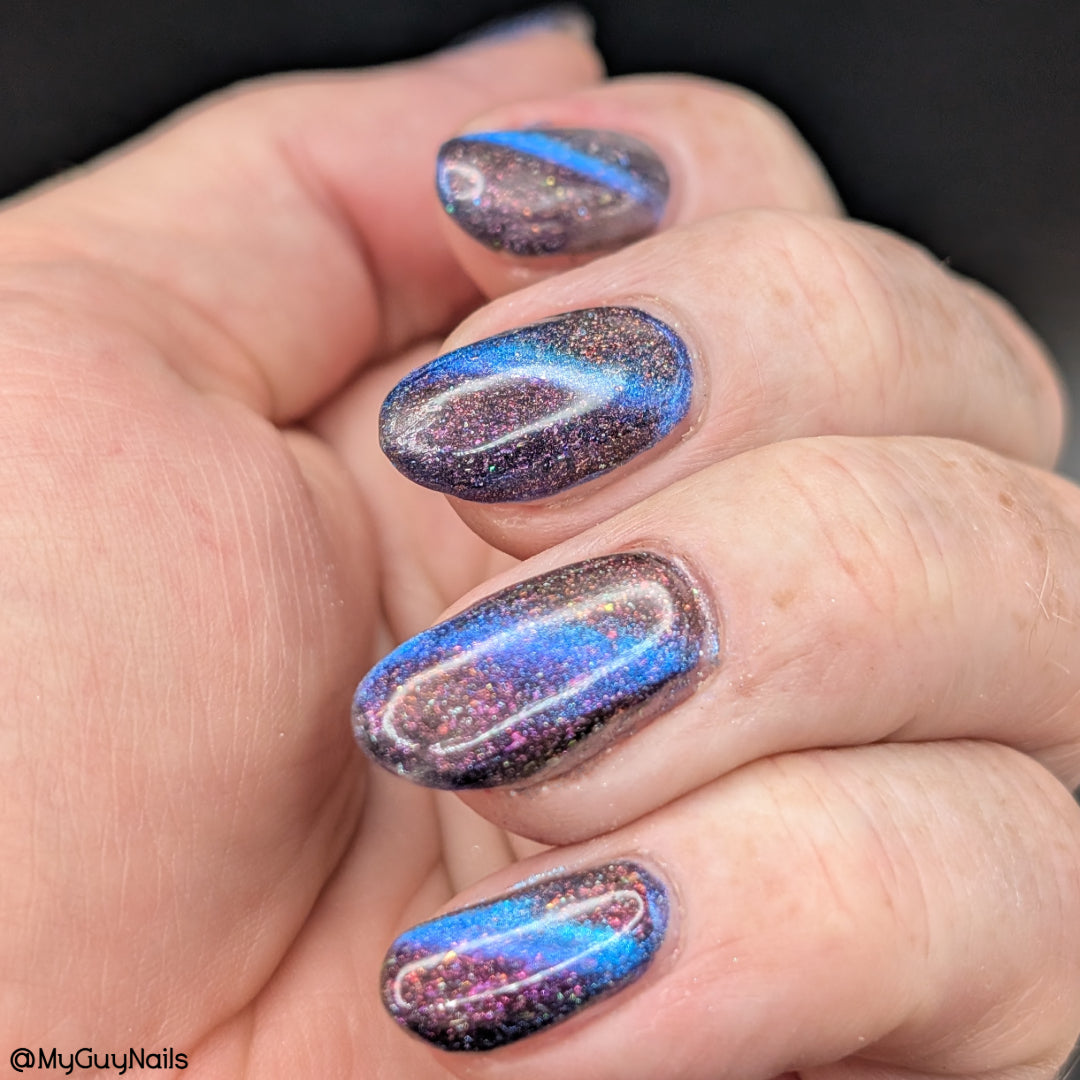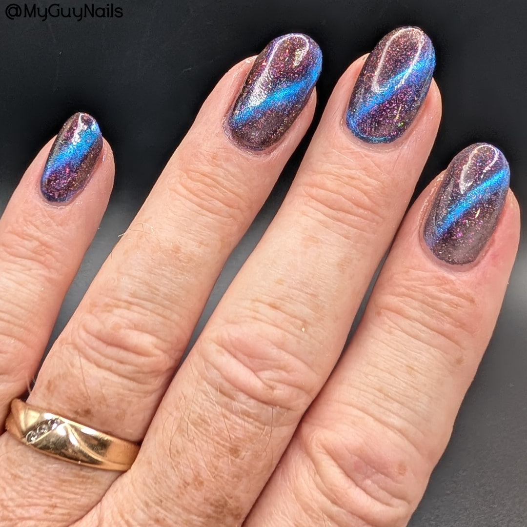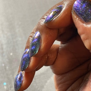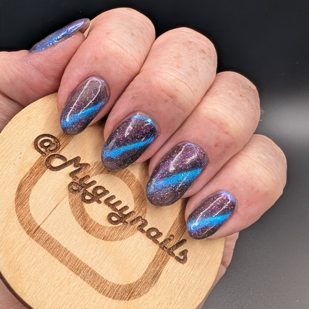 A deep blue to purple multi dimensional magnetic that once magnetized reveals a glowy pink/violet/peach/bronze/gold shimmer with micro aurora holo flakies
