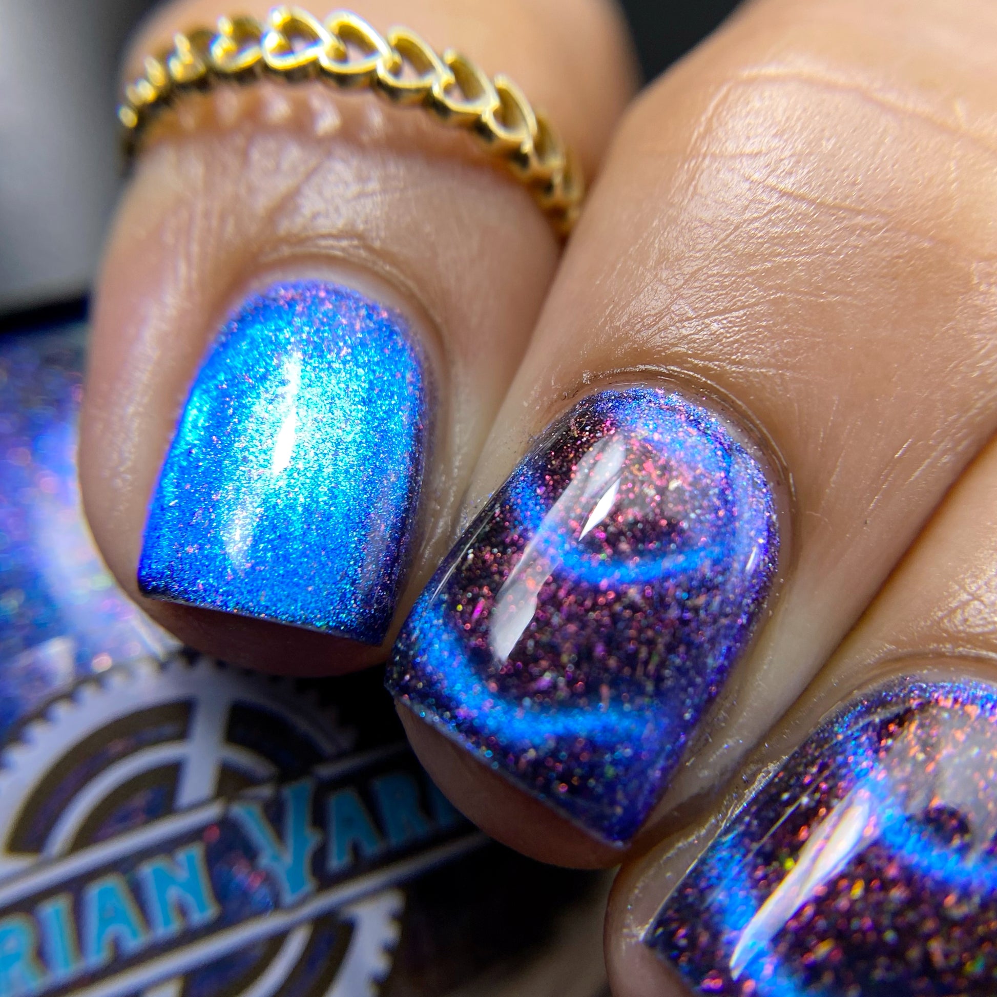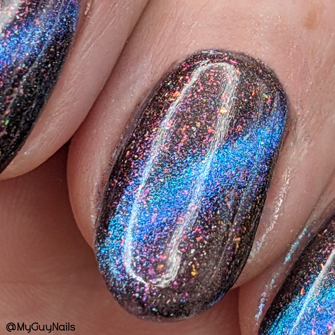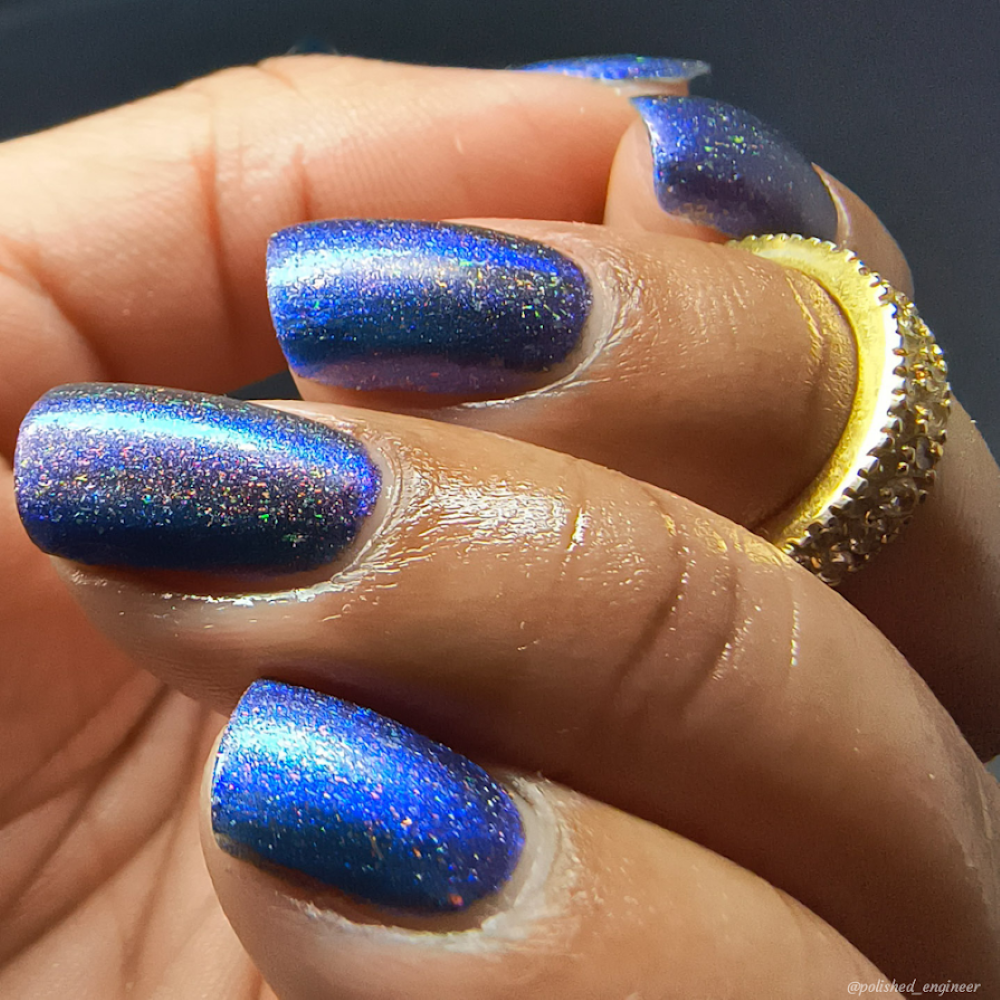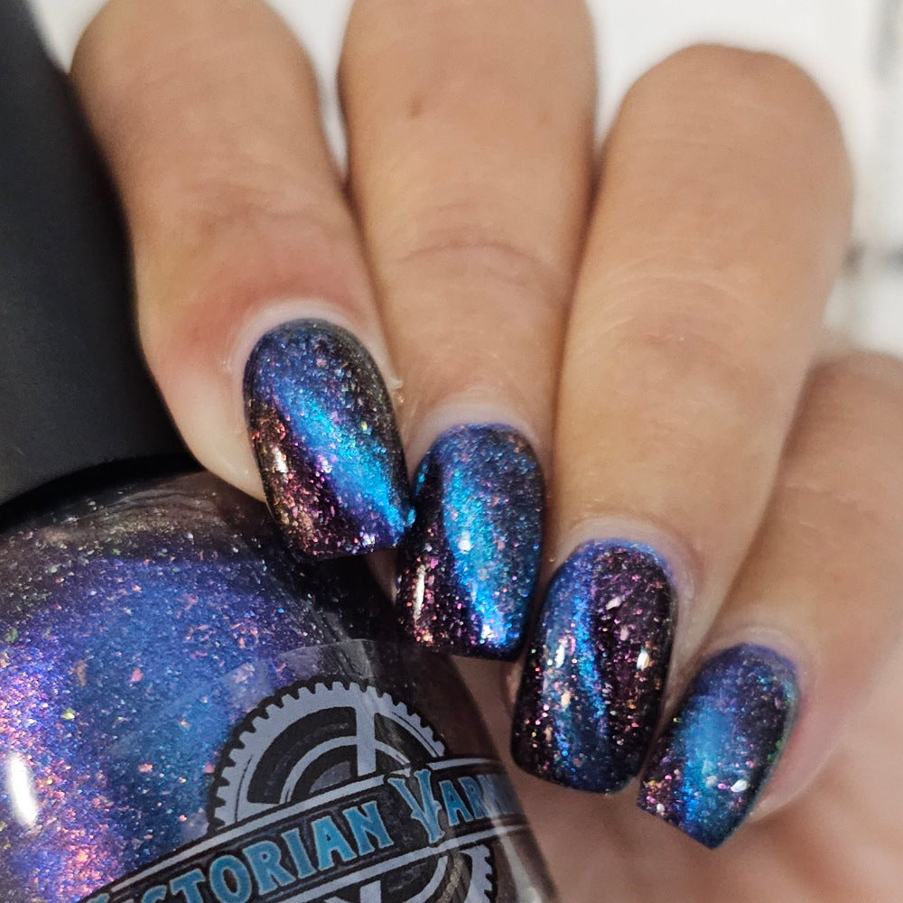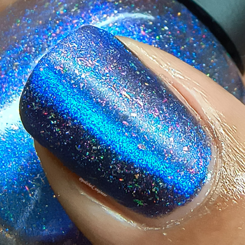 A deep blue to purple multi dimensional magnetic that once magnetized reveals a glowy pink/violet/peach/bronze/gold shimmer with micro aurora holo flakies