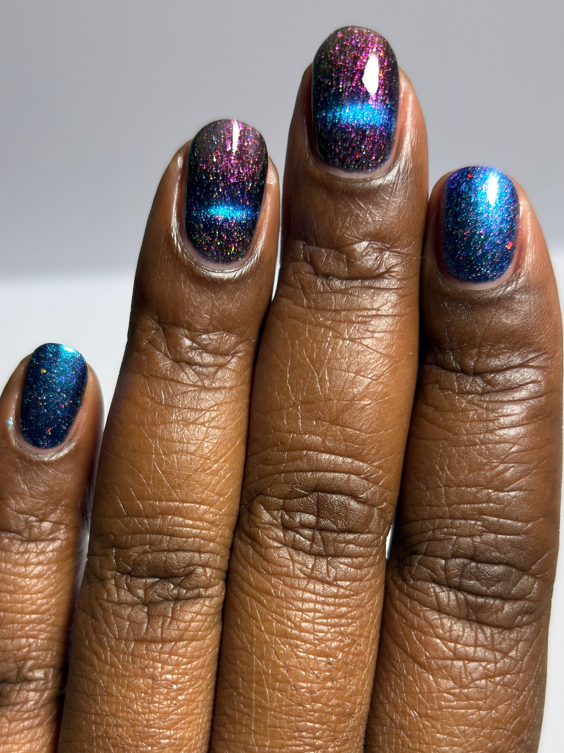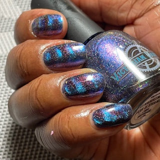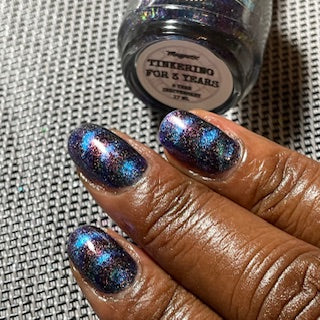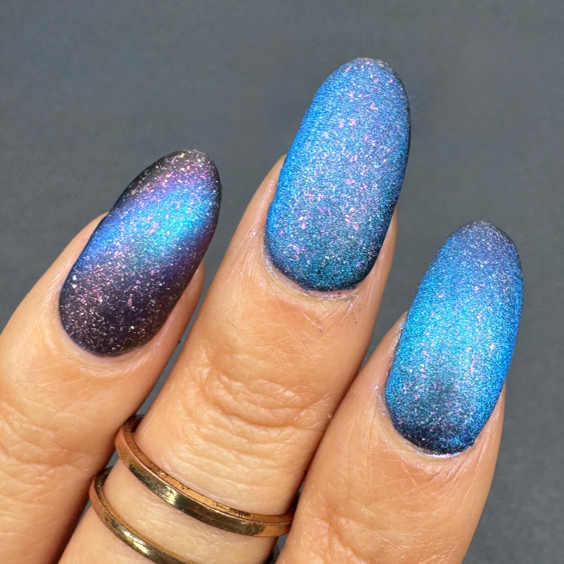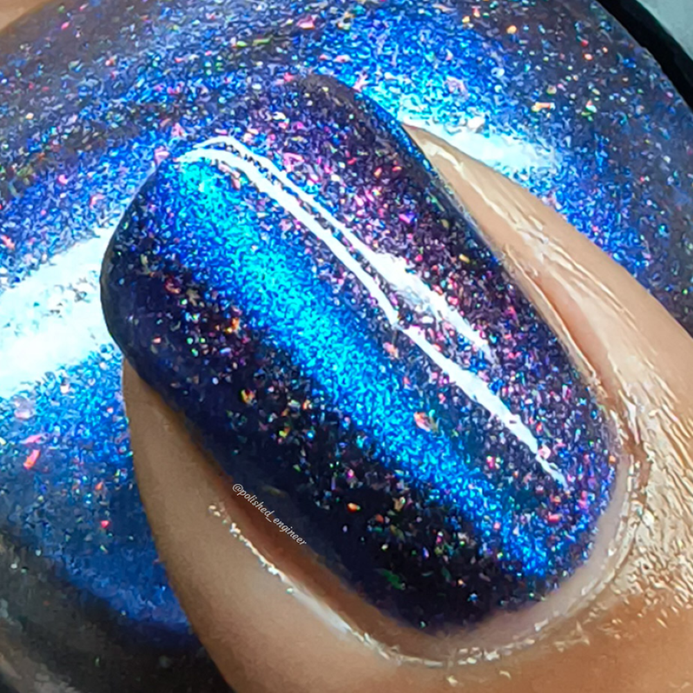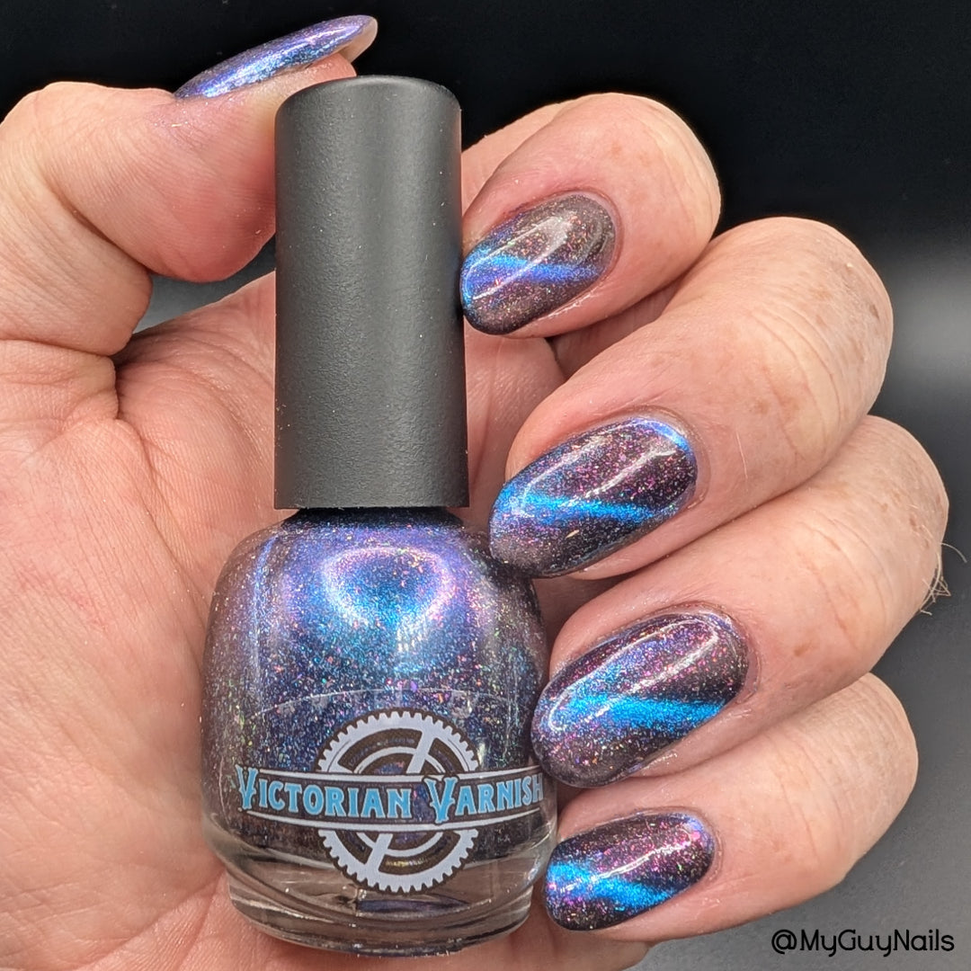 A deep blue to purple multi dimensional magnetic that once magnetized reveals a glowy pink/violet/peach/bronze/gold shimmer with micro aurora holo flakies