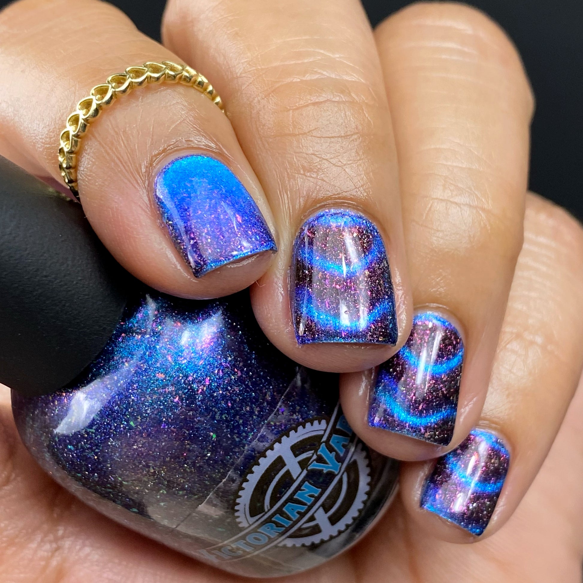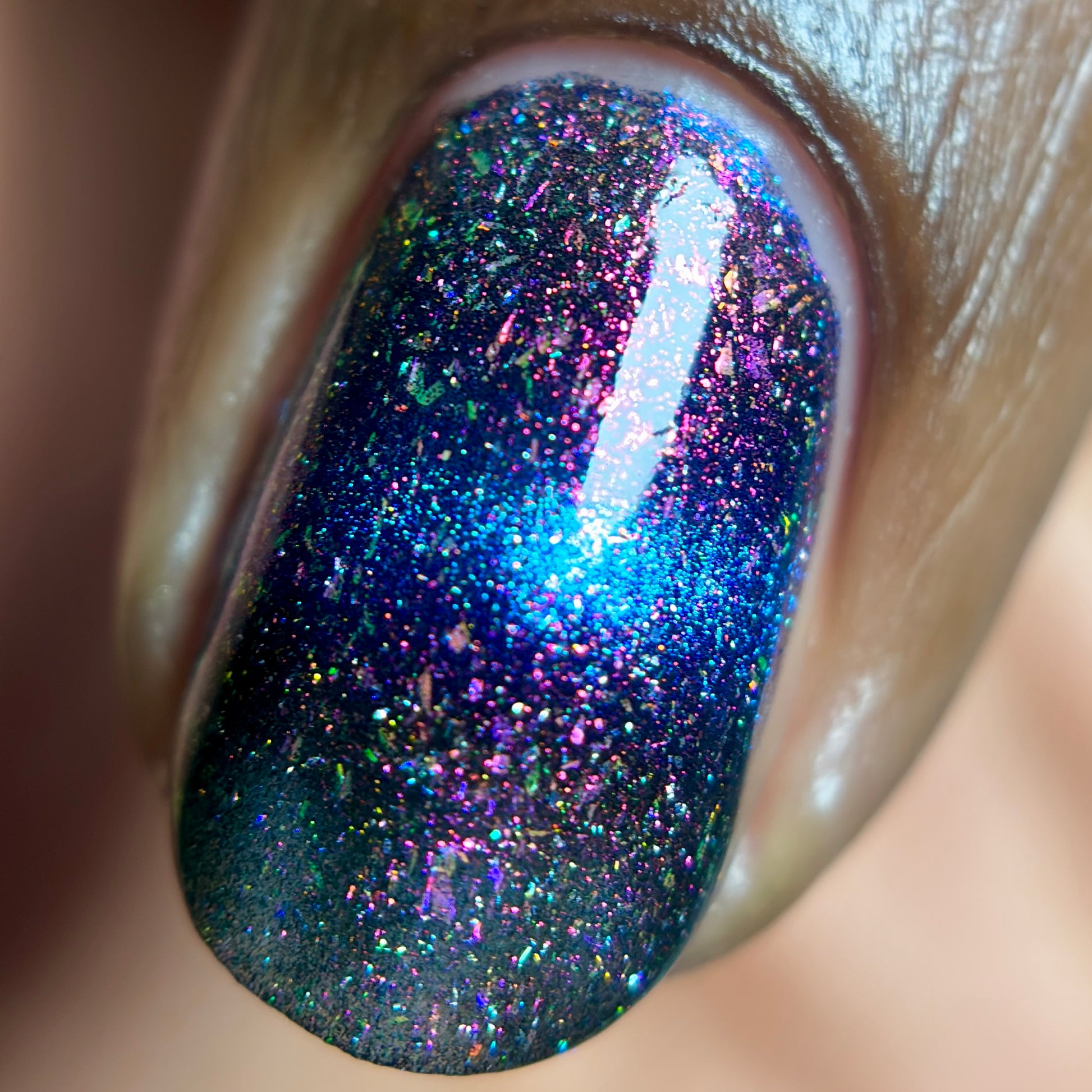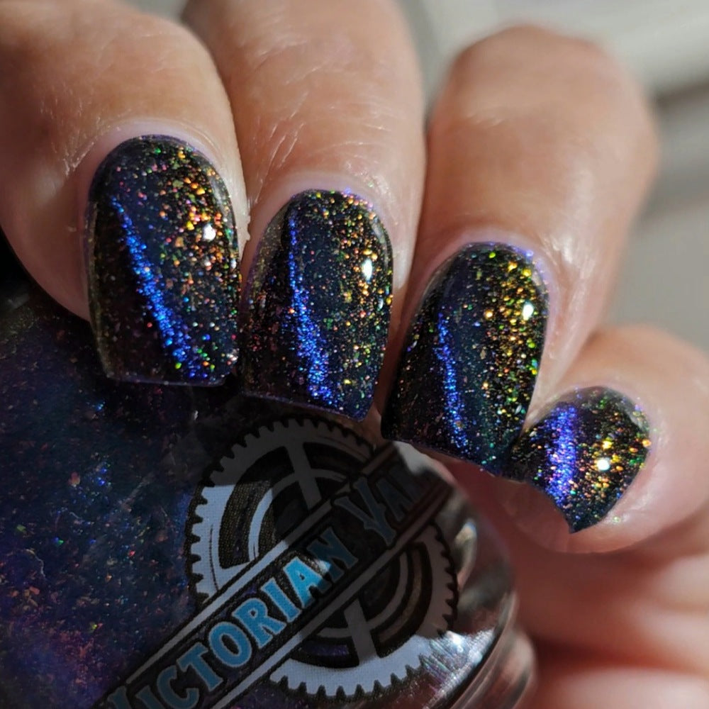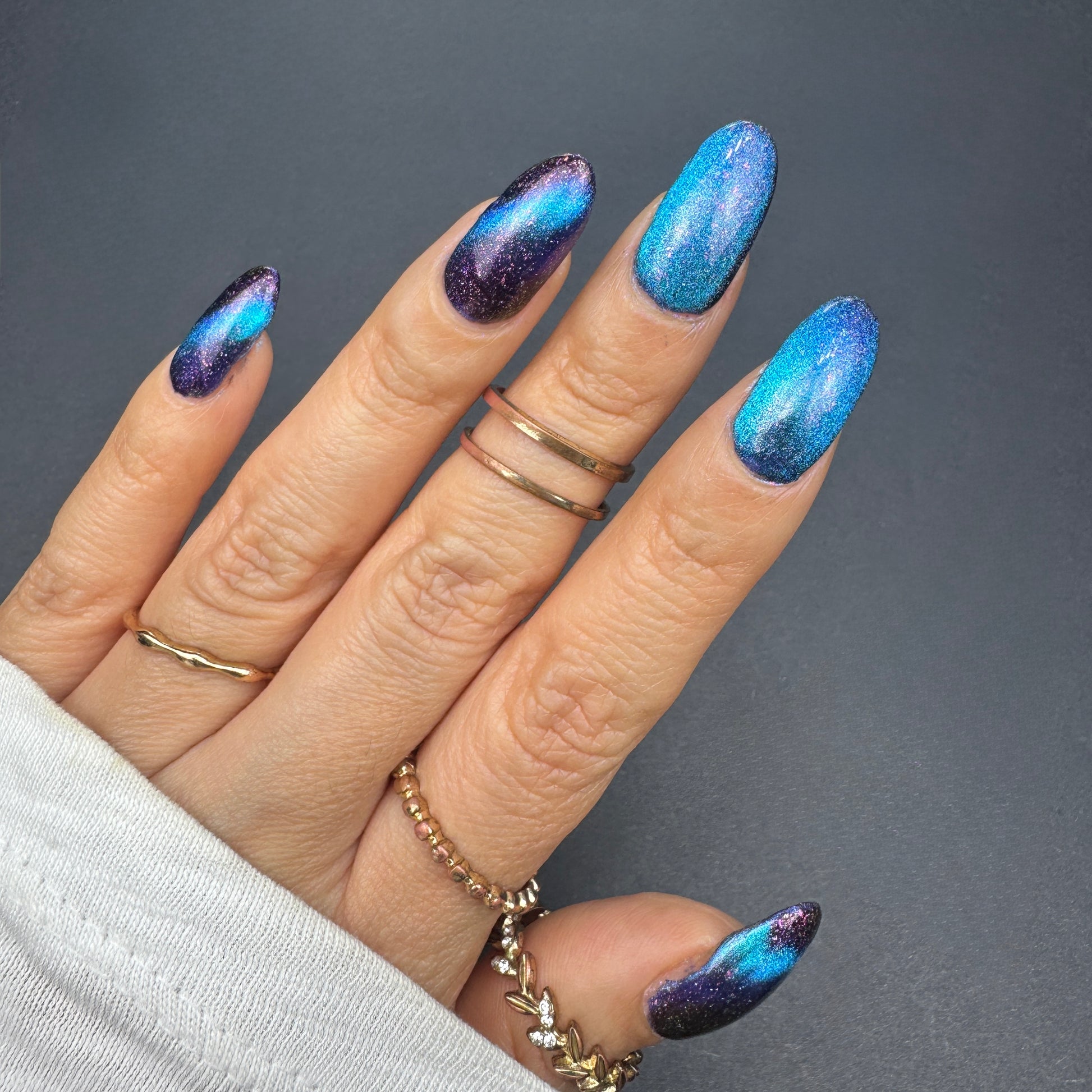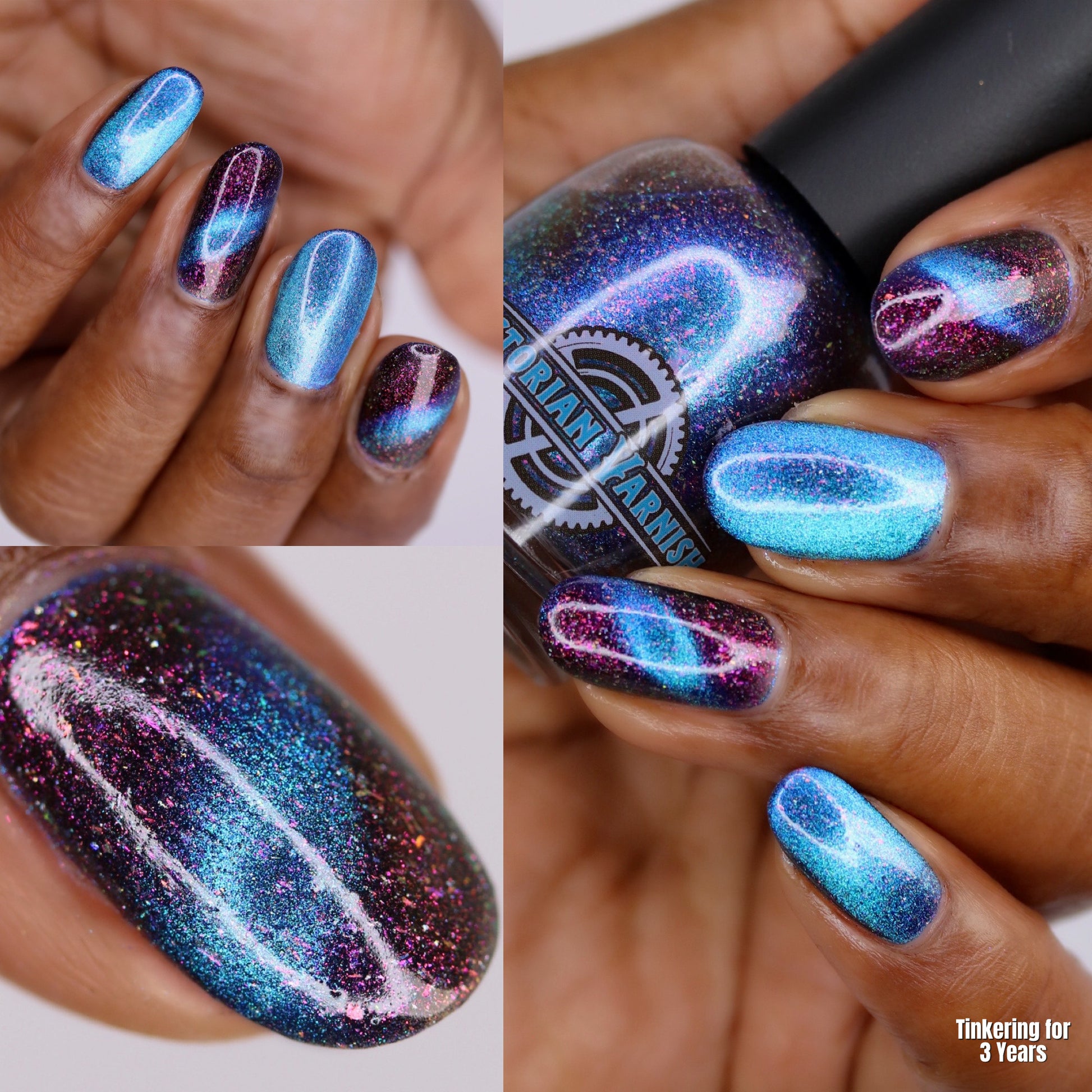 A deep blue to purple multi dimensional magnetic that once magnetized reveals a glowy pink/violet/peach/bronze/gold shimmer with micro aurora holo flakies