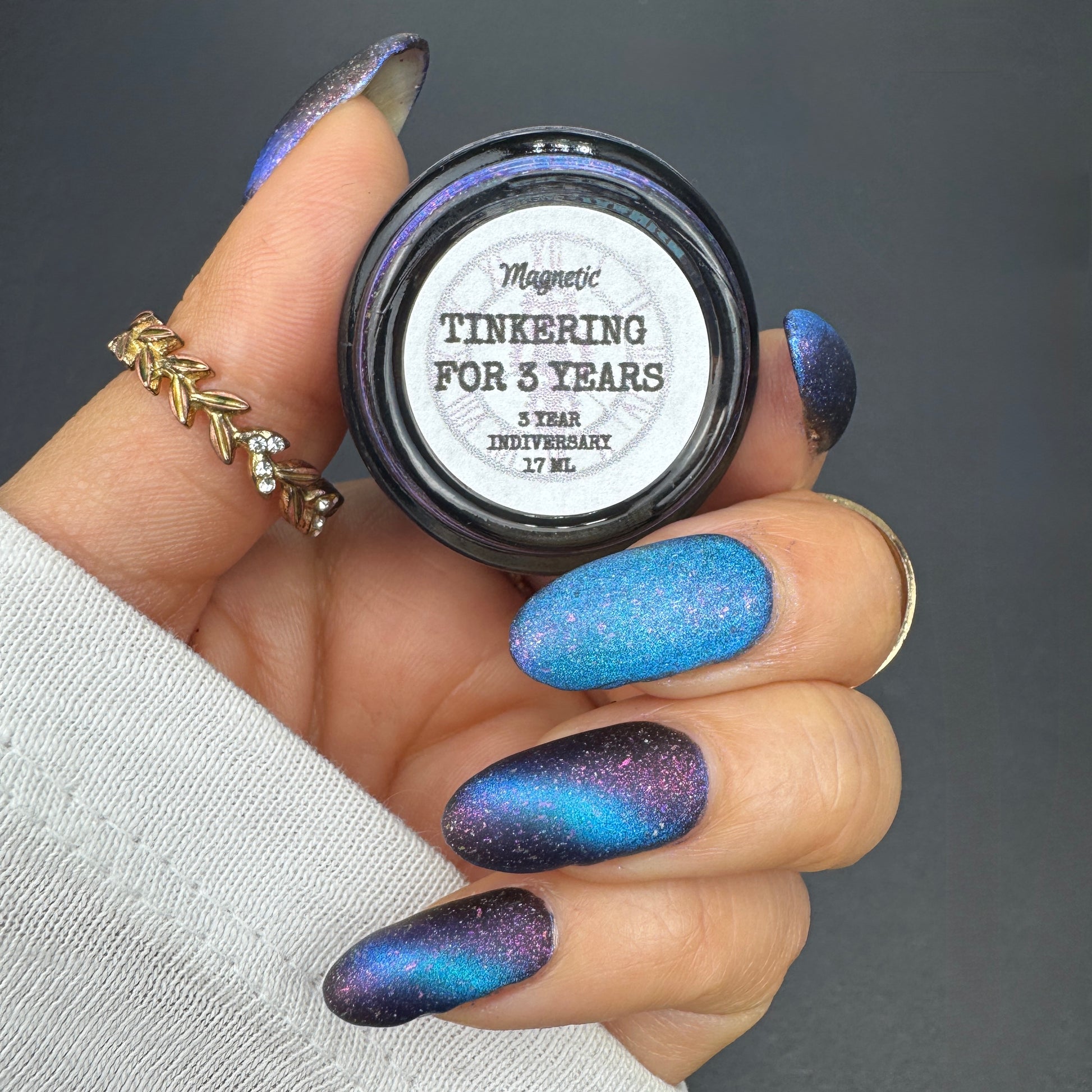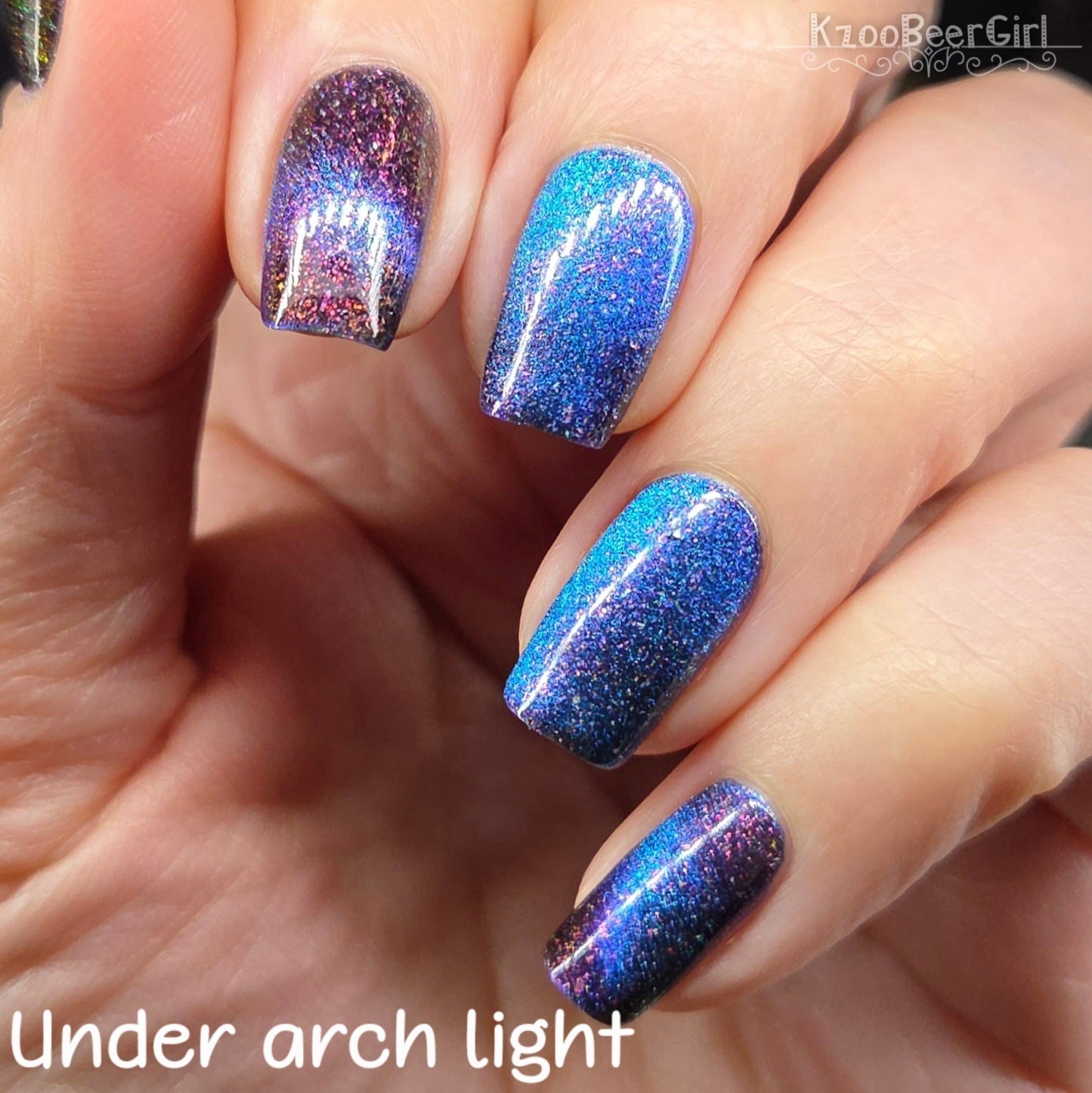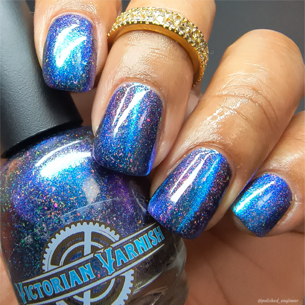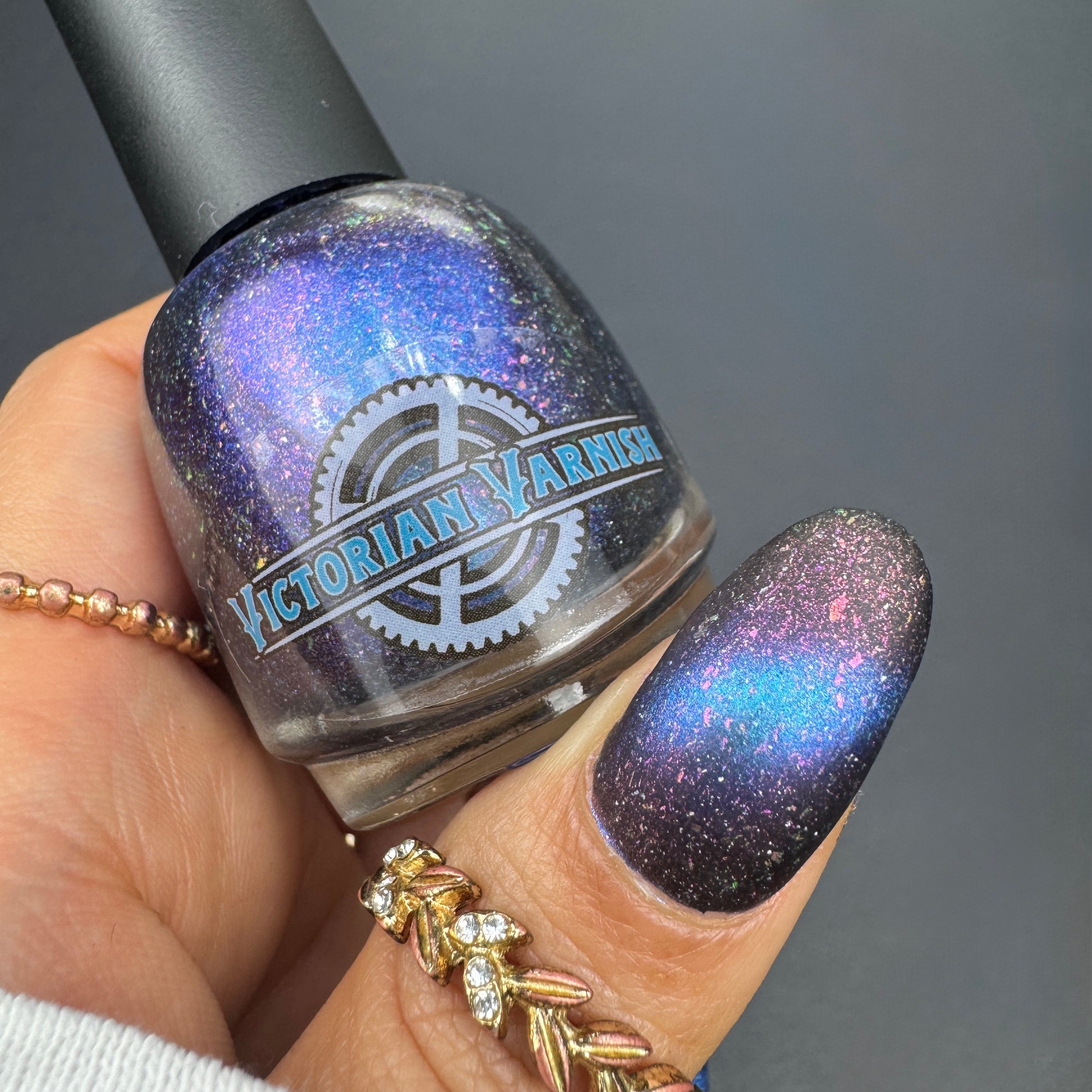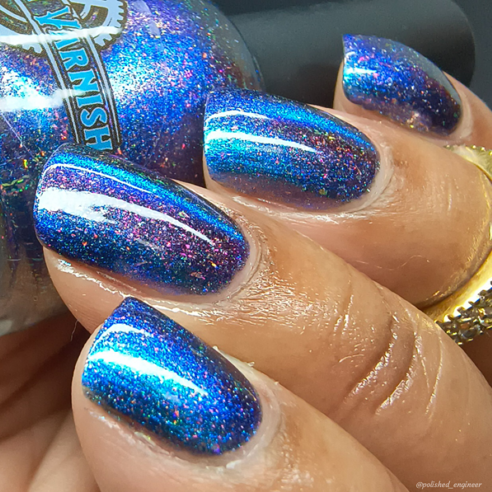 A deep blue to purple multi dimensional magnetic that once magnetized reveals a glowy pink/violet/peach/bronze/gold shimmer with micro aurora holo flakies