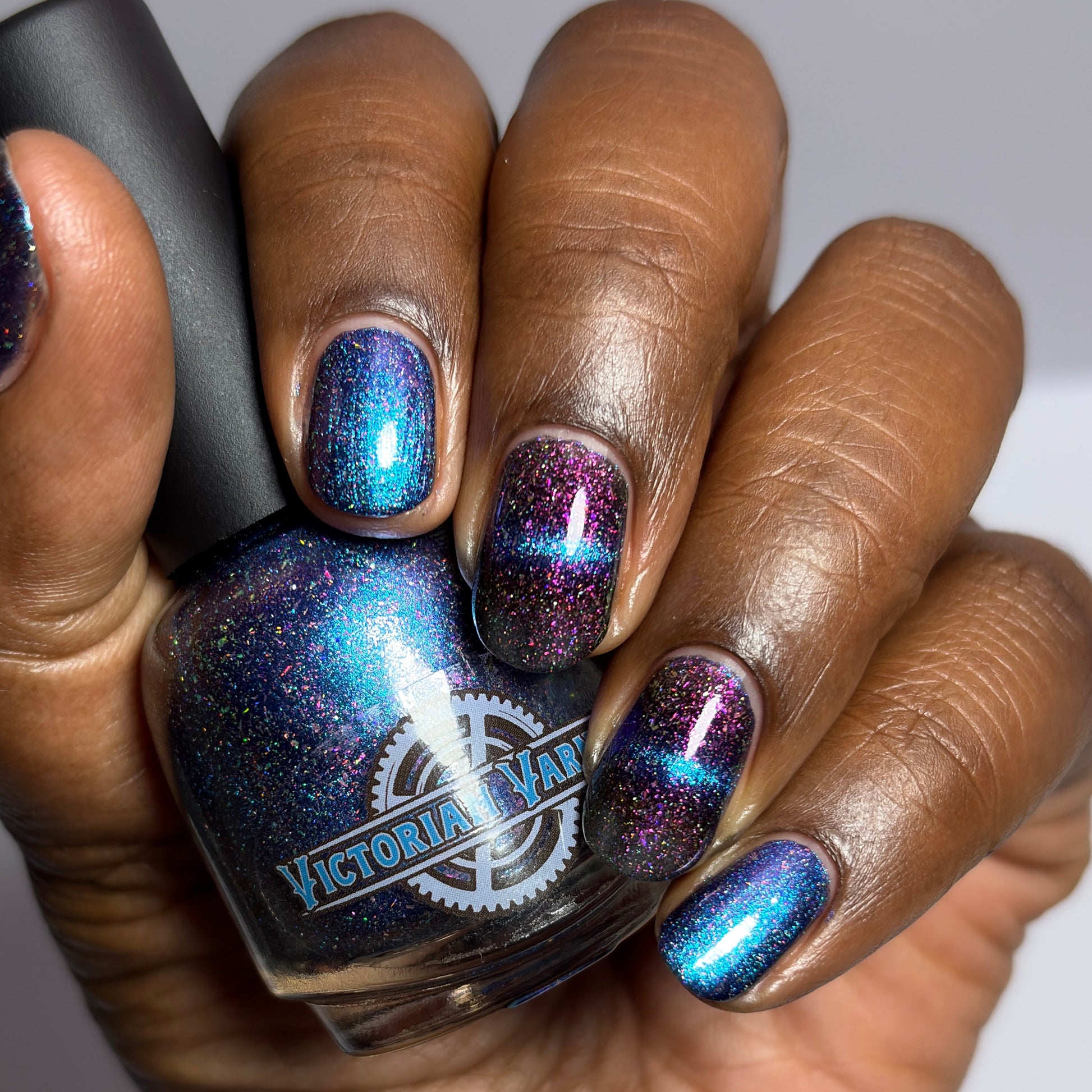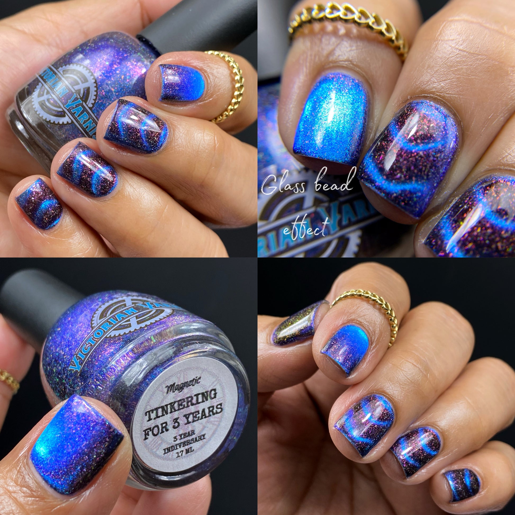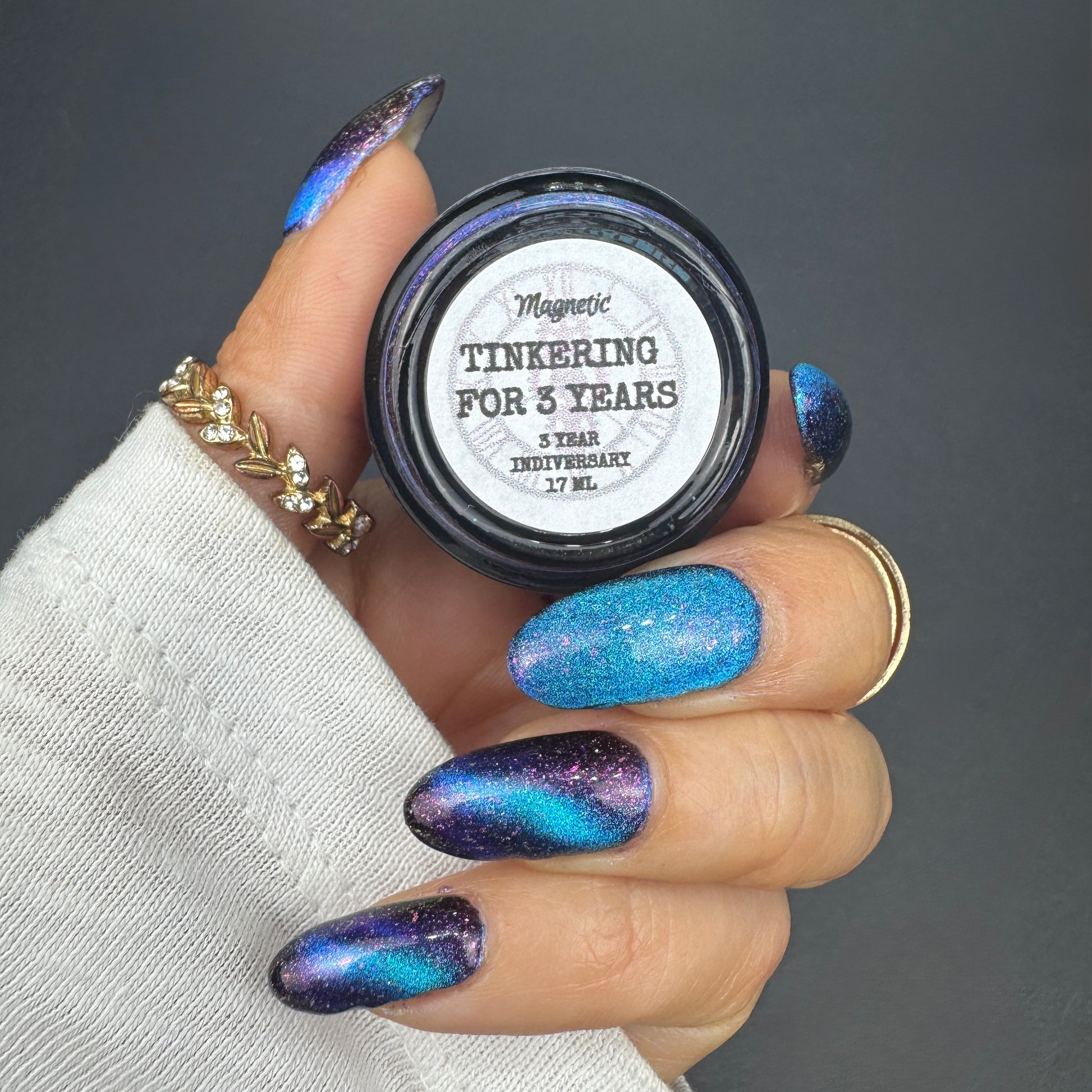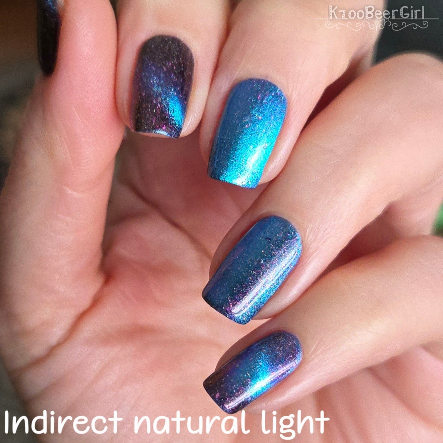 A deep blue to purple multi dimensional magnetic that once magnetized reveals a glowy pink/violet/peach/bronze/gold shimmer with micro aurora holo flakies