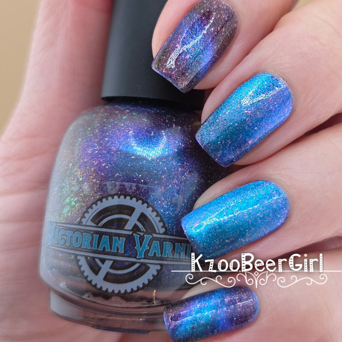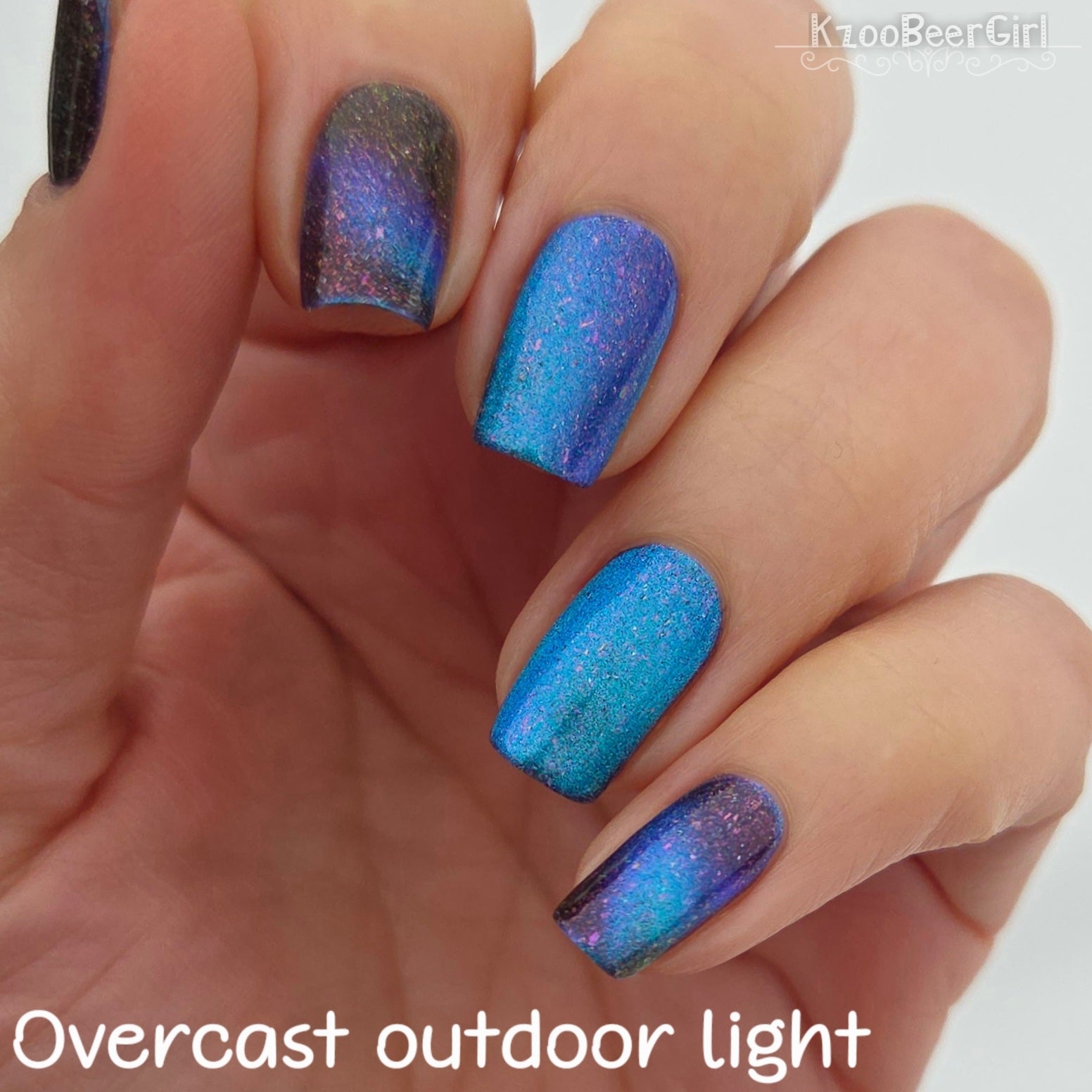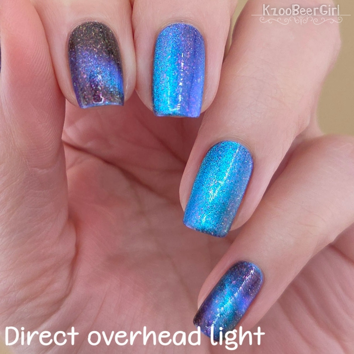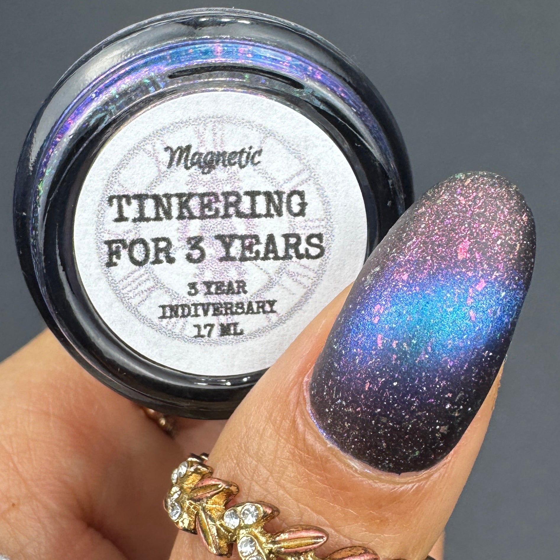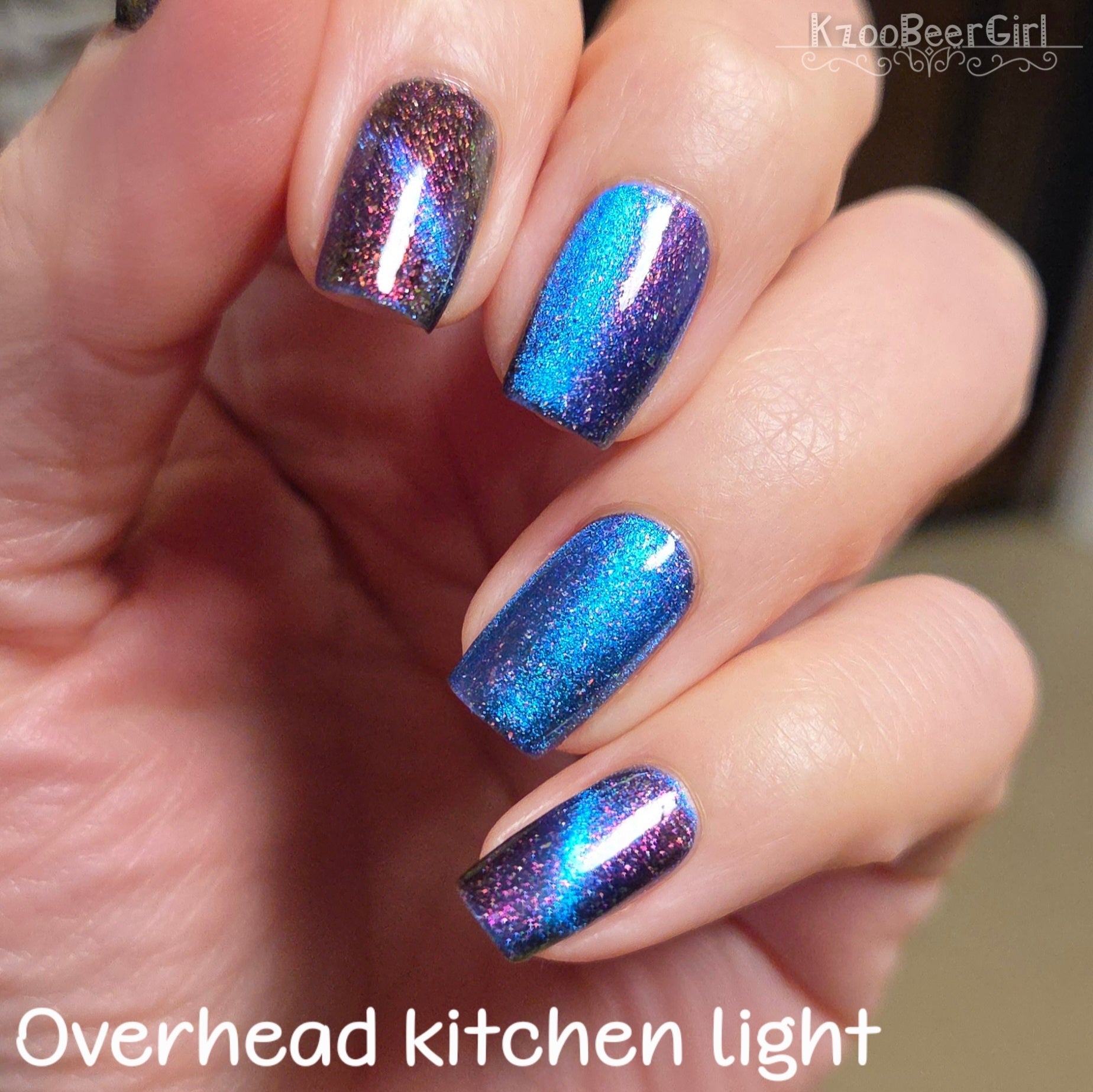 A deep blue to purple multi dimensional magnetic that once magnetized reveals a glowy pink/violet/peach/bronze/gold shimmer with micro aurora holo flakies