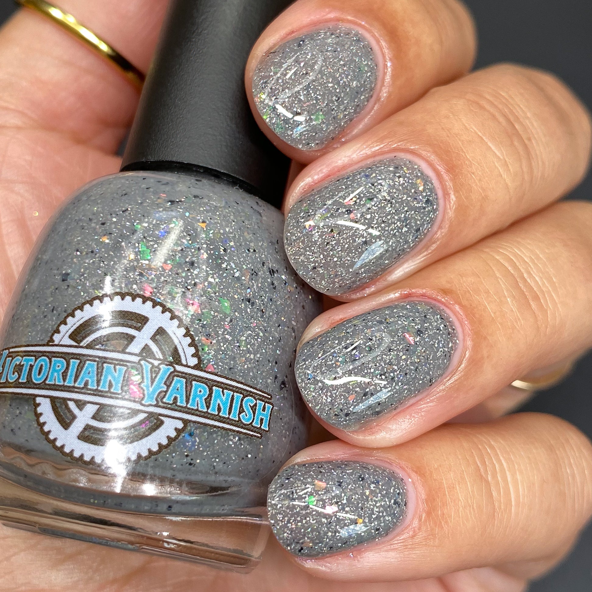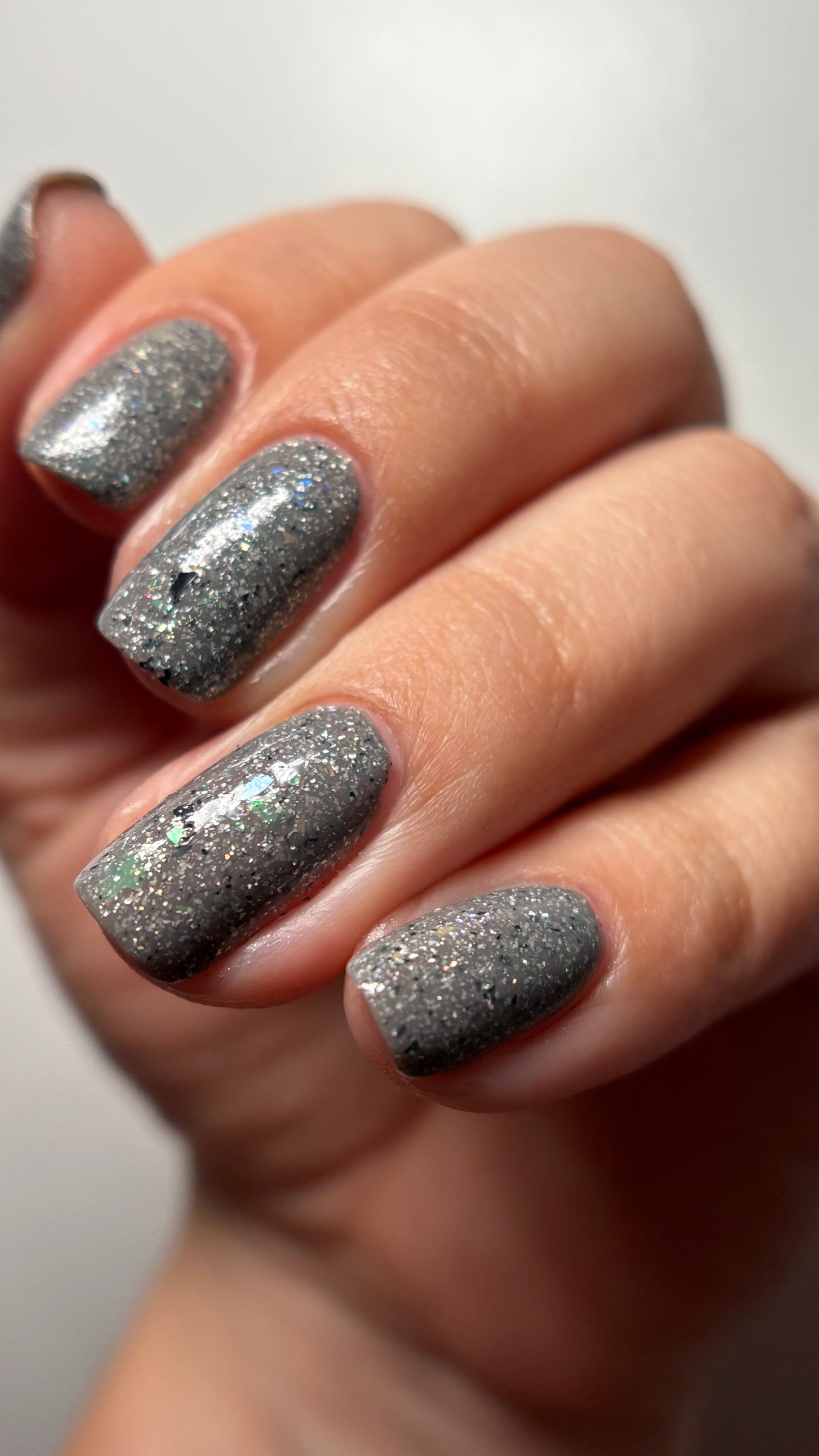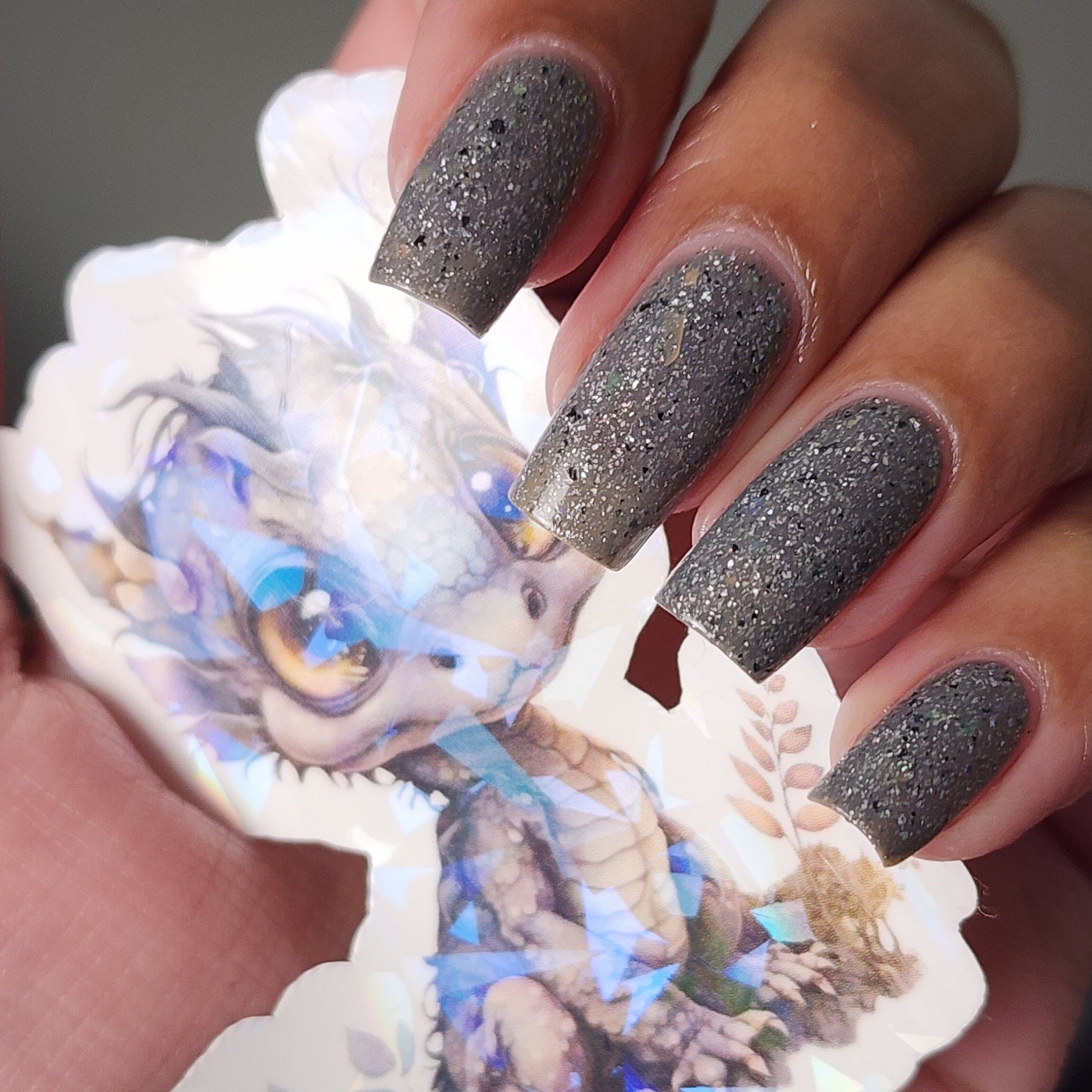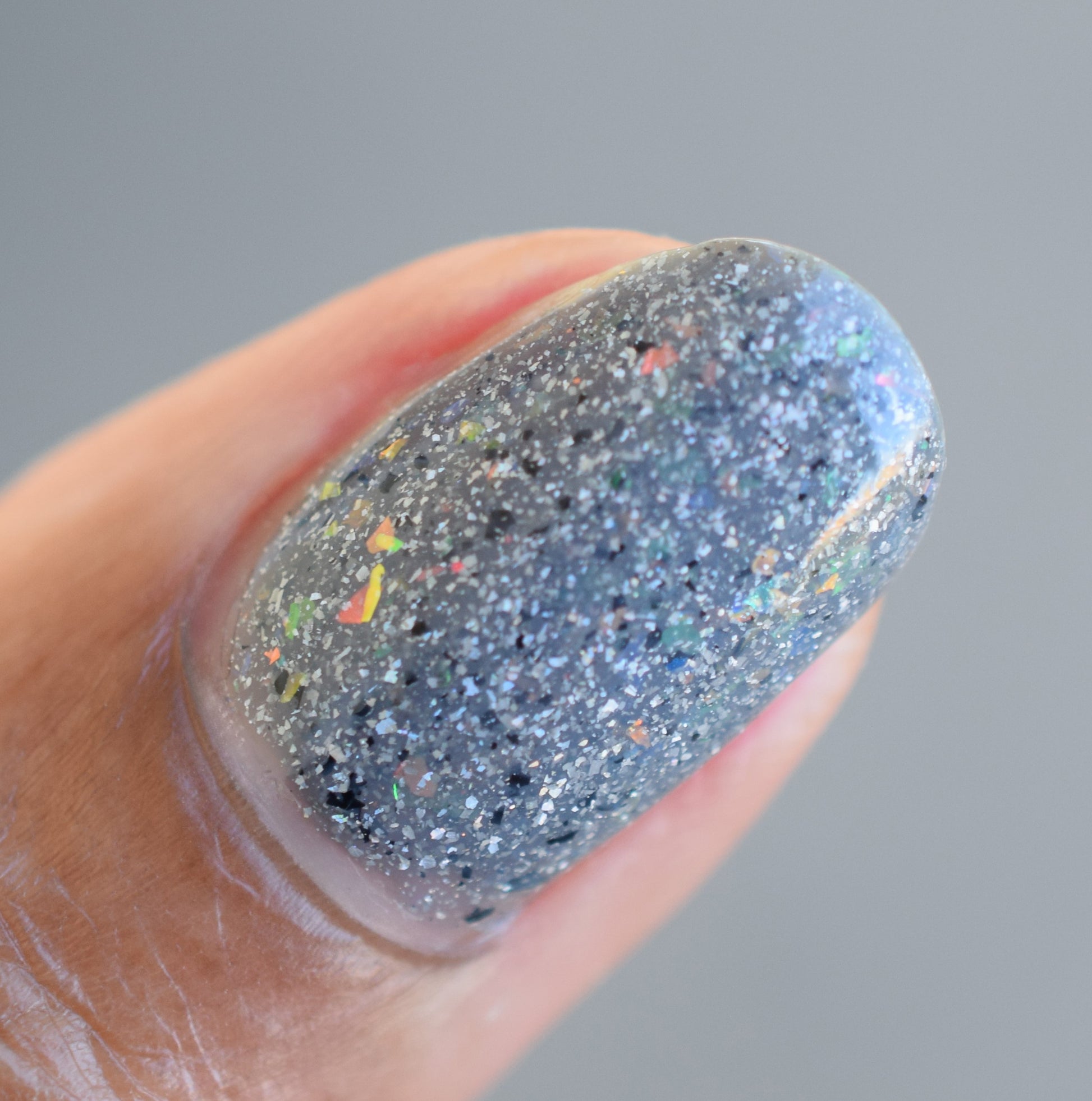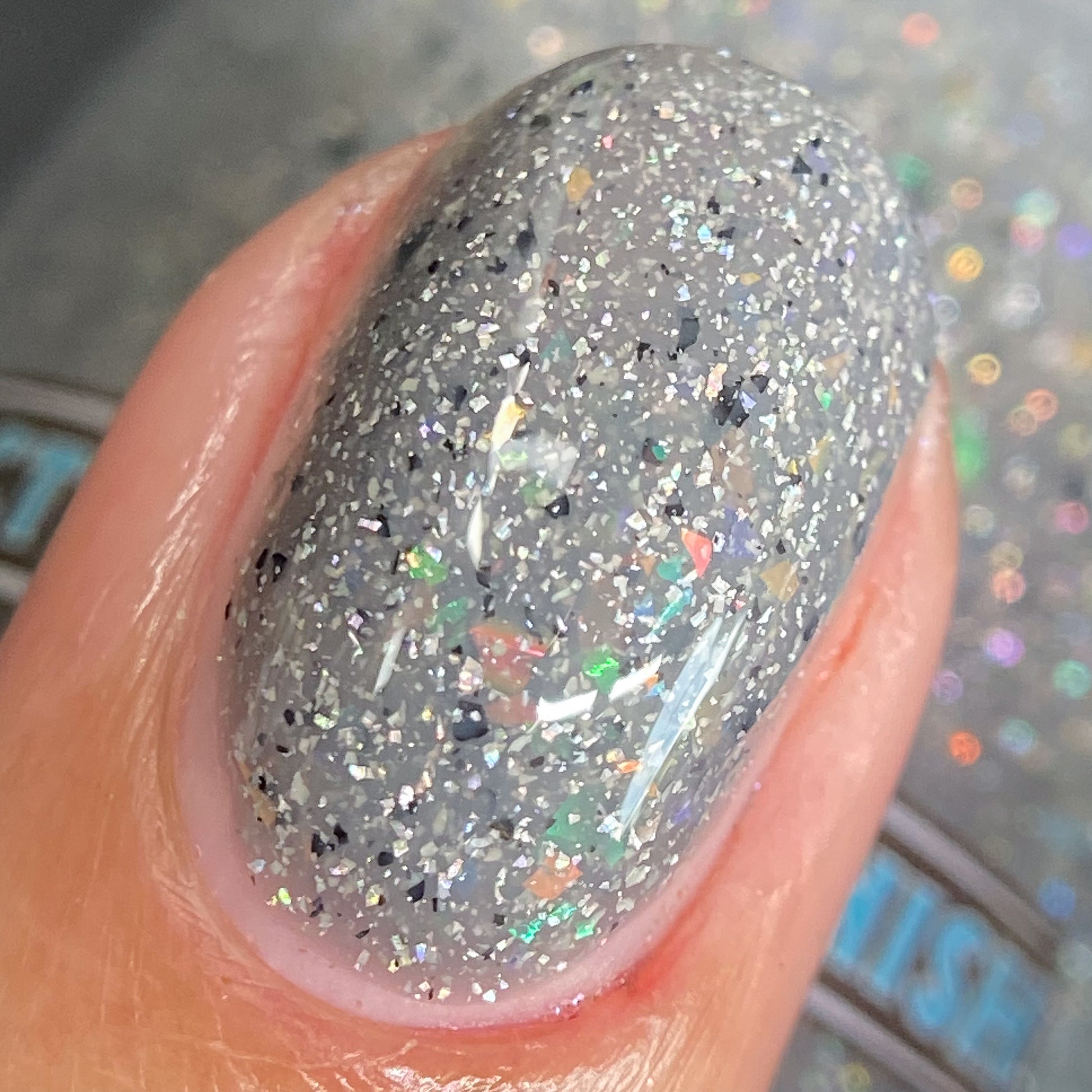 A lovely light dove grey base with ghost flakies, chameleon flakes, black flakes and holo flakies. Comes with a collectible sticker/these are limited, once they are gone, they're gone!