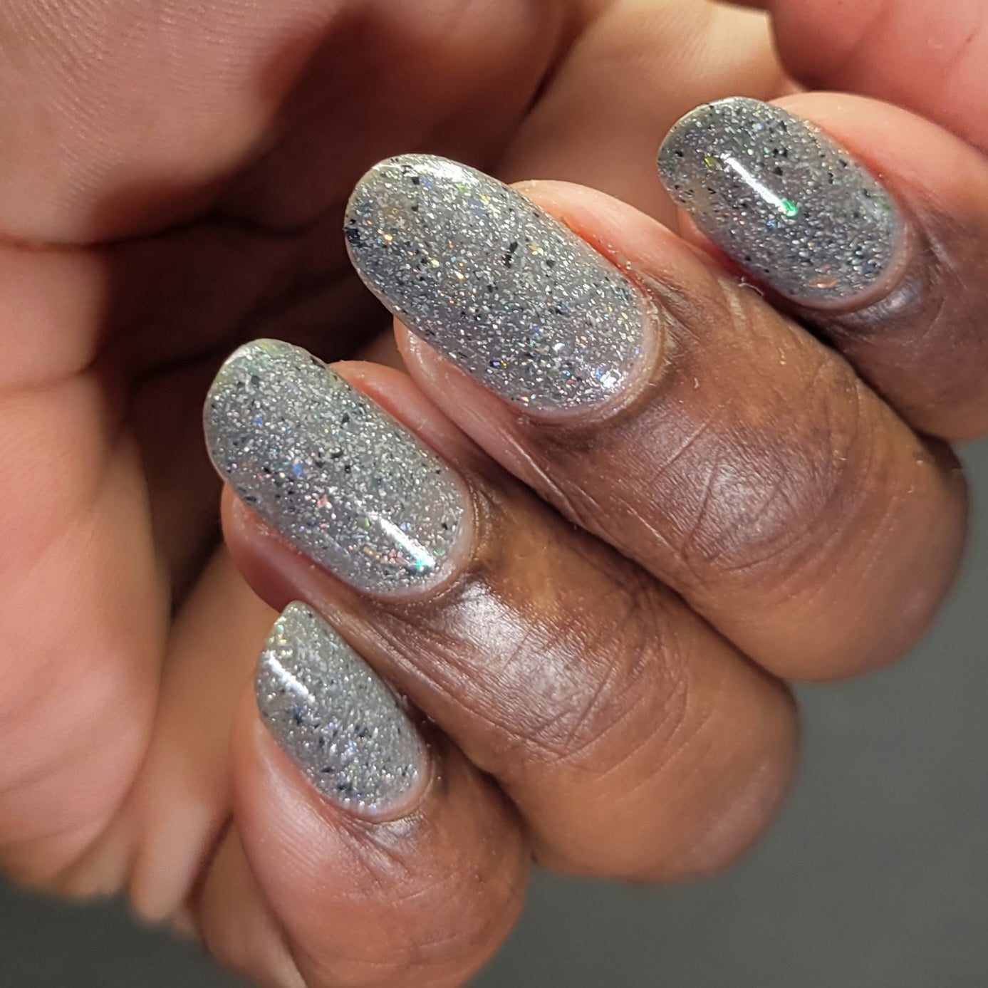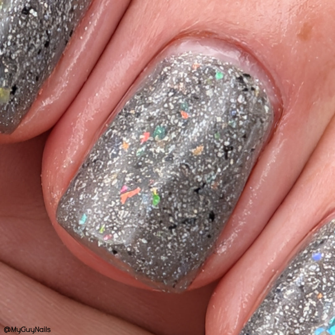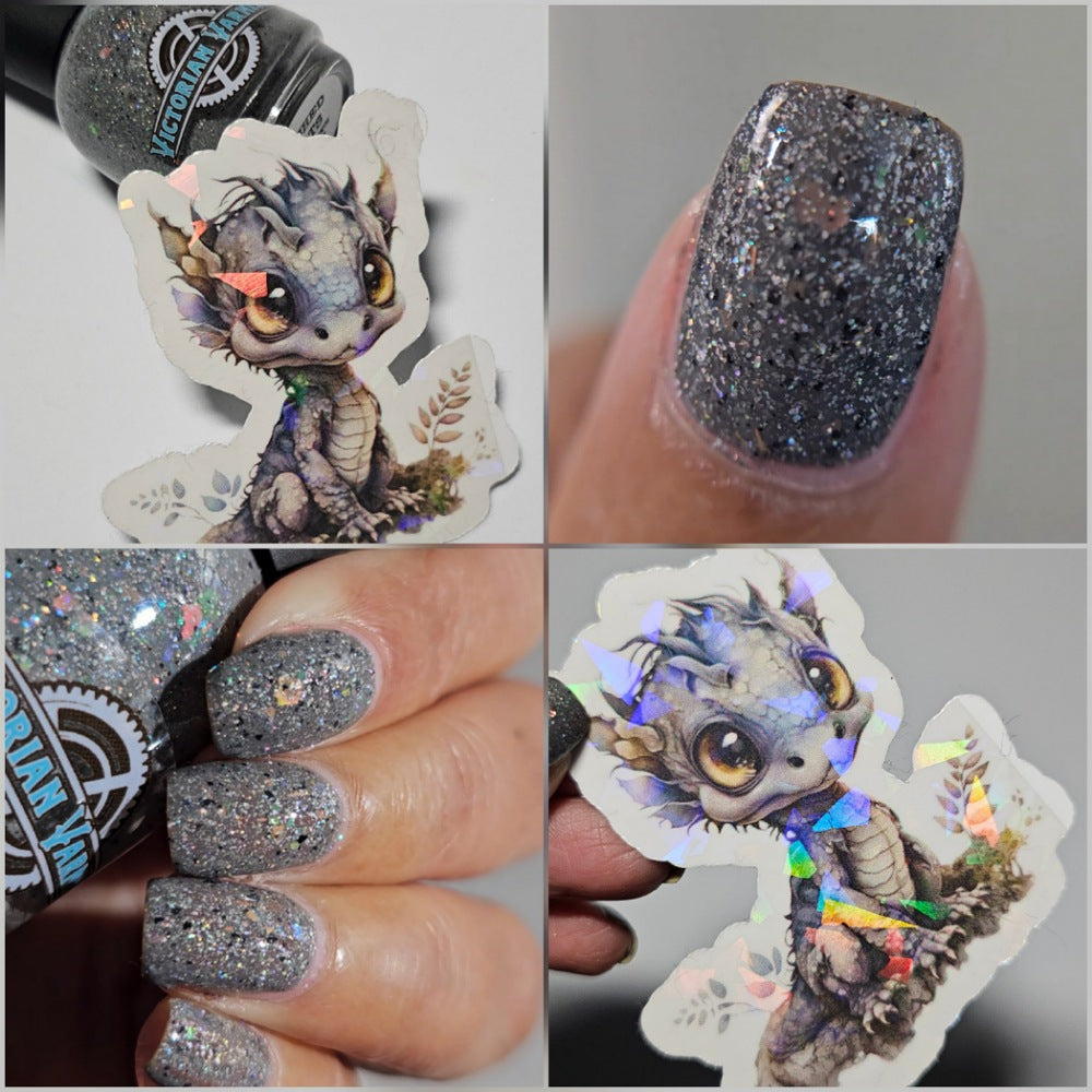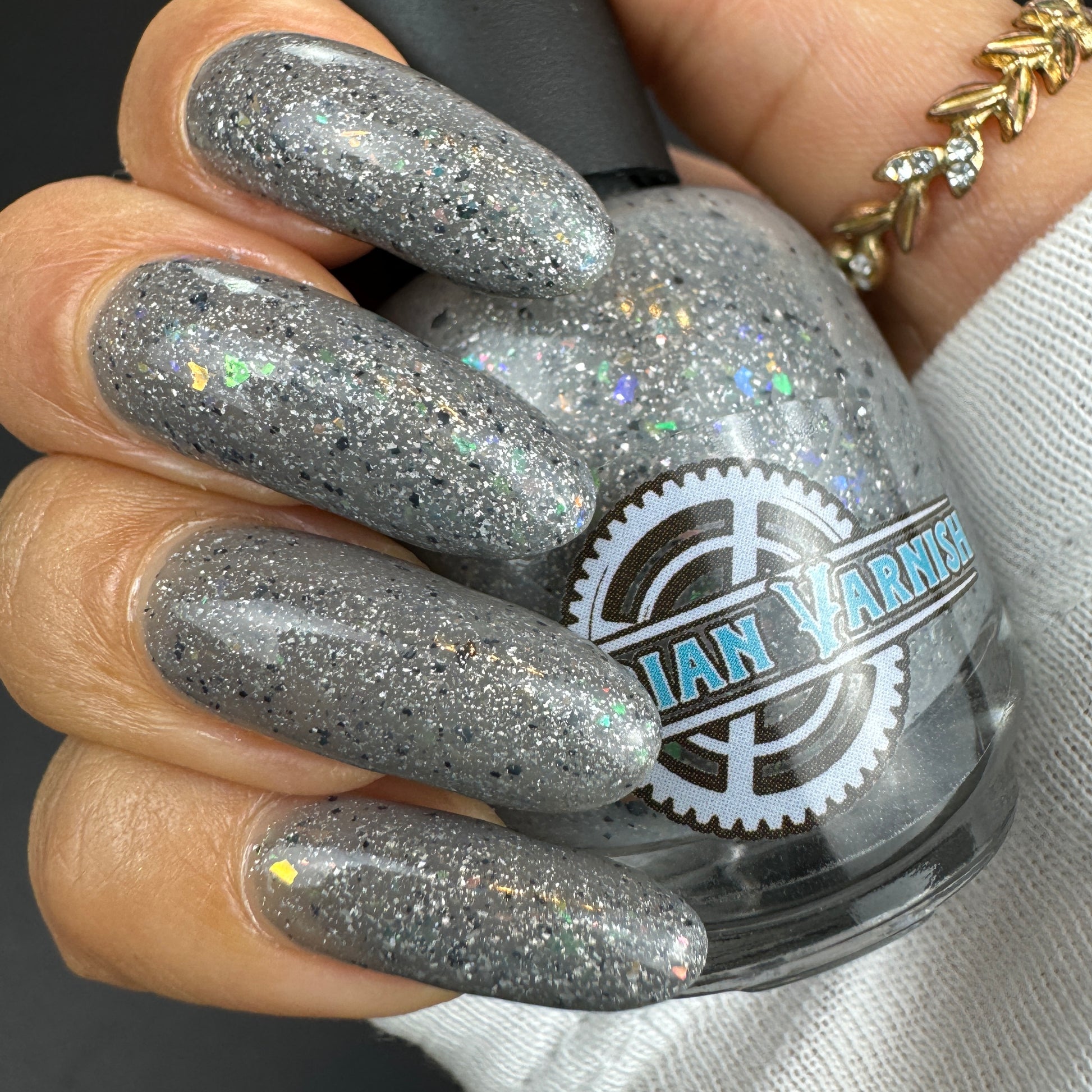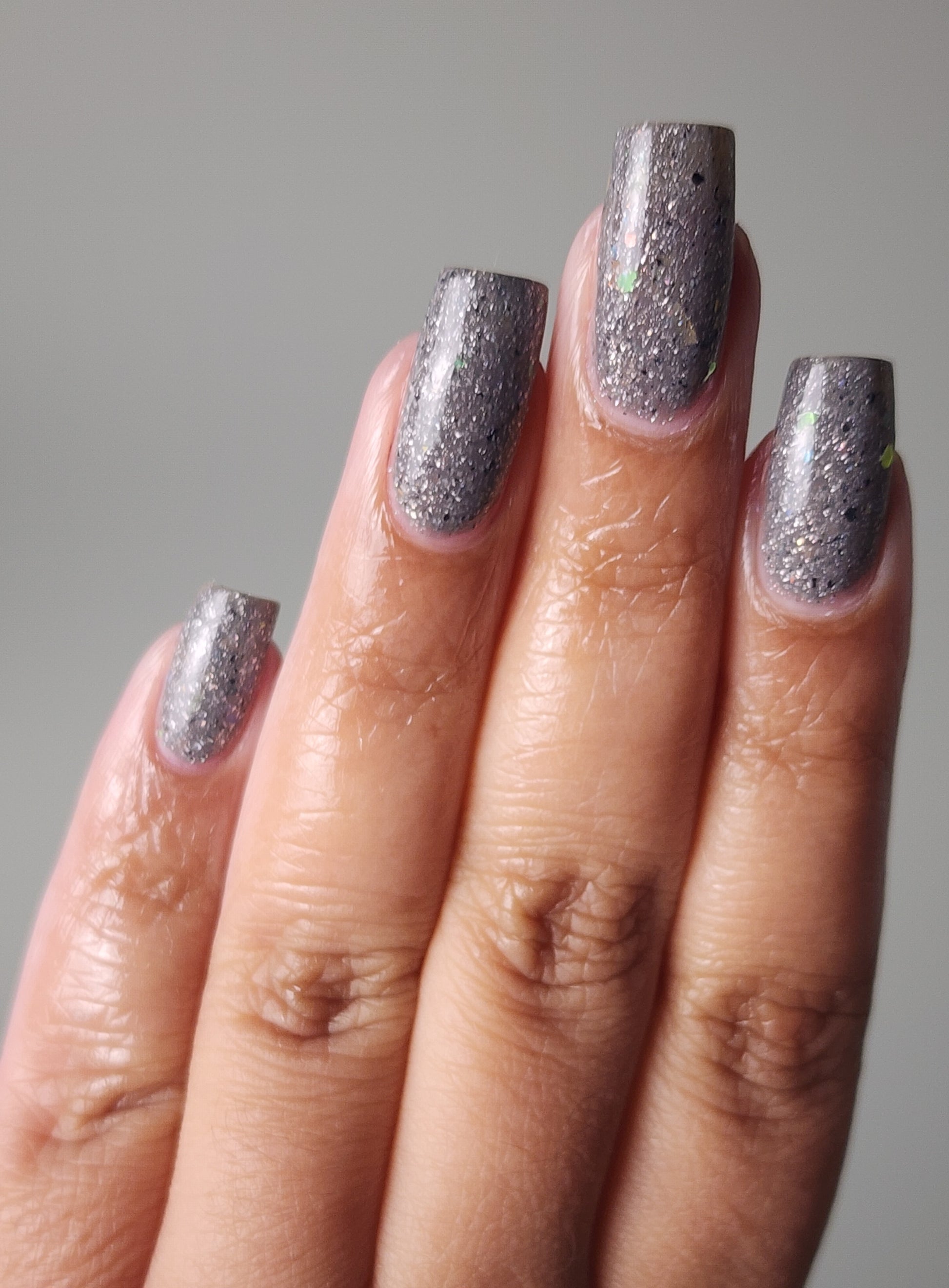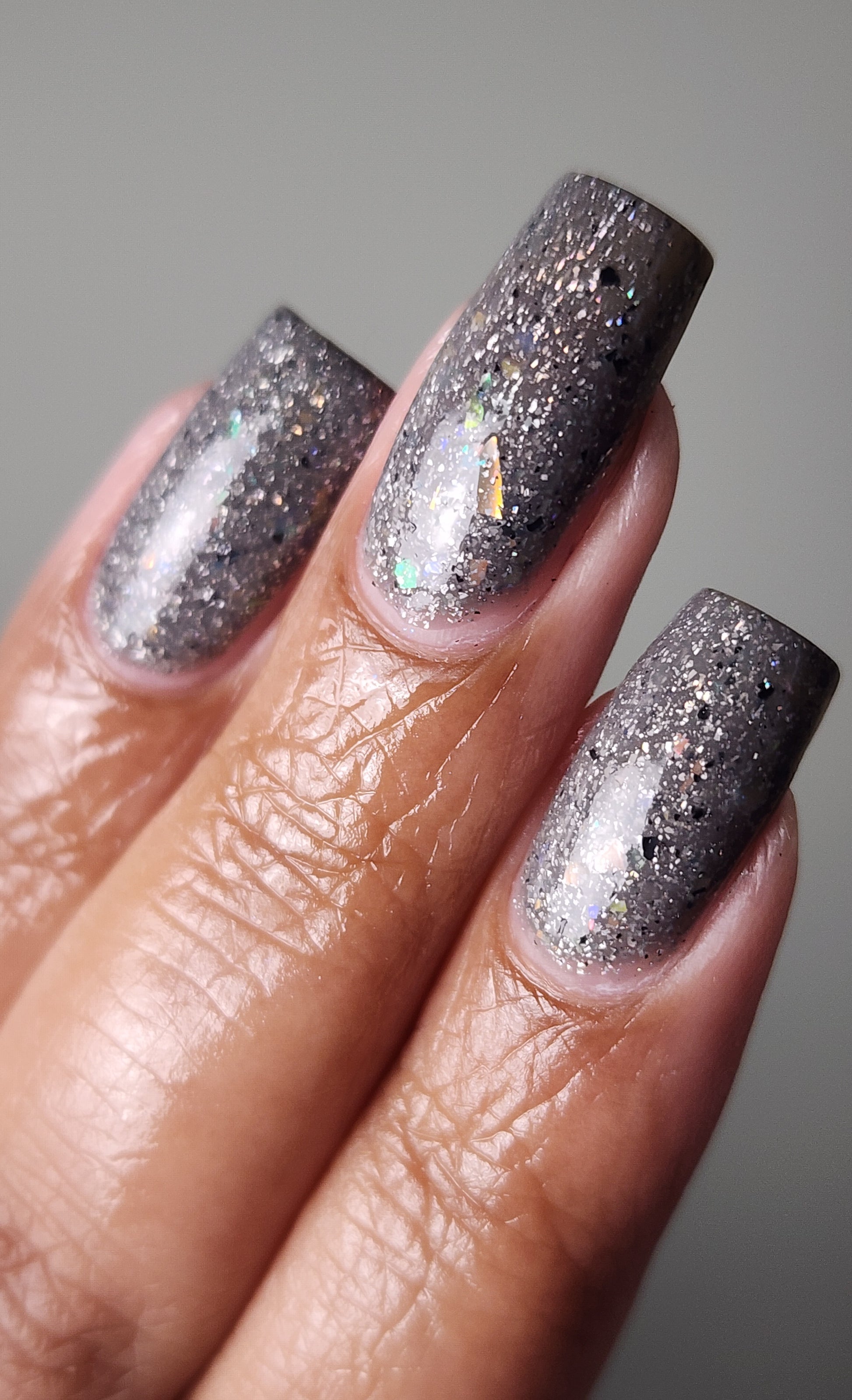 A lovely light dove grey base with ghost flakies, chameleon flakes, black flakes and holo flakies. Comes with a collectible sticker/these are limited, once they are gone, they're gone!