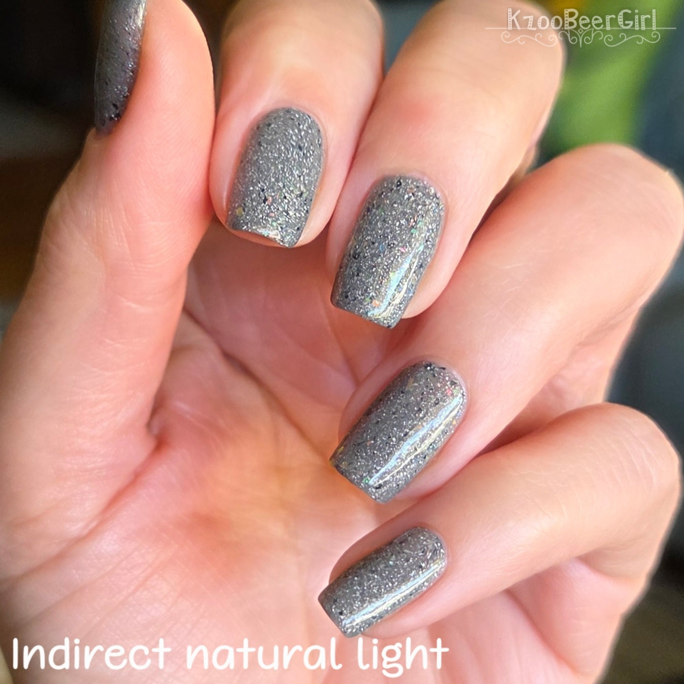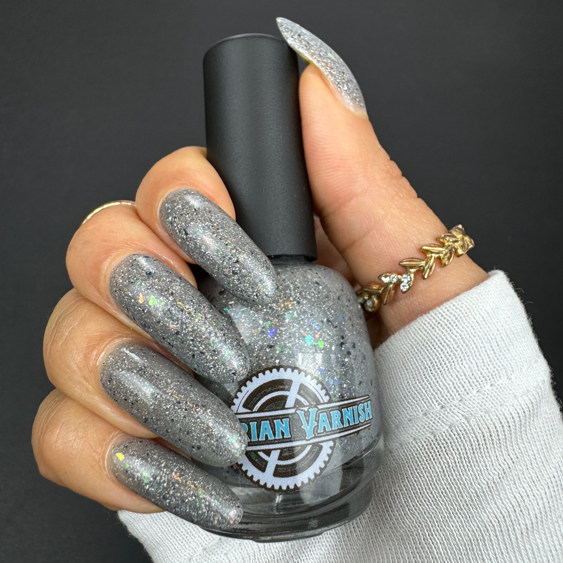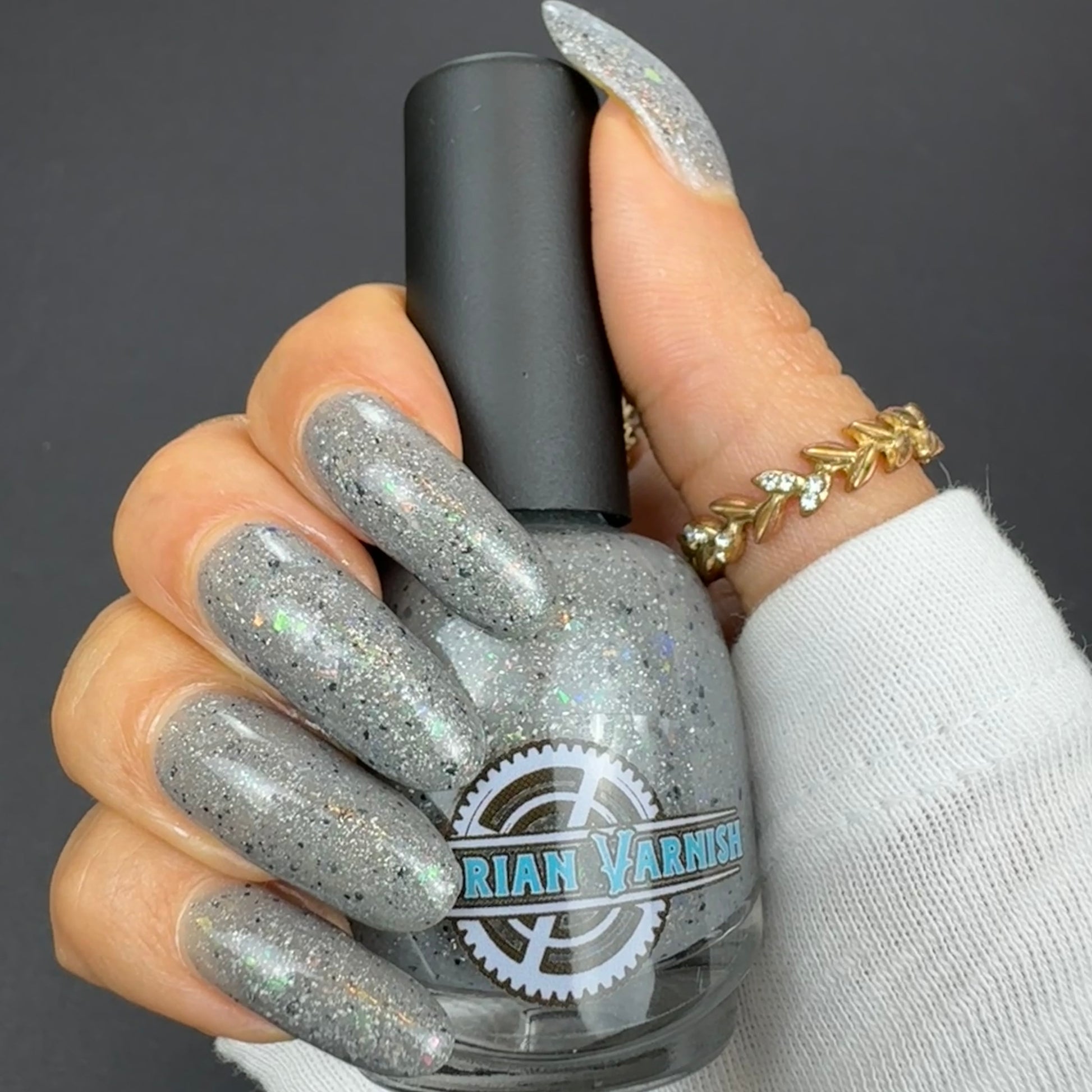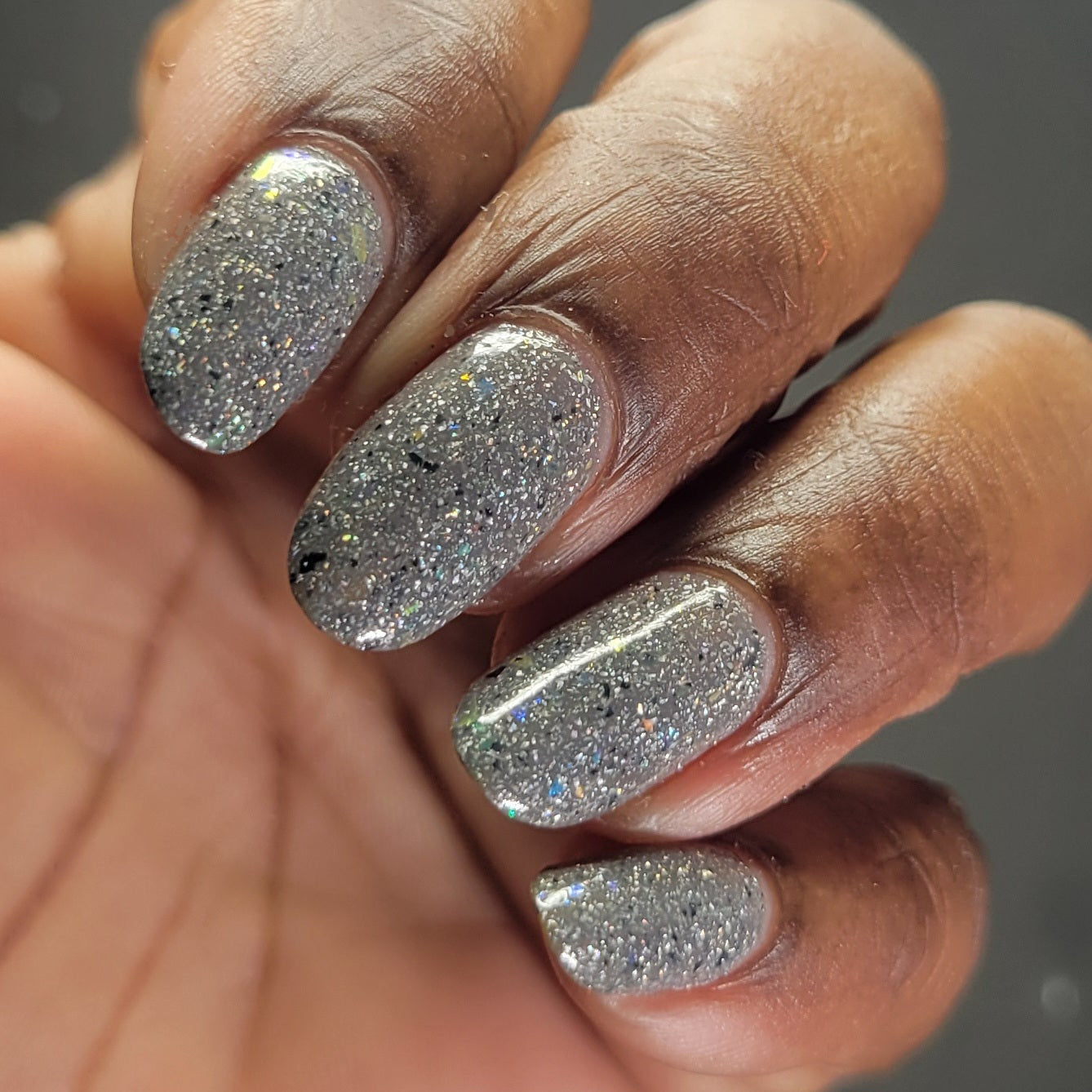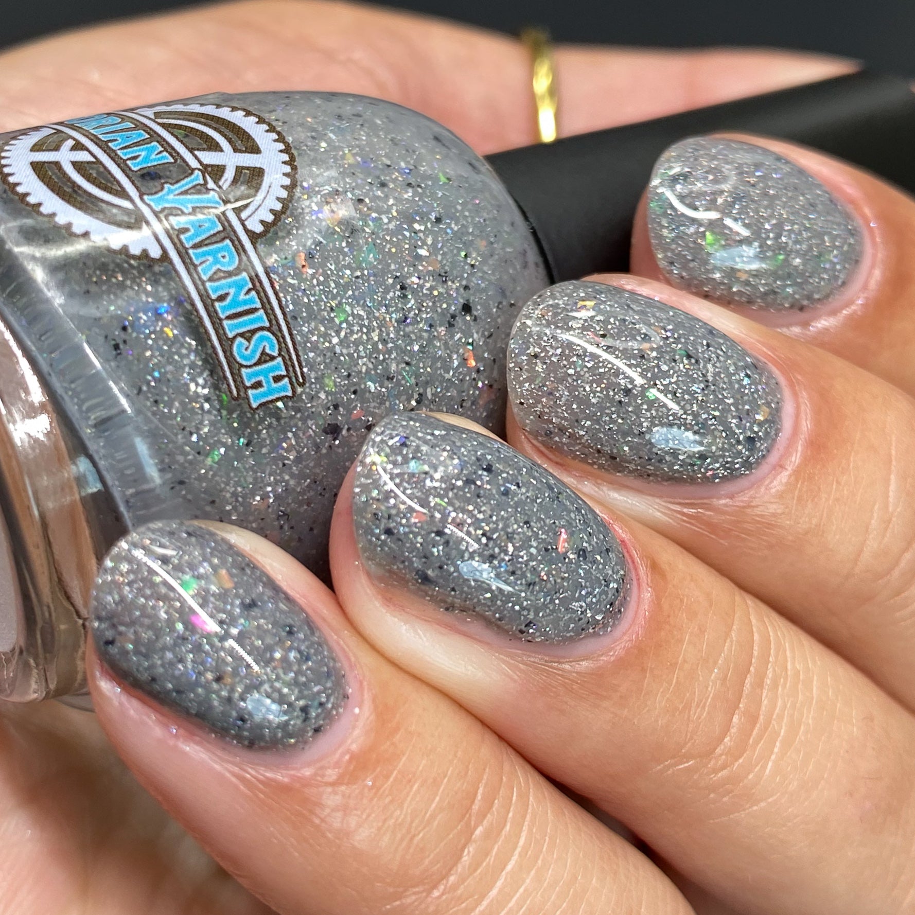 A lovely light dove grey base with ghost flakies, chameleon flakes, black flakes and holo flakies. Comes with a collectible sticker/these are limited, once they are gone, they're gone!