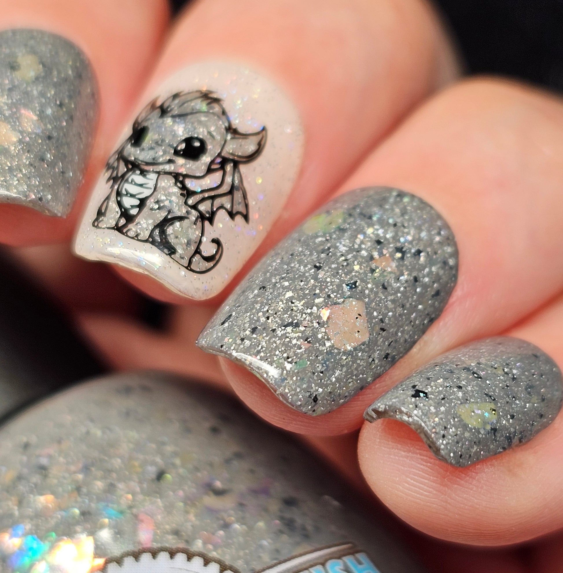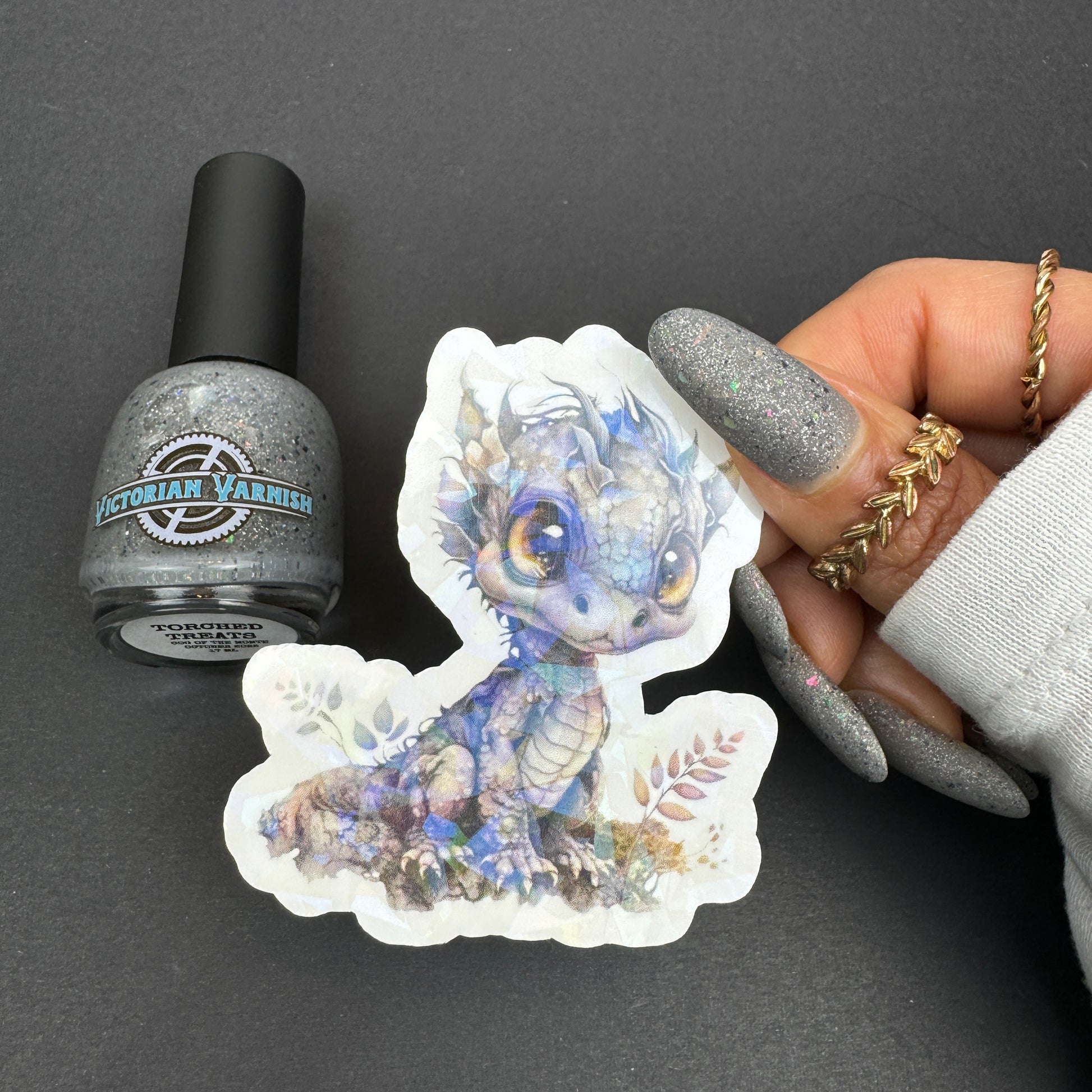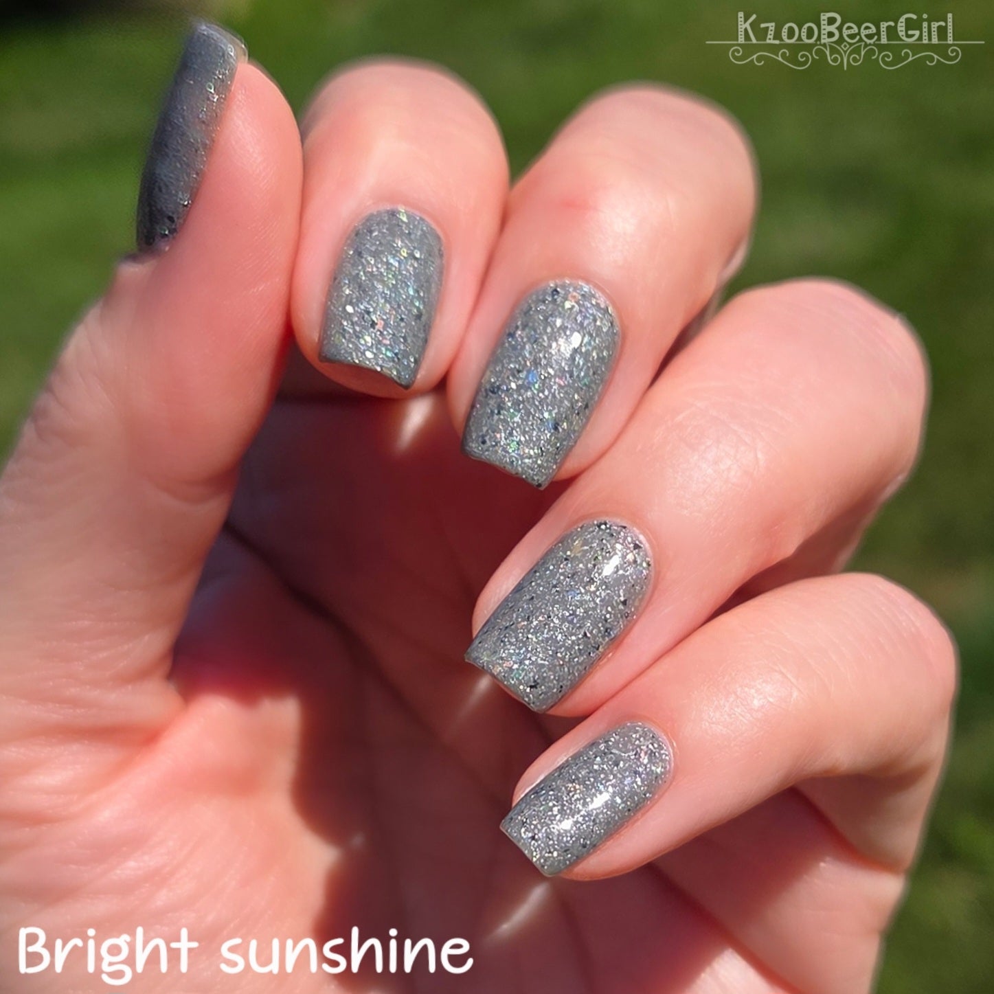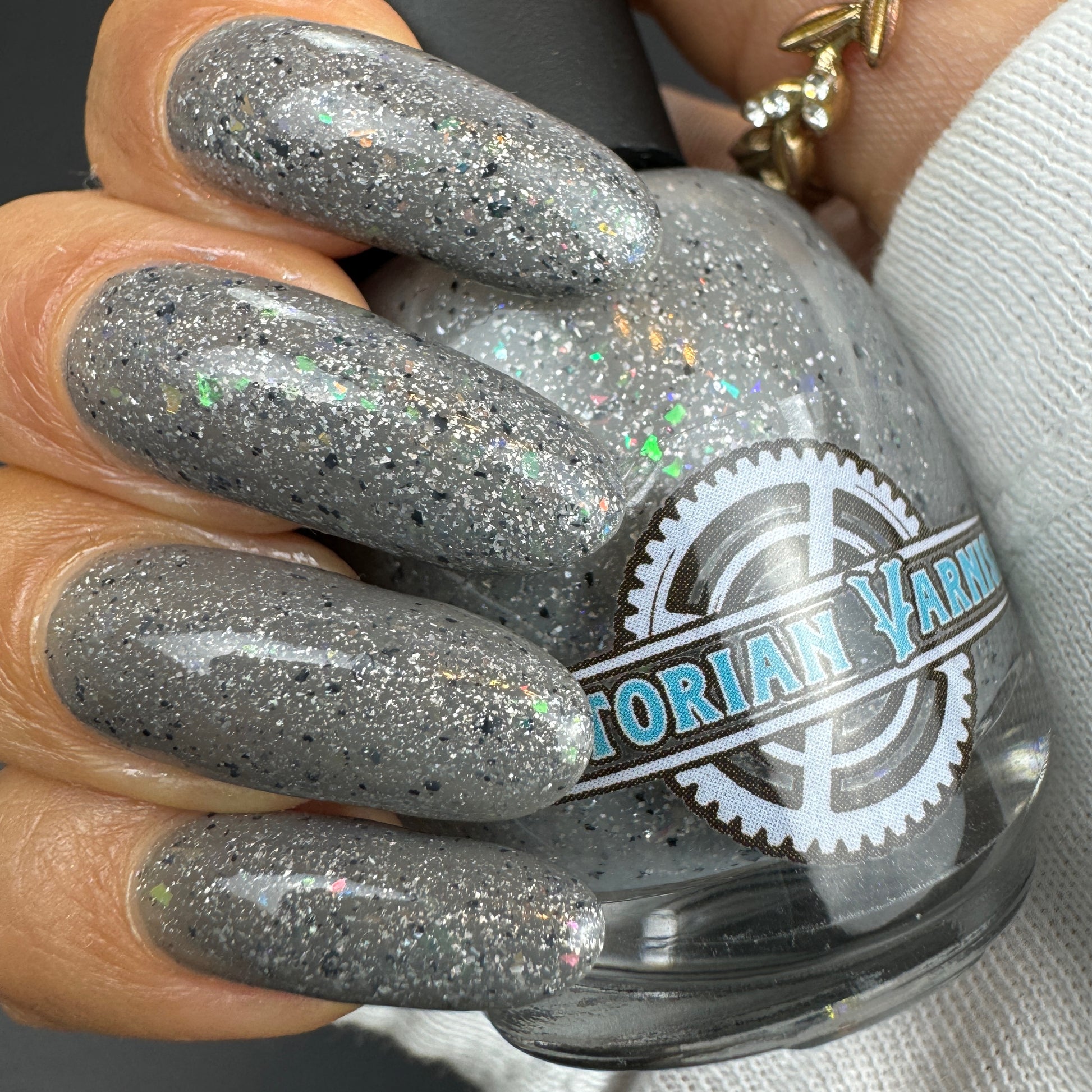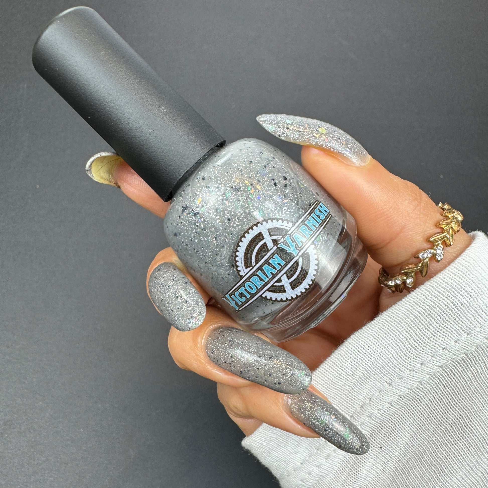 A lovely light dove grey base with ghost flakies, chameleon flakes, black flakes and holo flakies. Comes with a collectible sticker/these are limited, once they are gone, they're gone!