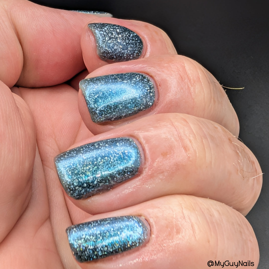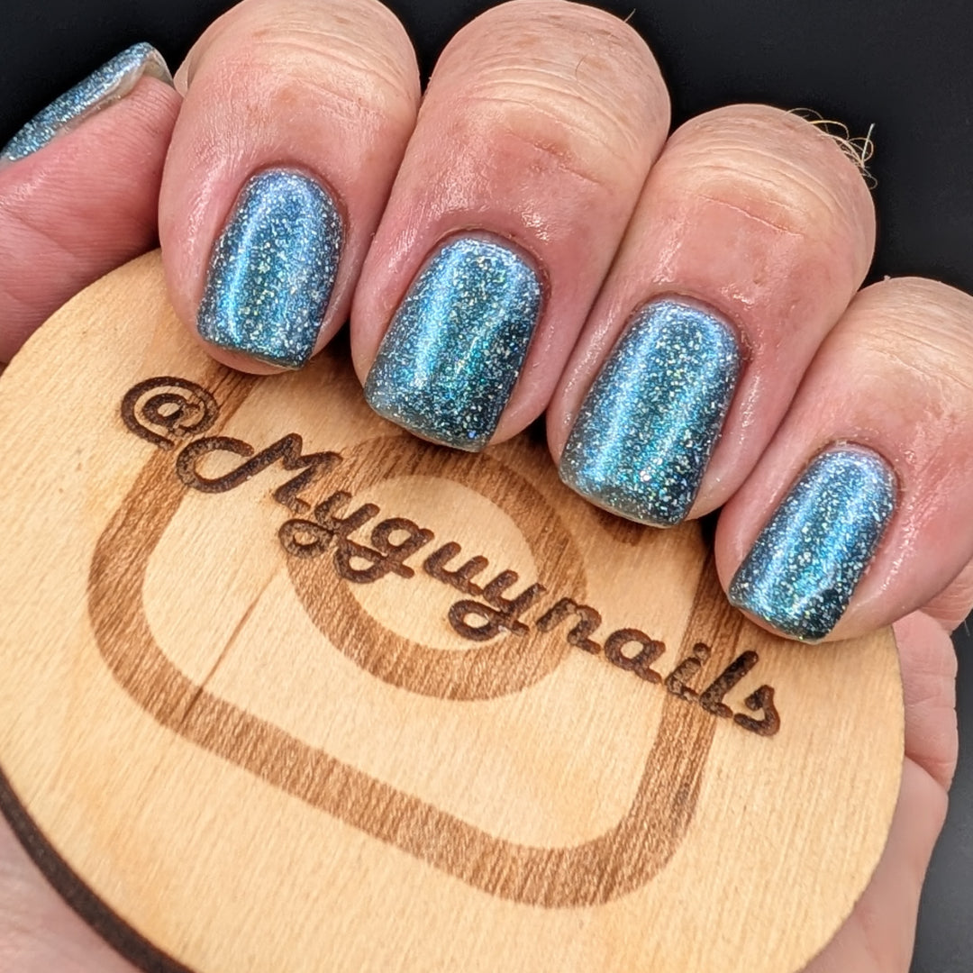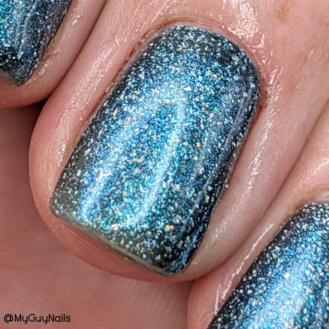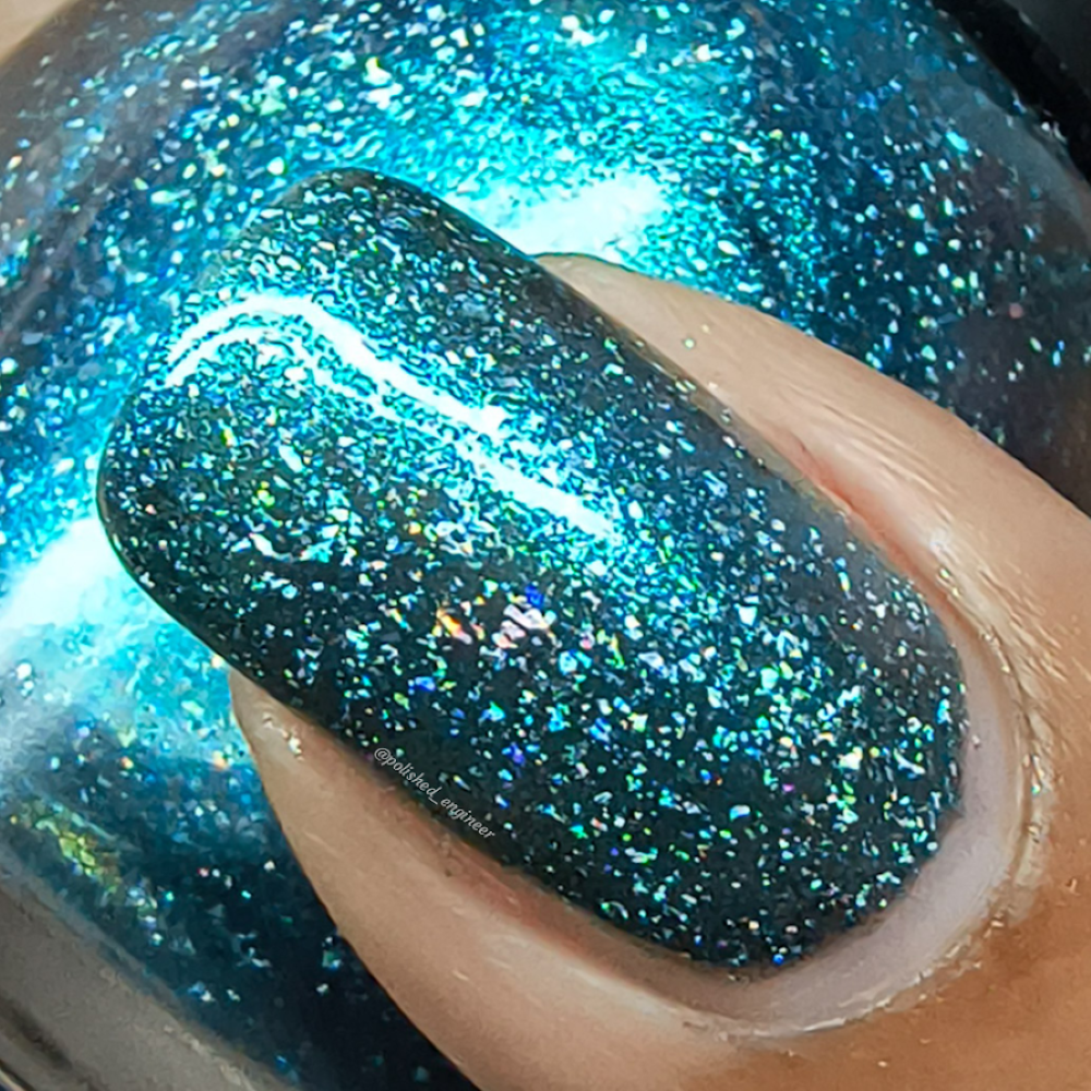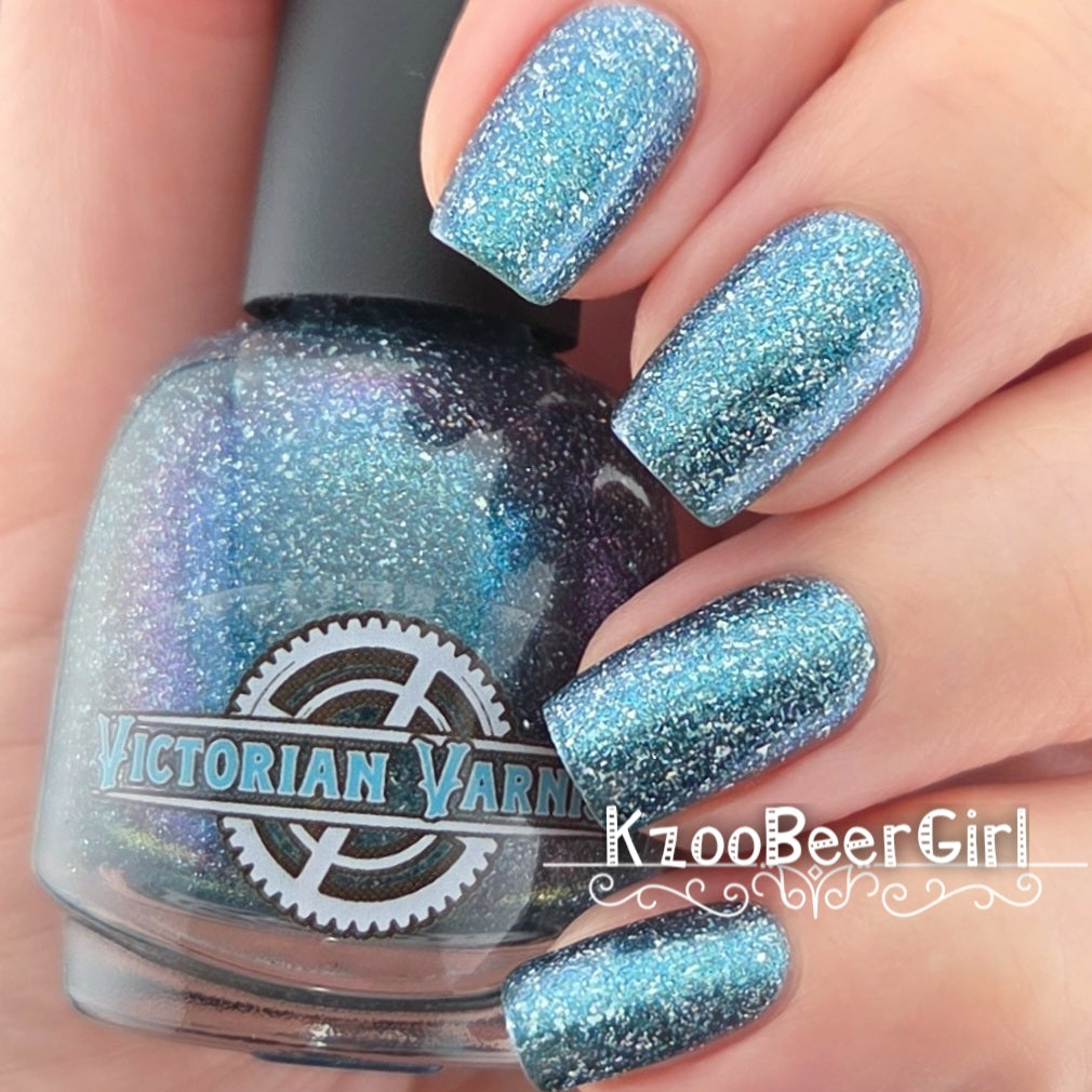 Trecorum is a fall sky blue base with a large particle blue/purple/aqua aurora shimmer and loads of holo flakies