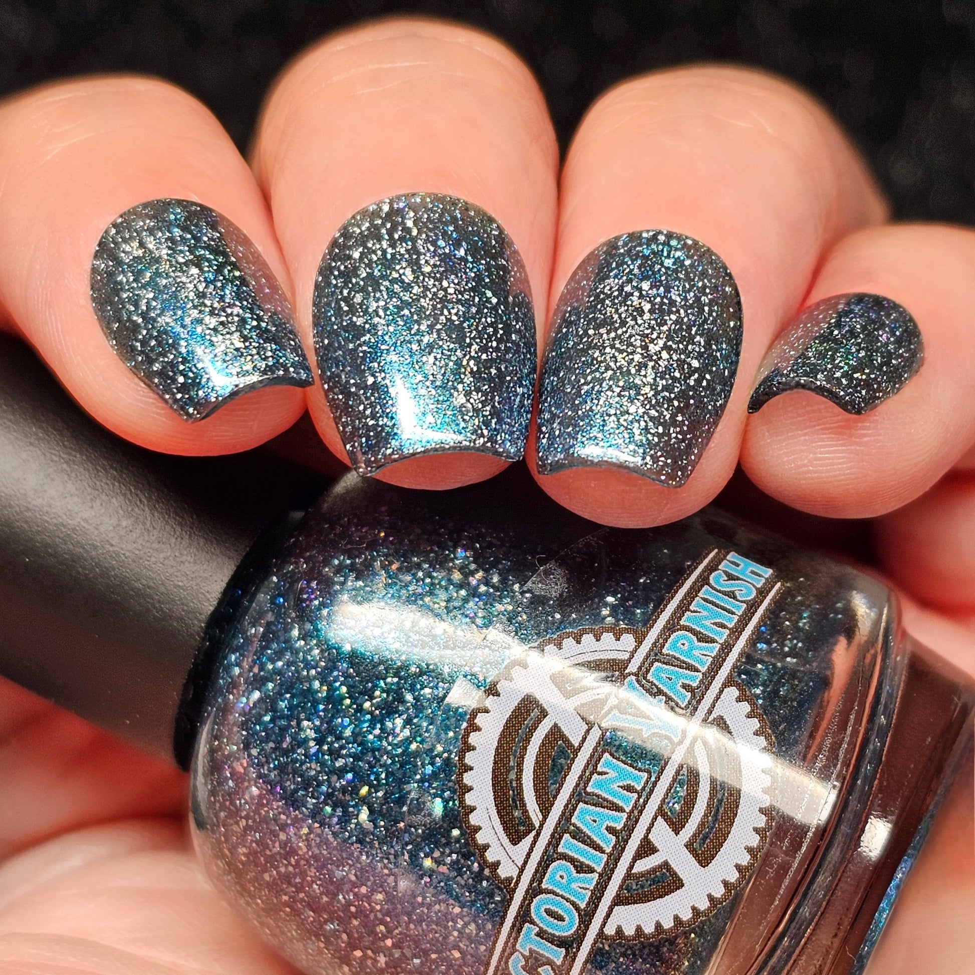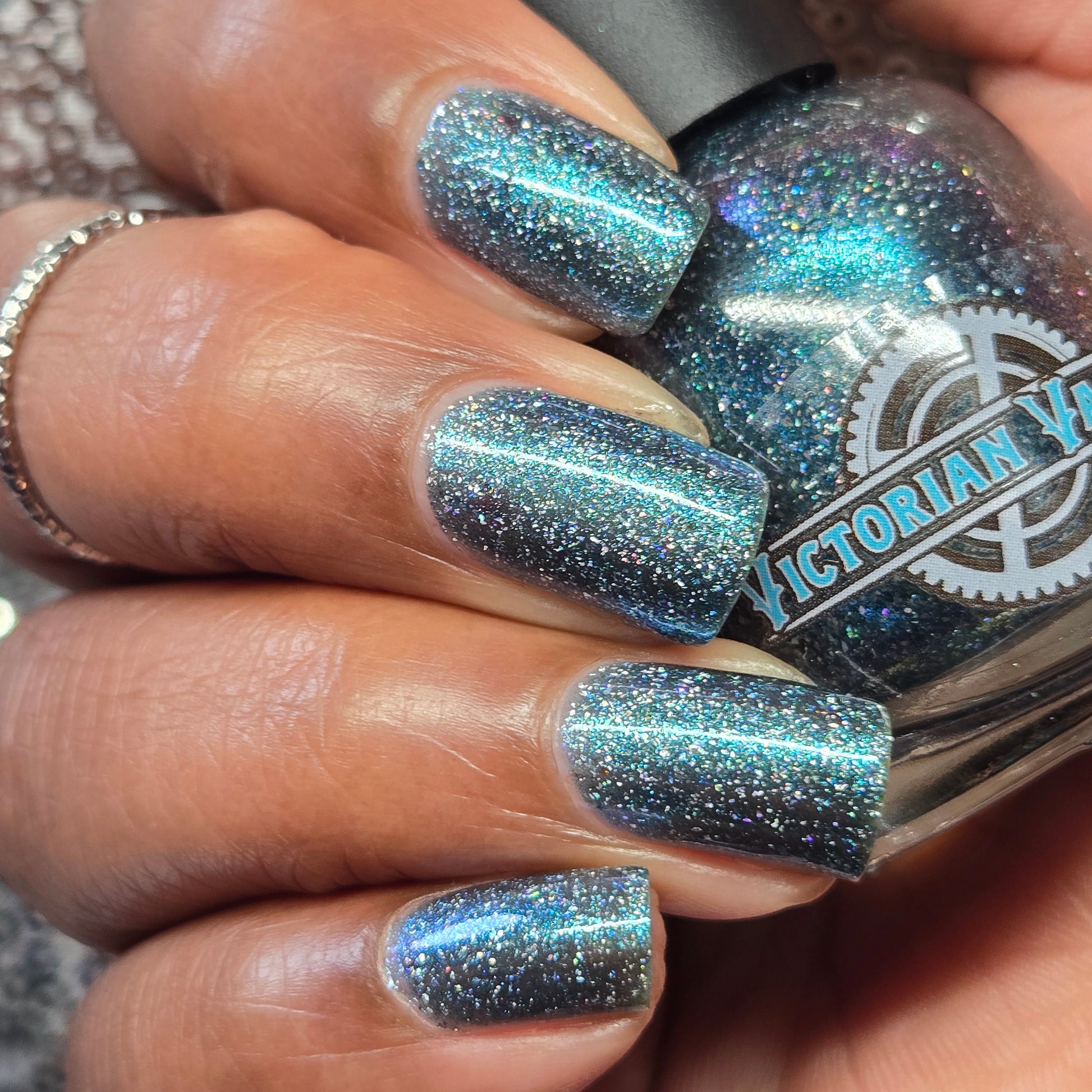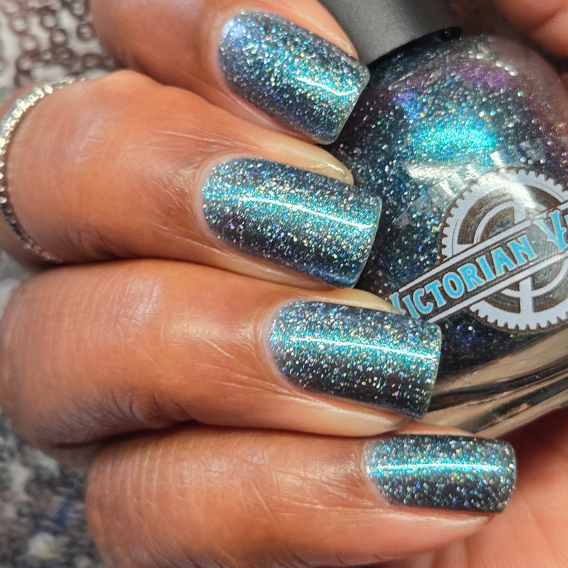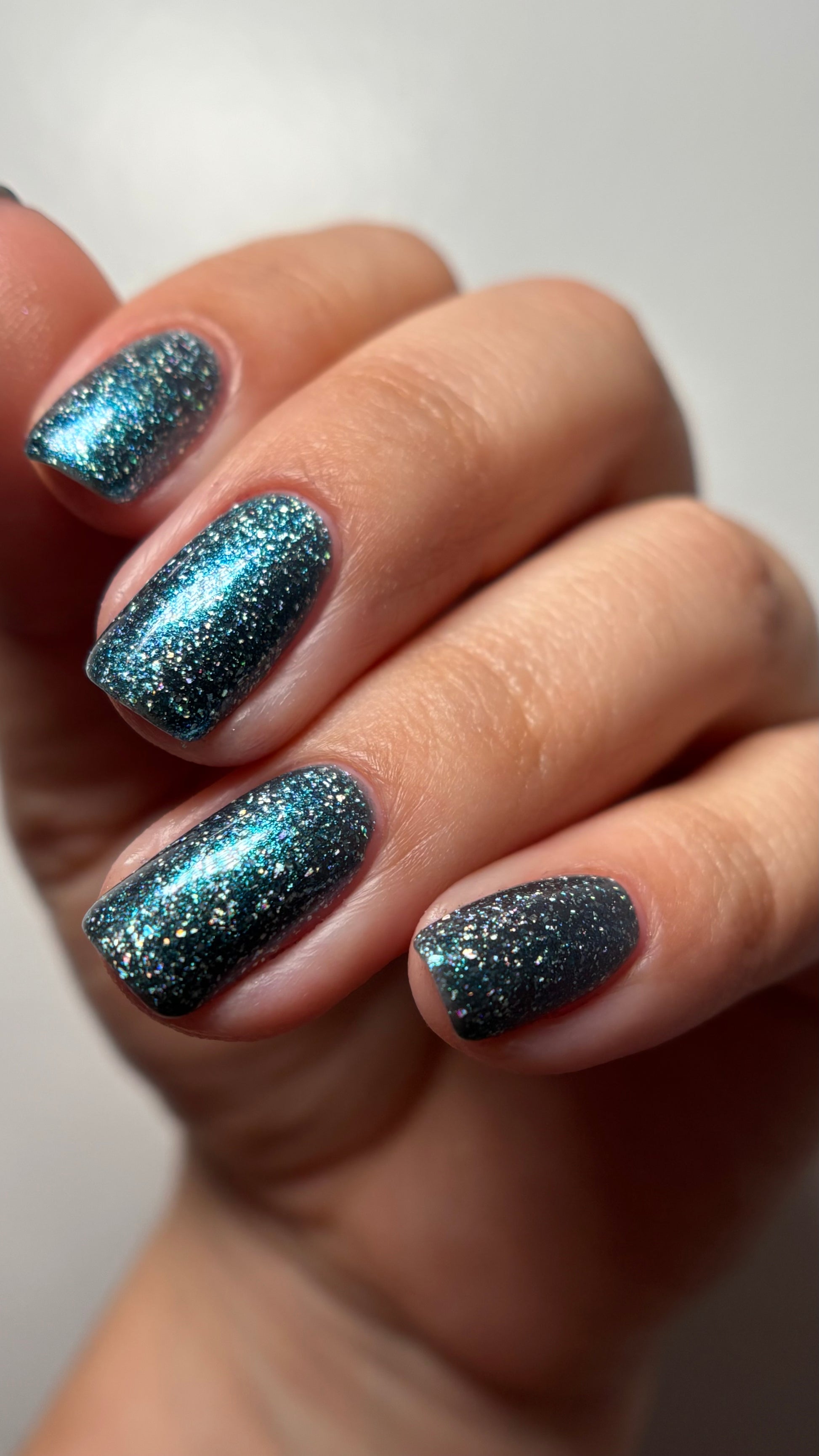 Trecorum is a fall sky blue base with a large particle blue/purple/aqua aurora shimmer and loads of holo flakies