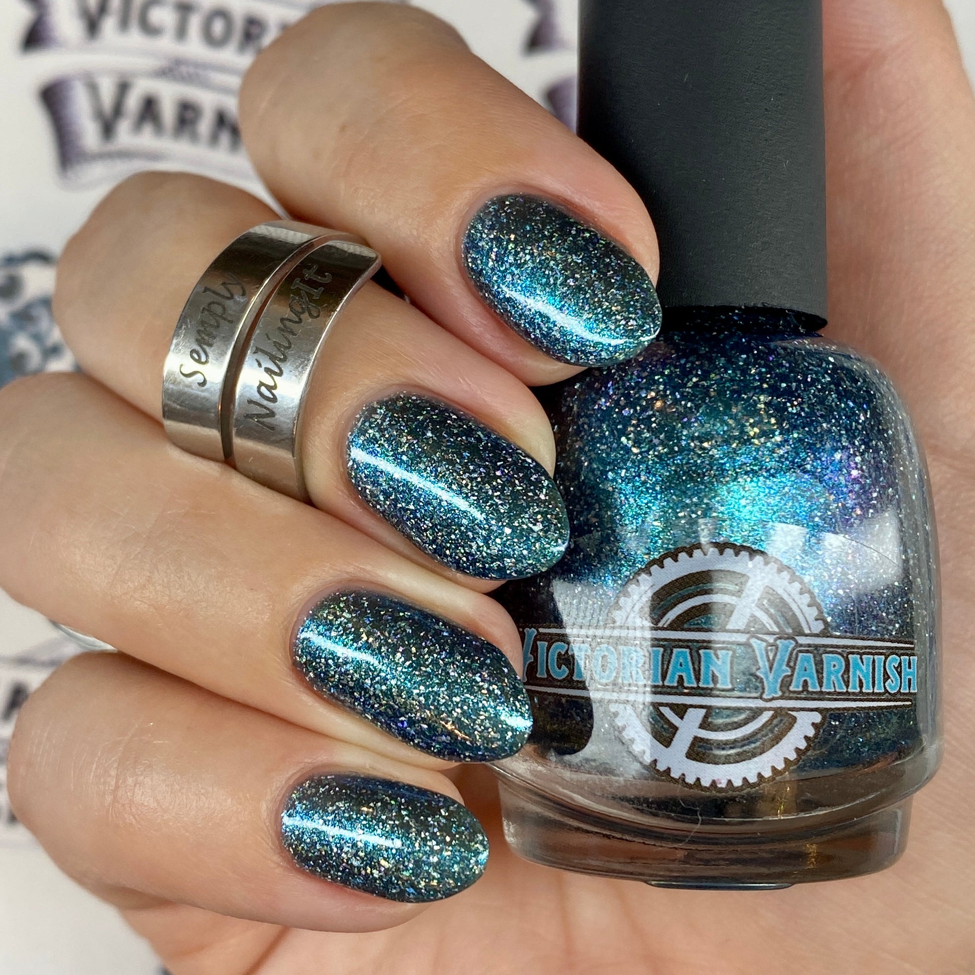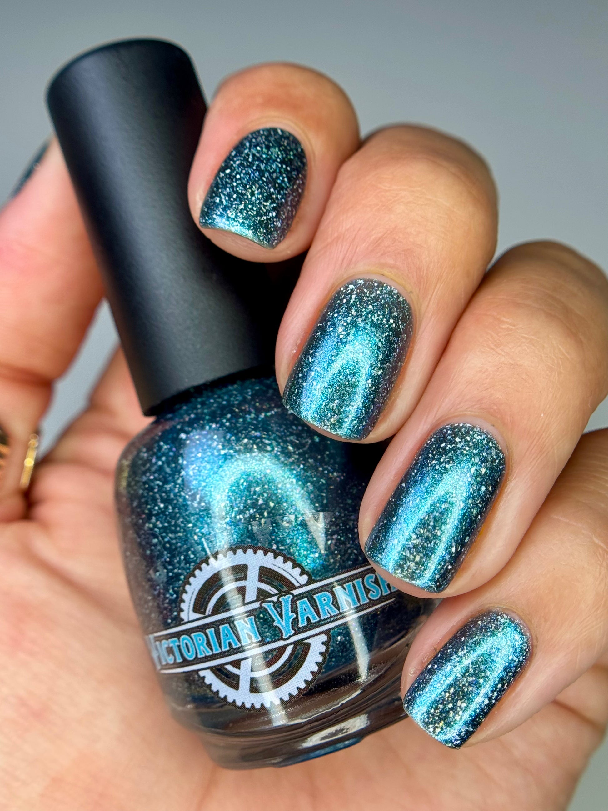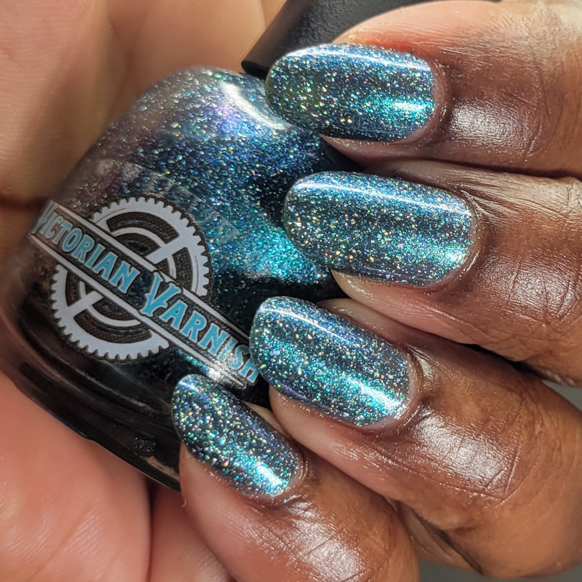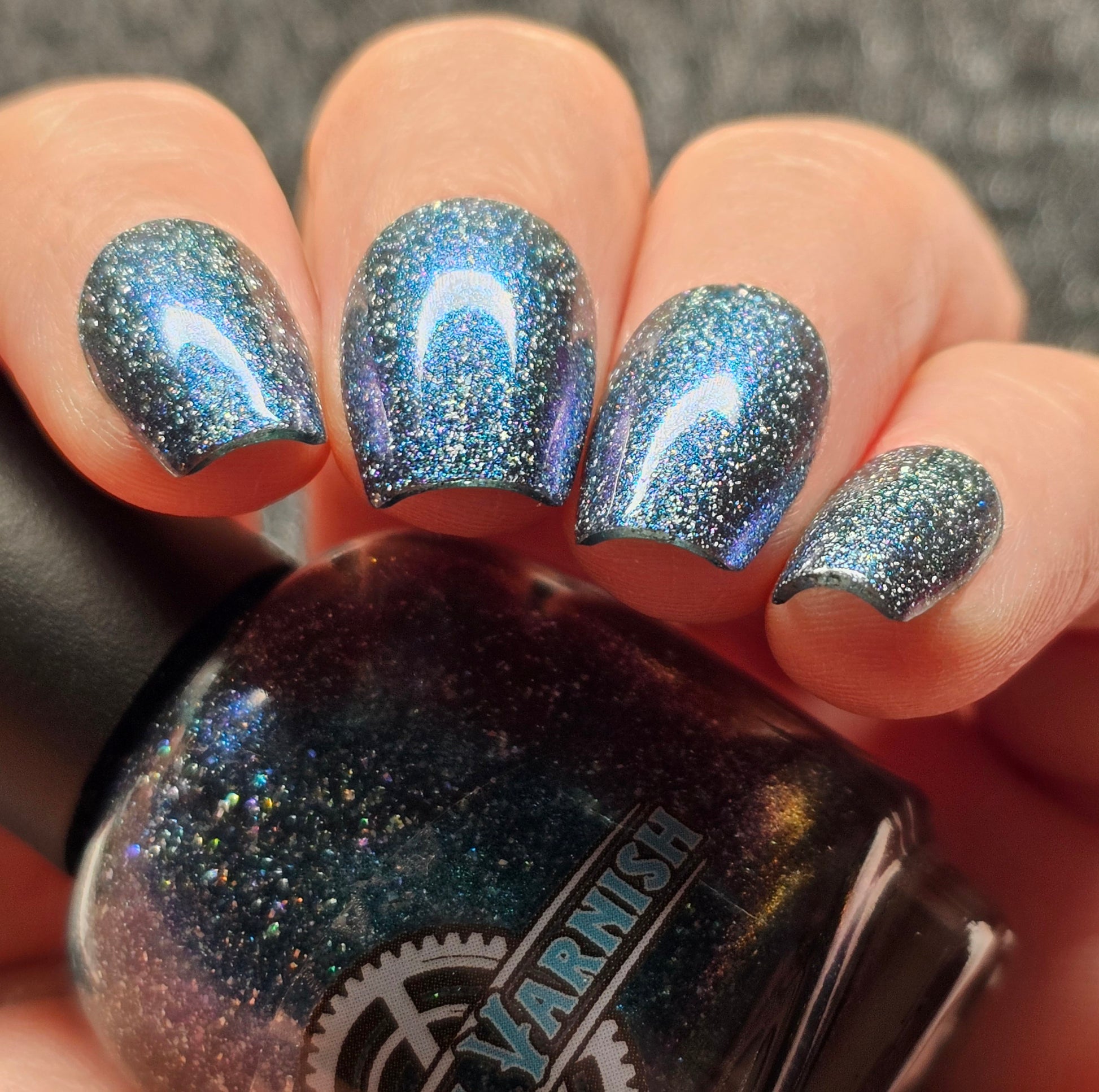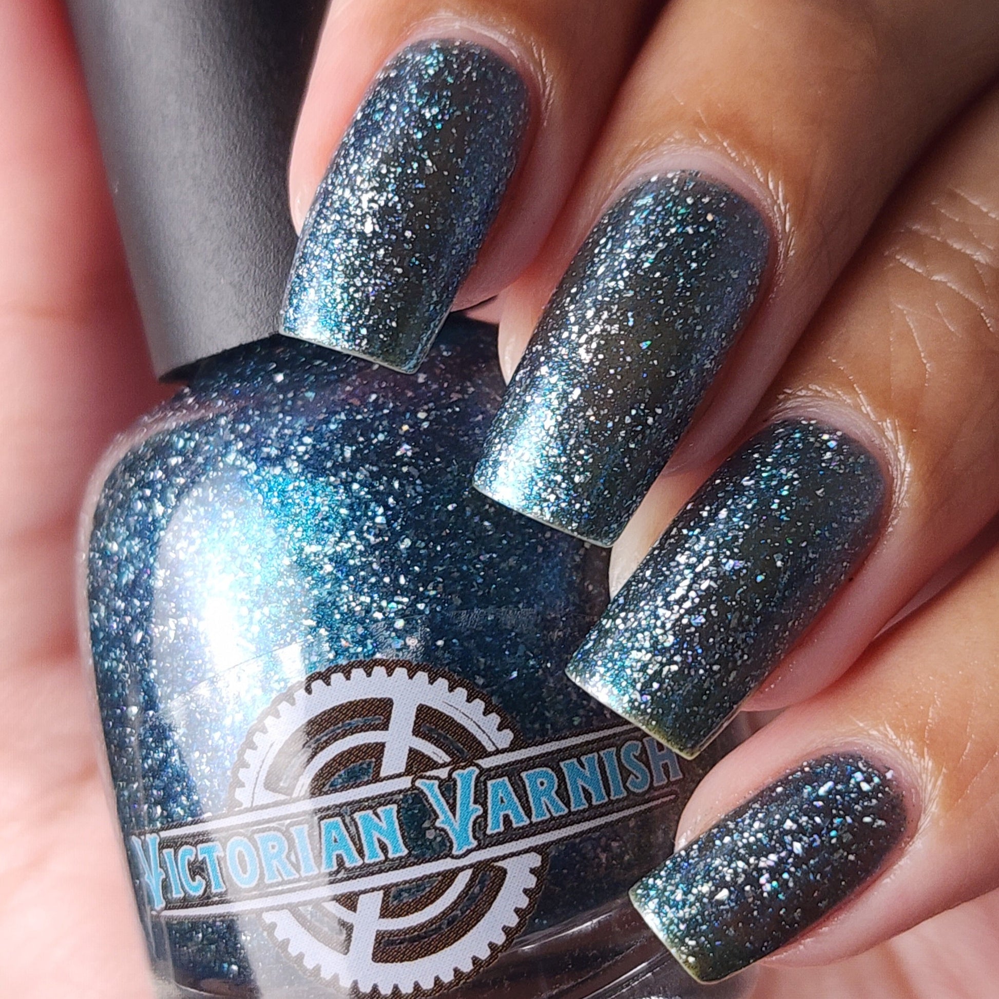 Trecorum is a fall sky blue base with a large particle blue/purple/aqua aurora shimmer and loads of holo flakies