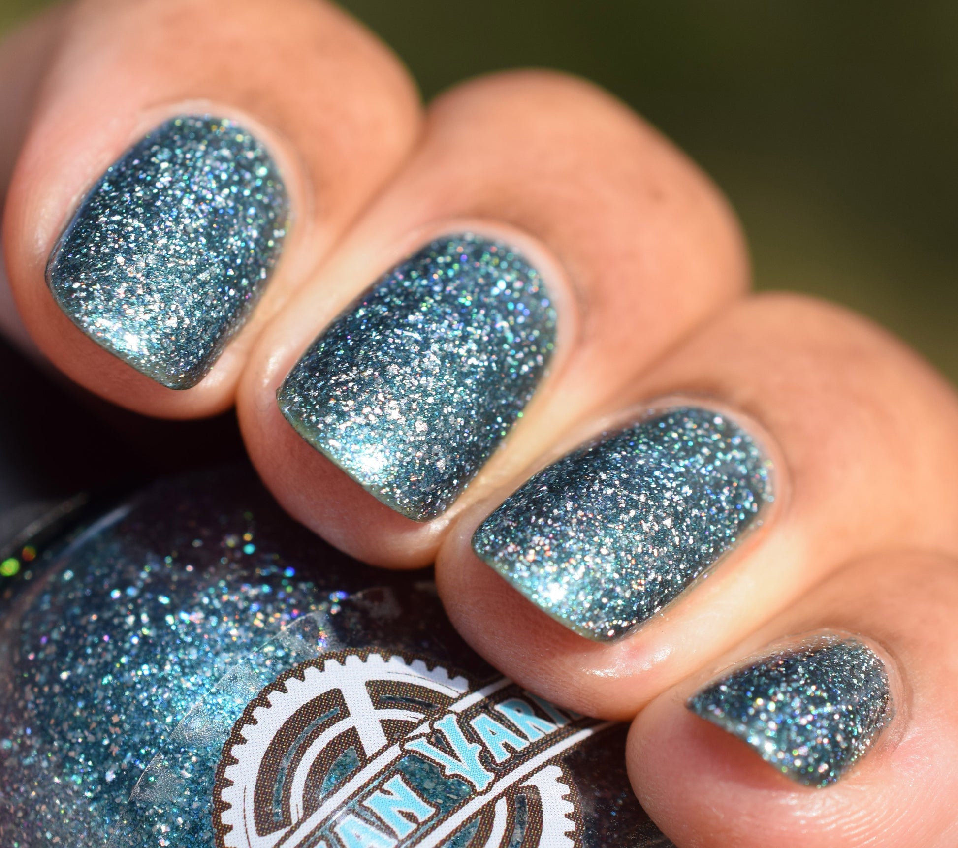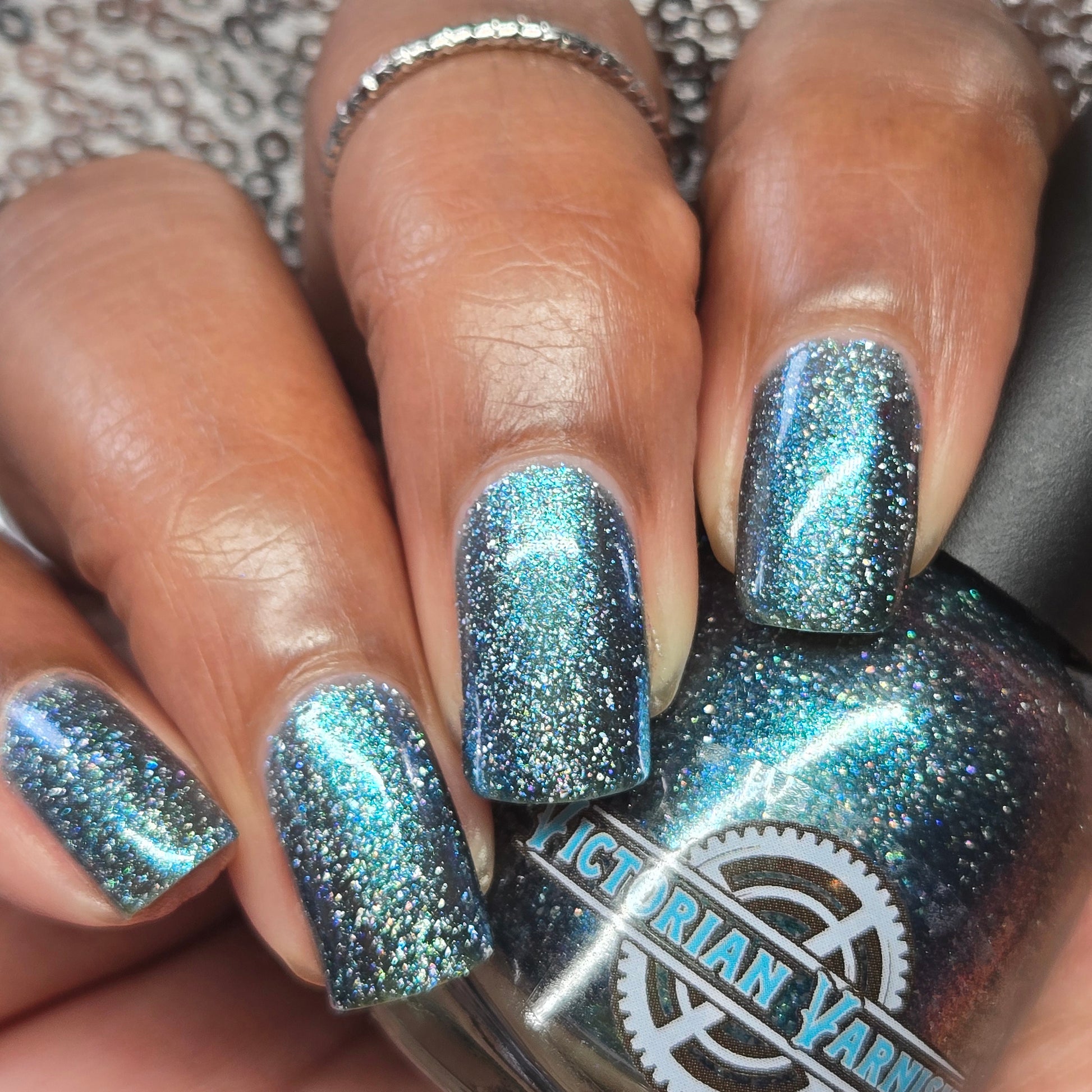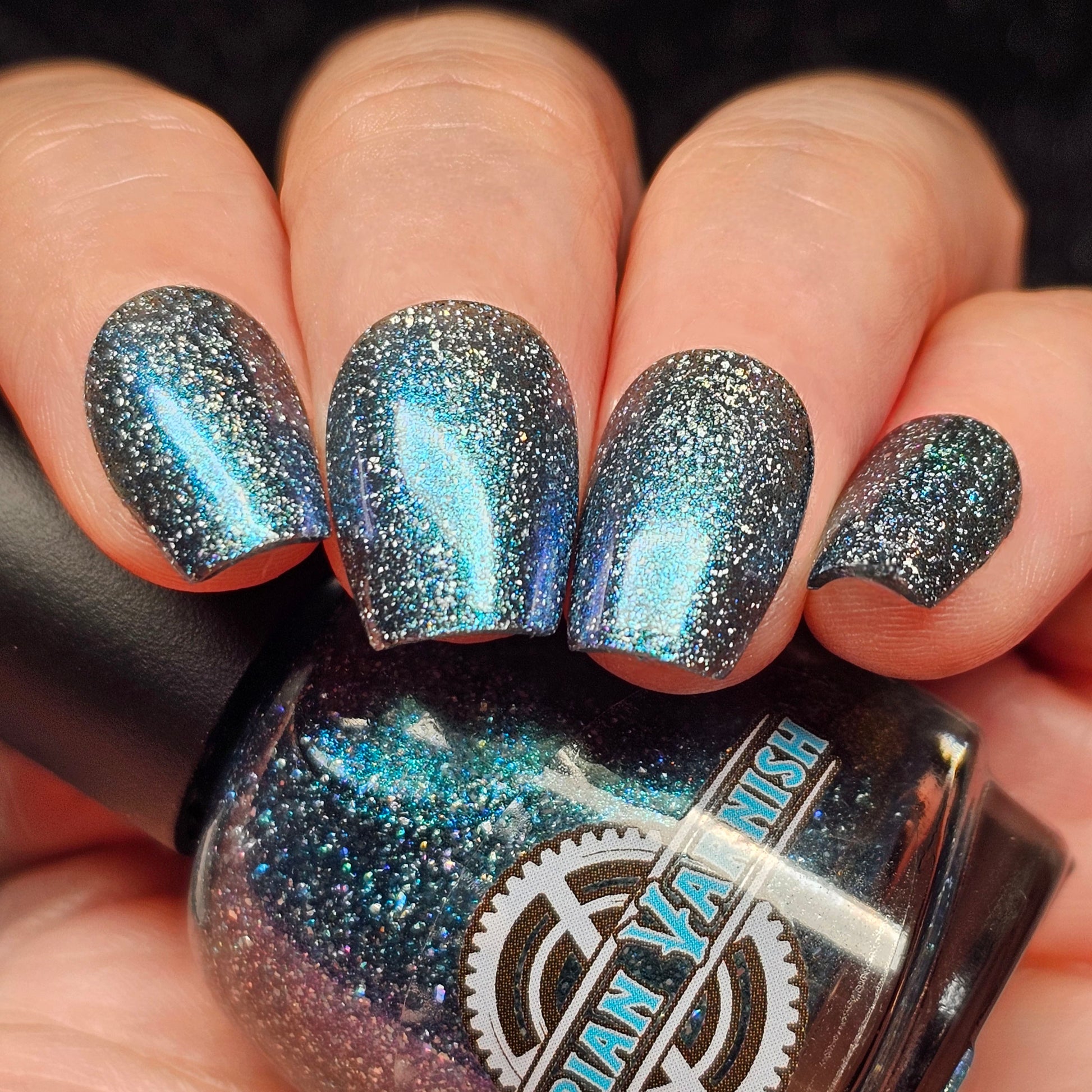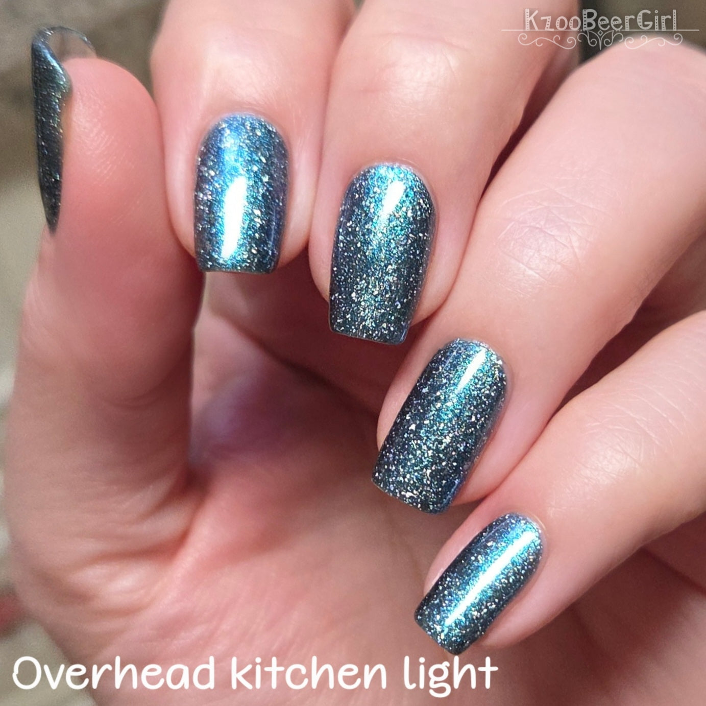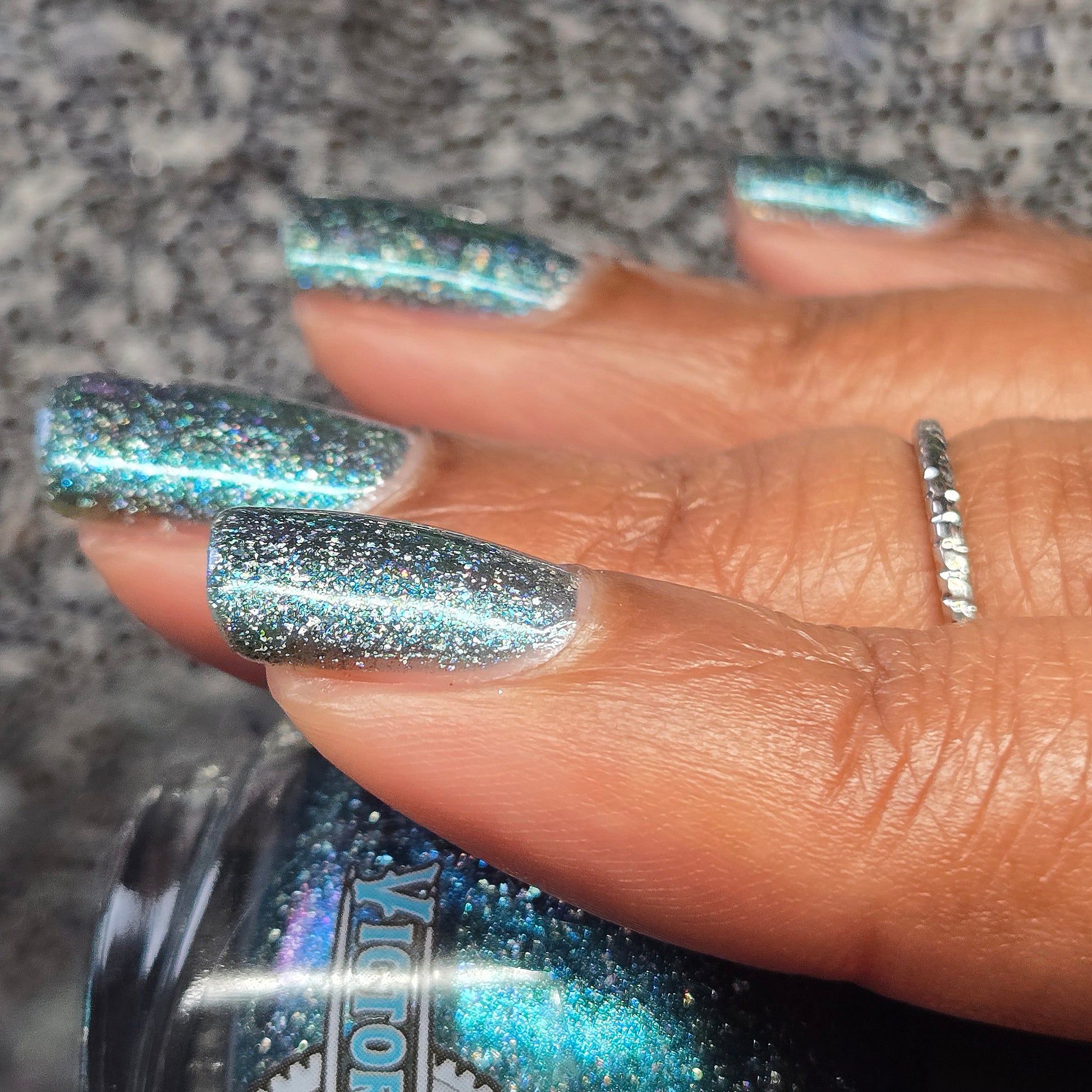 Trecorum is a fall sky blue base with a large particle blue/purple/aqua aurora shimmer and loads of holo flakies