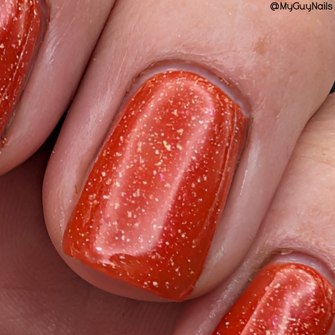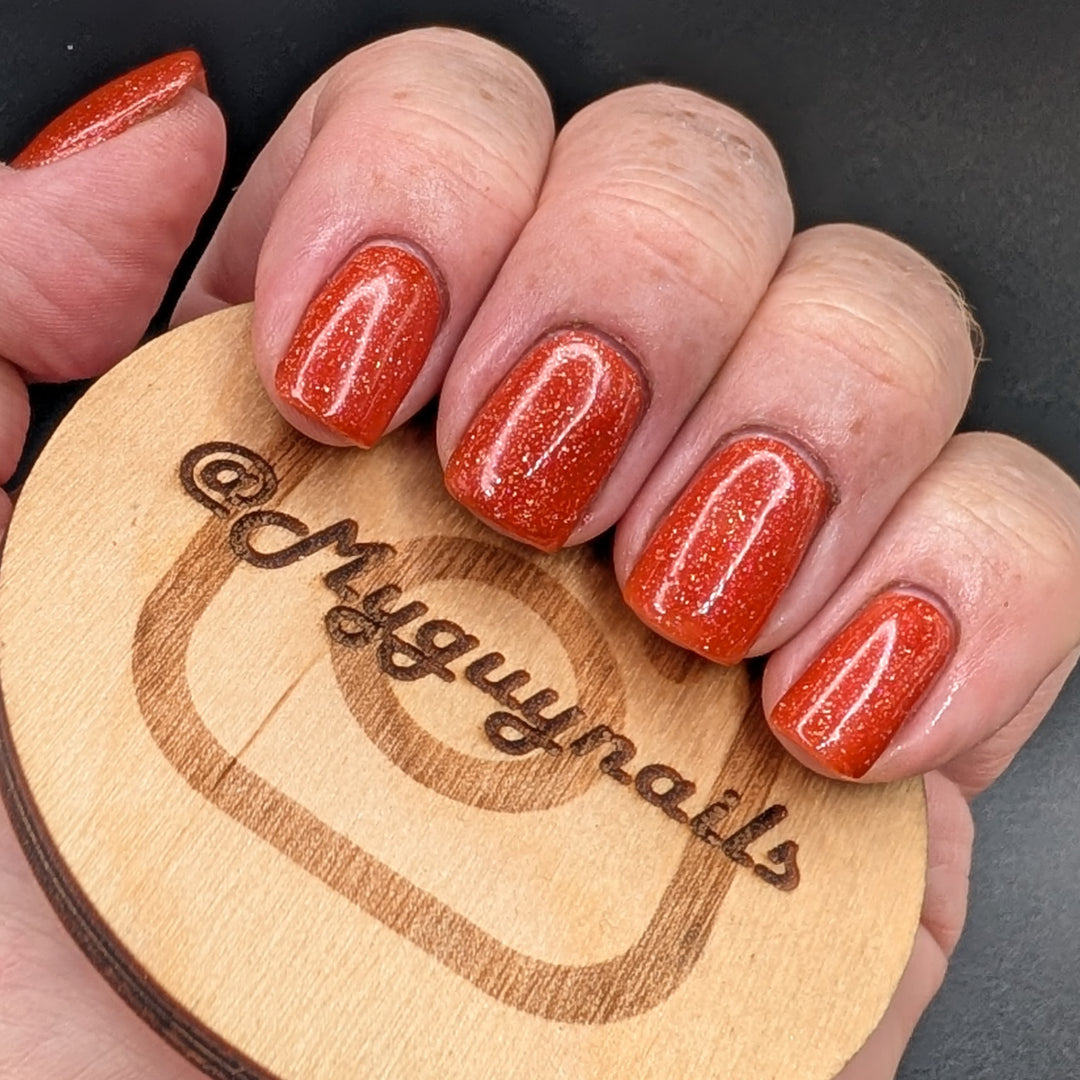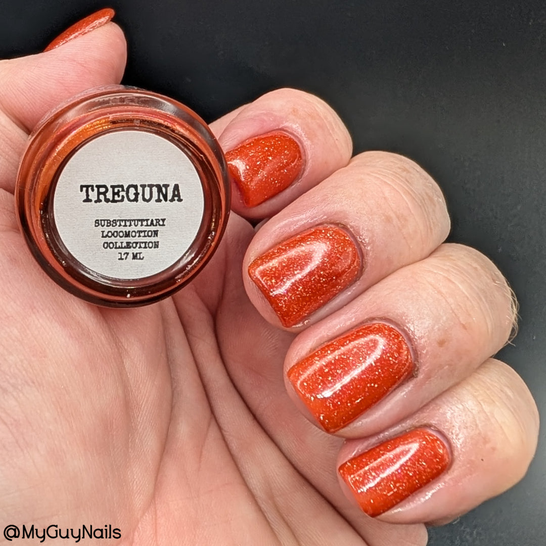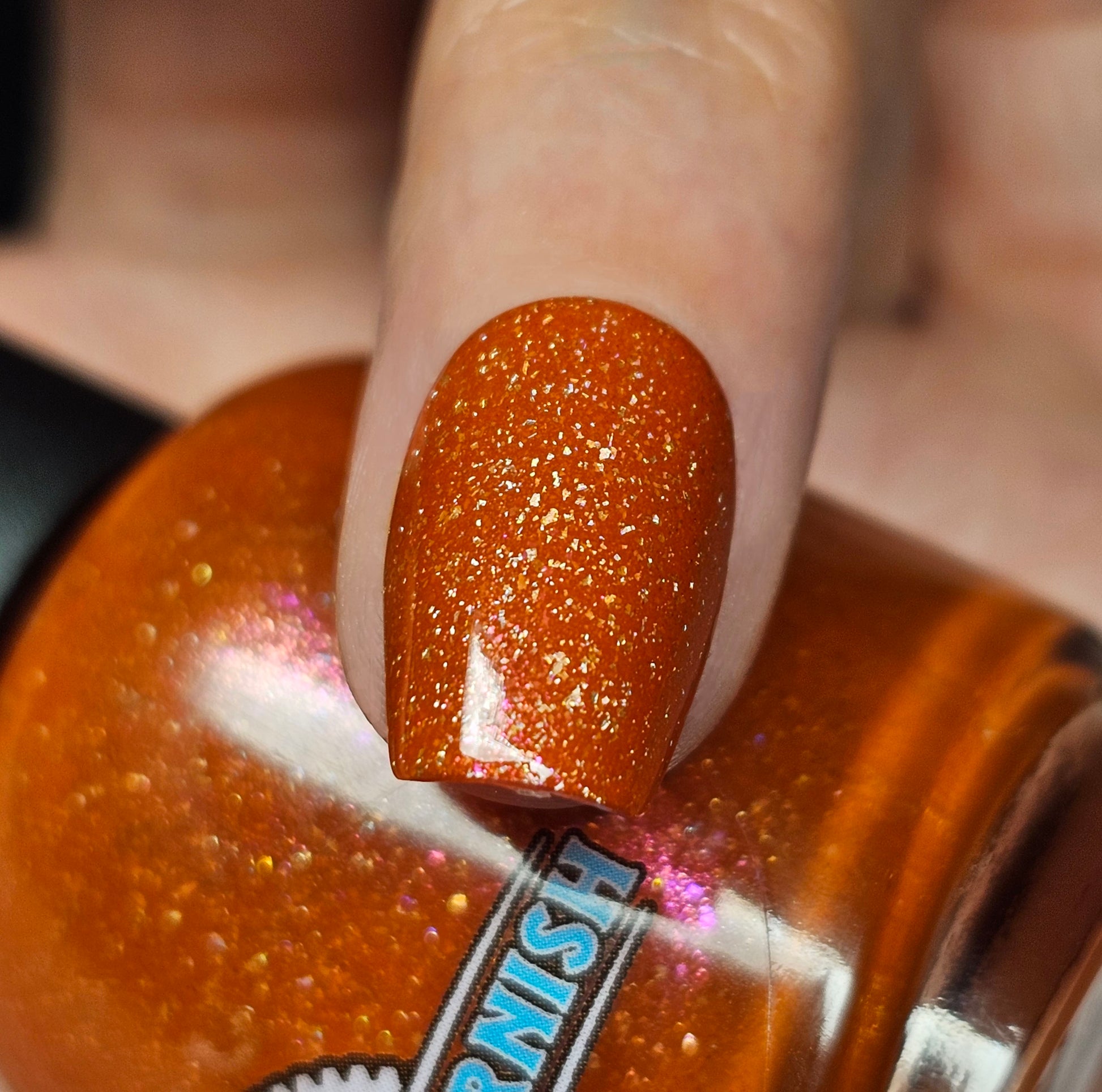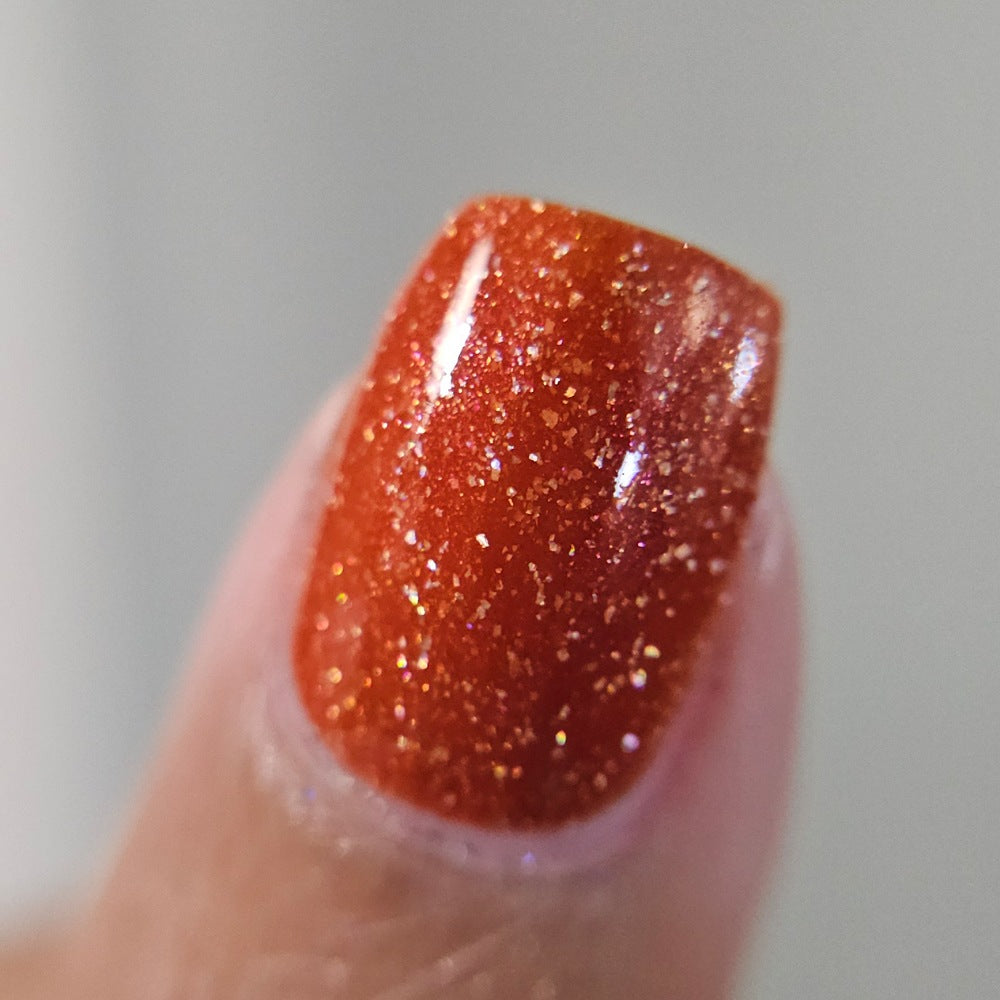 Treguna is a burnt sienna orange base with pink/gold large particle shimmers and loads of holo flakies