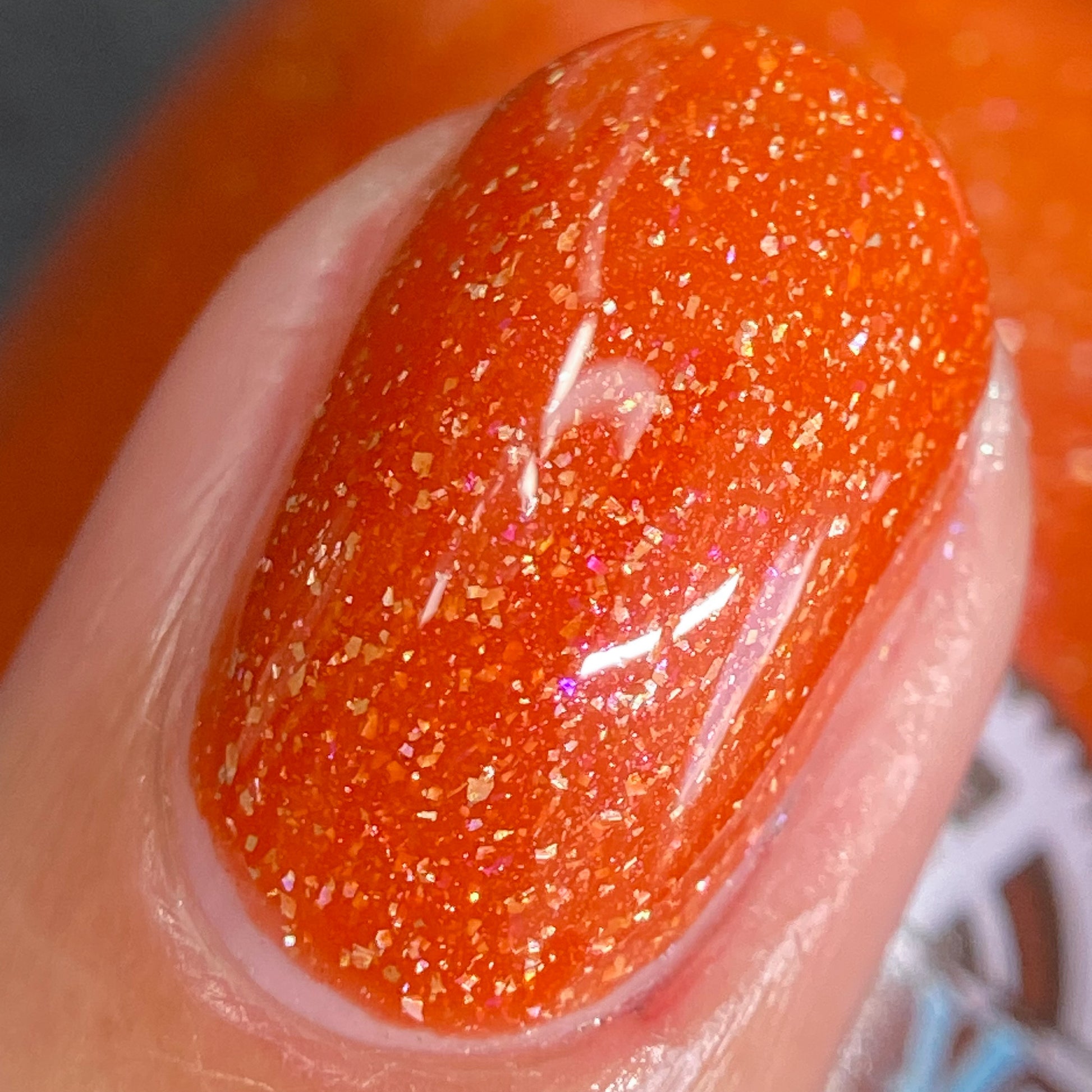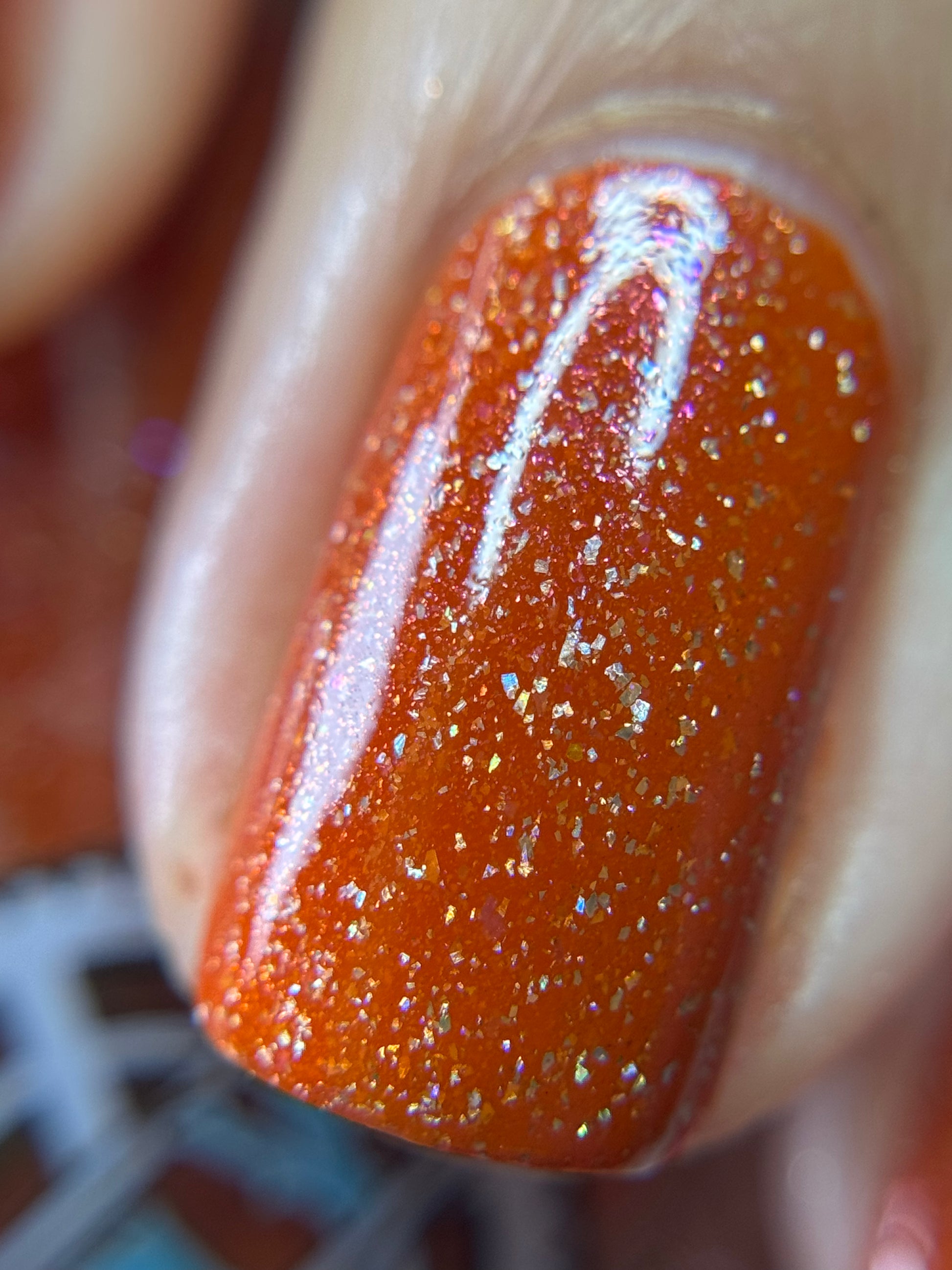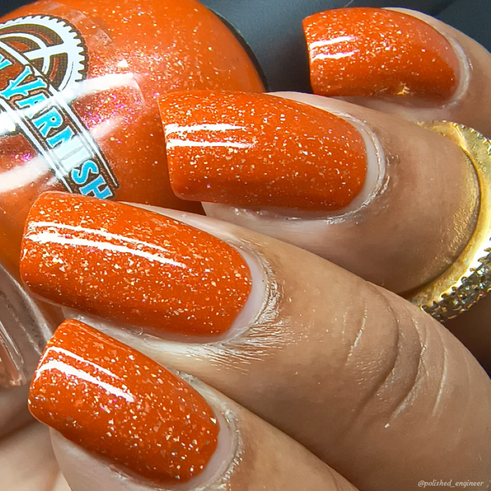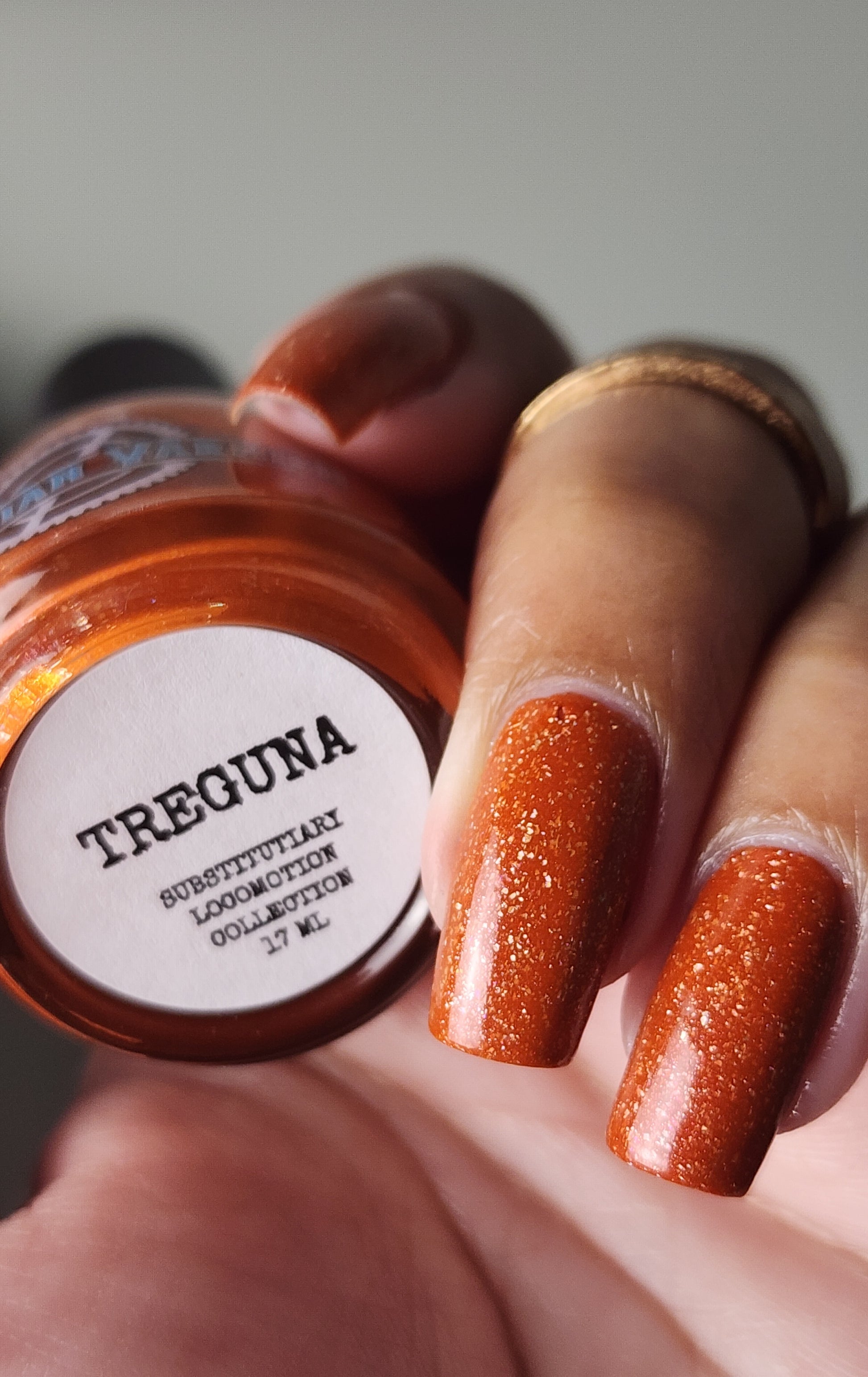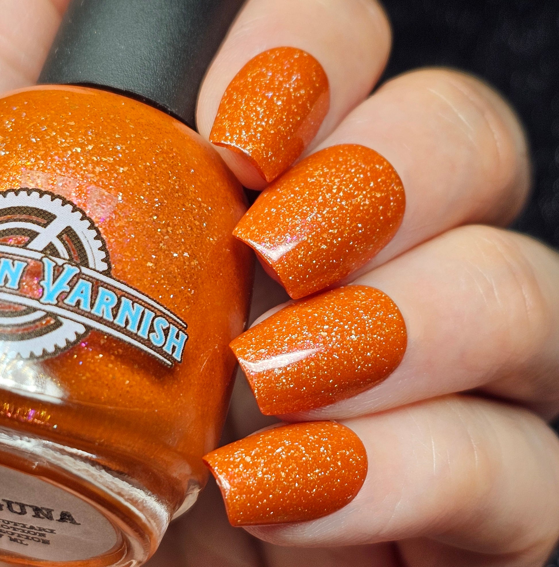 Treguna is a burnt sienna orange base with pink/gold large particle shimmers and loads of holo flakies