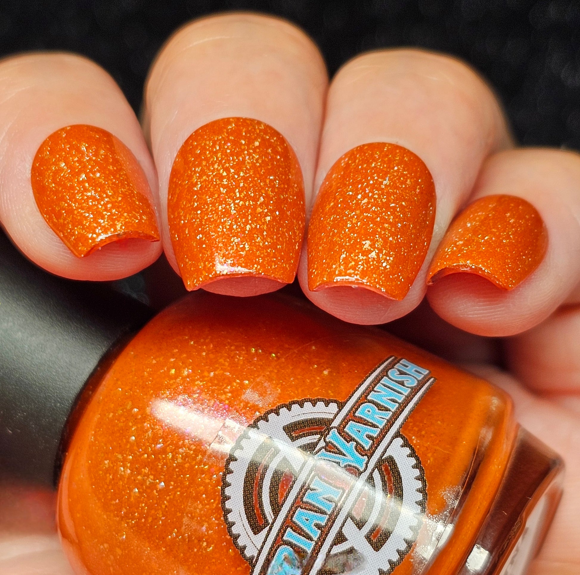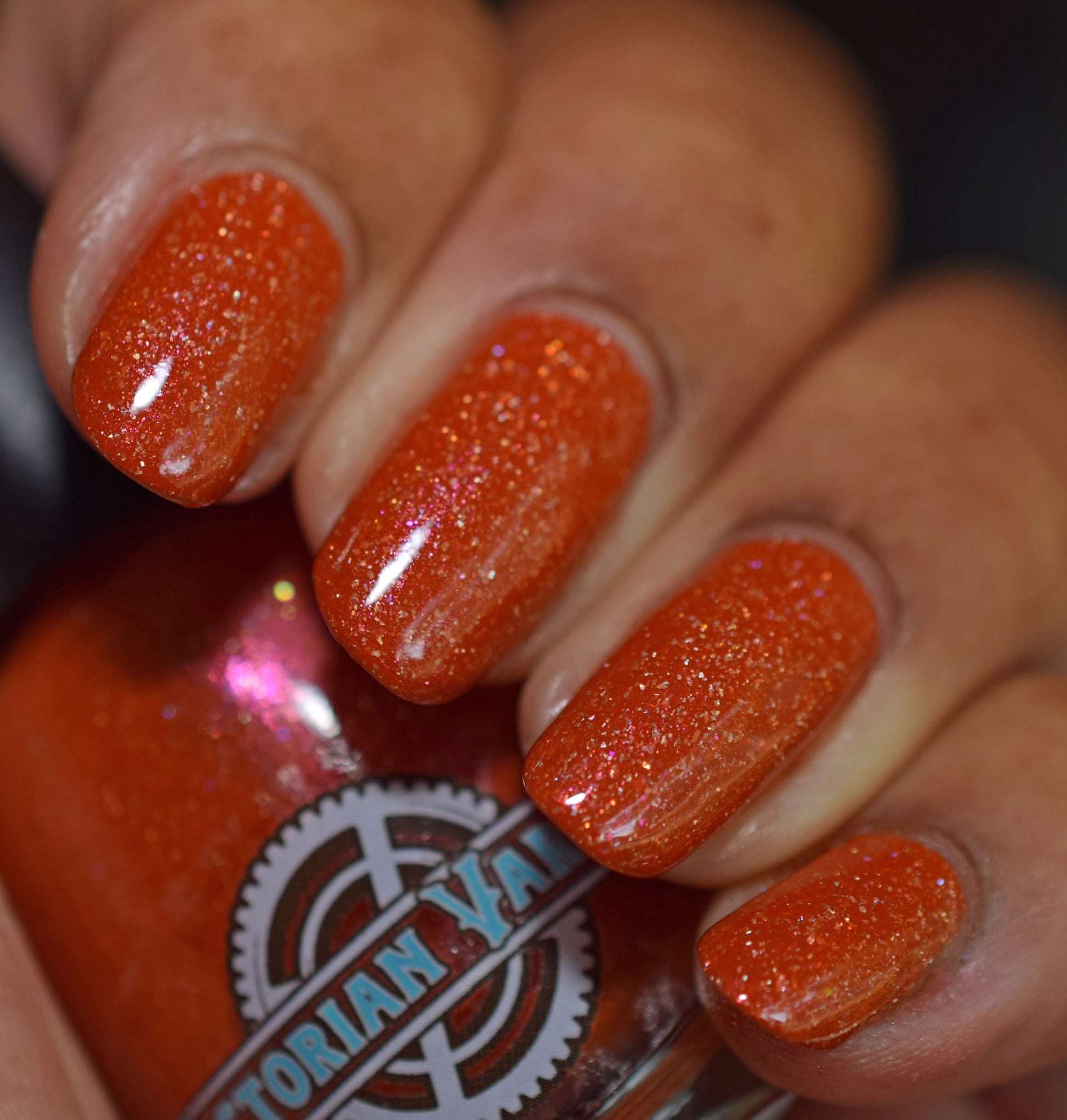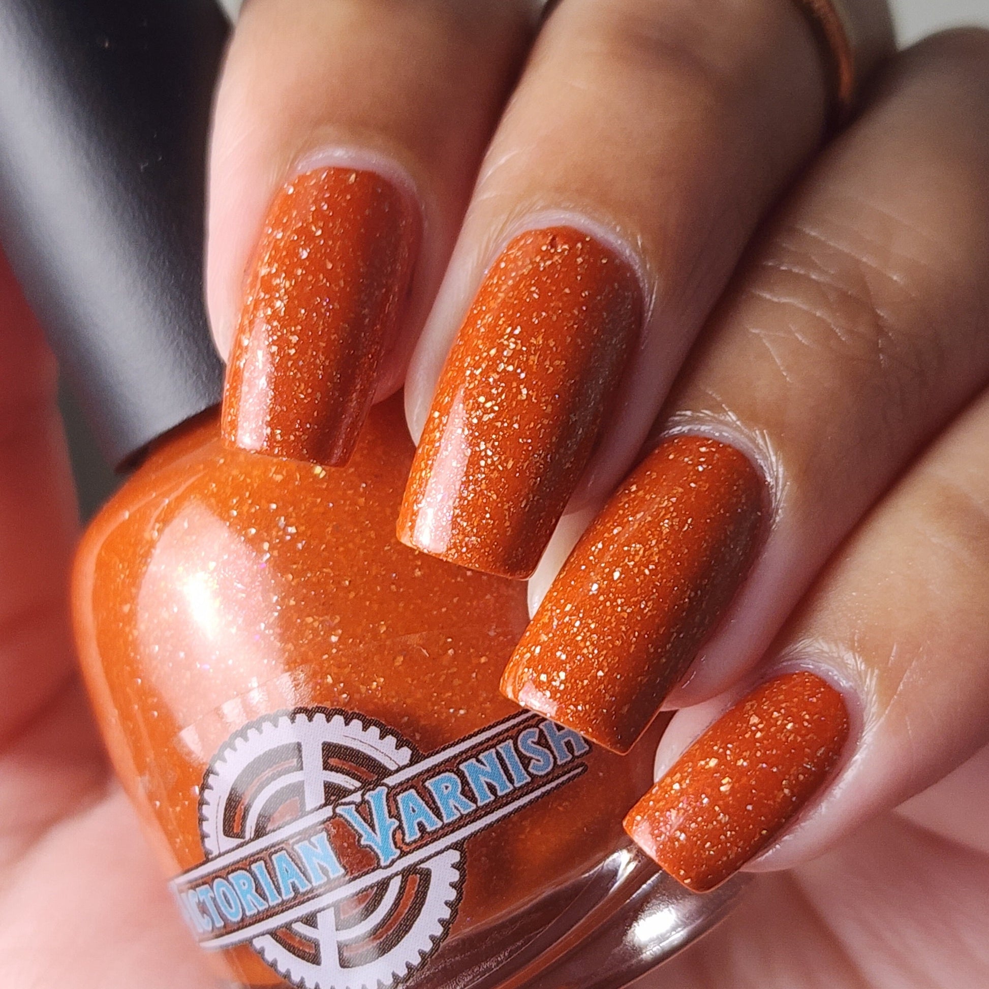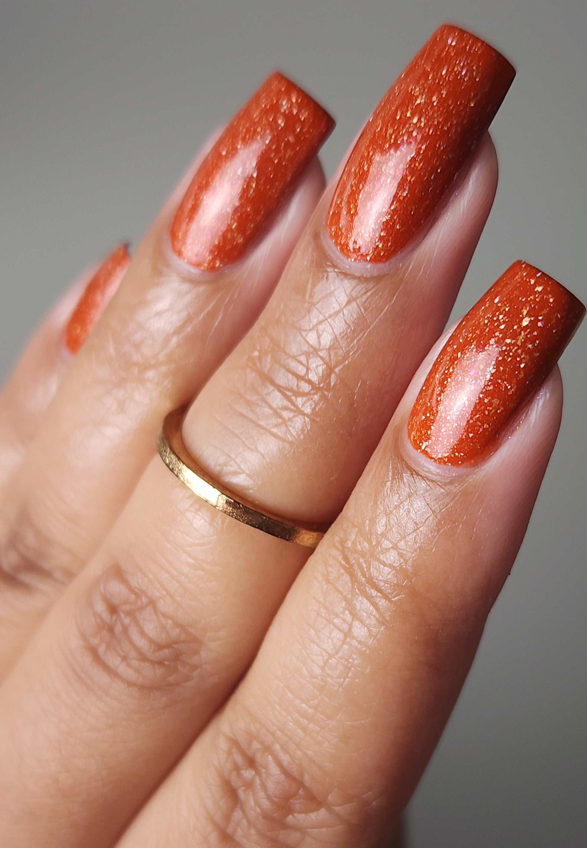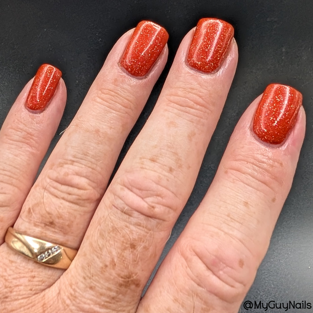 Treguna is a burnt sienna orange base with pink/gold large particle shimmers and loads of holo flakies