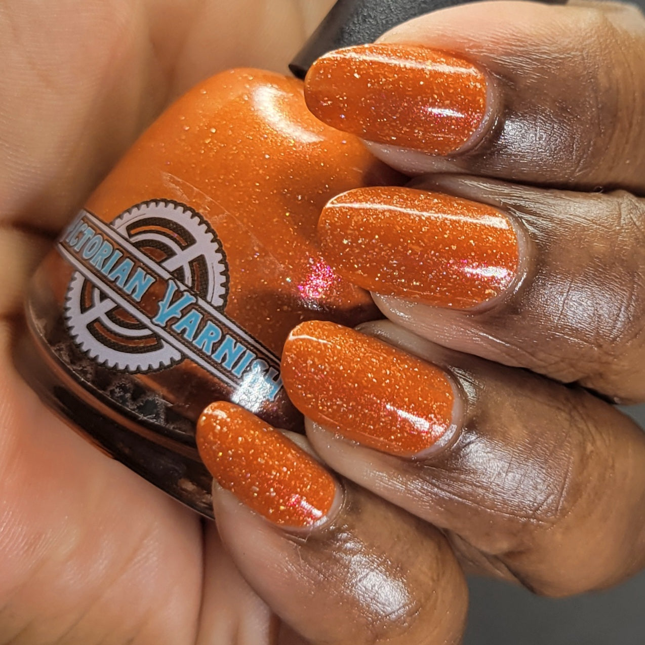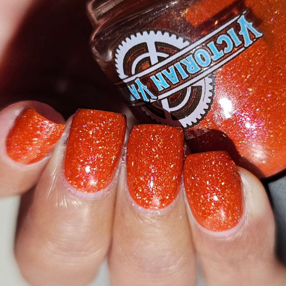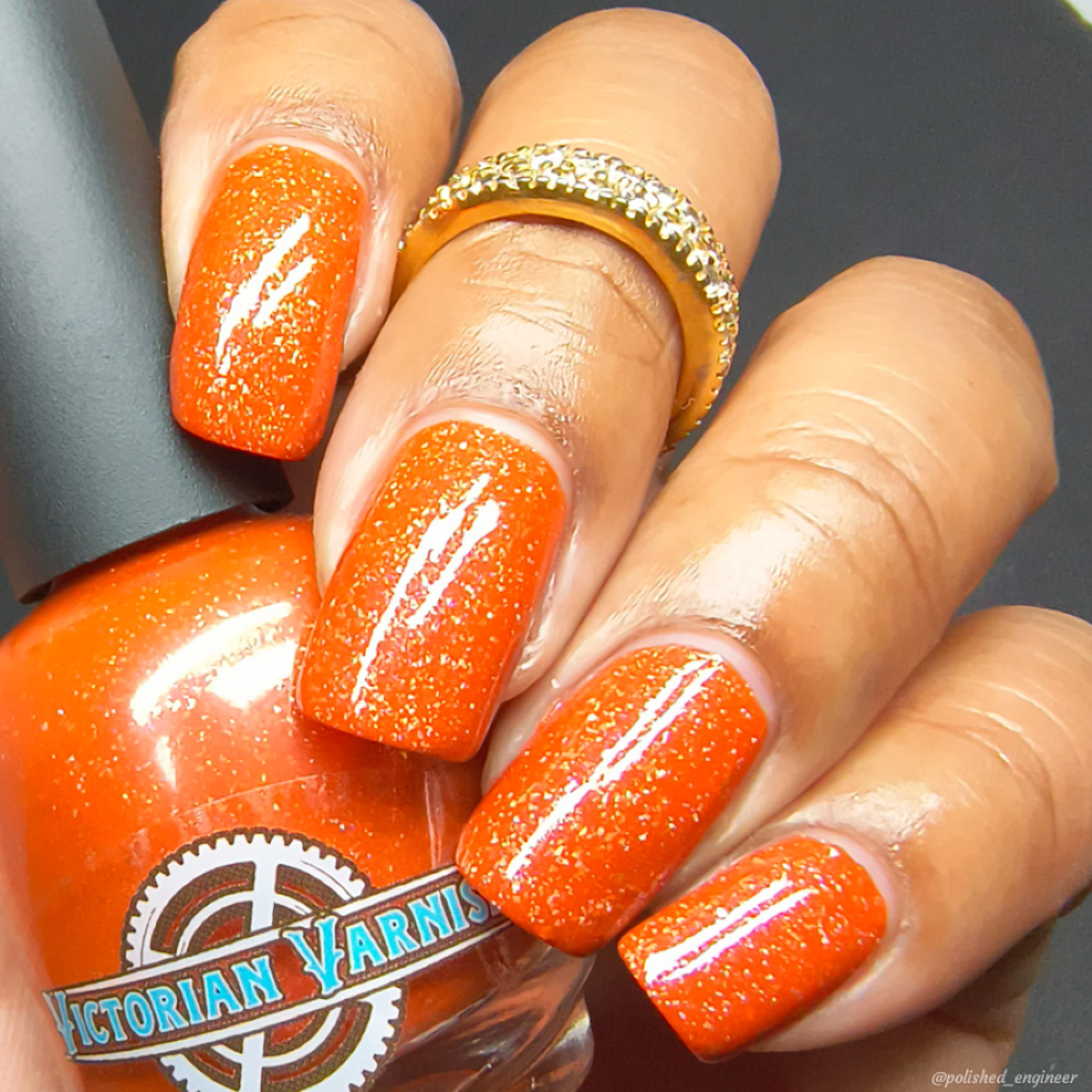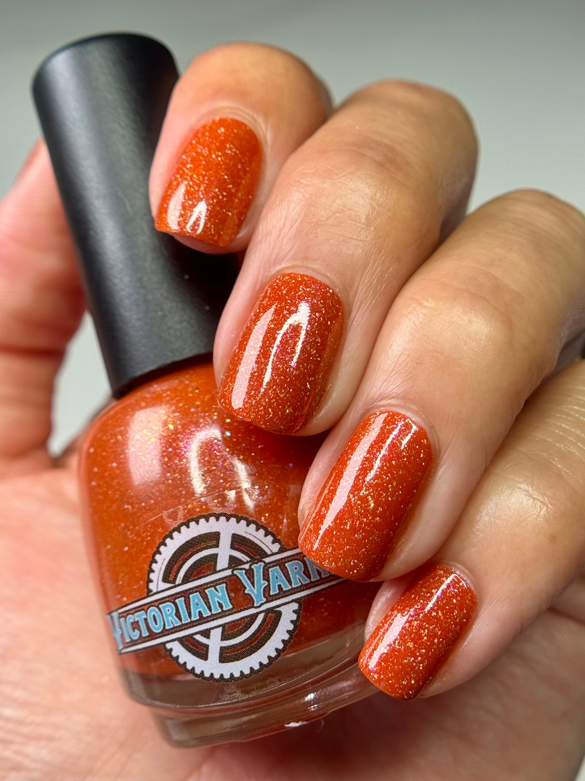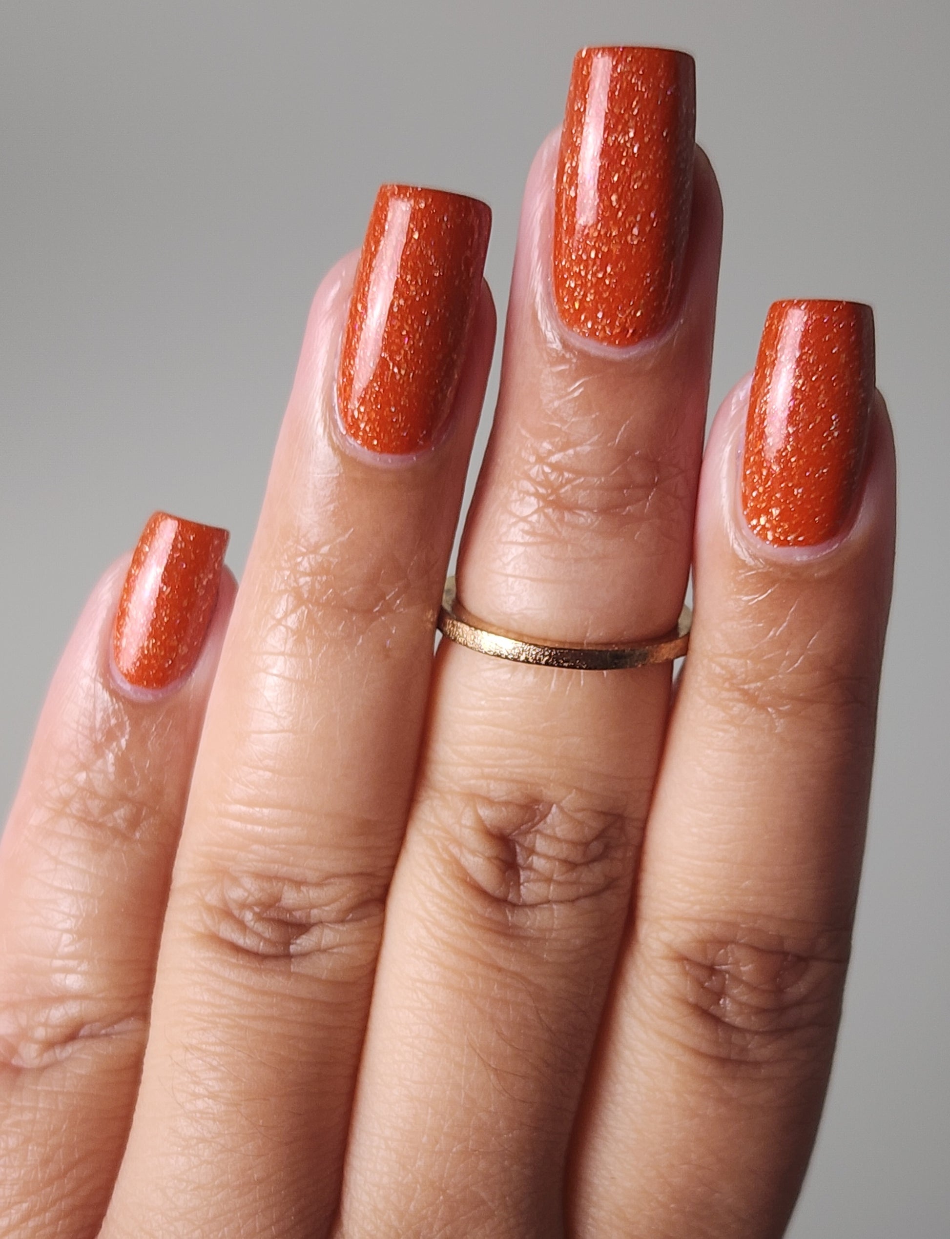 Treguna is a burnt sienna orange base with pink/gold large particle shimmers and loads of holo flakies