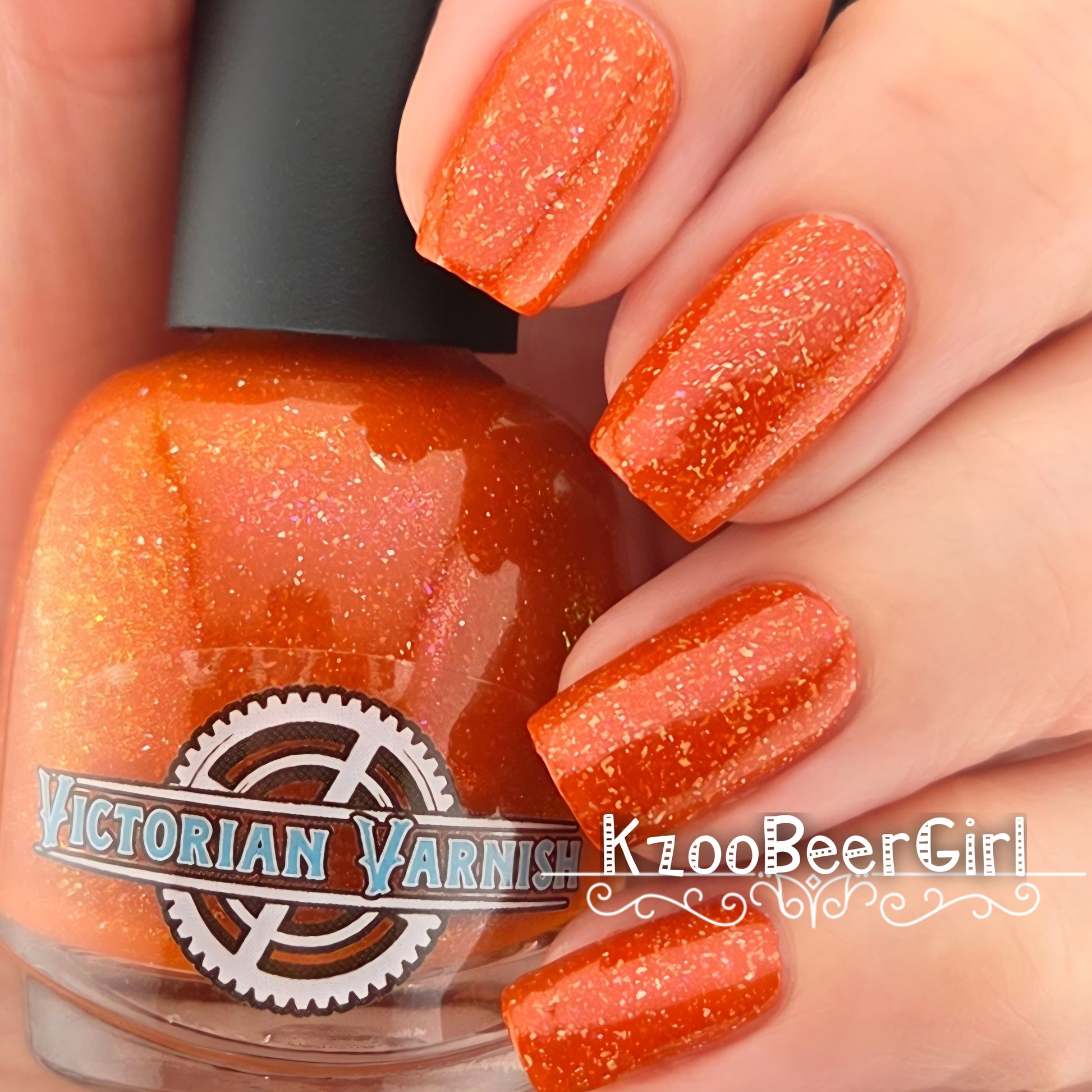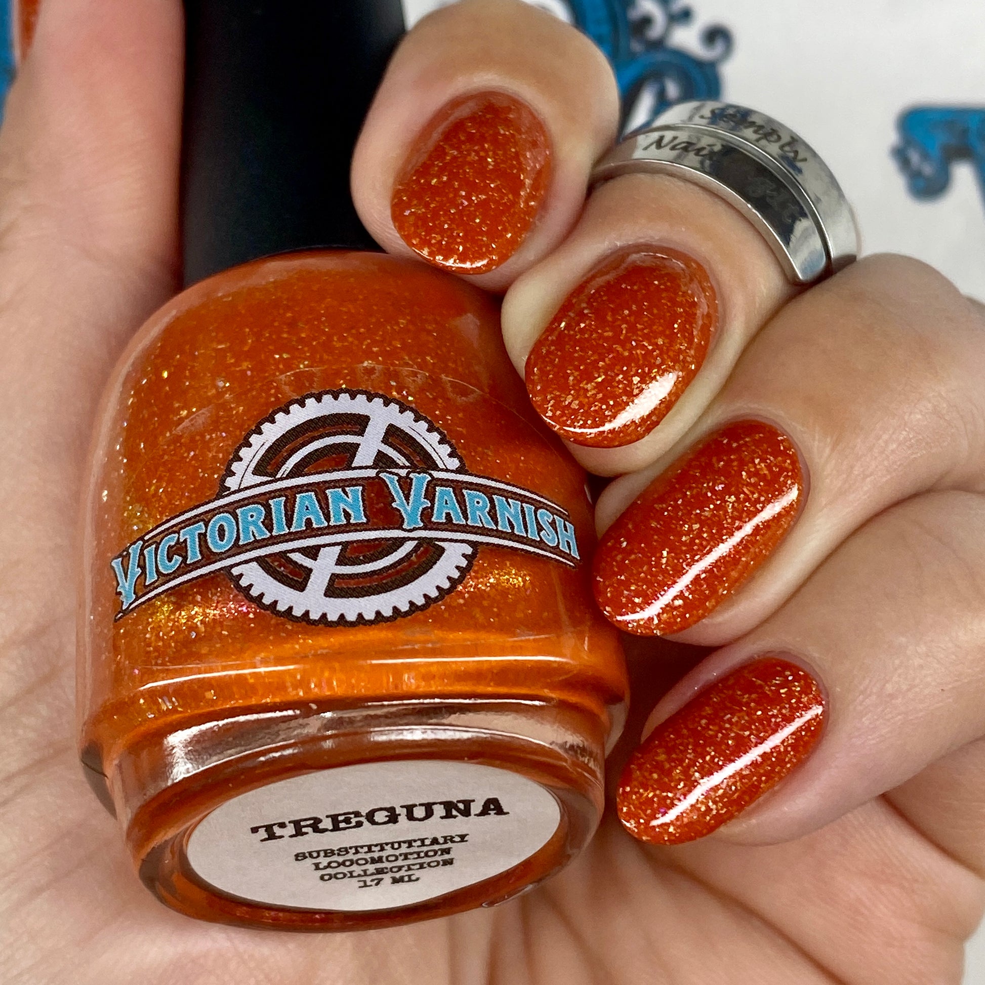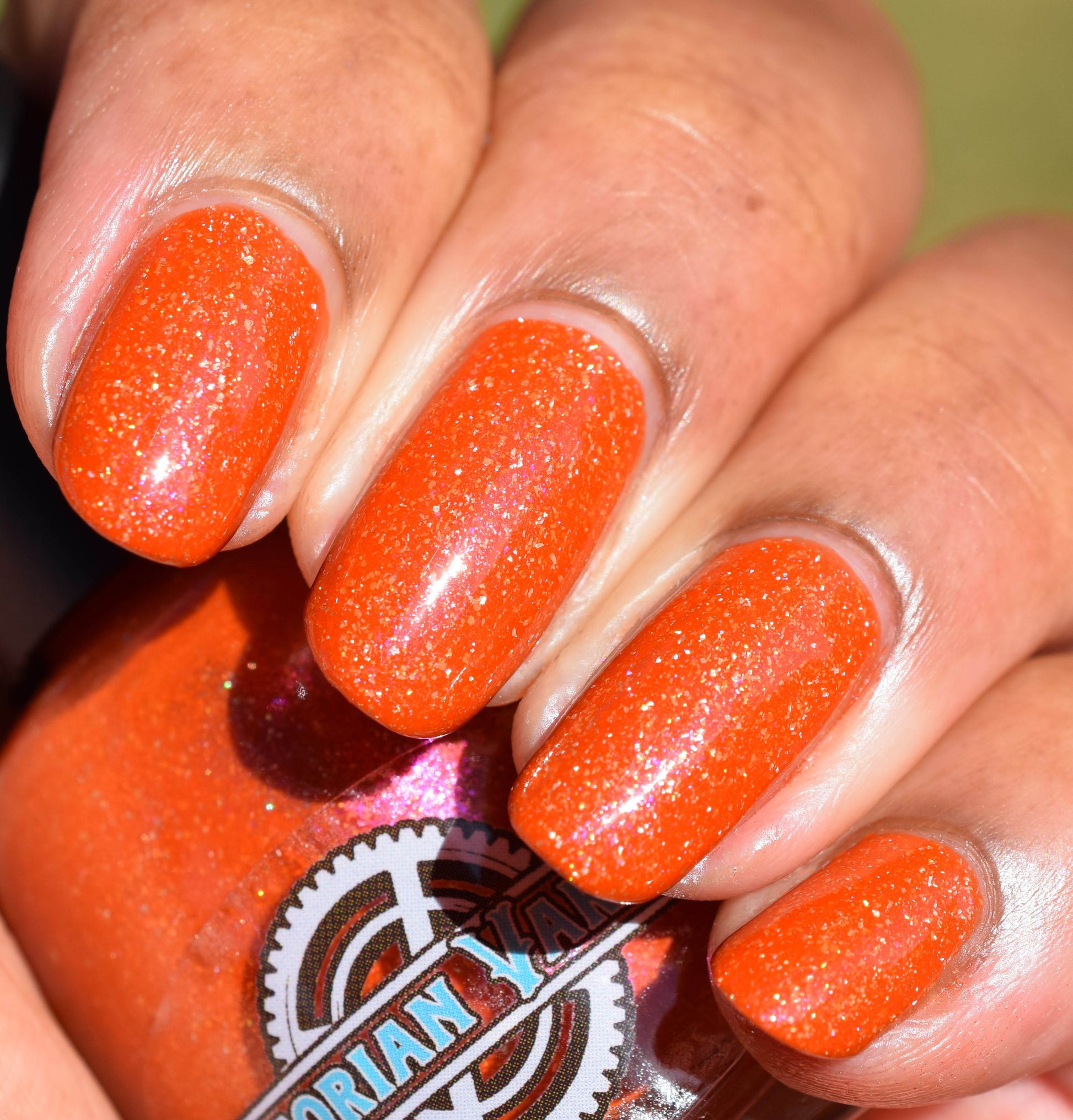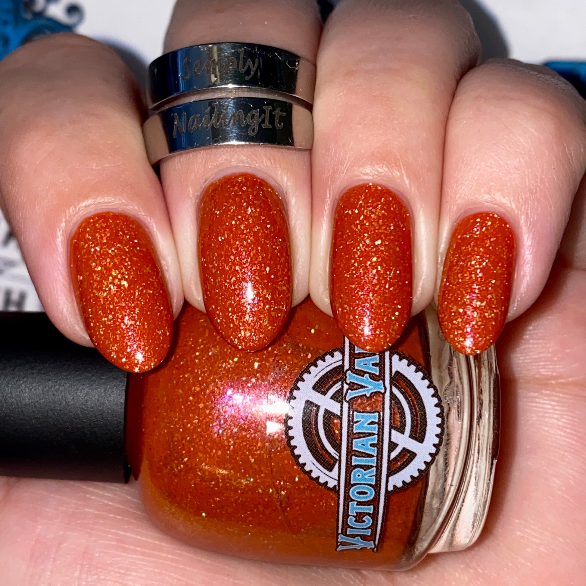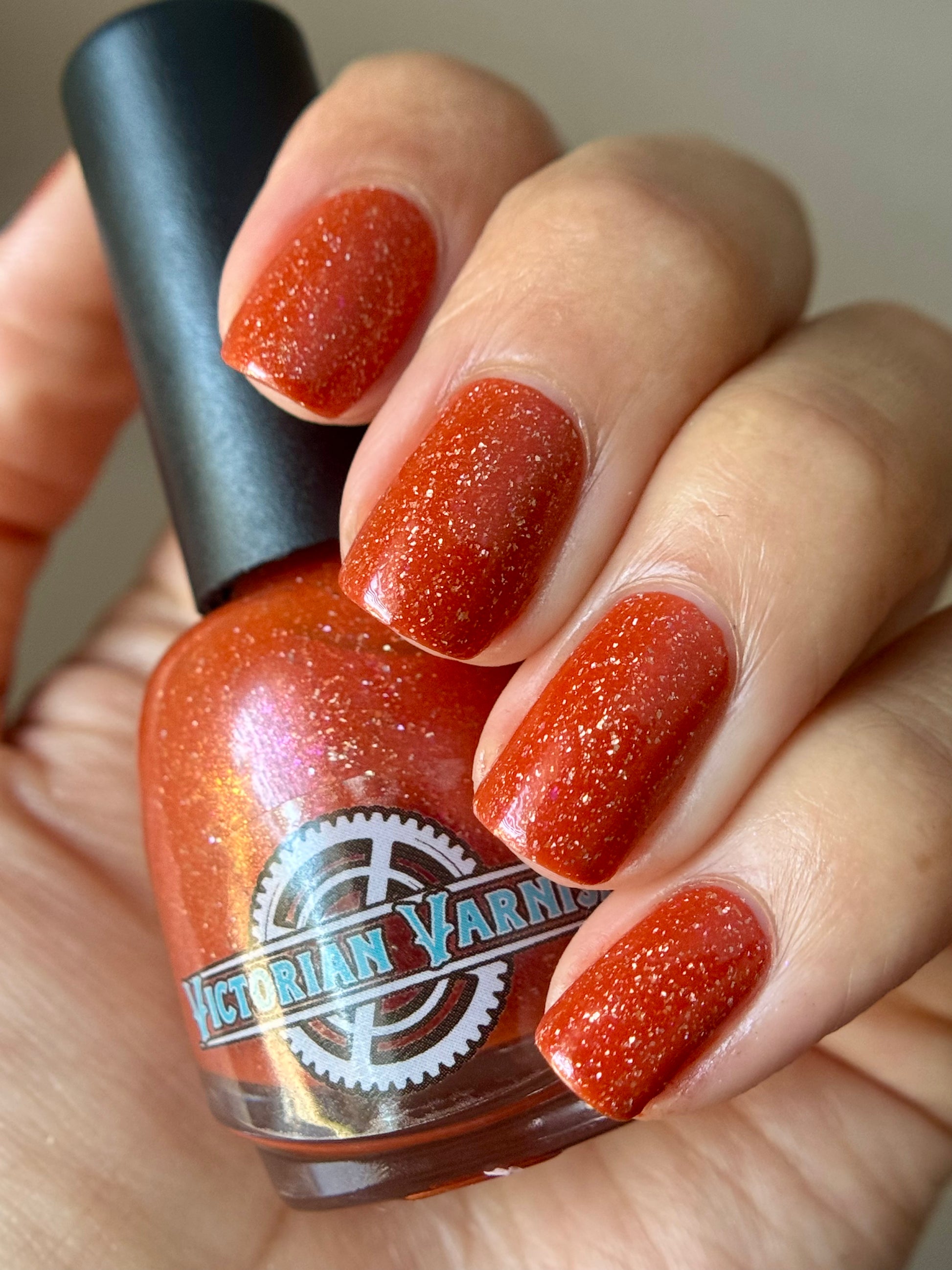 Treguna is a burnt sienna orange base with pink/gold large particle shimmers and loads of holo flakies