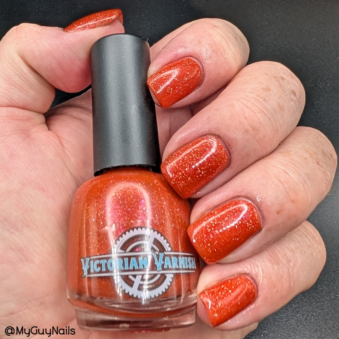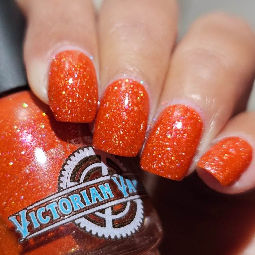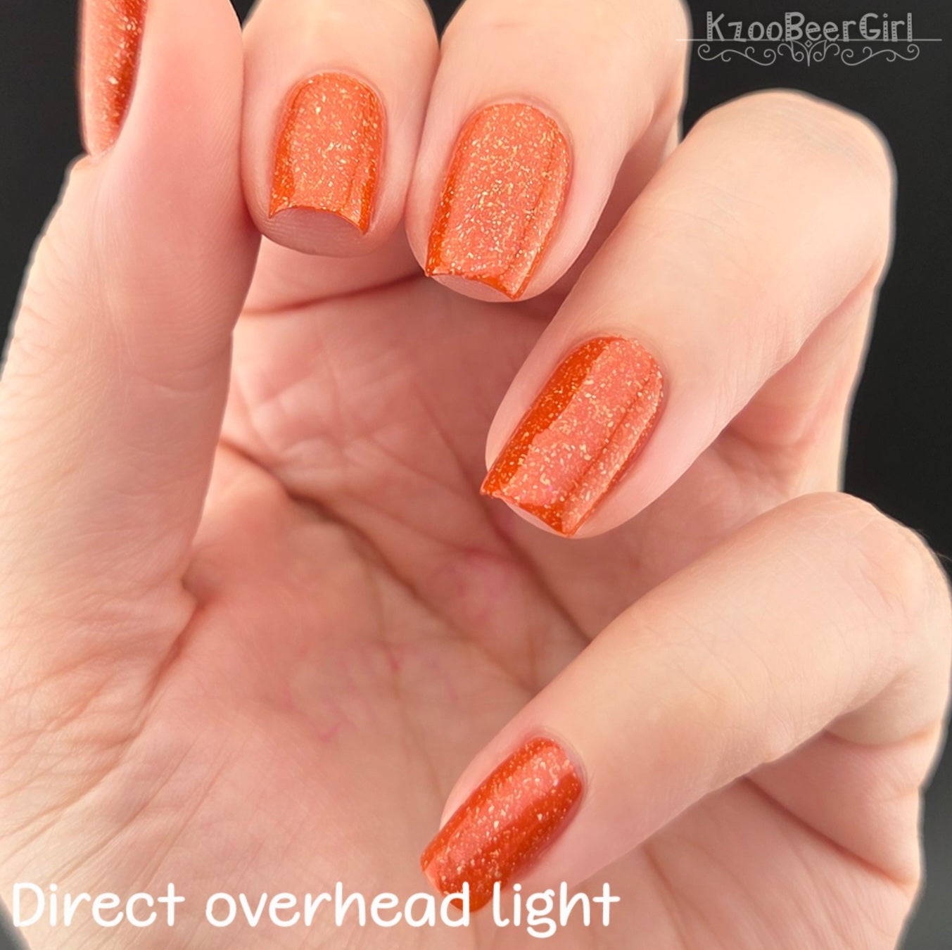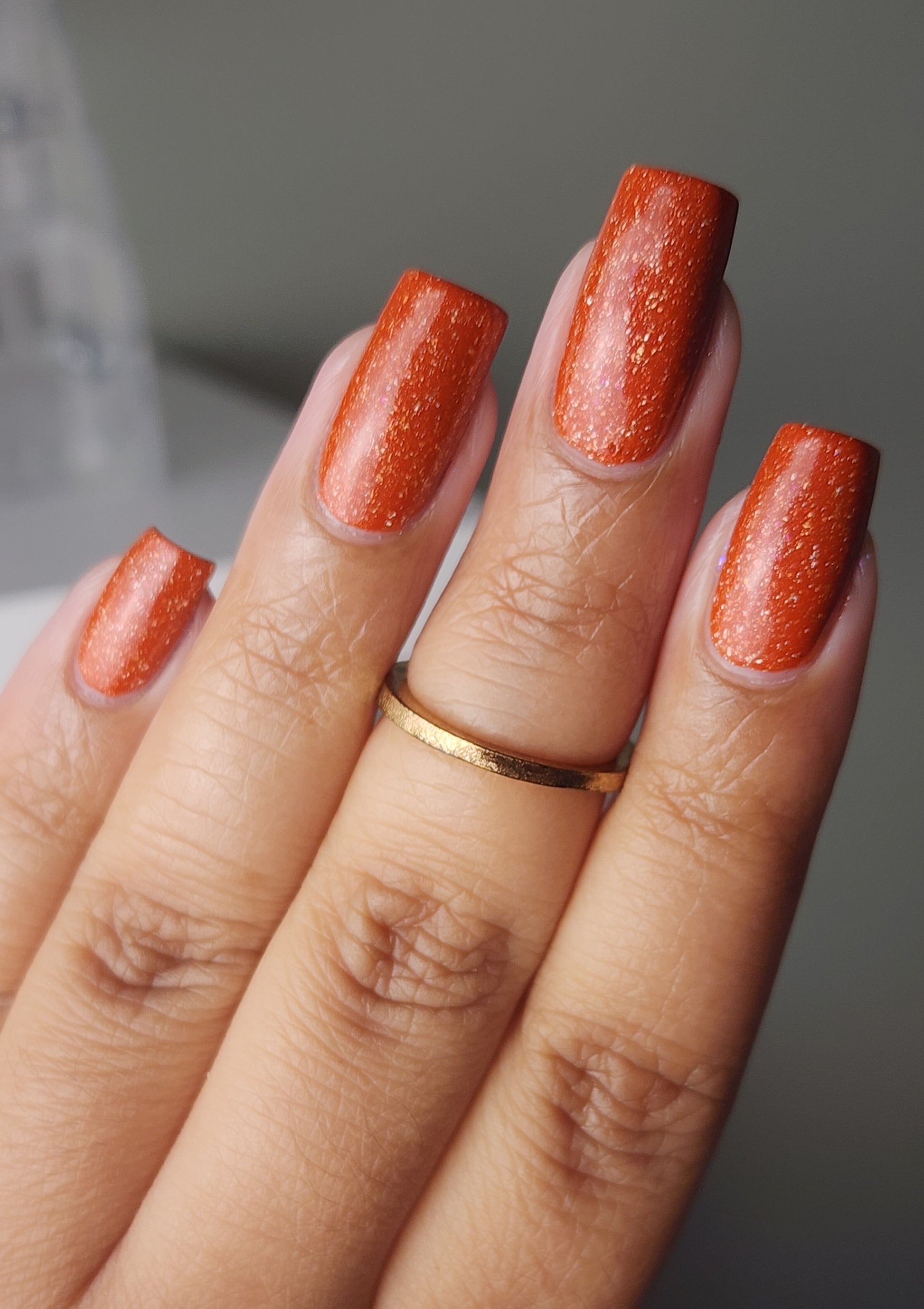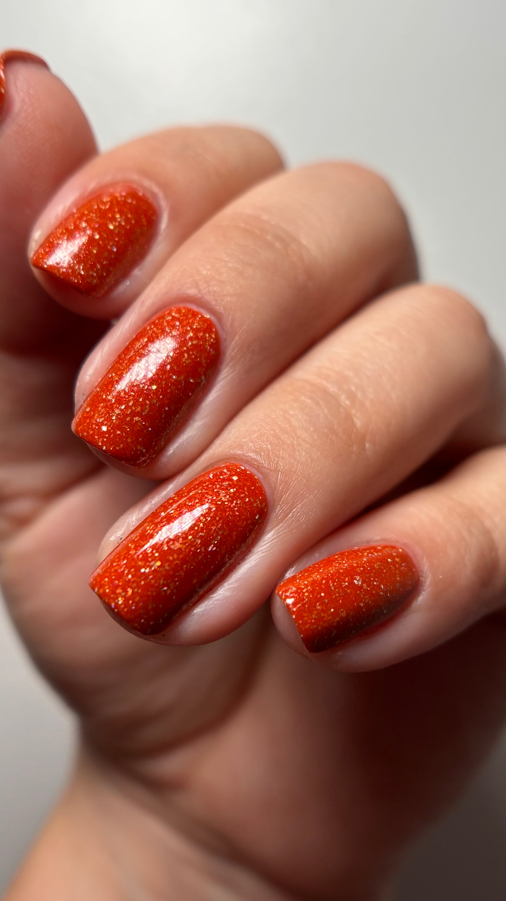 Treguna is a burnt sienna orange base with pink/gold large particle shimmers and loads of holo flakies