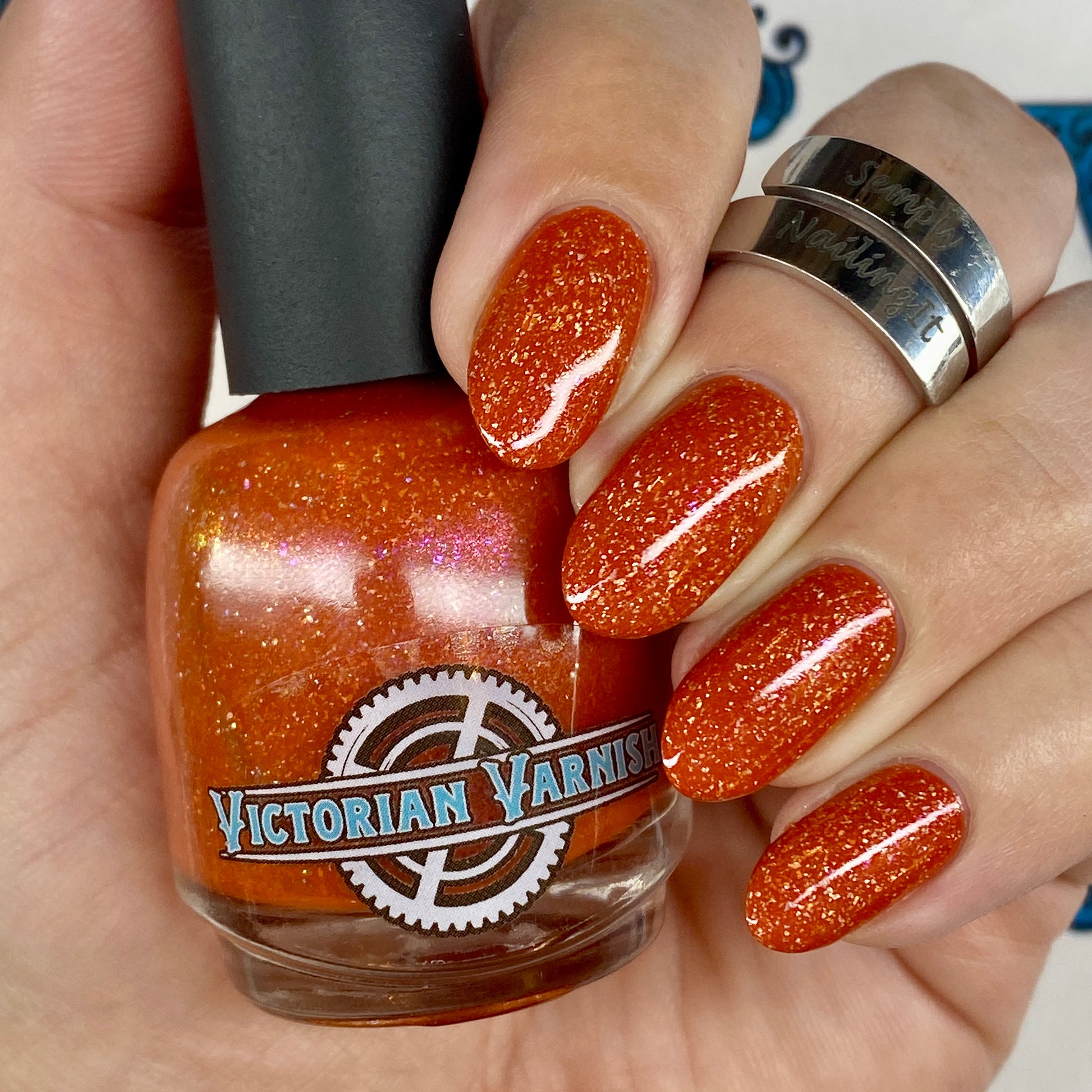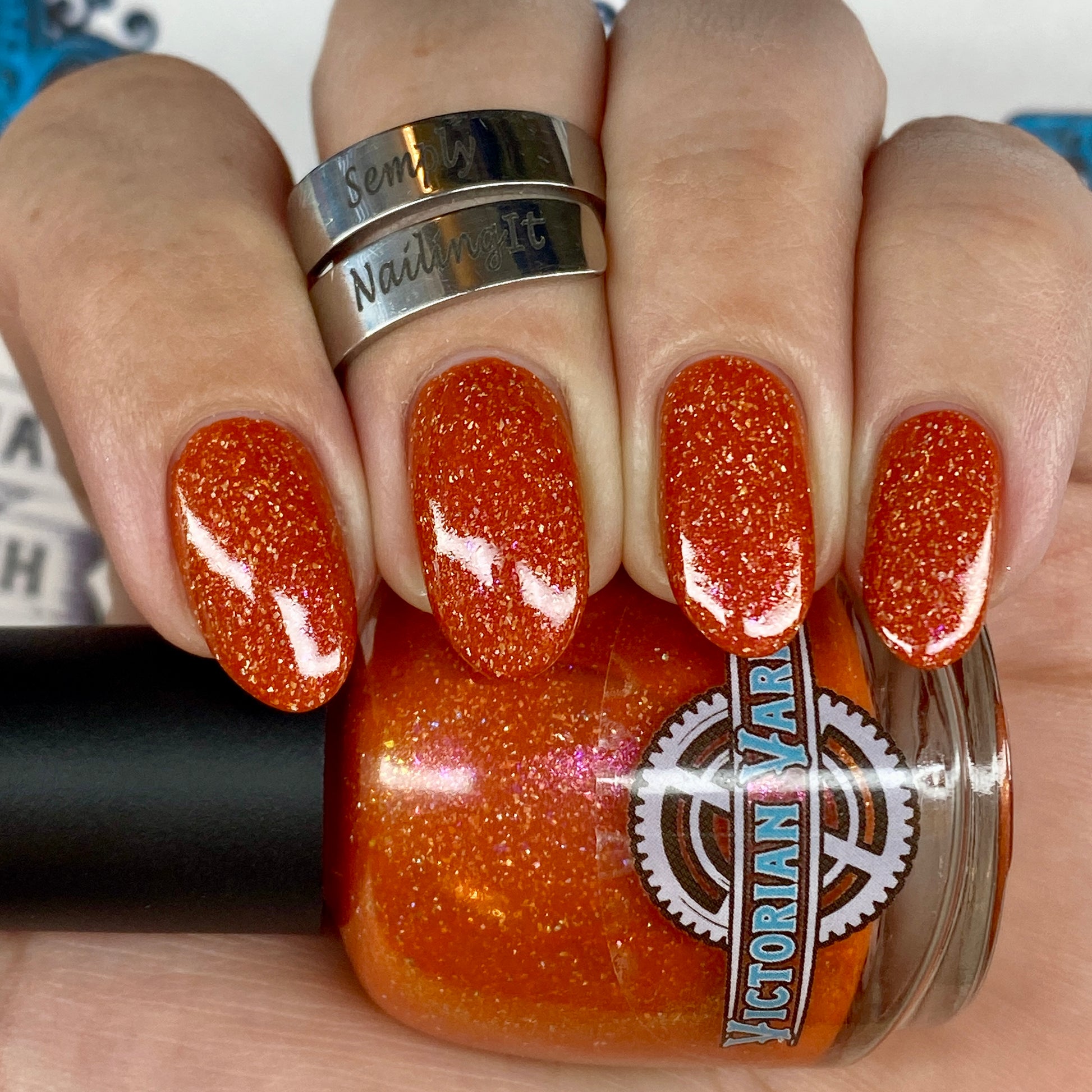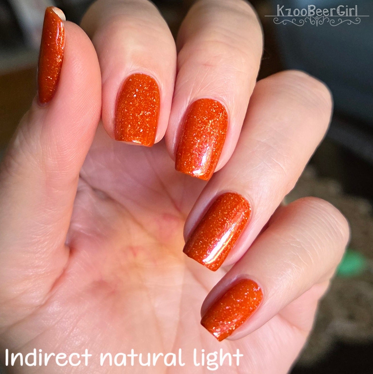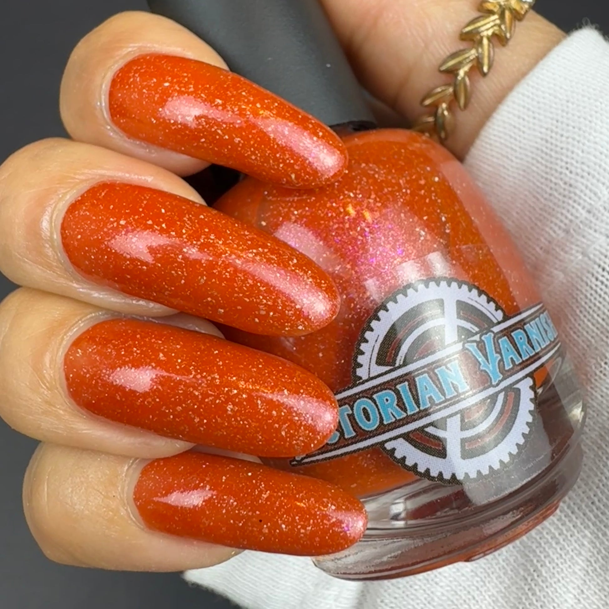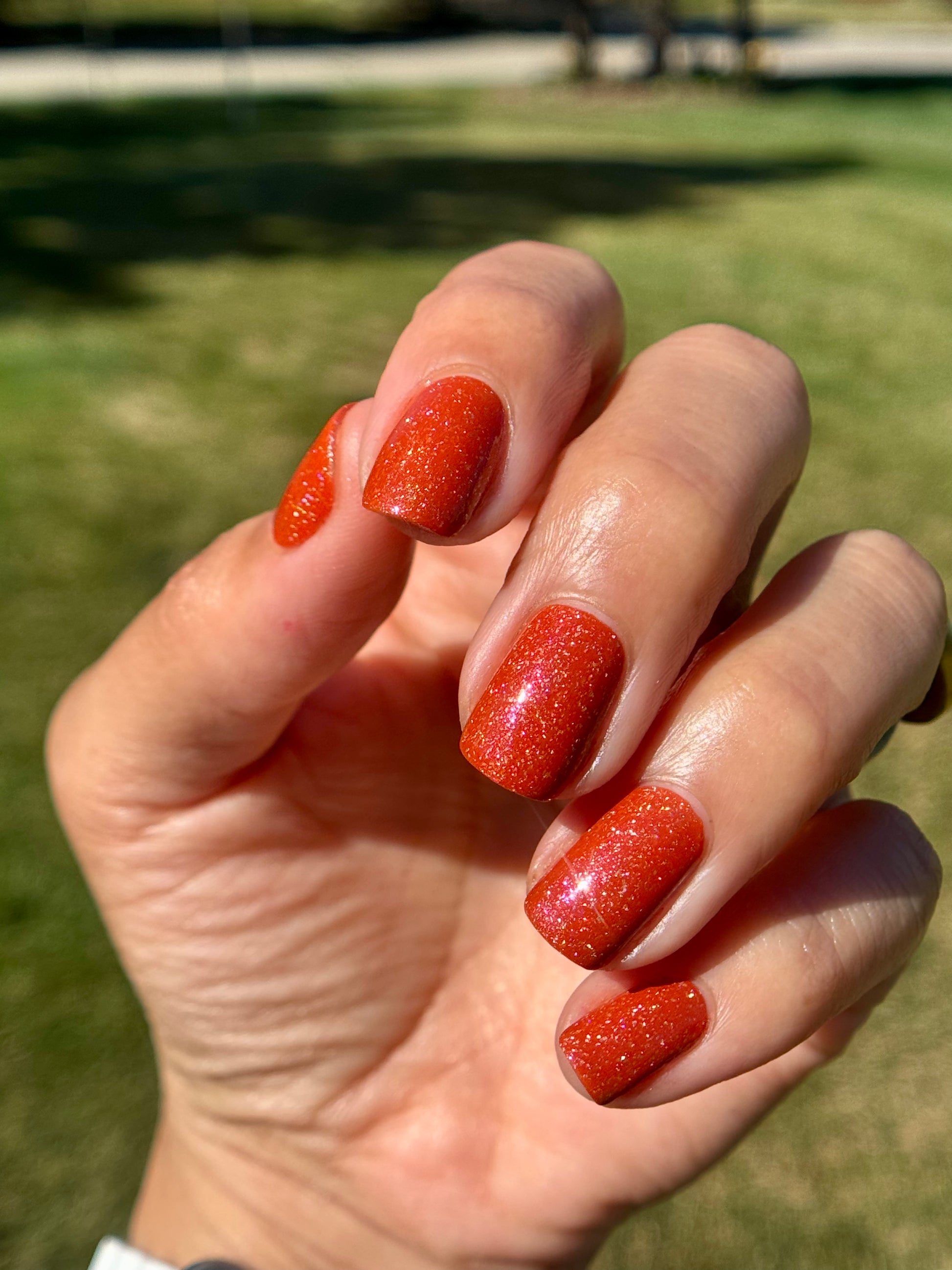 Treguna is a burnt sienna orange base with pink/gold large particle shimmers and loads of holo flakies