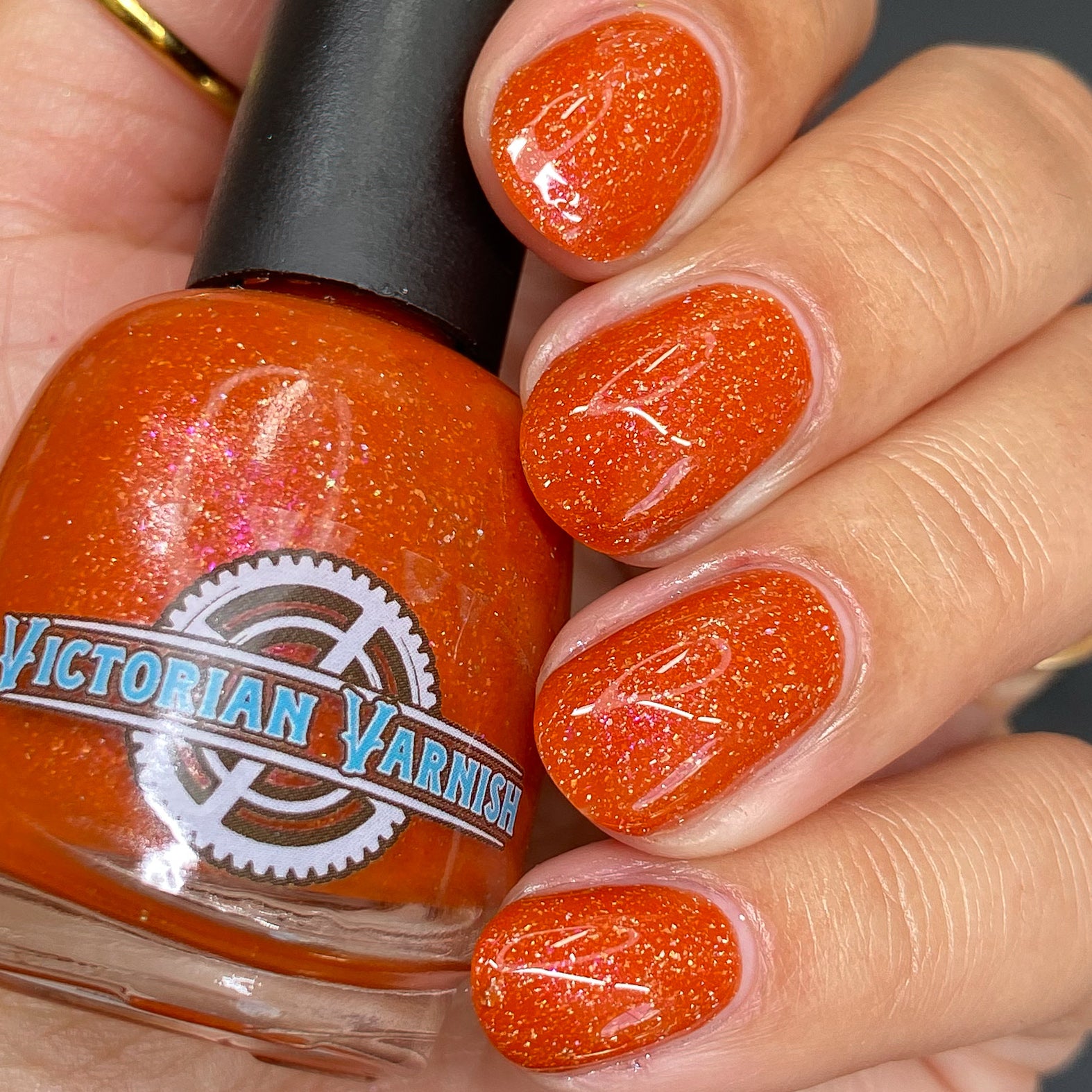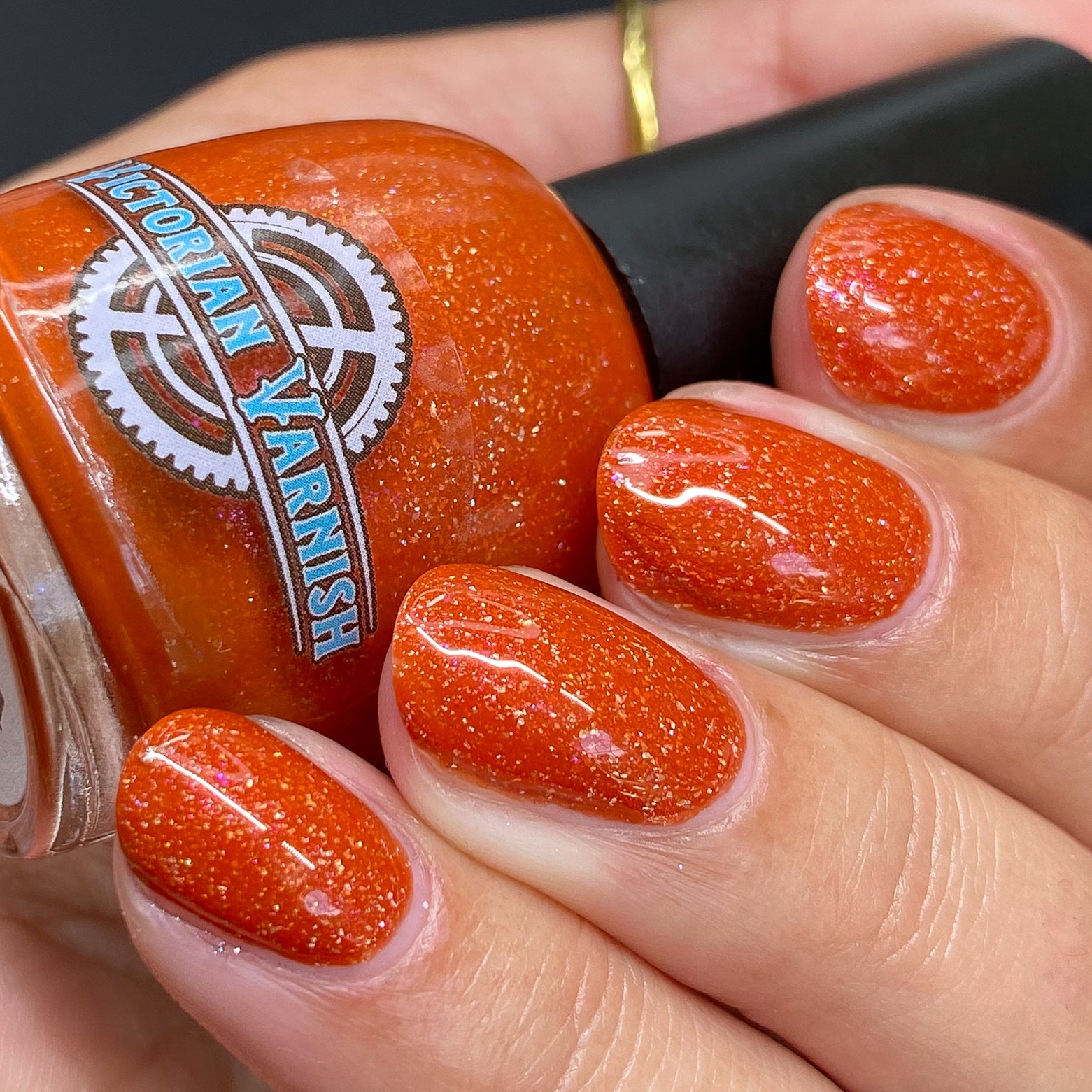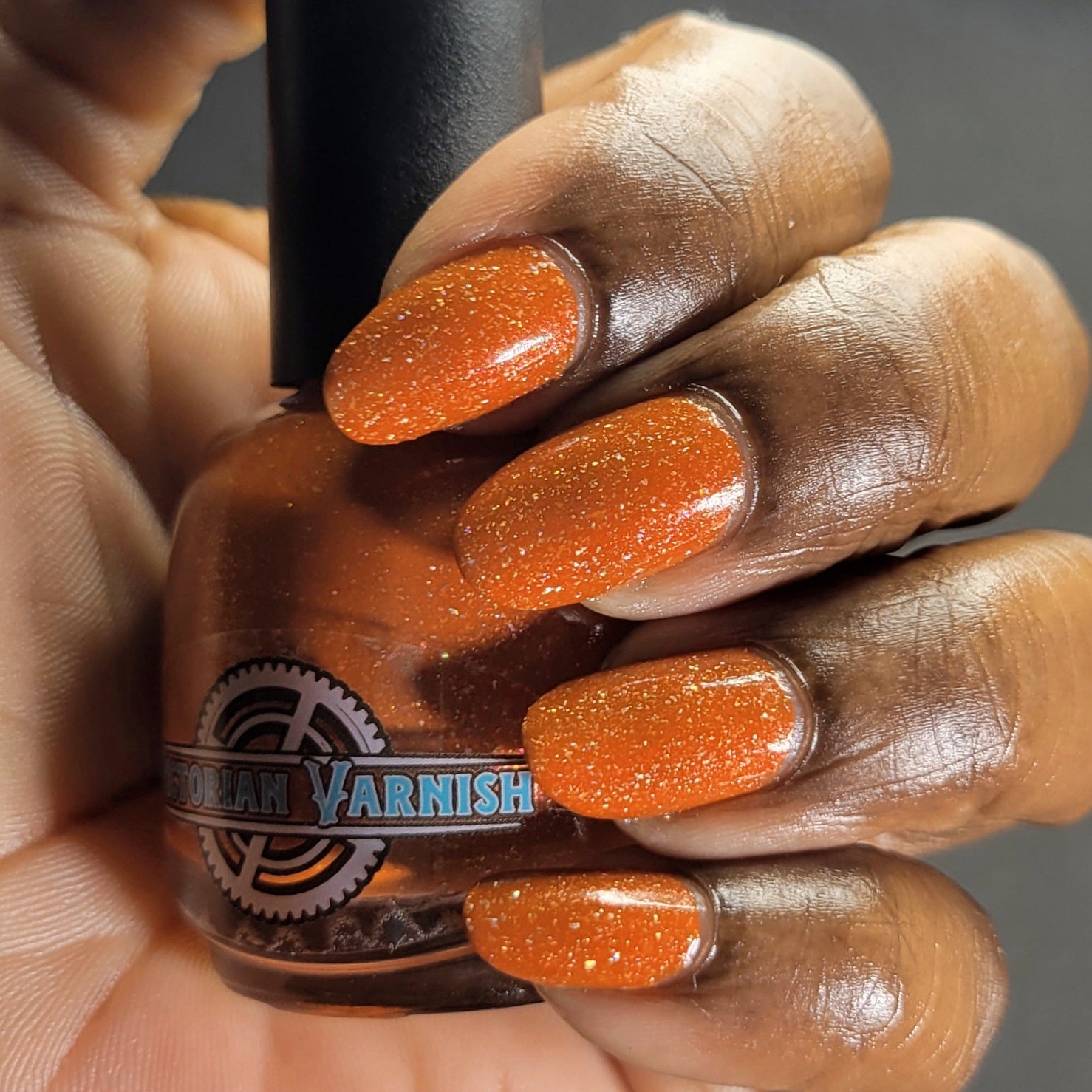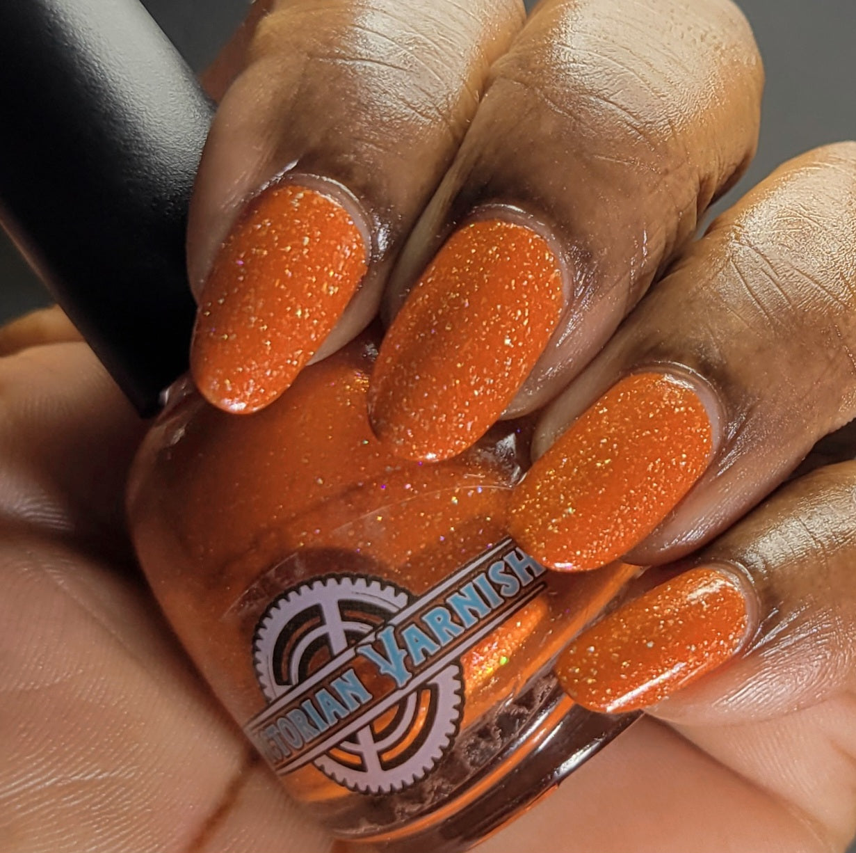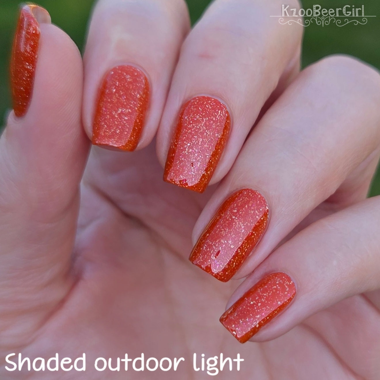 Treguna is a burnt sienna orange base with pink/gold large particle shimmers and loads of holo flakies