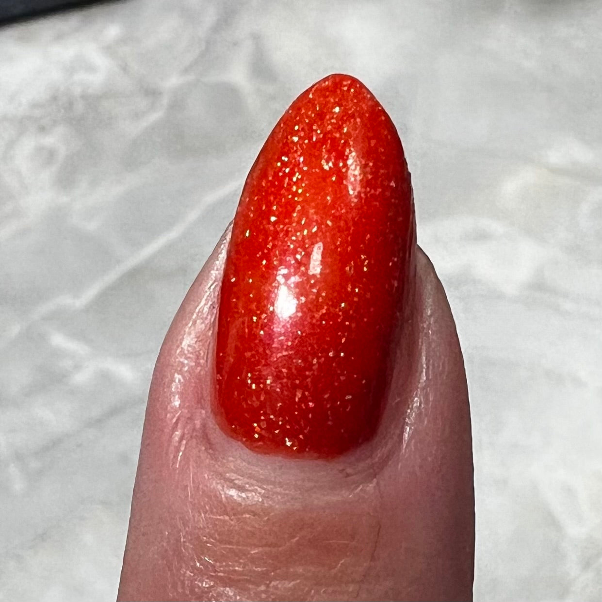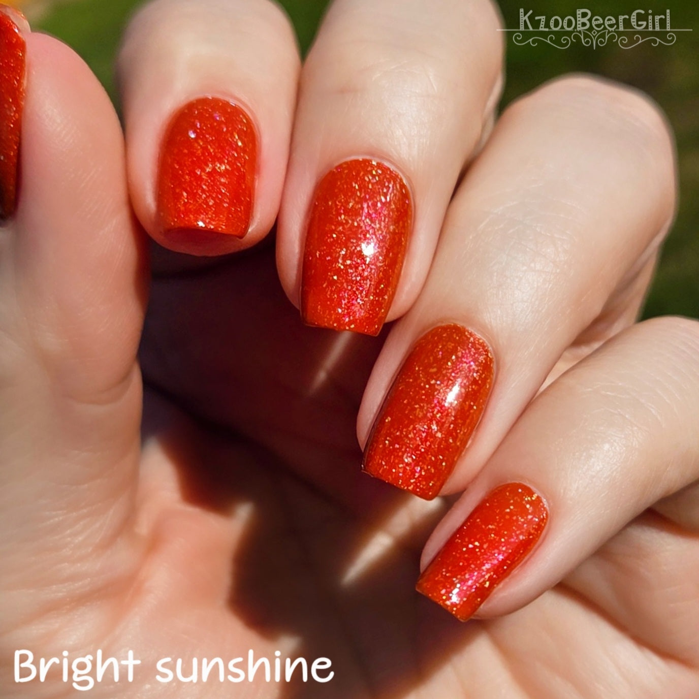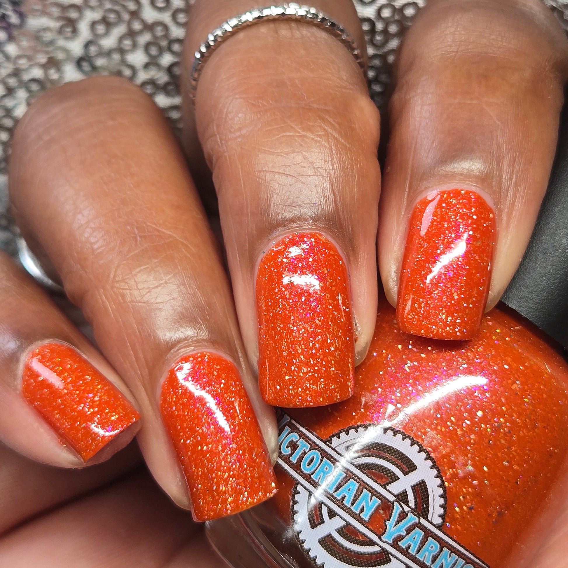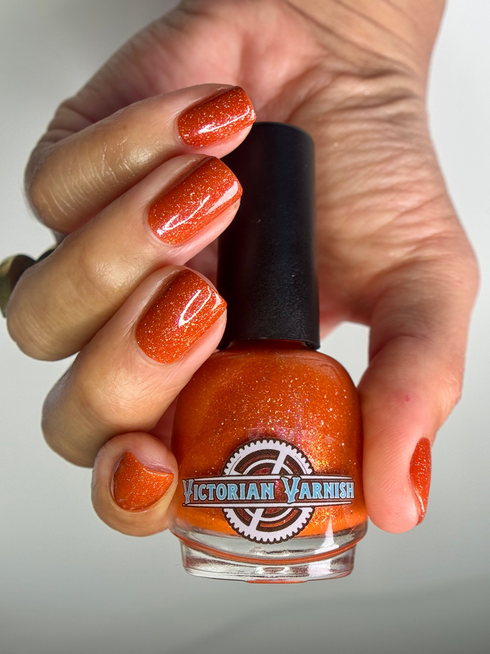 Treguna is a burnt sienna orange base with pink/gold large particle shimmers and loads of holo flakies