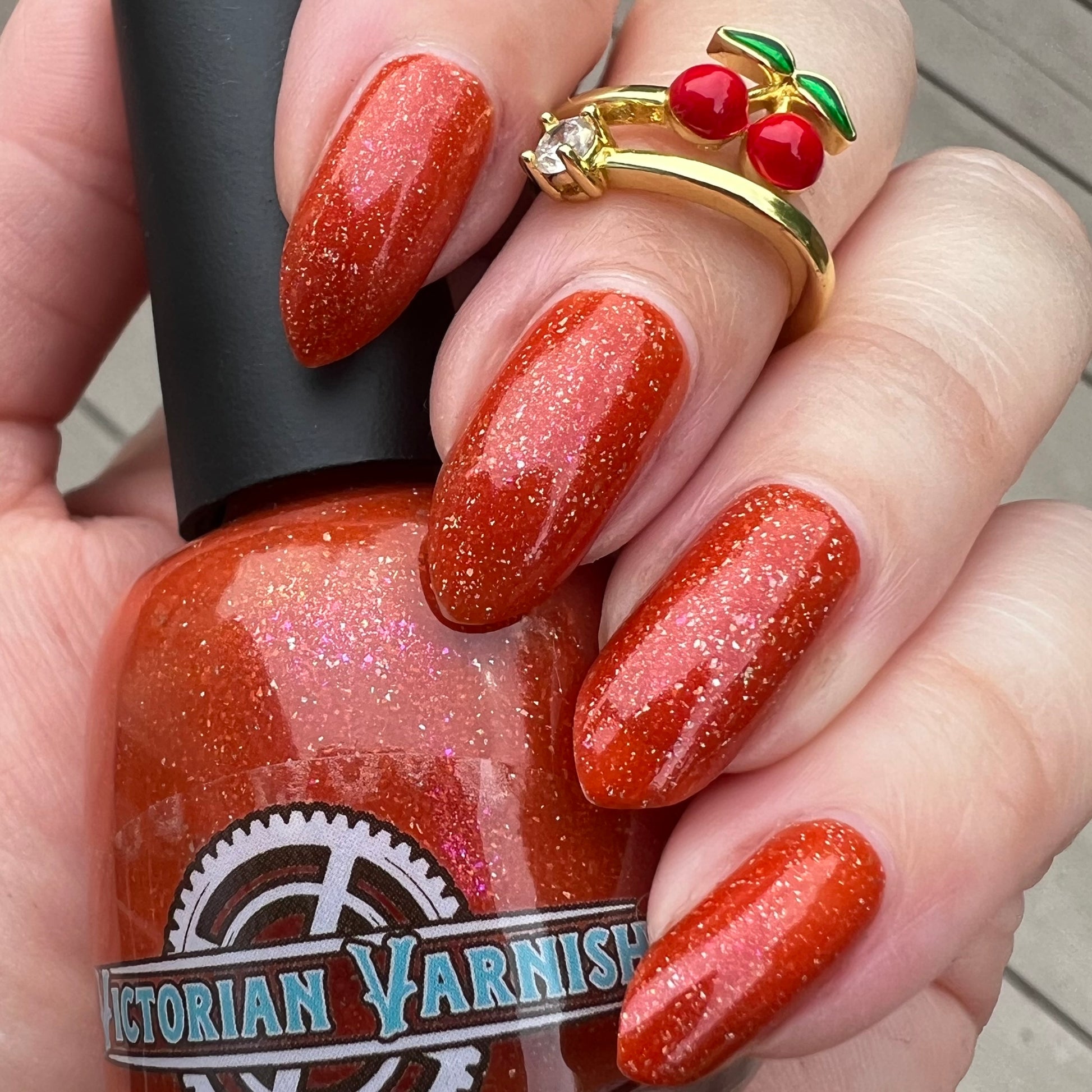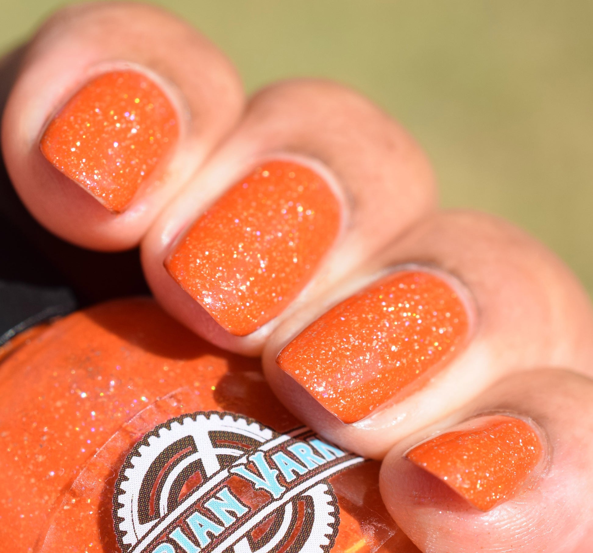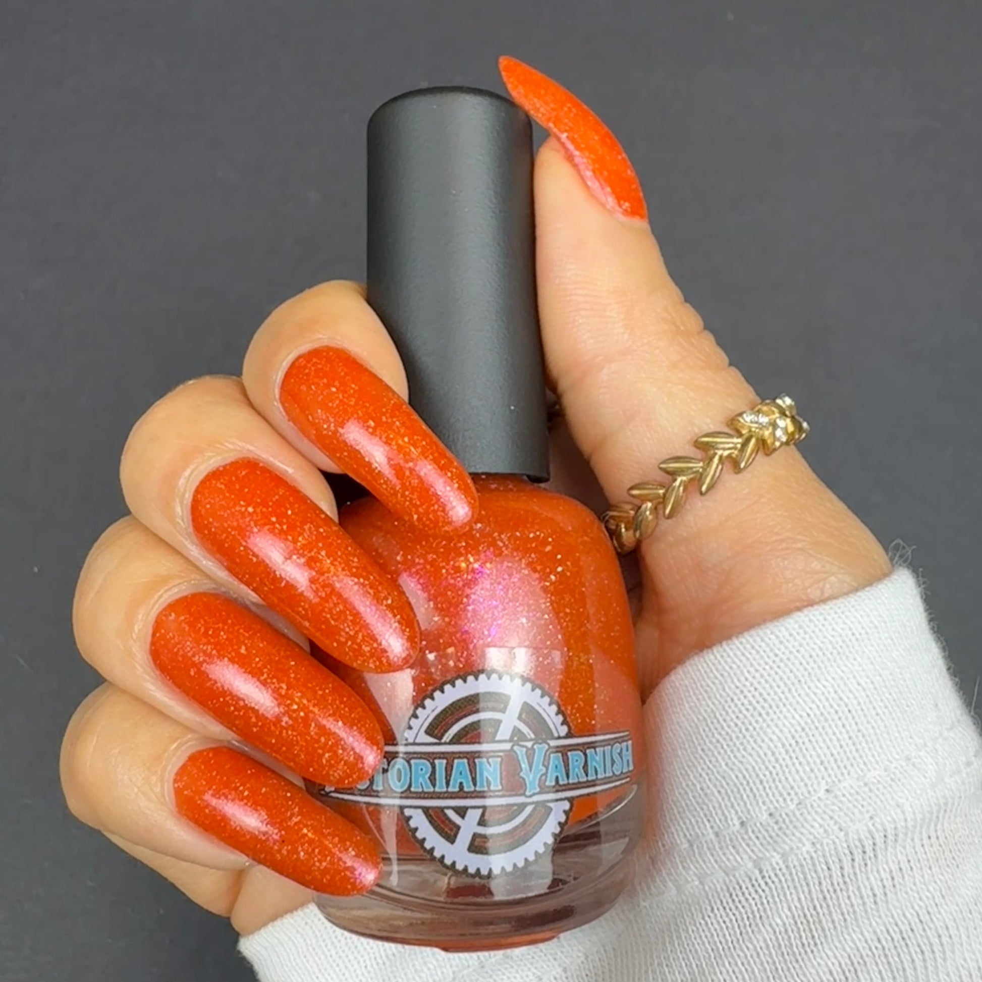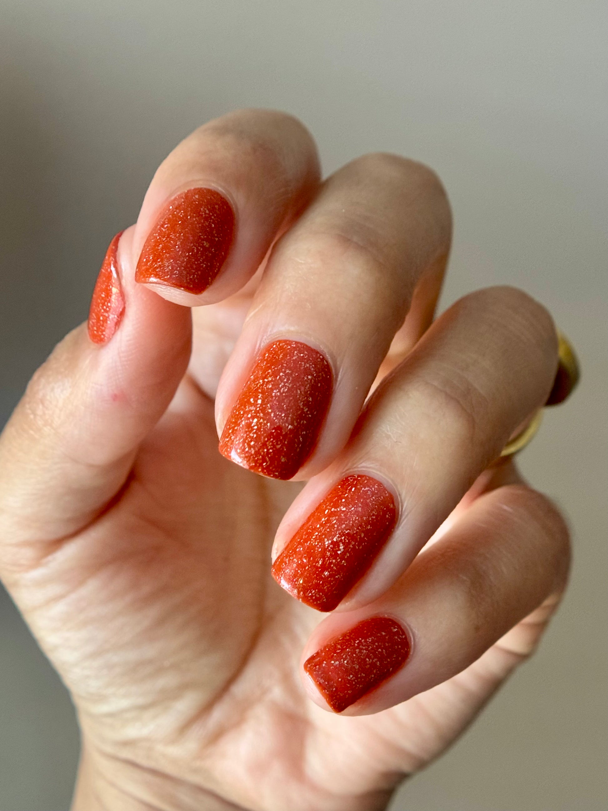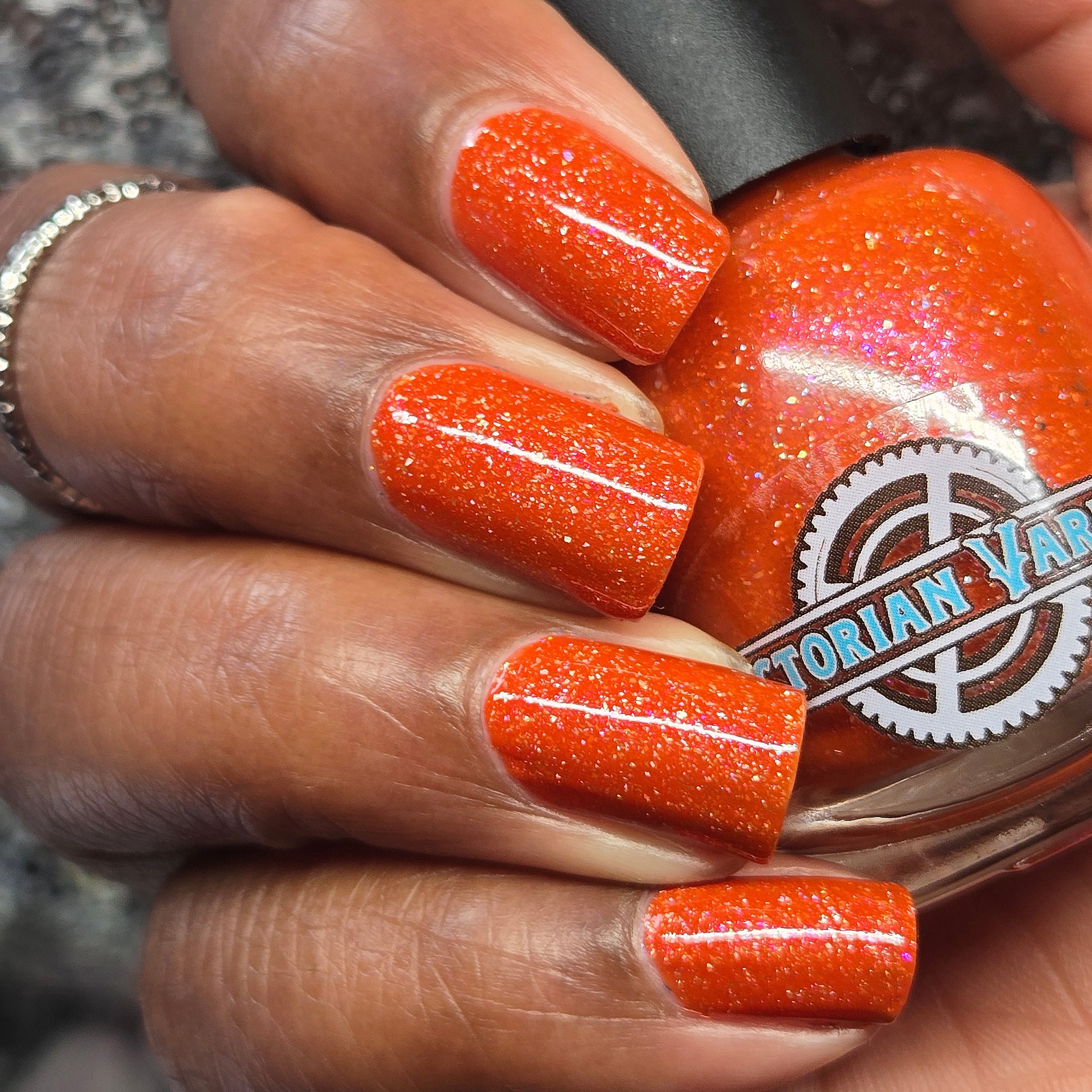 Treguna is a burnt sienna orange base with pink/gold large particle shimmers and loads of holo flakies