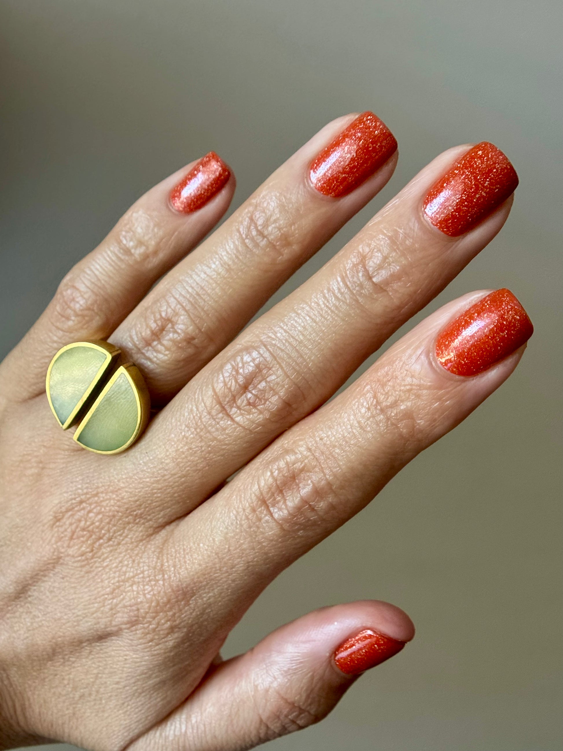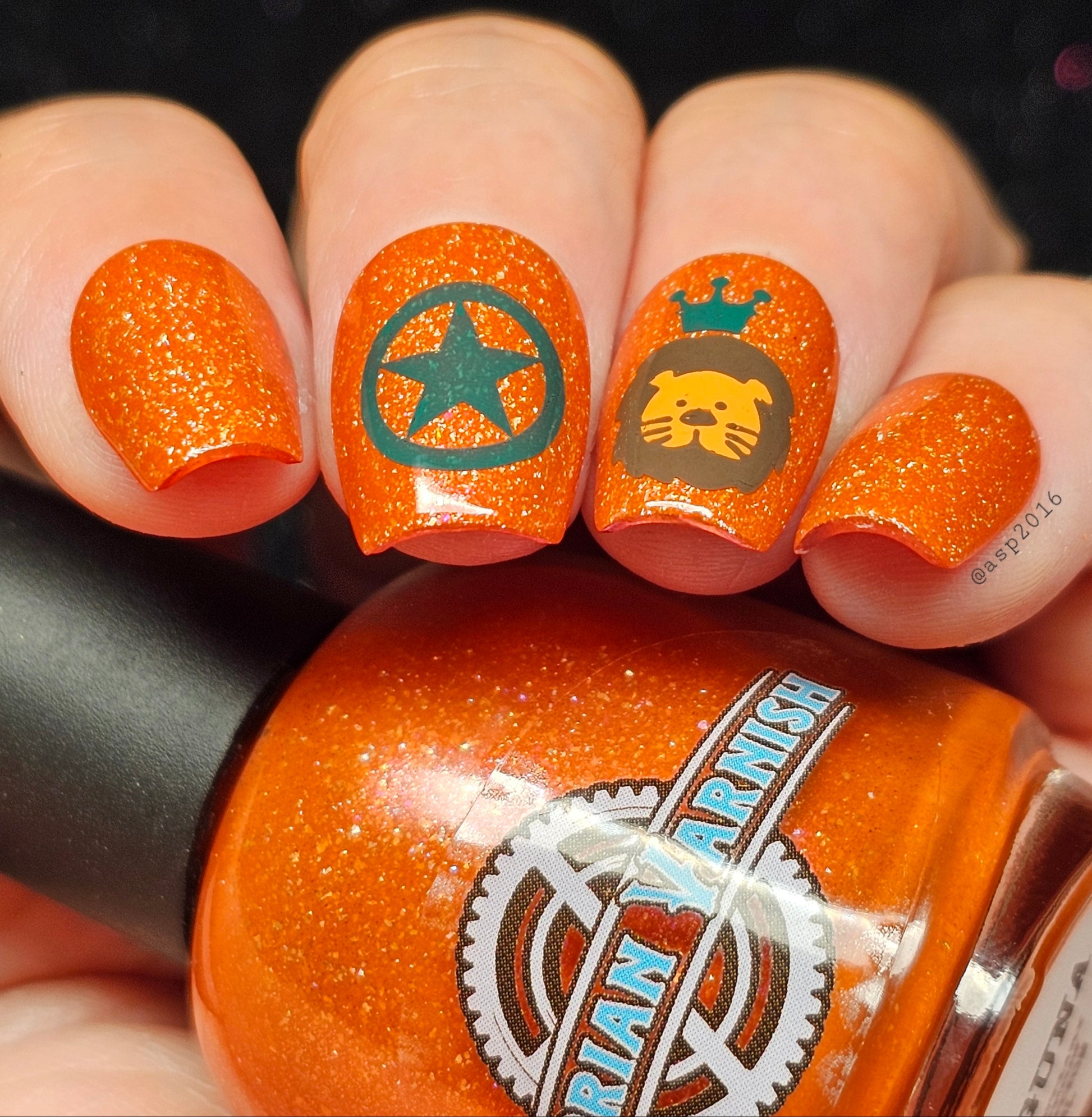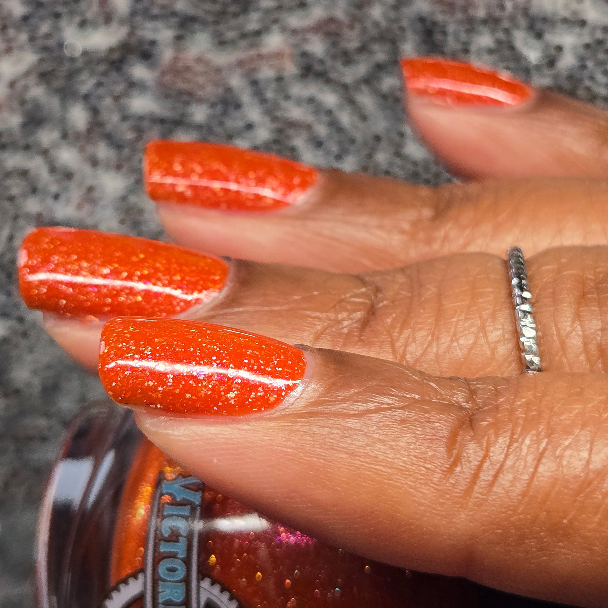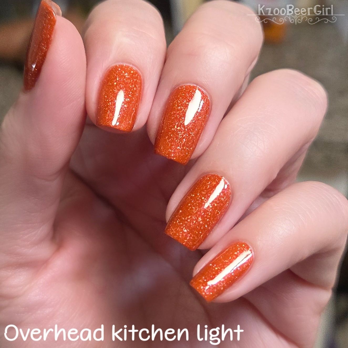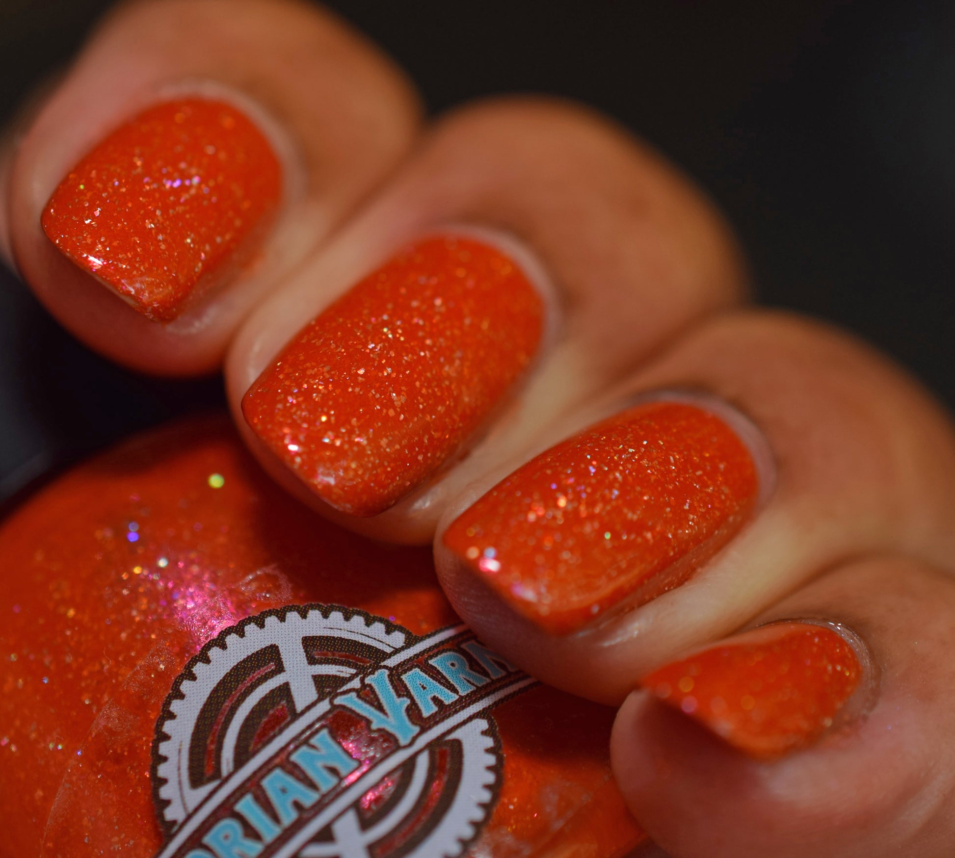 Treguna is a burnt sienna orange base with pink/gold large particle shimmers and loads of holo flakies