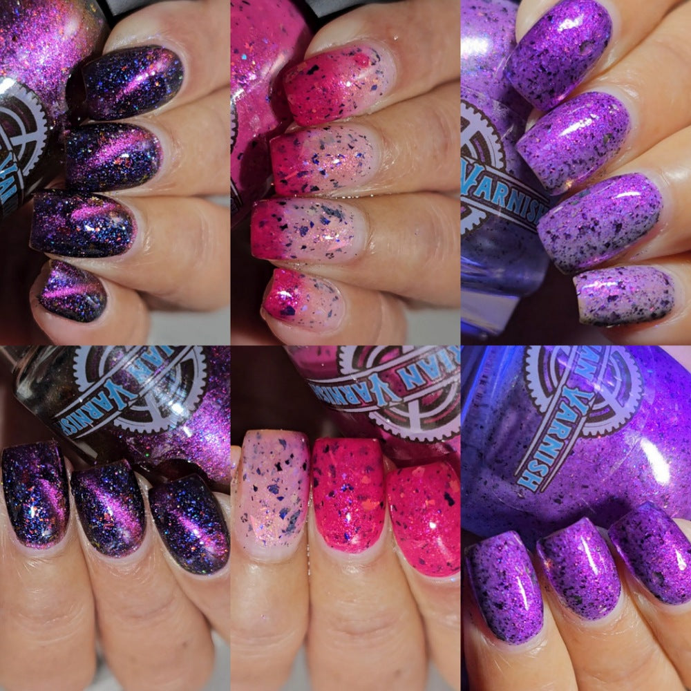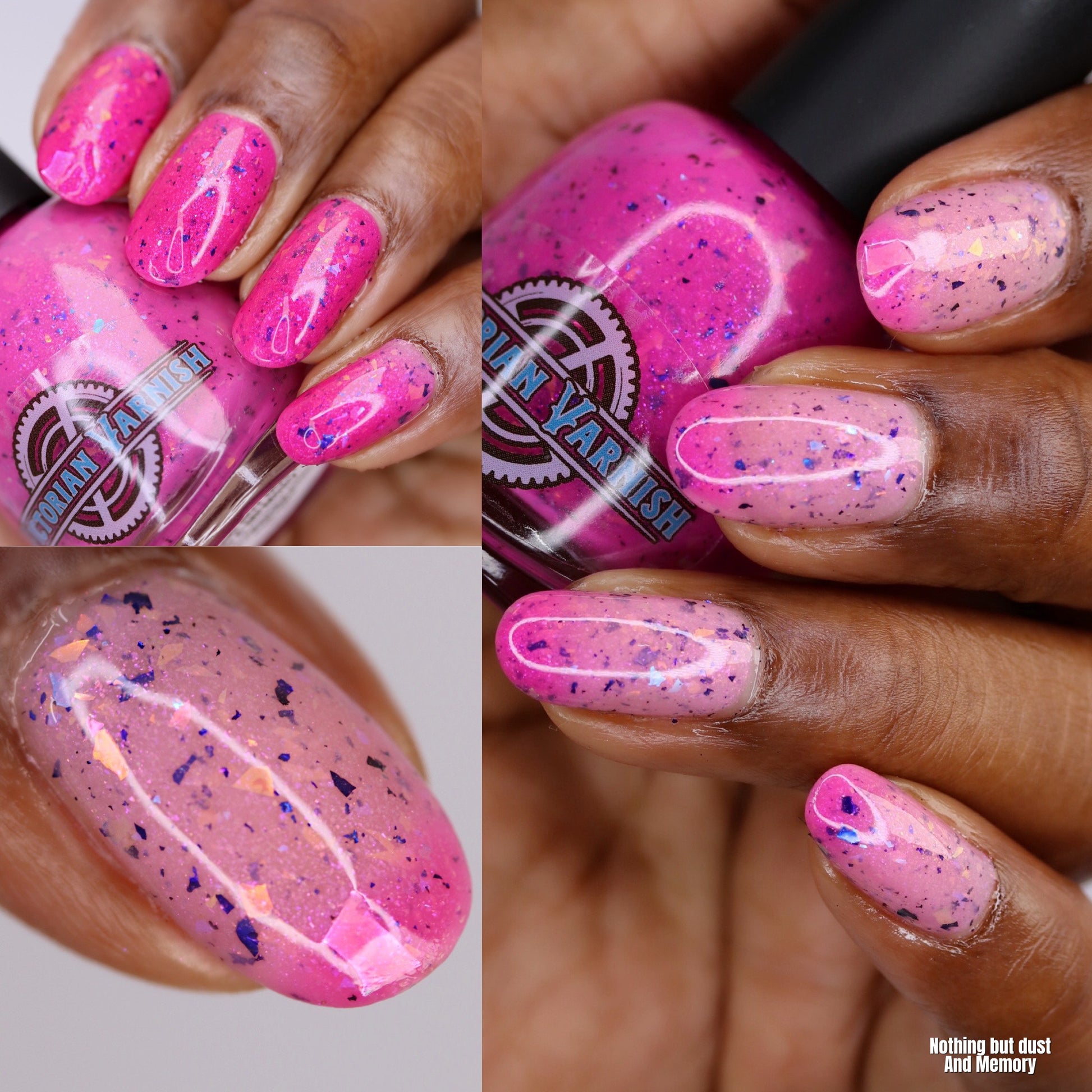 NOTHING BUT DUST AND A MEMORY (Thermal) - a bright magenta (cold state) to clear (warm state) with a small smattering of pink/purple large particle shimmer and IGP flakies in blue to black multichrome flakies, and a host of rainbow ghost flakies. Pair with our Silk Stockings basecoat for a truly magical mani in the dual state.