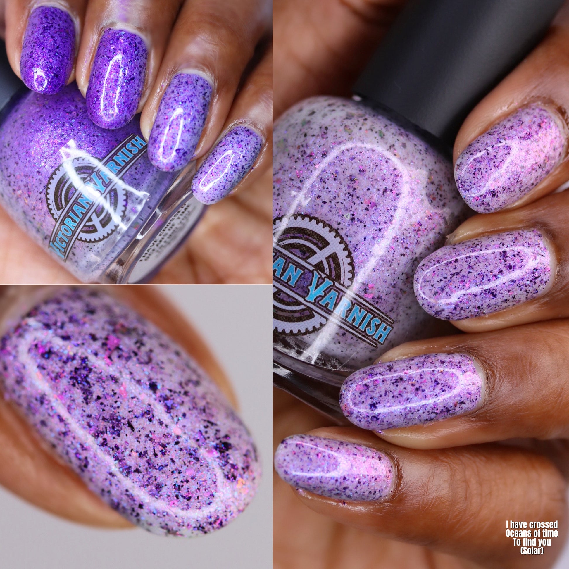 I HAVE CROSSED OCEANS OF TIME TO FIND YOU (Solar) - a sheer light grey base (indoors) to a bright purple (outdoors/UV light)with an intense amount of violet/red shimmer paired with a scattered tiny particle blue shimmer with black micro flakes and ghost flakies