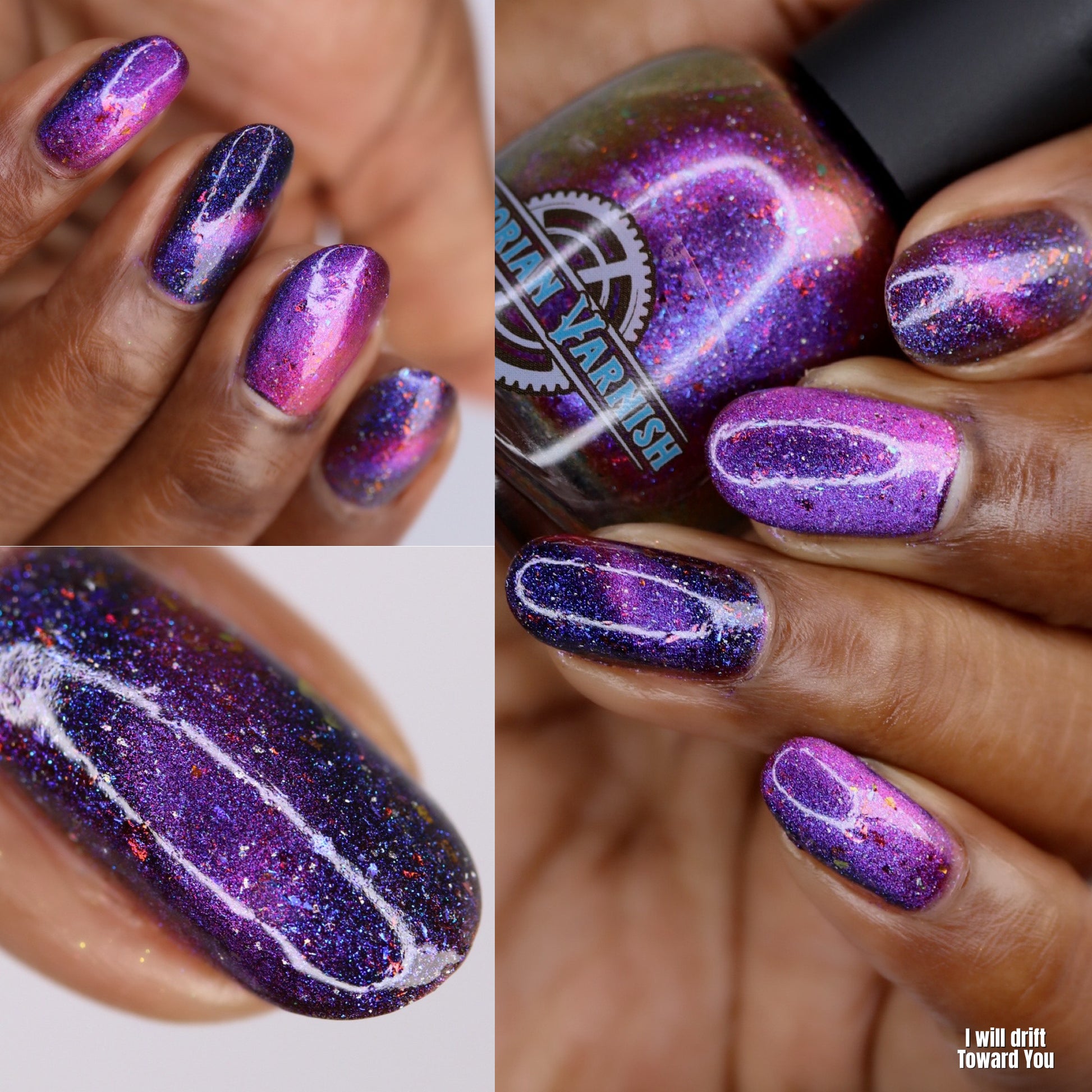I WILL DRIFT TOWARD YOU (Magnetic) a pink/purple/peach/bronze magnetic that once magnetized reveals a deep blue large particle shimmer with UCC and ghost flakies and scattered holo flakes