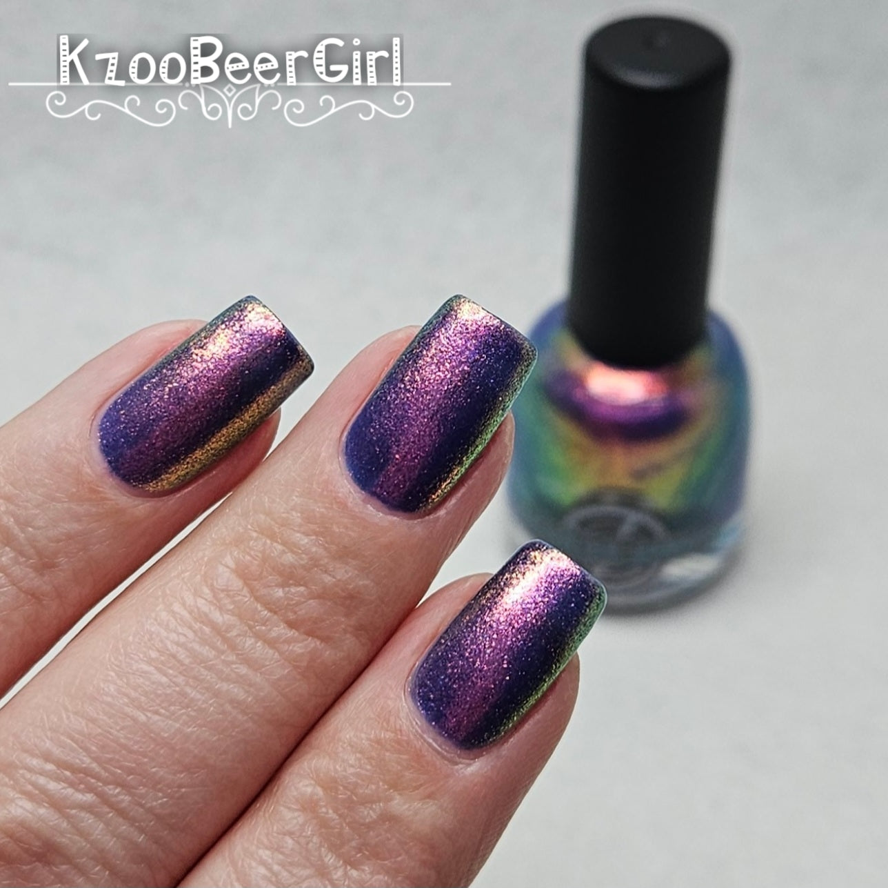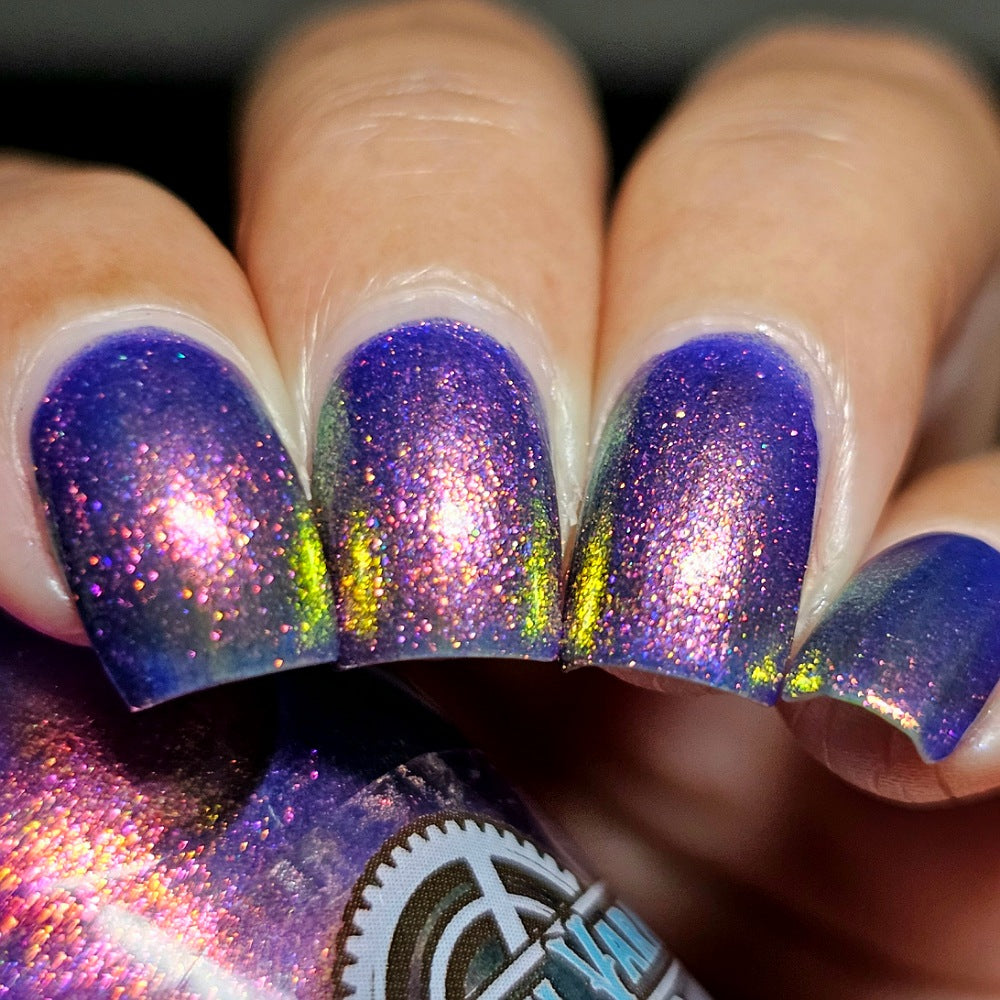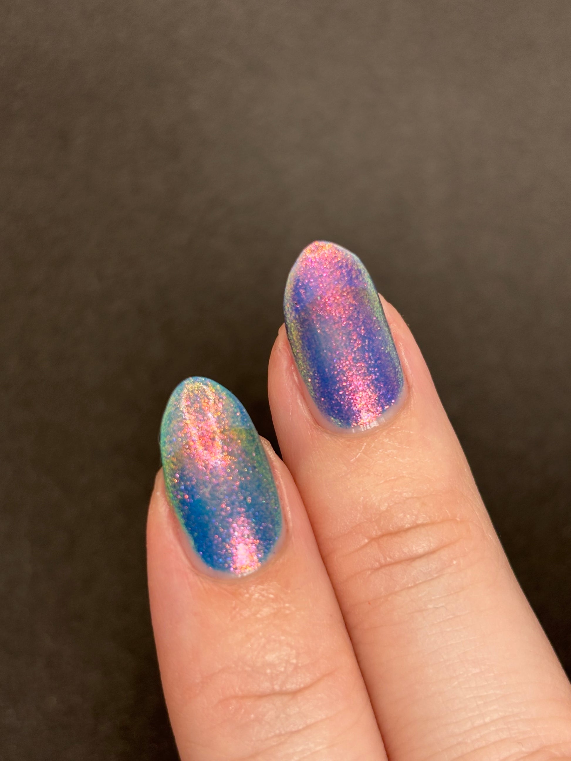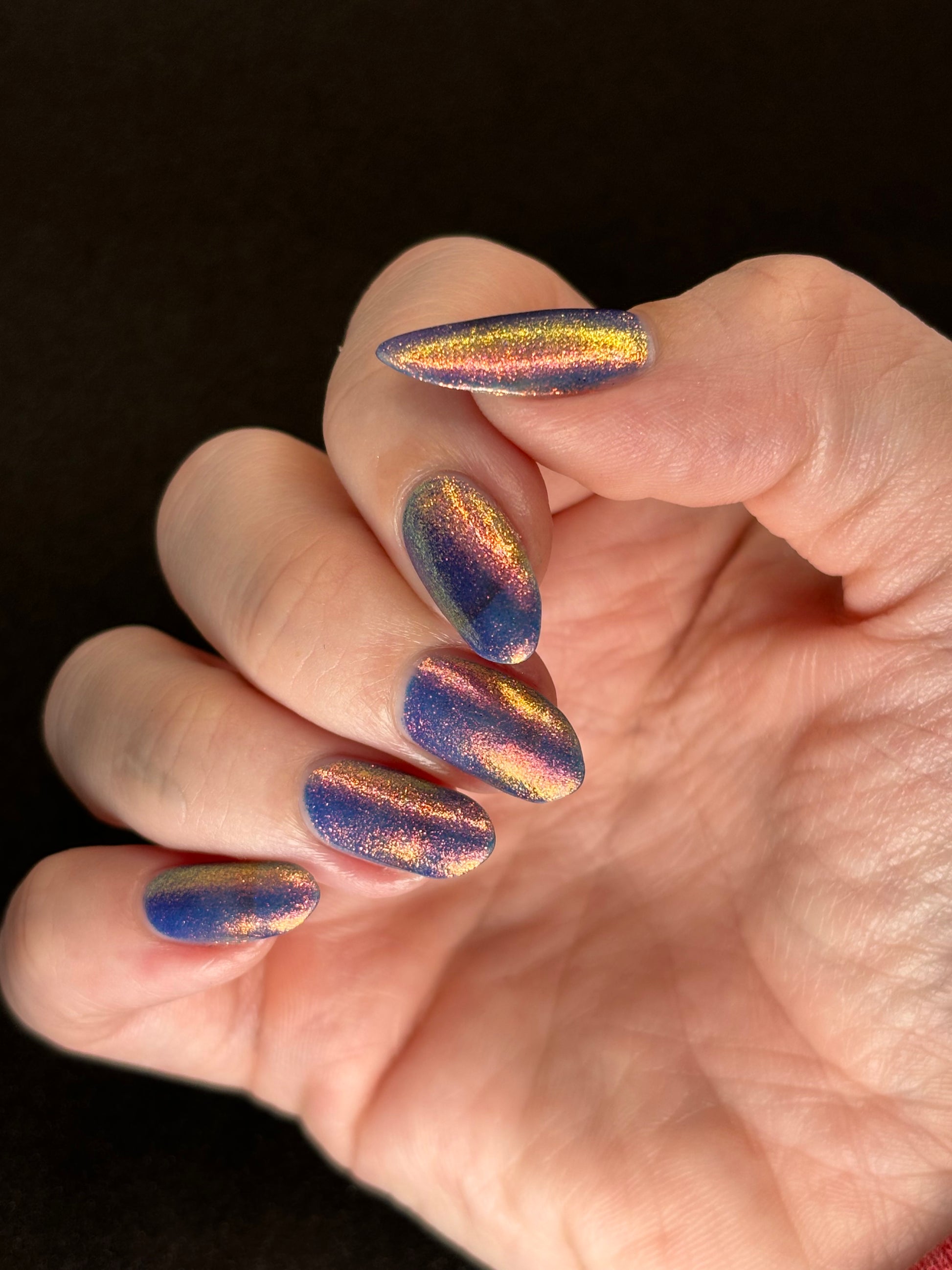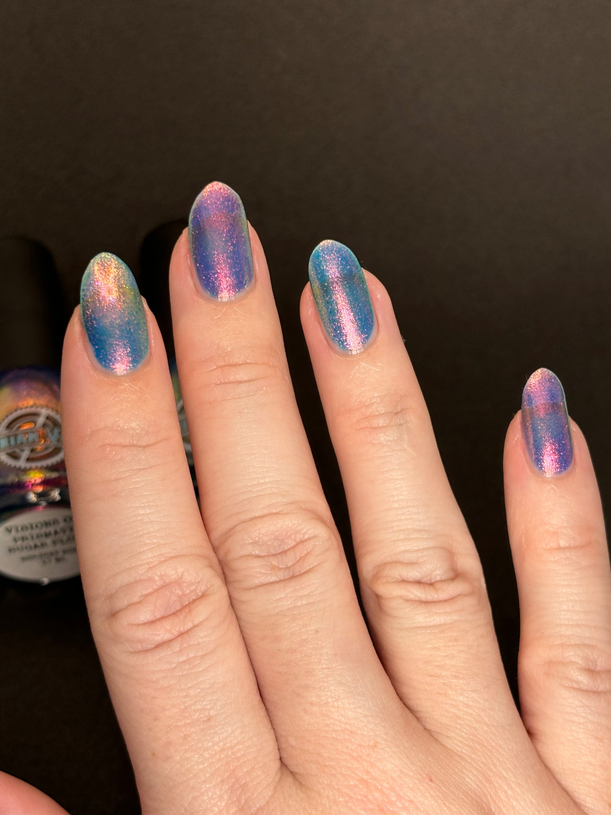 This one is a shifty sister polish to Kaleidoscopic - purple jelly base with indigo undertones and intense prismatic shimmers that range all through the rainbow!