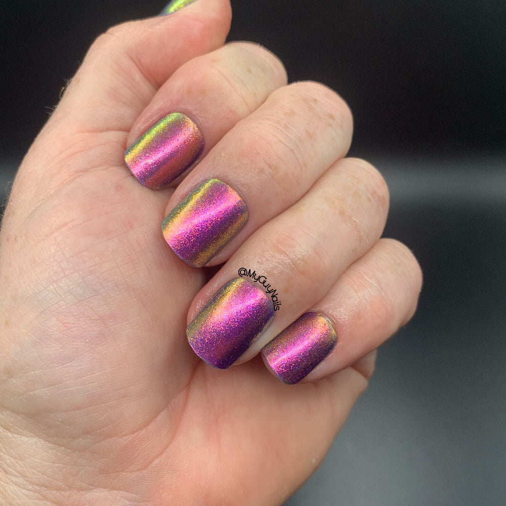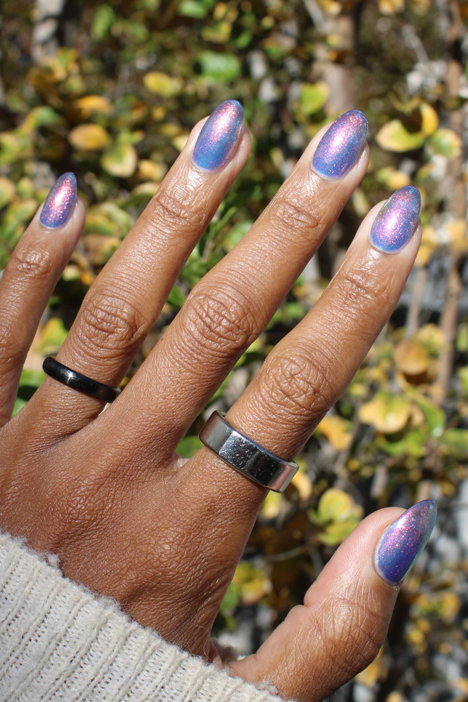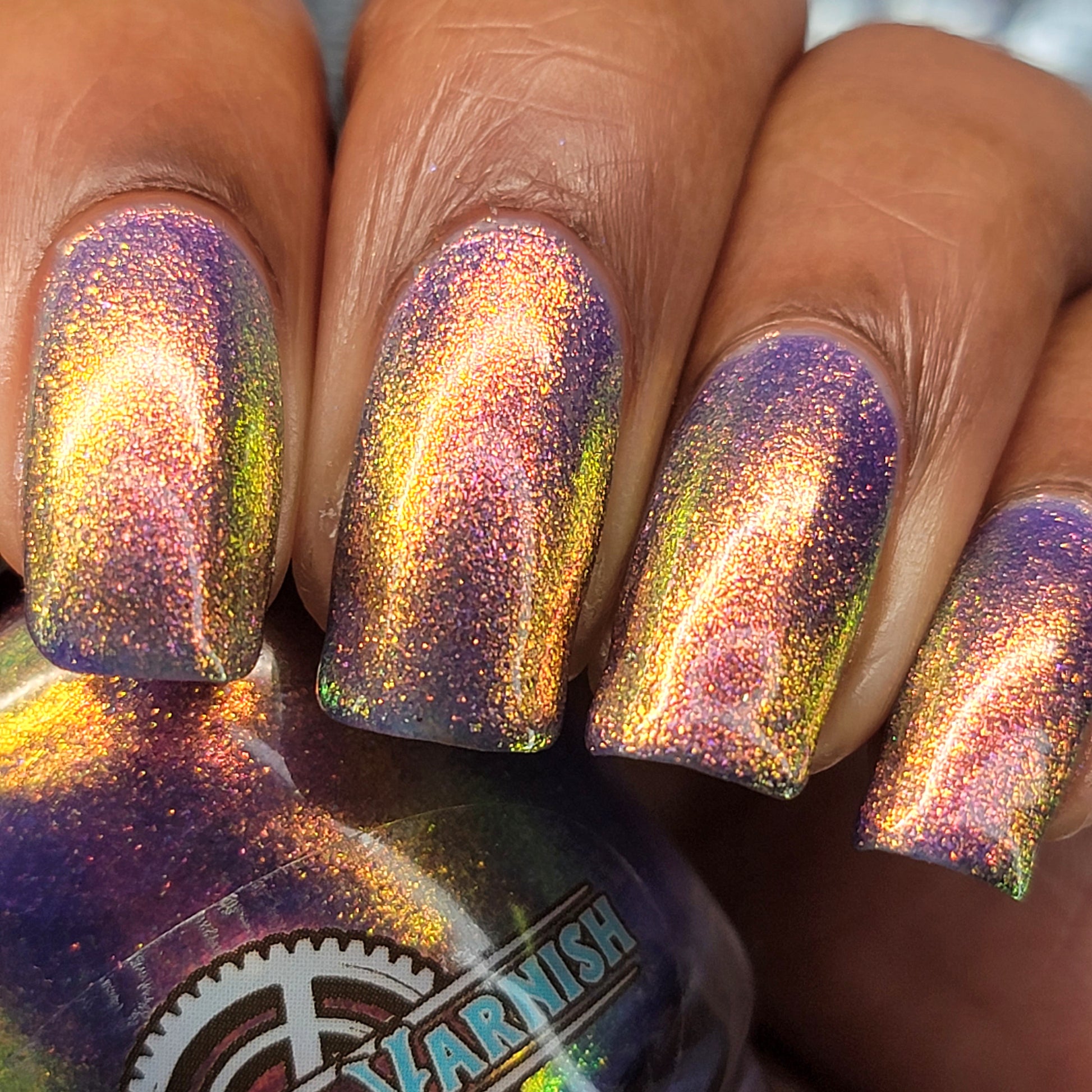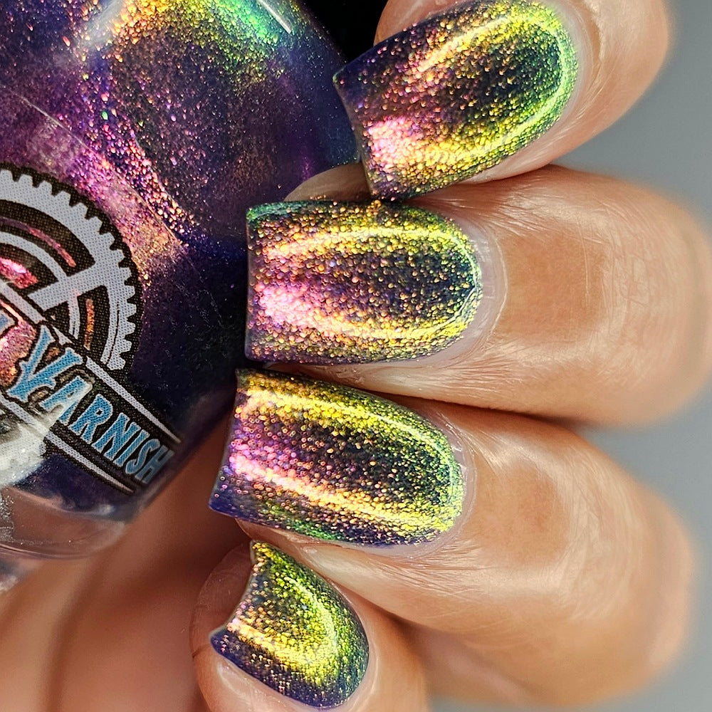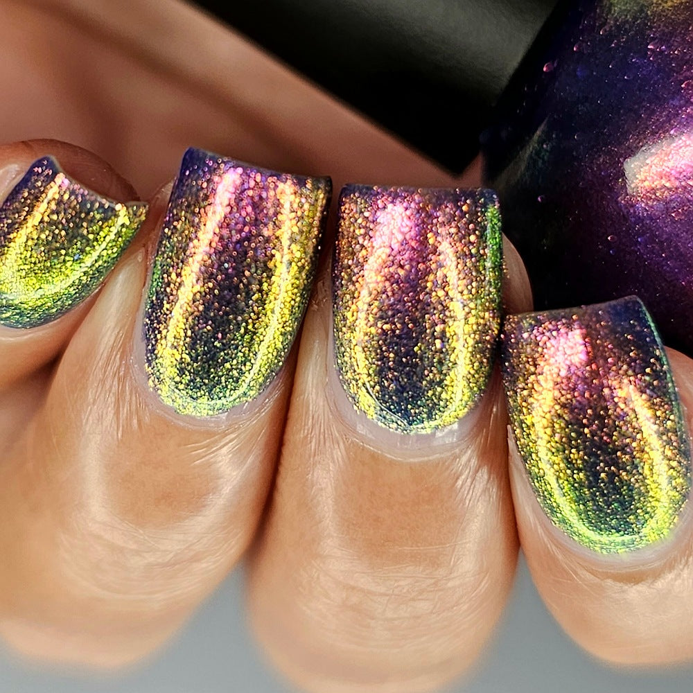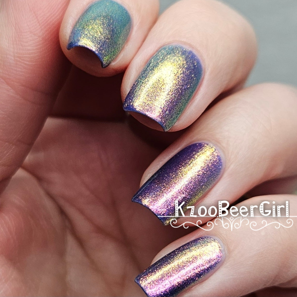This one is a shifty sister polish to Kaleidoscopic - purple jelly base with indigo undertones and intense prismatic shimmers that range all through the rainbow!