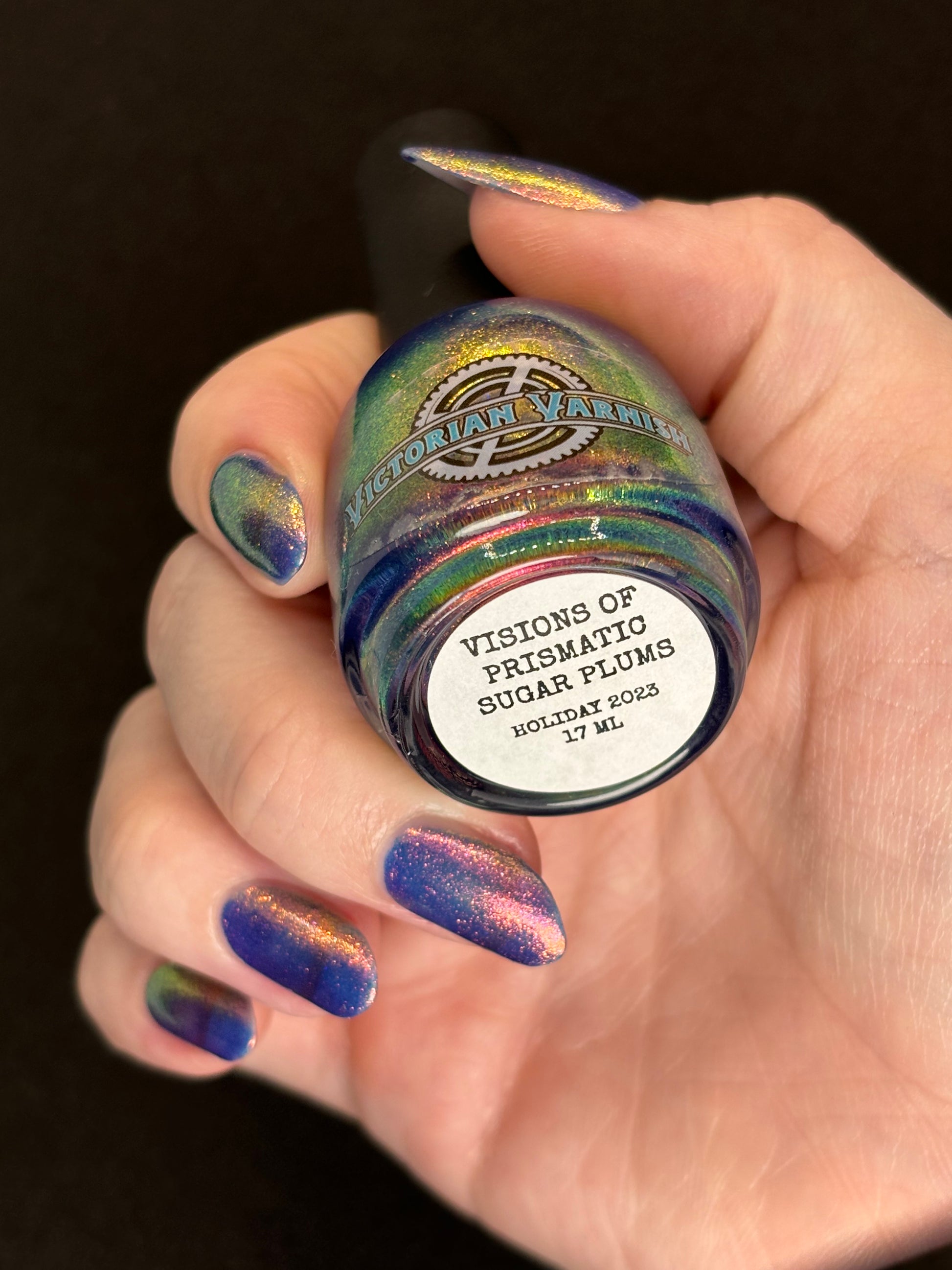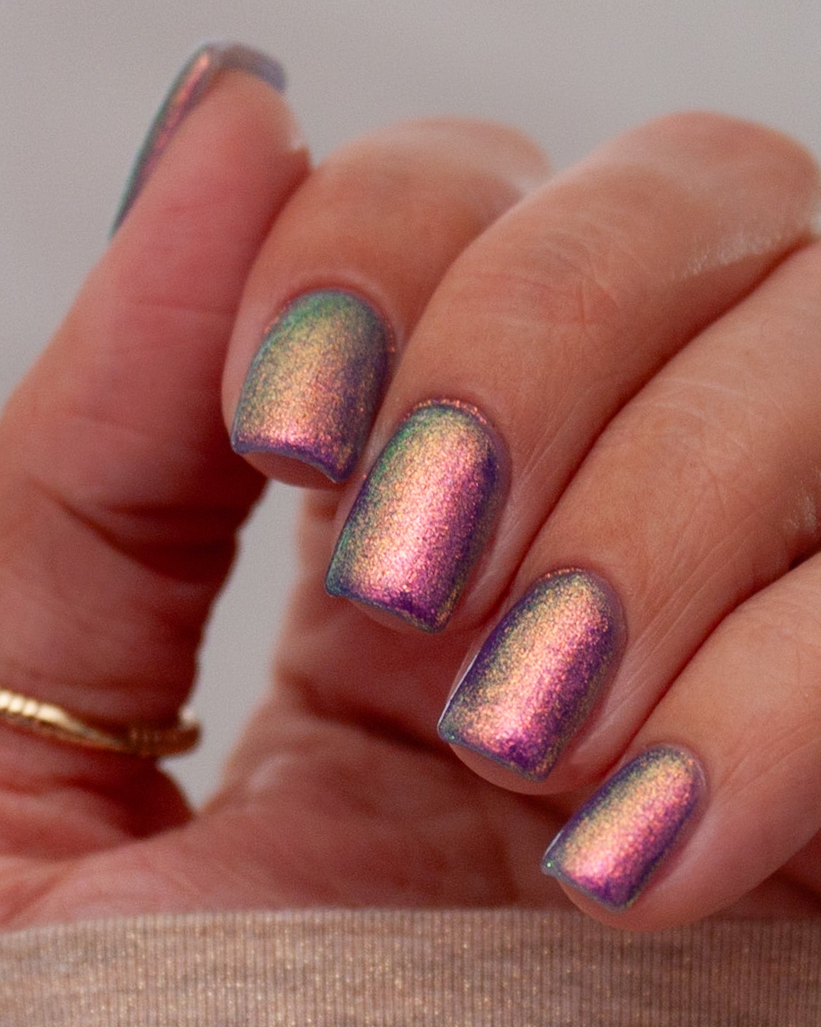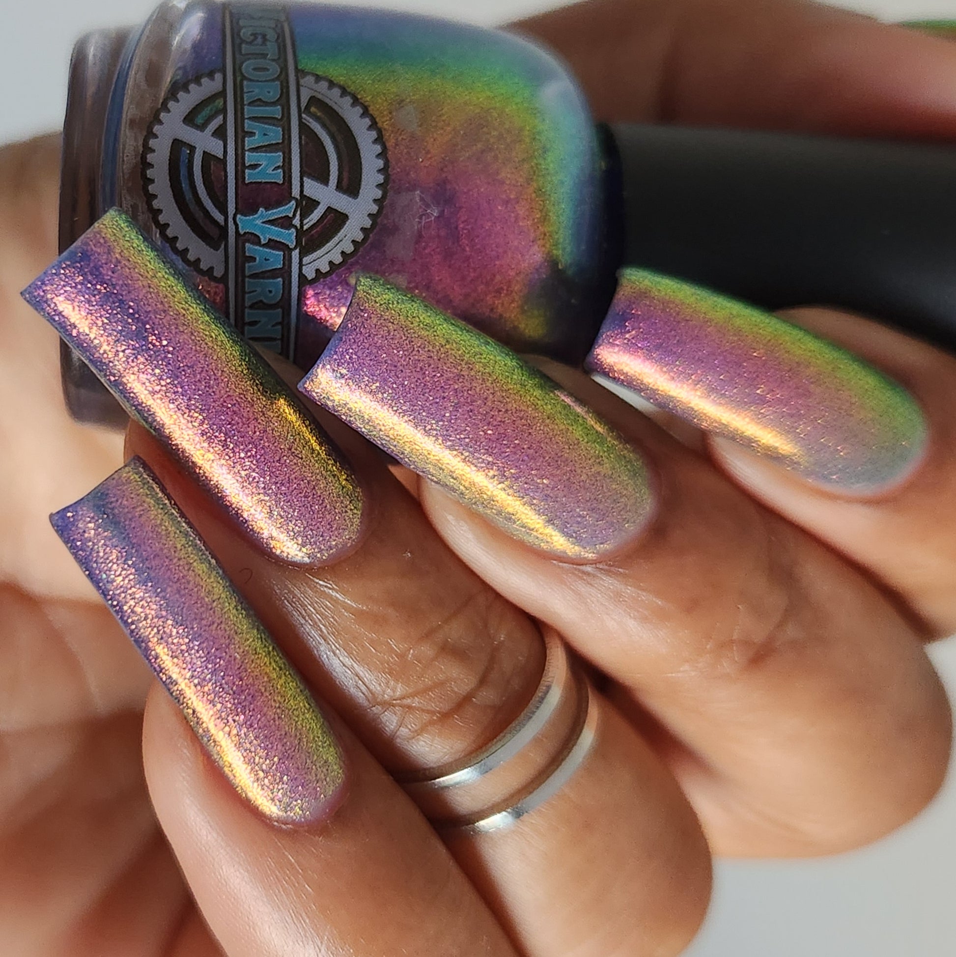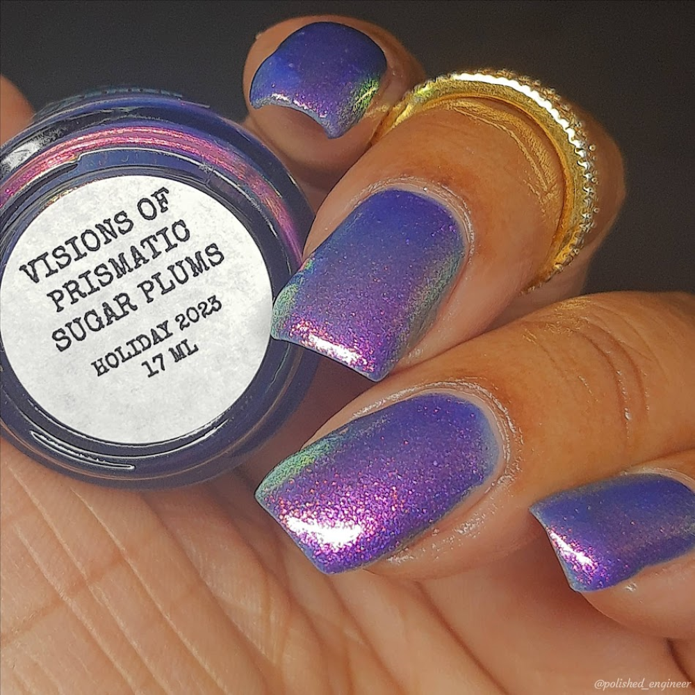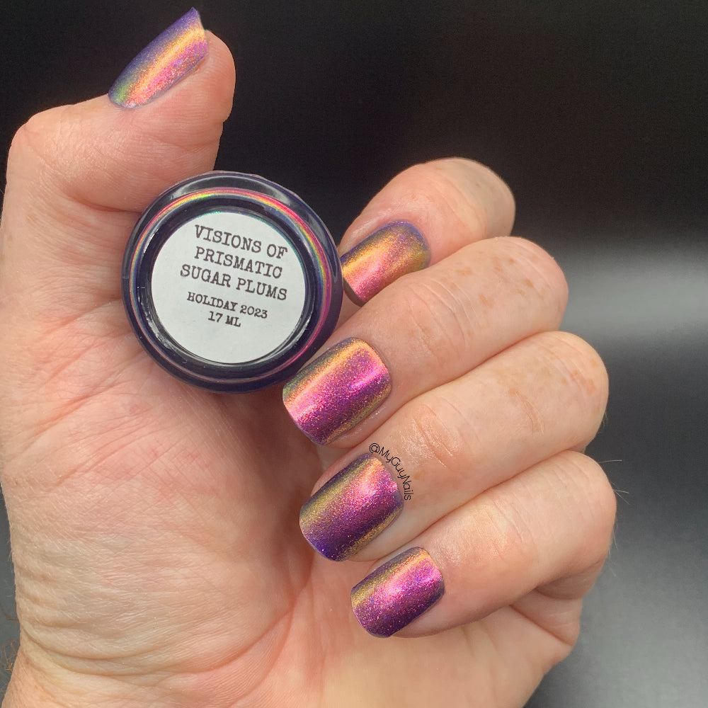 This one is a shifty sister polish to Kaleidoscopic - purple jelly base with indigo undertones and intense prismatic shimmers that range all through the rainbow!