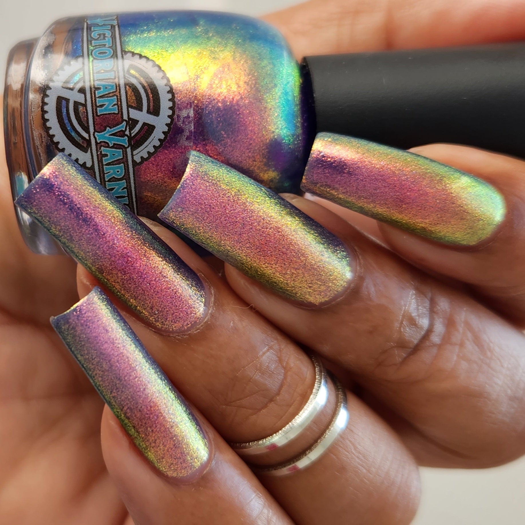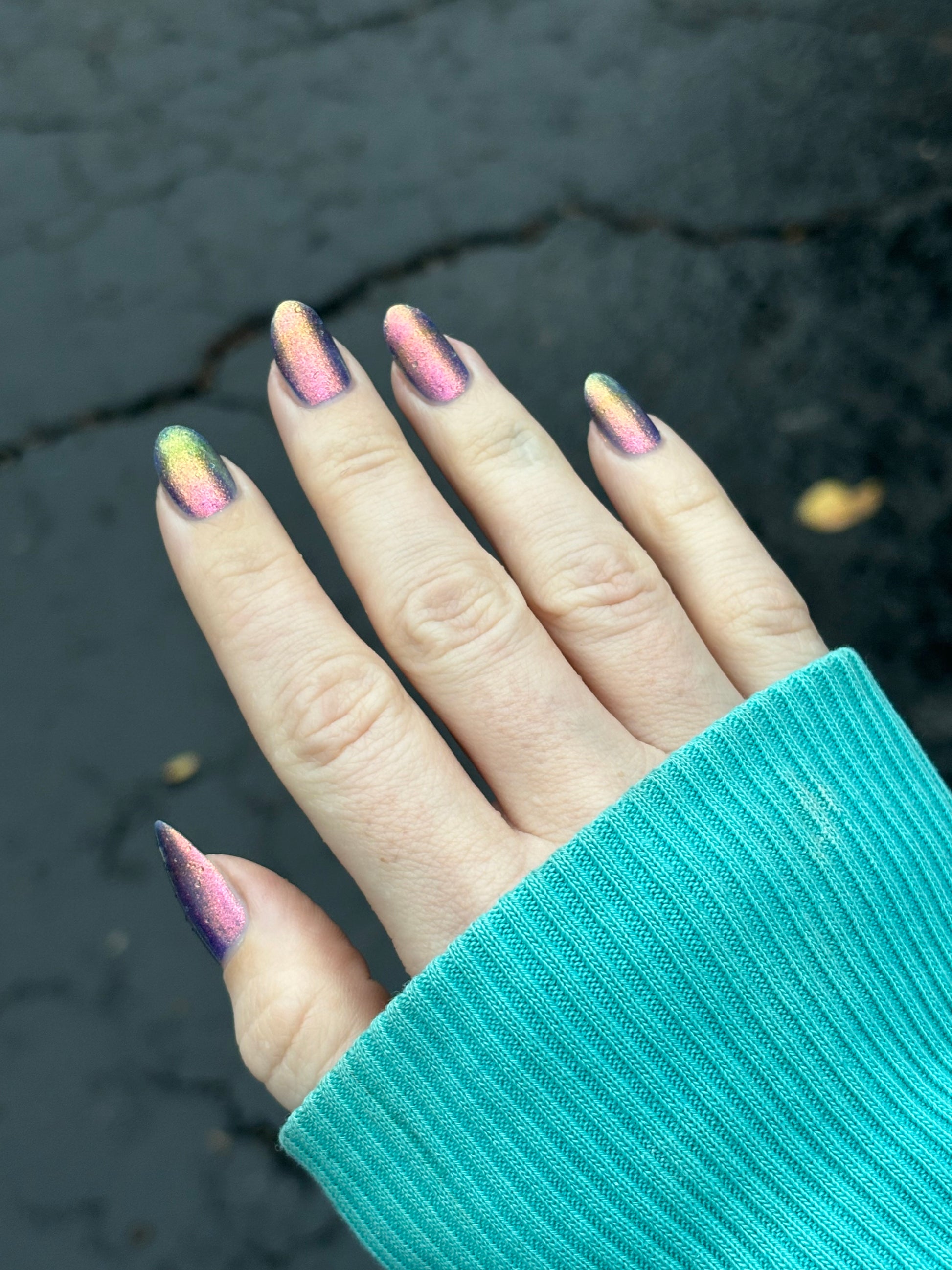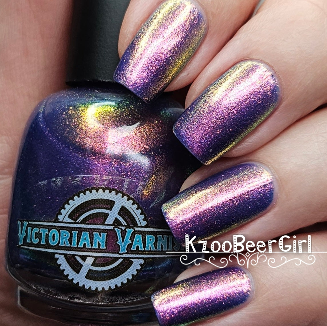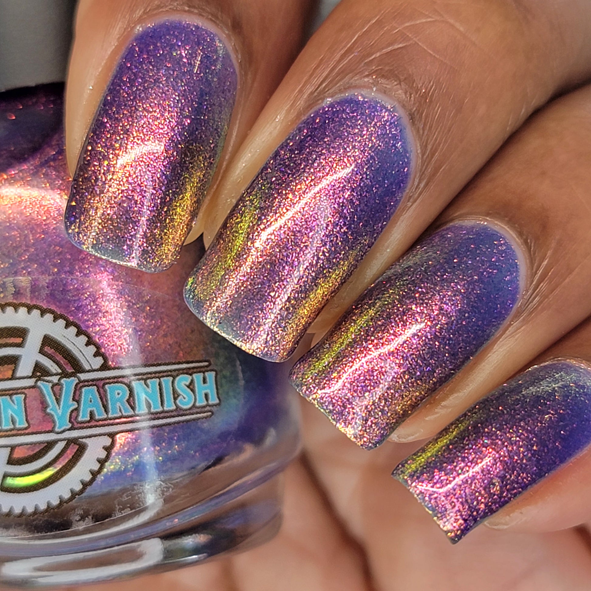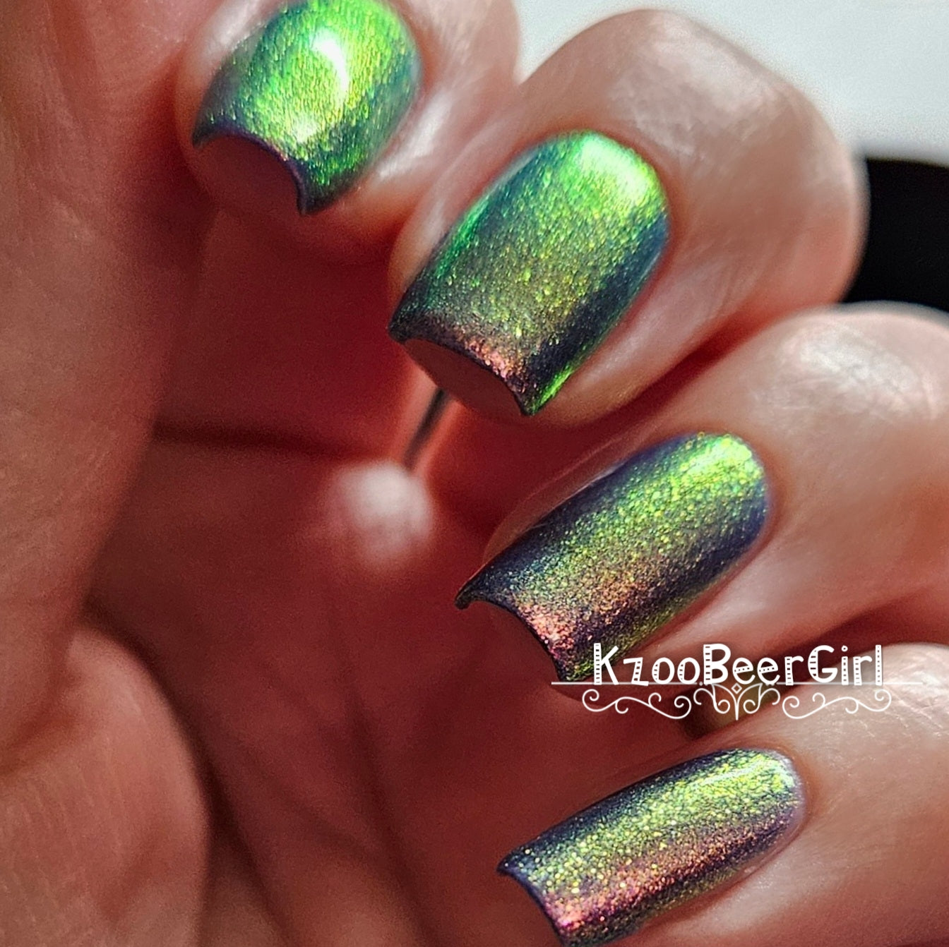 This one is a shifty sister polish to Kaleidoscopic - purple jelly base with indigo undertones and intense prismatic shimmers that range all through the rainbow!